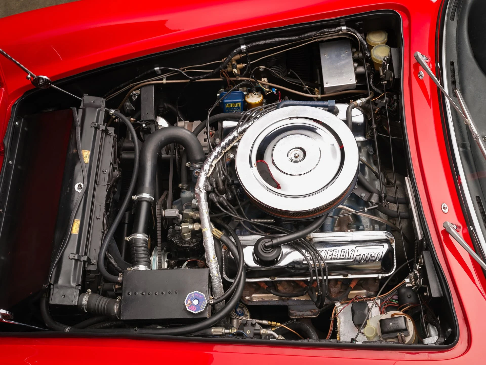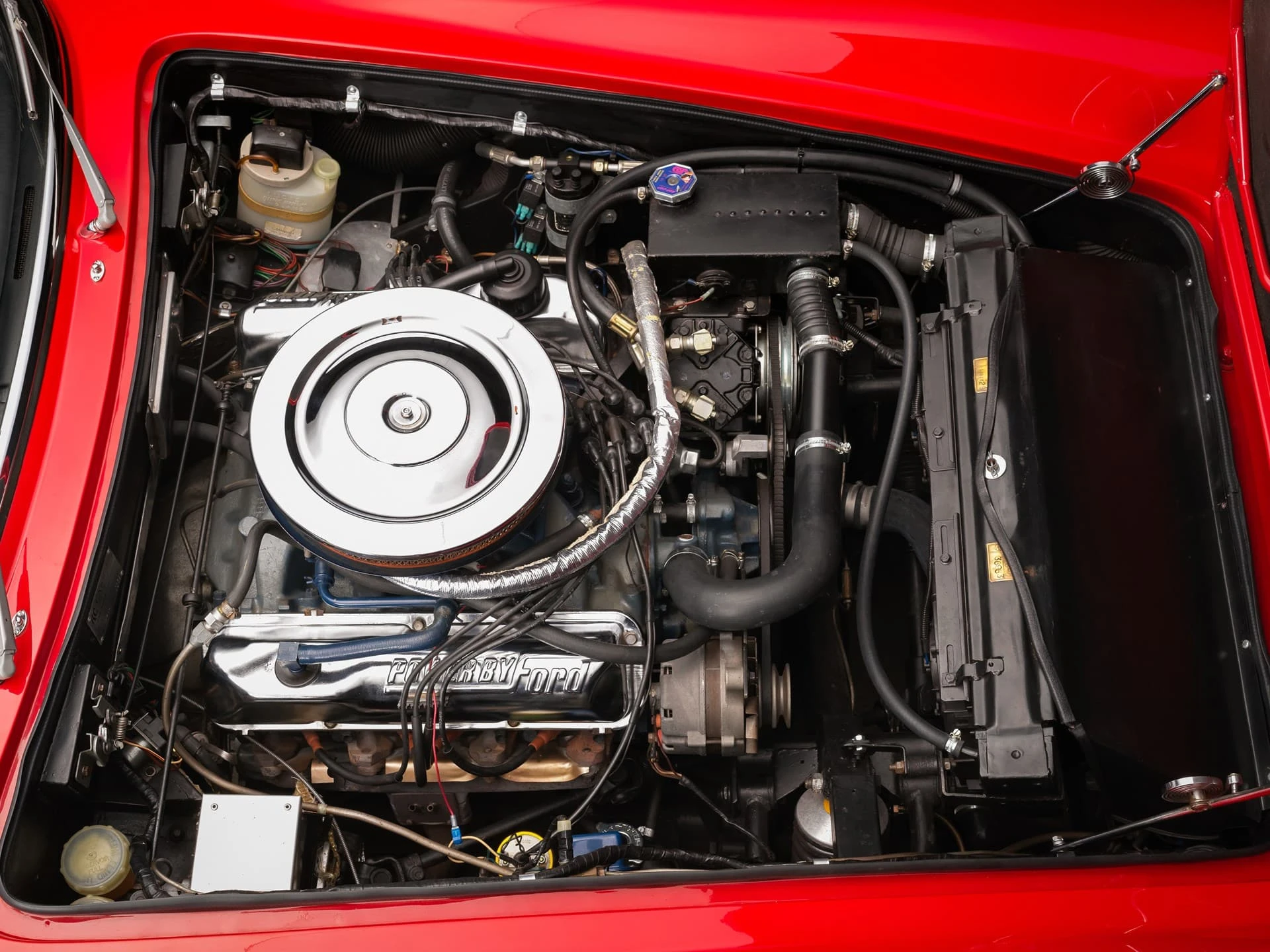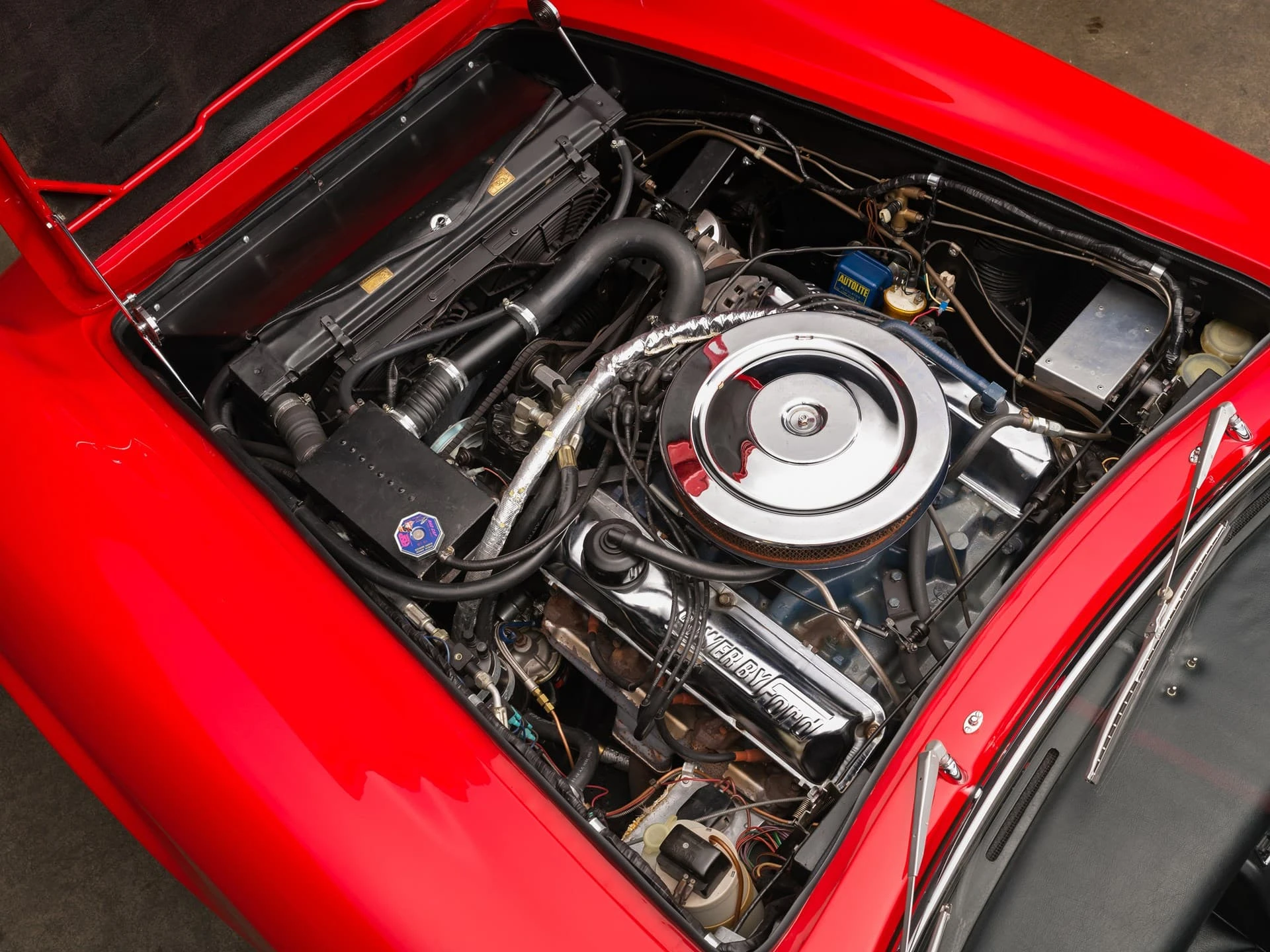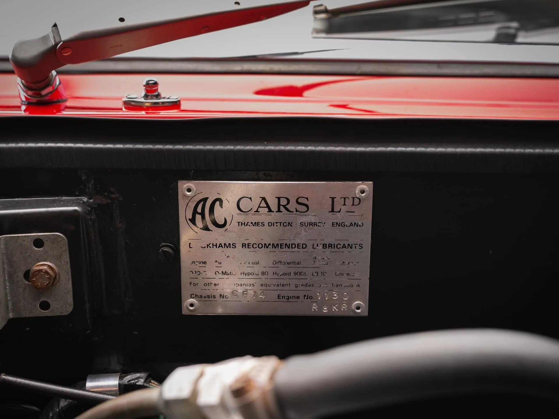 Le 428 Ford passe par une boîte automatique Ford C6 à 3 rapports renforcée et un différentiel à glissement limité. Finie en rouge vif (un changement de couleur par rapport à l’origine), elle a une sellerie en cuir noir, une capote en tissu noir et des jantes en fil de fer chromées. Le moteur a été remplacé il y a longtemps (peut-être chez AC), et un propriétaire ultérieur a installé l’air conditionné. Exposée à Pebble Beach en 1990, elle a obtenu la deuxième place dans la classe, puis a remporté des victoires de classe en 1991 aux concours d’élégance de Hillsborough et Forest Grove.