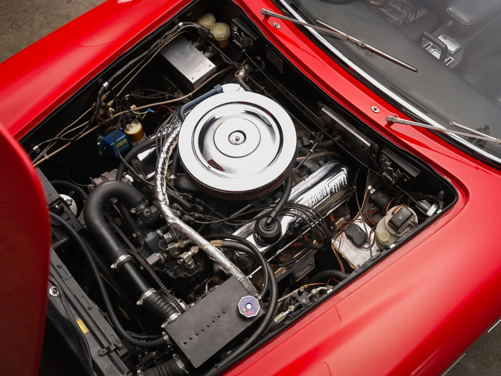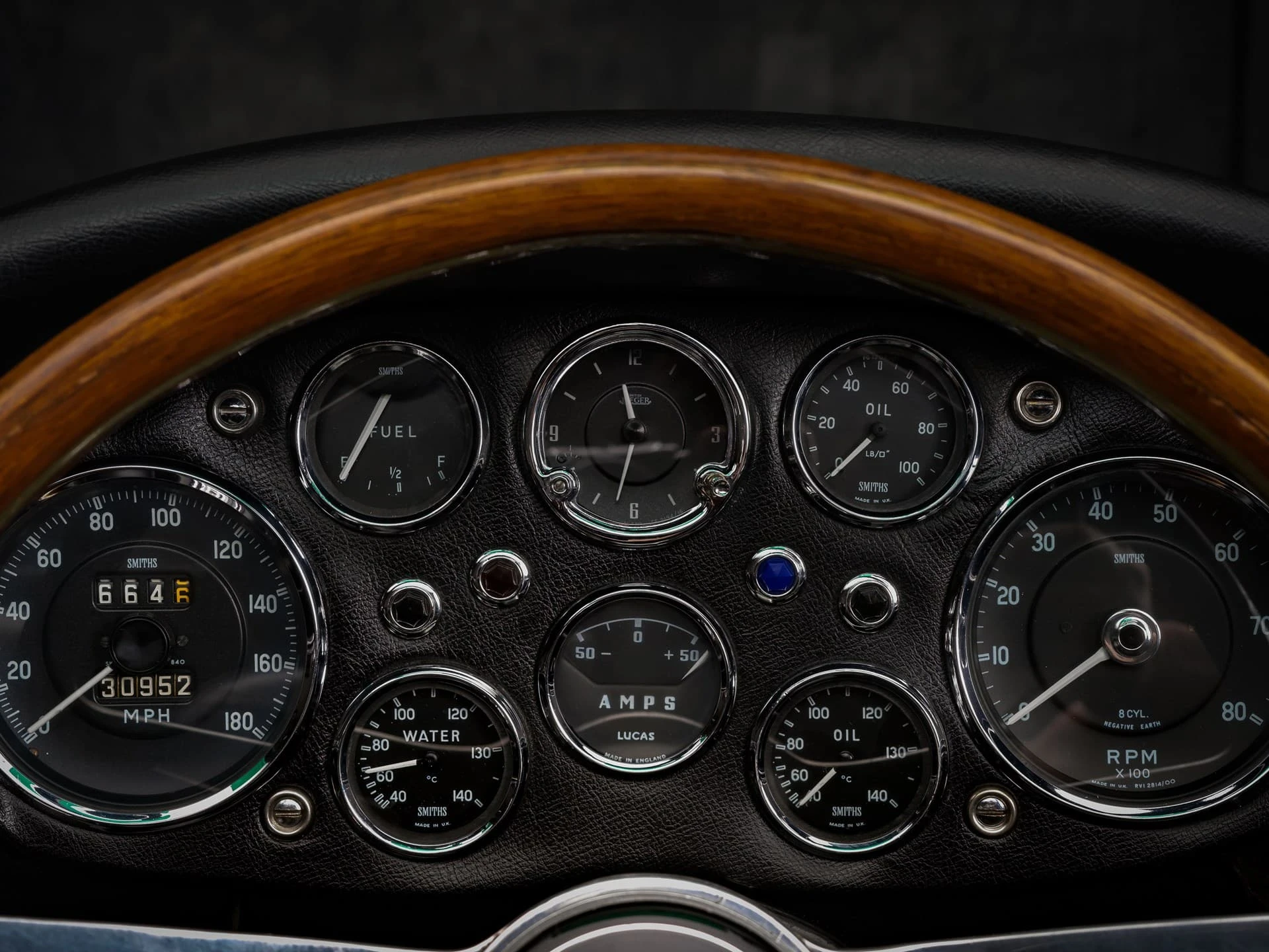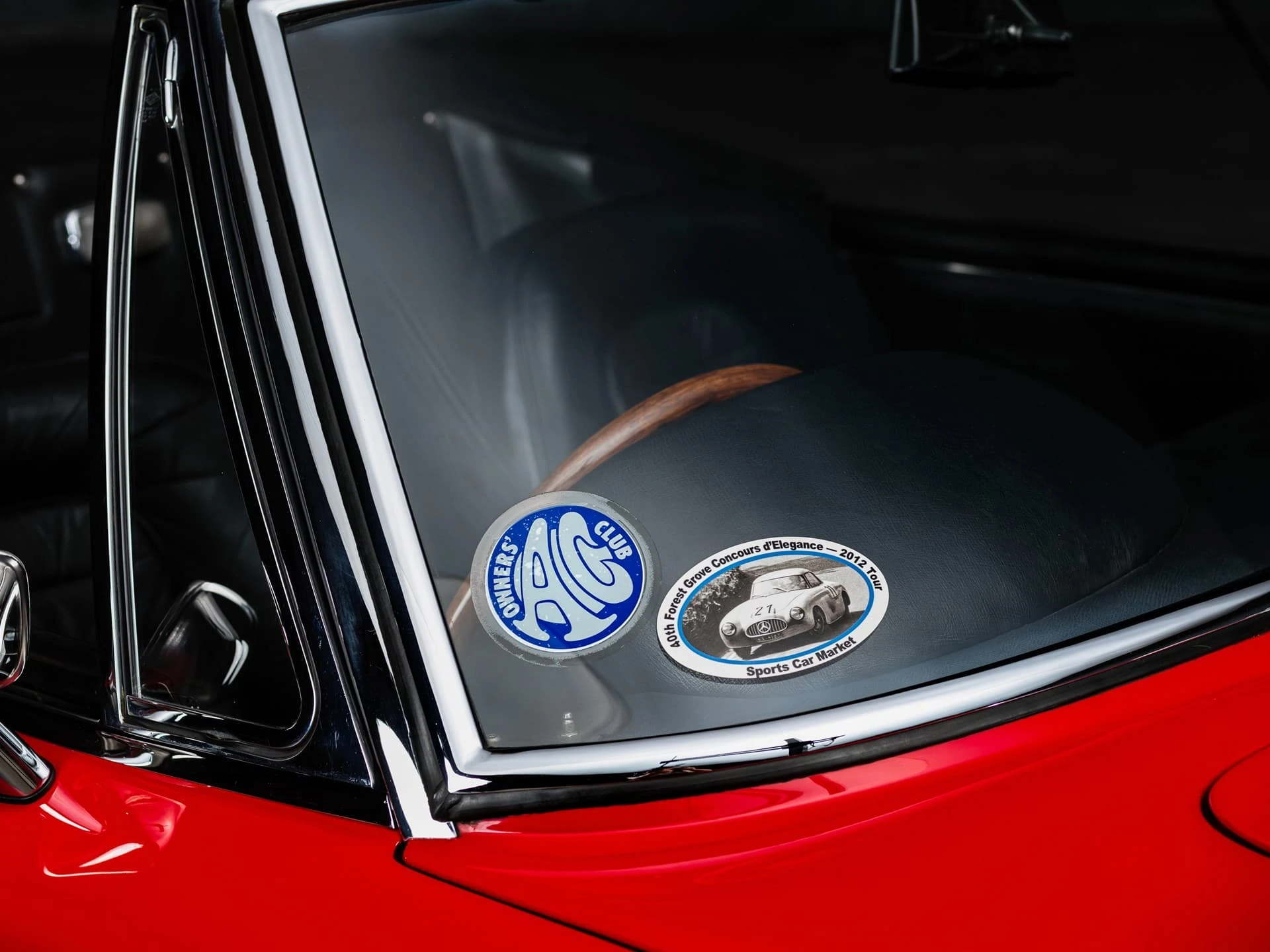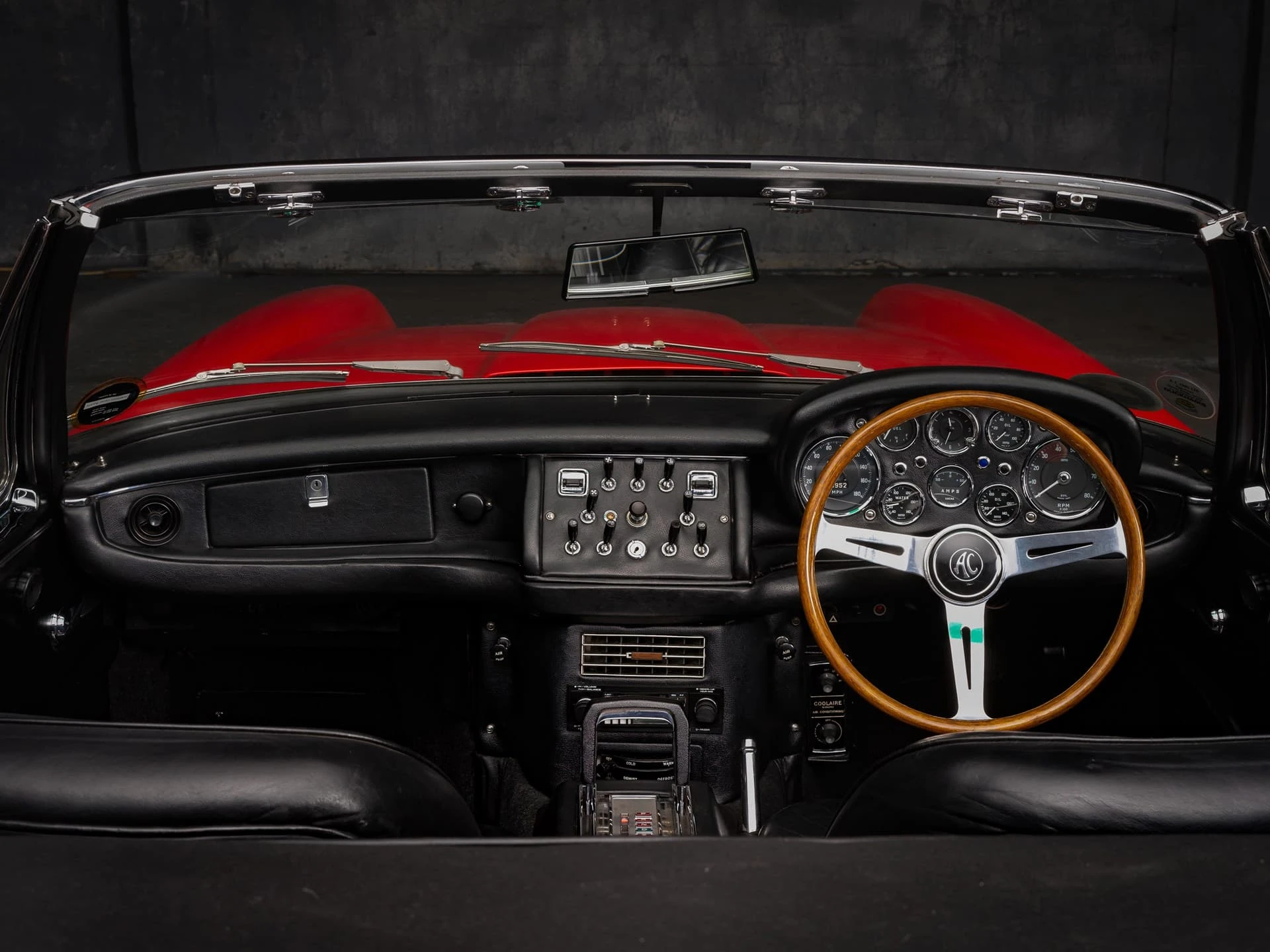 Le 428 Ford passe par une boîte automatique Ford C6 à 3 rapports renforcée et un différentiel à glissement limité. Finie en rouge vif (un changement de couleur par rapport à l’origine), elle a une sellerie en cuir noir, une capote en tissu noir et des jantes en fil de fer chromées. Le moteur a été remplacé il y a longtemps (peut-être chez AC), et un propriétaire ultérieur a installé l’air conditionné. Exposée à Pebble Beach en 1990, elle a obtenu la deuxième place dans la classe, puis a remporté des victoires de classe en 1991 aux concours d’élégance de Hillsborough et Forest Grove.
