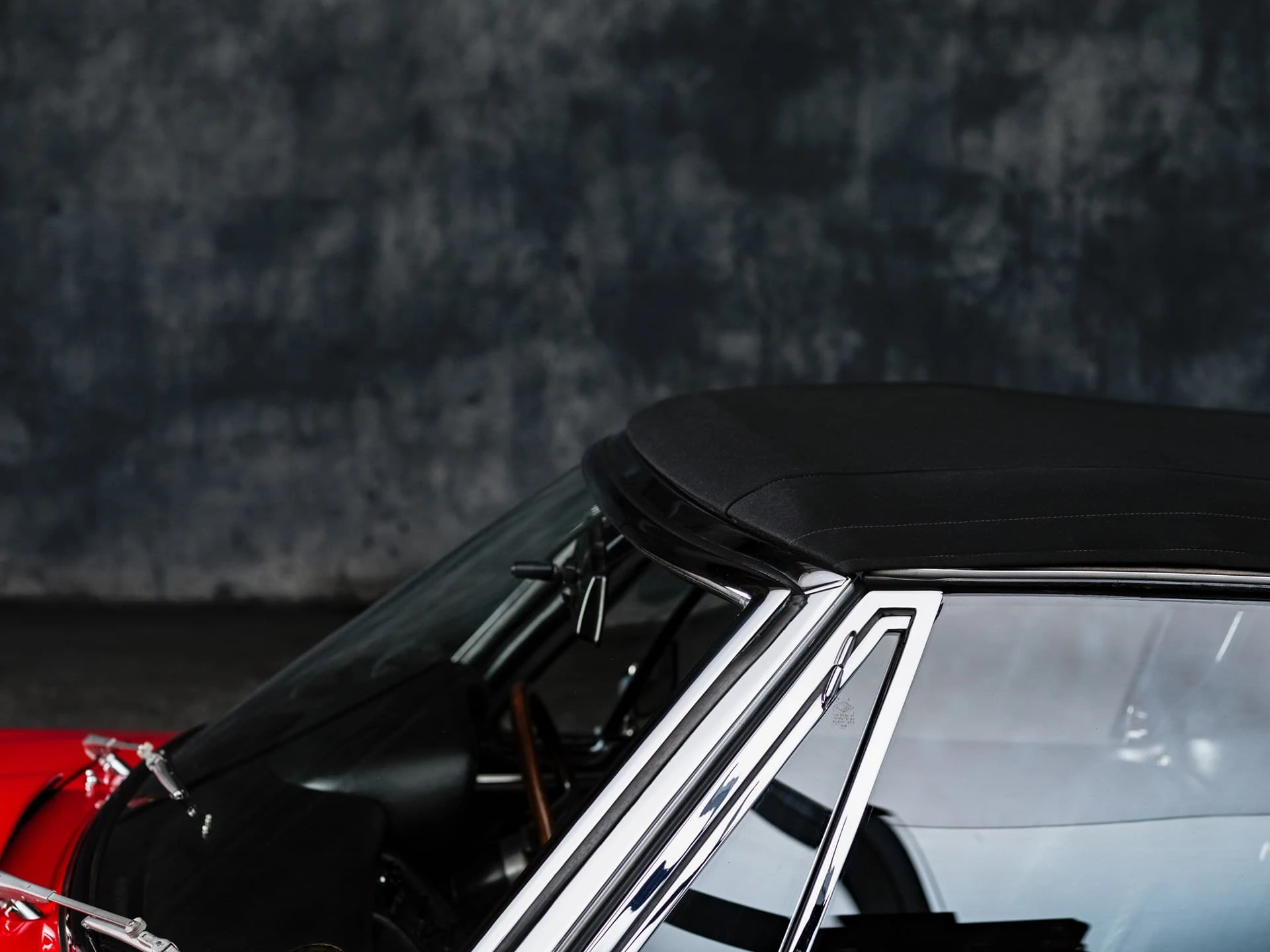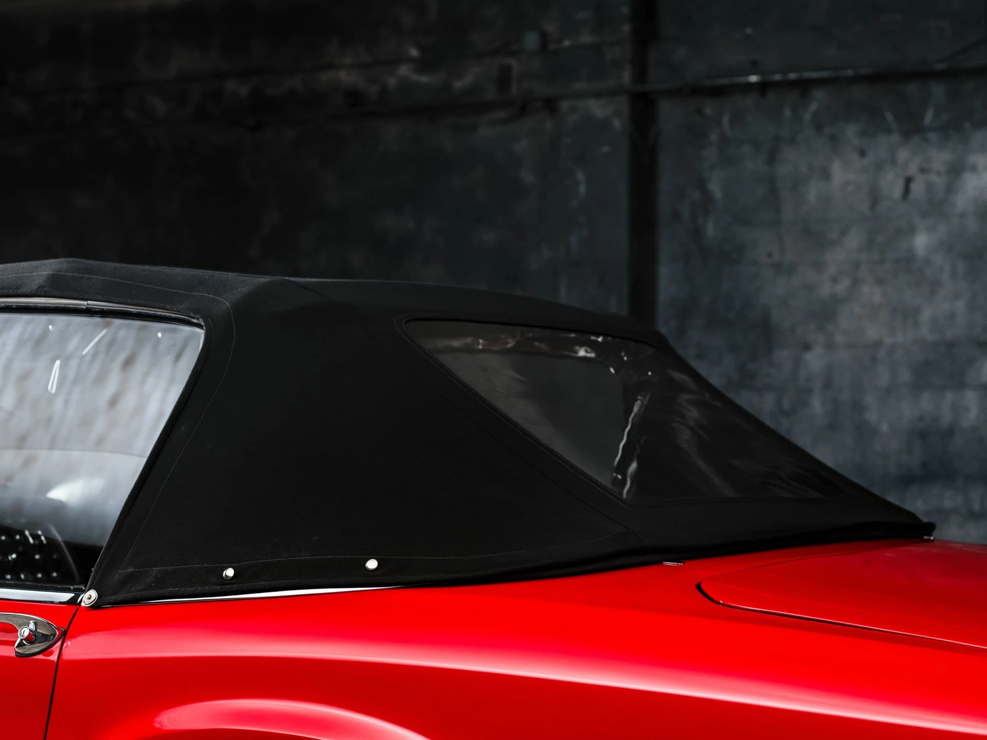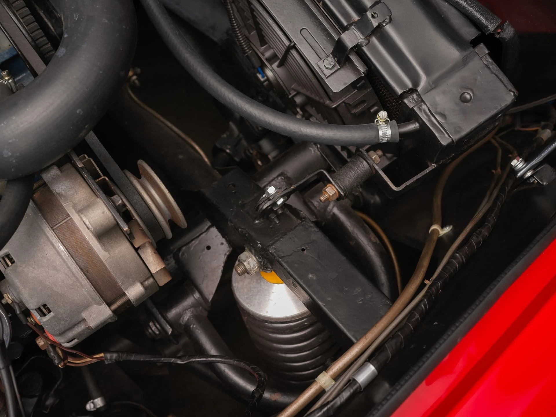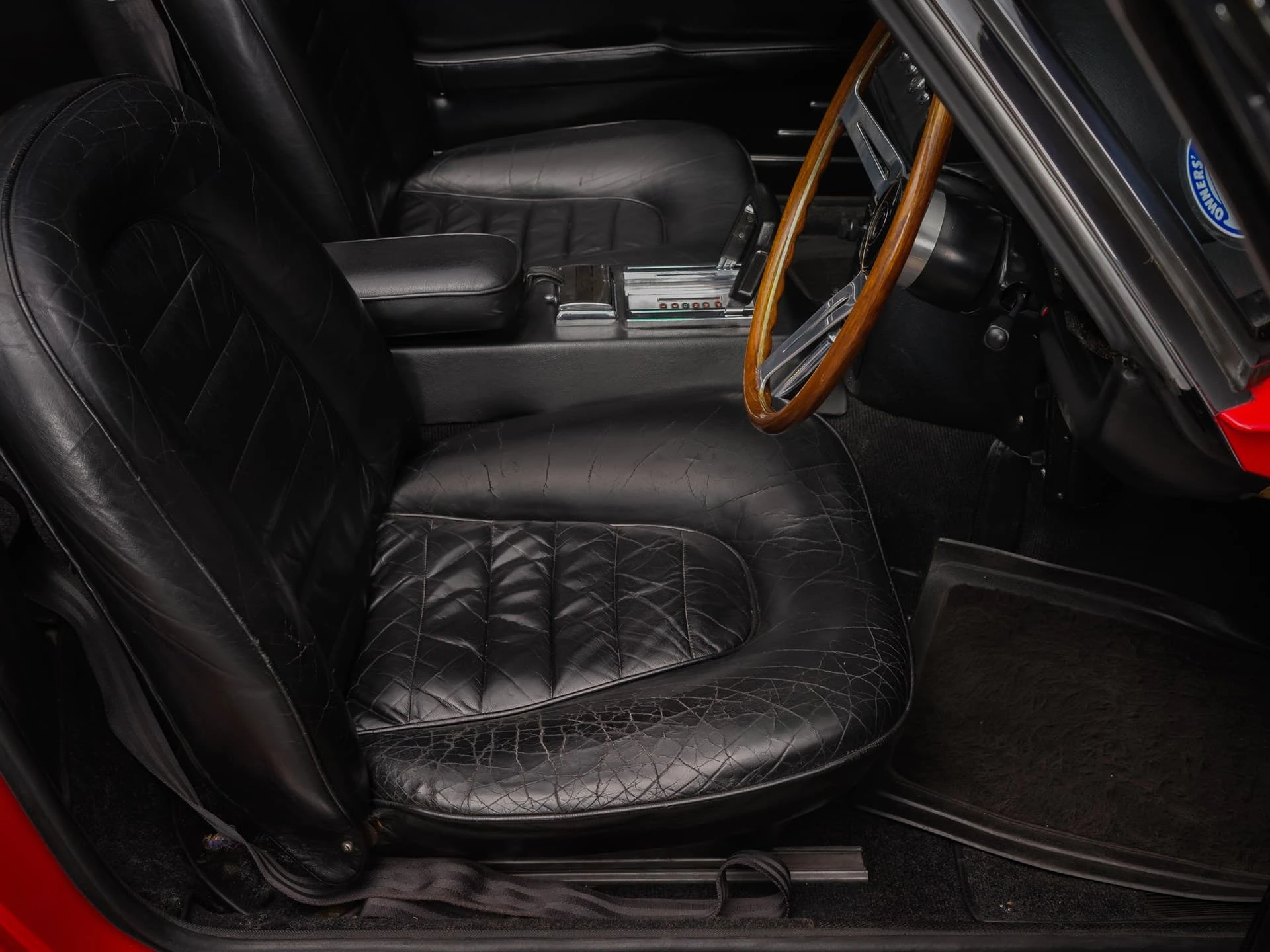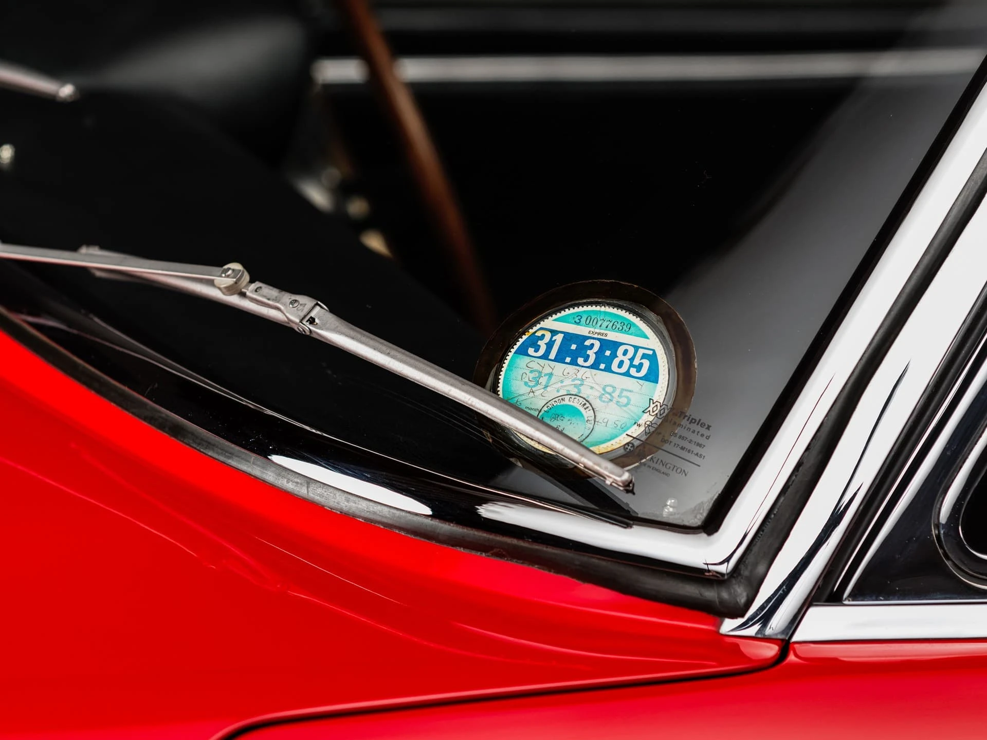 Le 428 Ford passe par une boîte automatique Ford C6 à 3 rapports renforcée et un différentiel à glissement limité. Finie en rouge vif (un changement de couleur par rapport à l’origine), elle a une sellerie en cuir noir, une capote en tissu noir et des jantes en fil de fer chromées. Le moteur a été remplacé il y a longtemps (peut-être chez AC), et un propriétaire ultérieur a installé l’air conditionné. Exposée à Pebble Beach en 1990, elle a obtenu la deuxième place dans la classe, puis a remporté des victoires de classe en 1991 aux concours d’élégance de Hillsborough et Forest Grove.