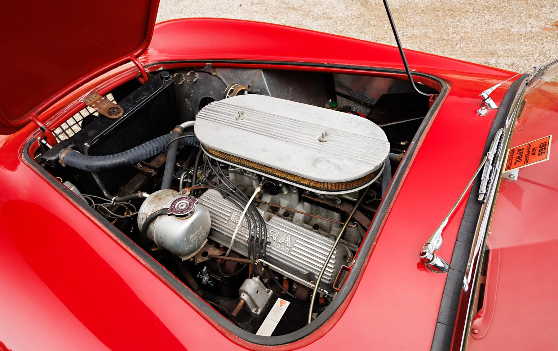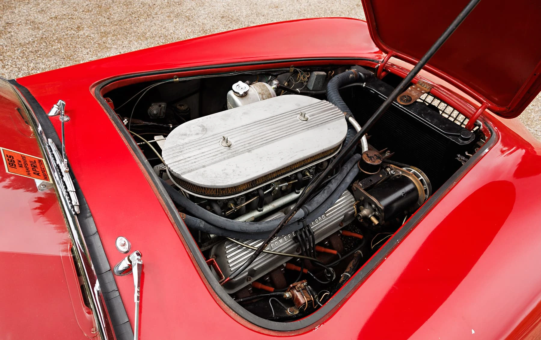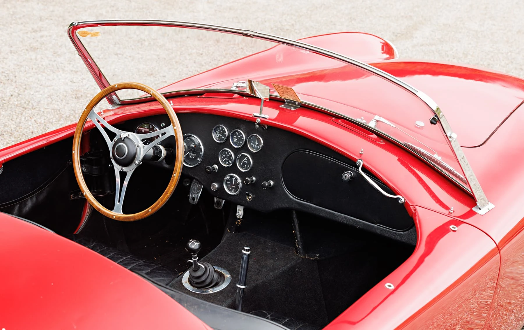 Non seulement les premiers modèles 260 sont historiquement importants, mais ils possèdent également des détails rares et charismatiques qui les différencient des Cobra plus tardives et plus standardisées. La carrosserie en aluminium à flancs durs ressemblait à l’AC Ace sur laquelle elle était basée, avec ses ailes étroites, l’absence de prises d’air latérales, les loquets de capot Wilmot-Breeden et les emblèmes Shelby-AC-Cobra de production limitée. À l’intérieur, l’habitacle était équipé d’une instrumentation Smiths complète, d’un volant Moto-Lita cerclé de bois et d’un pommeau de levier de vitesses provenant de la réserve de pièces détachées de Ford. Sur le plan mécanique, ces premières Cobra étaient équipées du moteur Hi-Po 260 cid V-8, d’une boîte de vitesses Ford Galaxie à carter en fonte, d’un rapport arrière de 3,54:1, d’une direction à vis sans fin et à secteur, de composants électriques Lucas et de jantes en fil de fer de 5 1/2″ de large.