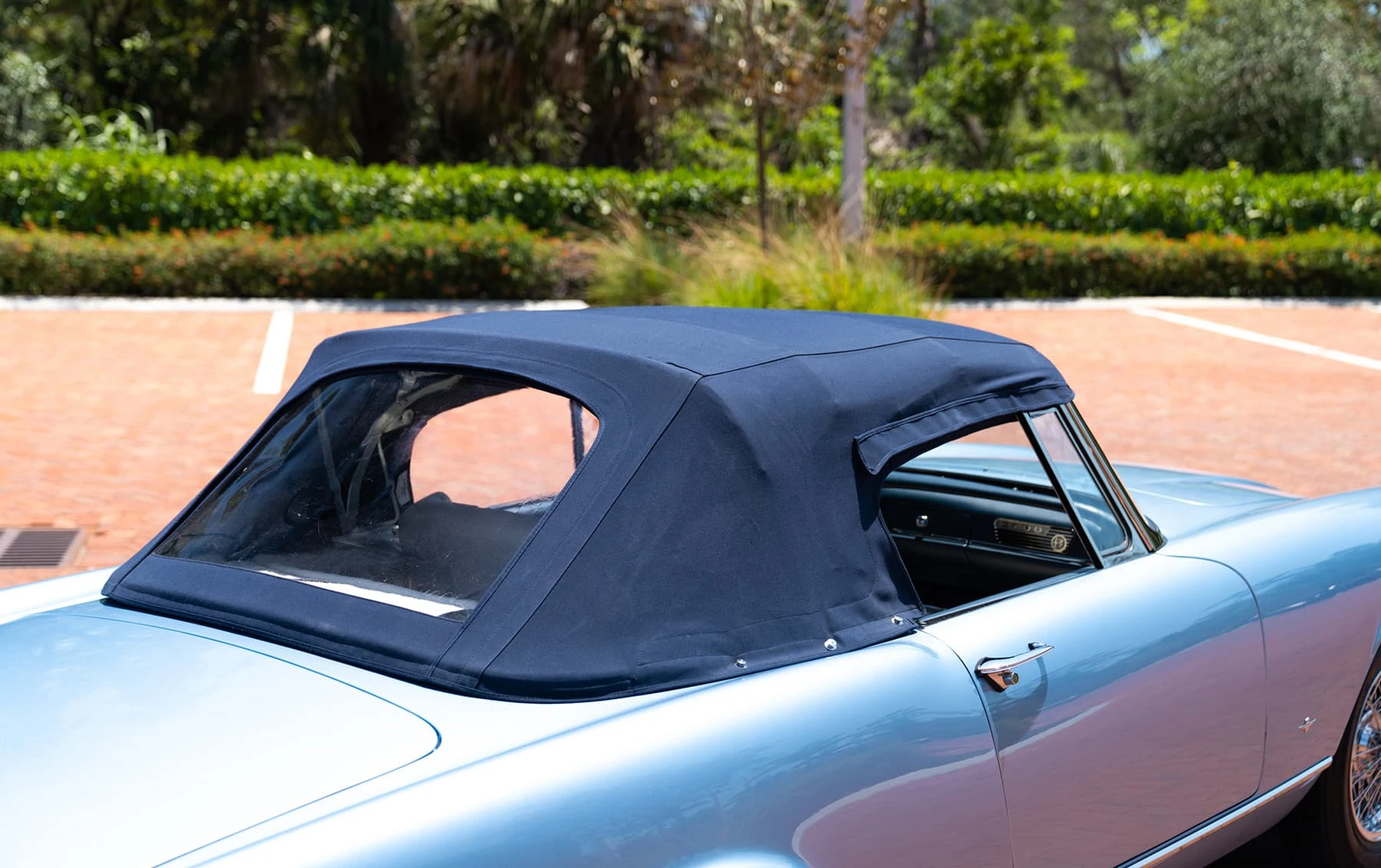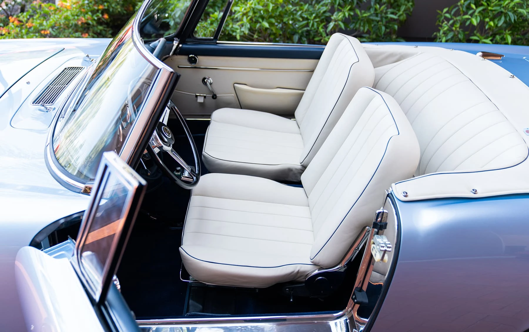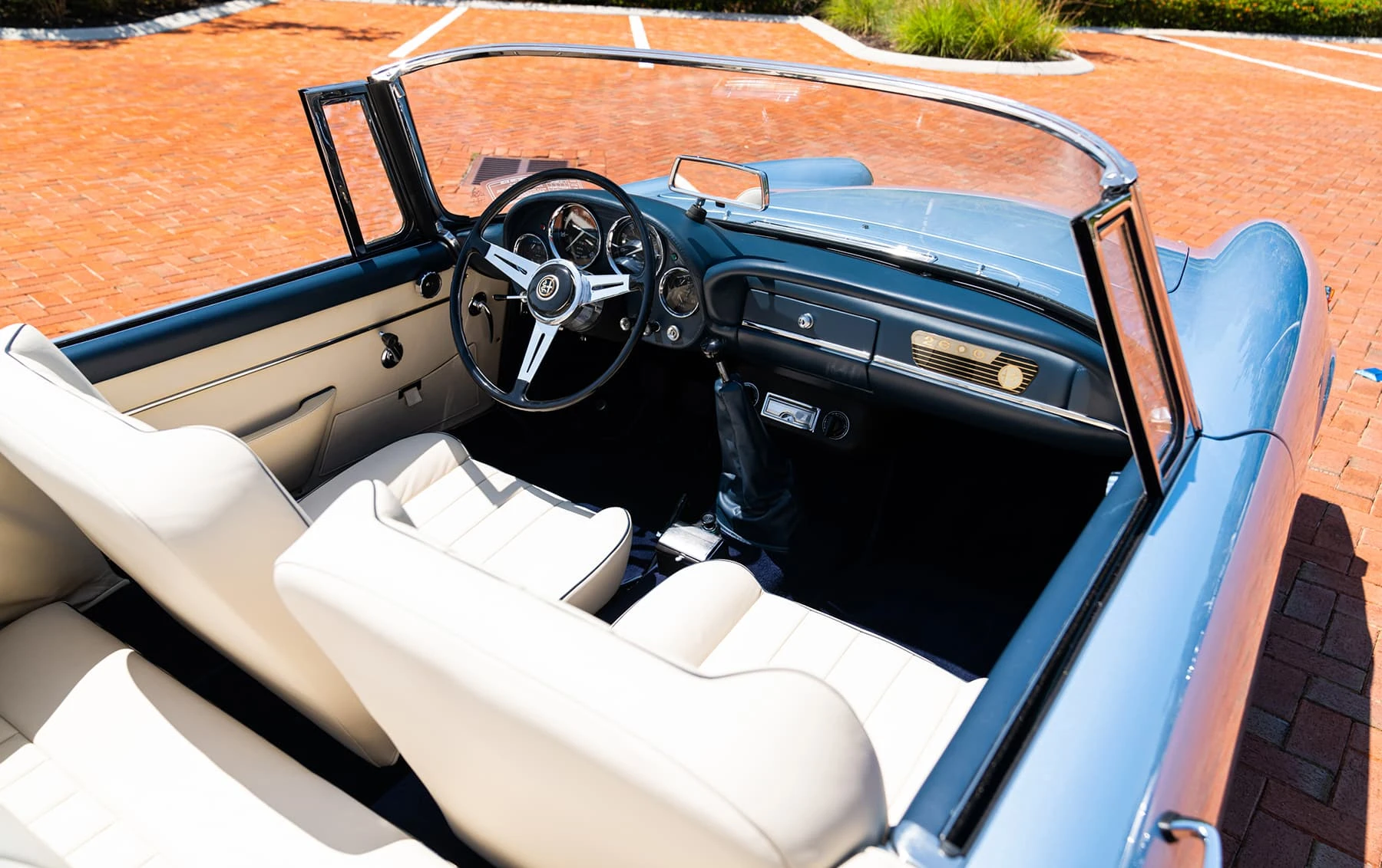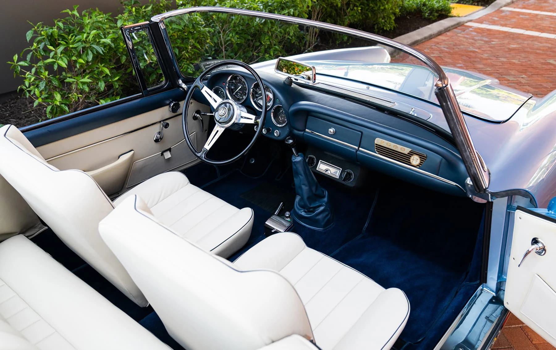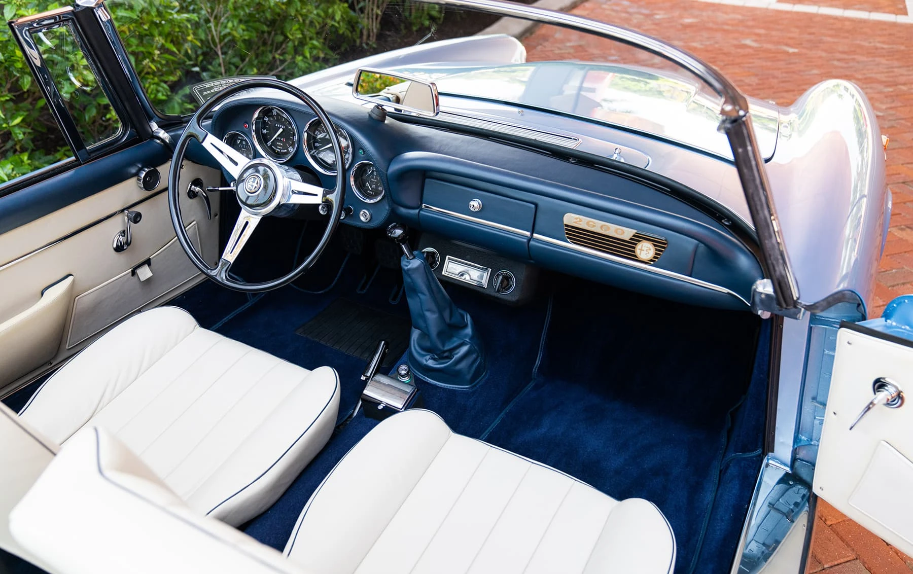 Réduite à l’état de métal nu, cette 2600 Spider a été repeinte dans une superbe teinte de bleu clair métallisé, associée à un intérieur recouvert de cuir de couleur lin. Le tableau de bord, typiquement en vinyle, a été recouvert de cuir bleu, ce qui crée un effet visuel saisissant avec la moquette et les passepoils des sièges bleu foncé. Le moteur a été reconstruit par les experts de la marque, Motorcraft, dans l’Indiana. Comme il s’agit d’une voiture de fin de production, les caches-cames sont finis en vert métallique et un rare jeu de carburateurs Weber plus performants a été installé en usine. En outre, elle est proposée avec un toit rigide en option d’usine – une pièce rare qui est complétée par le nouveau toit décapotable bleu.