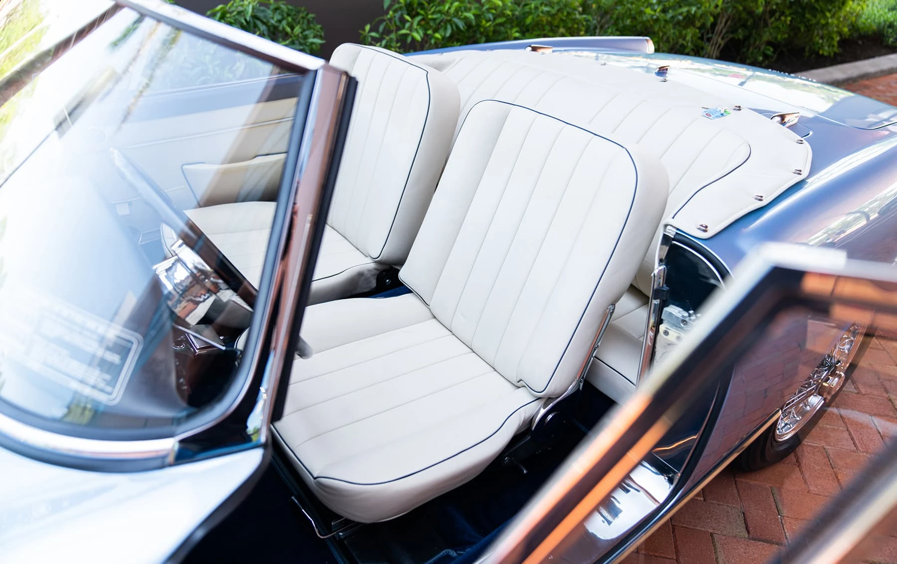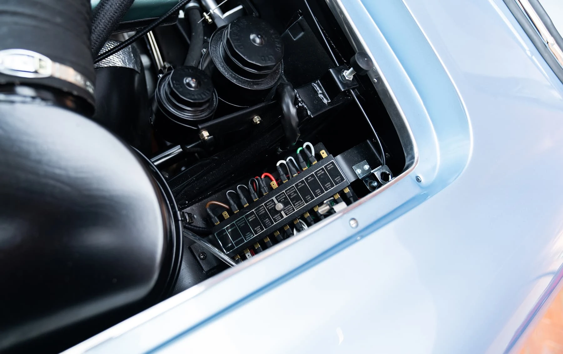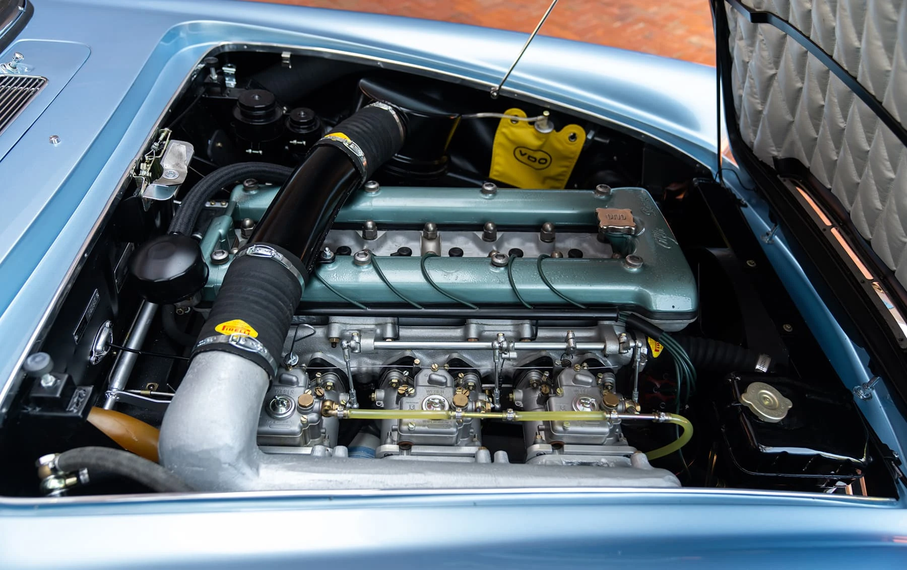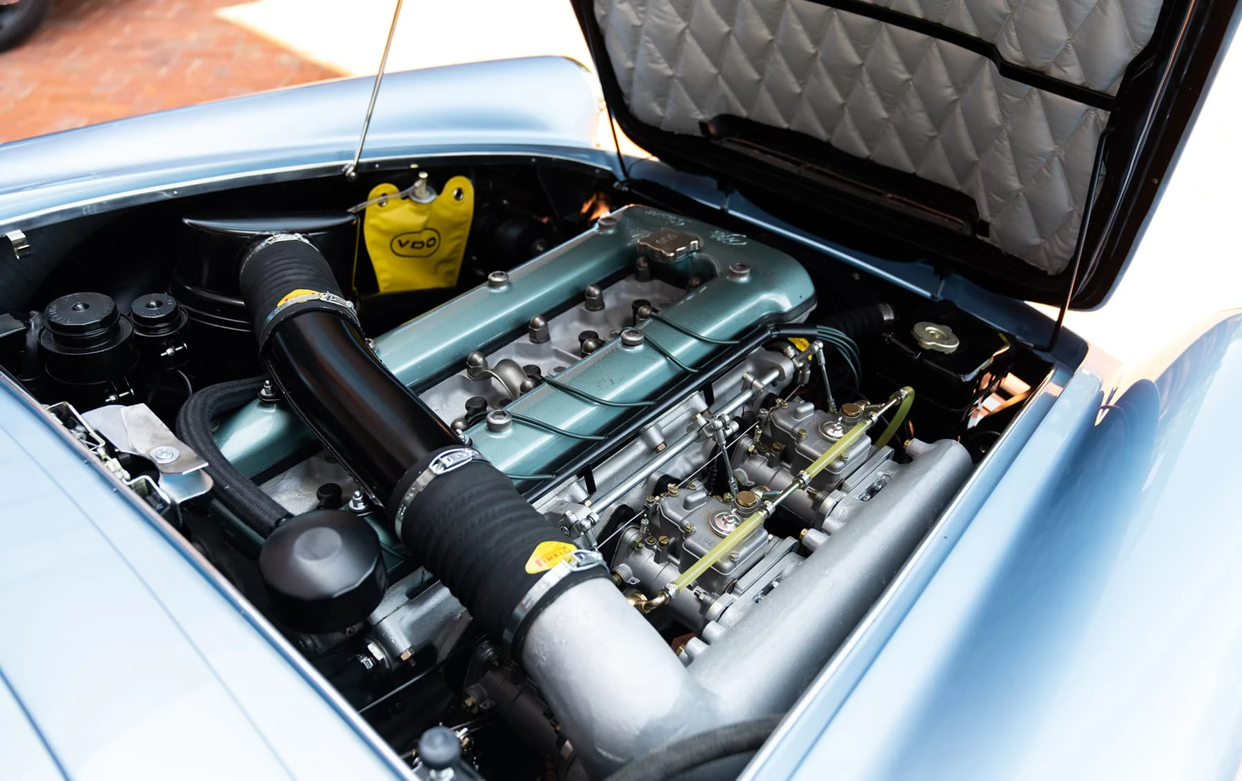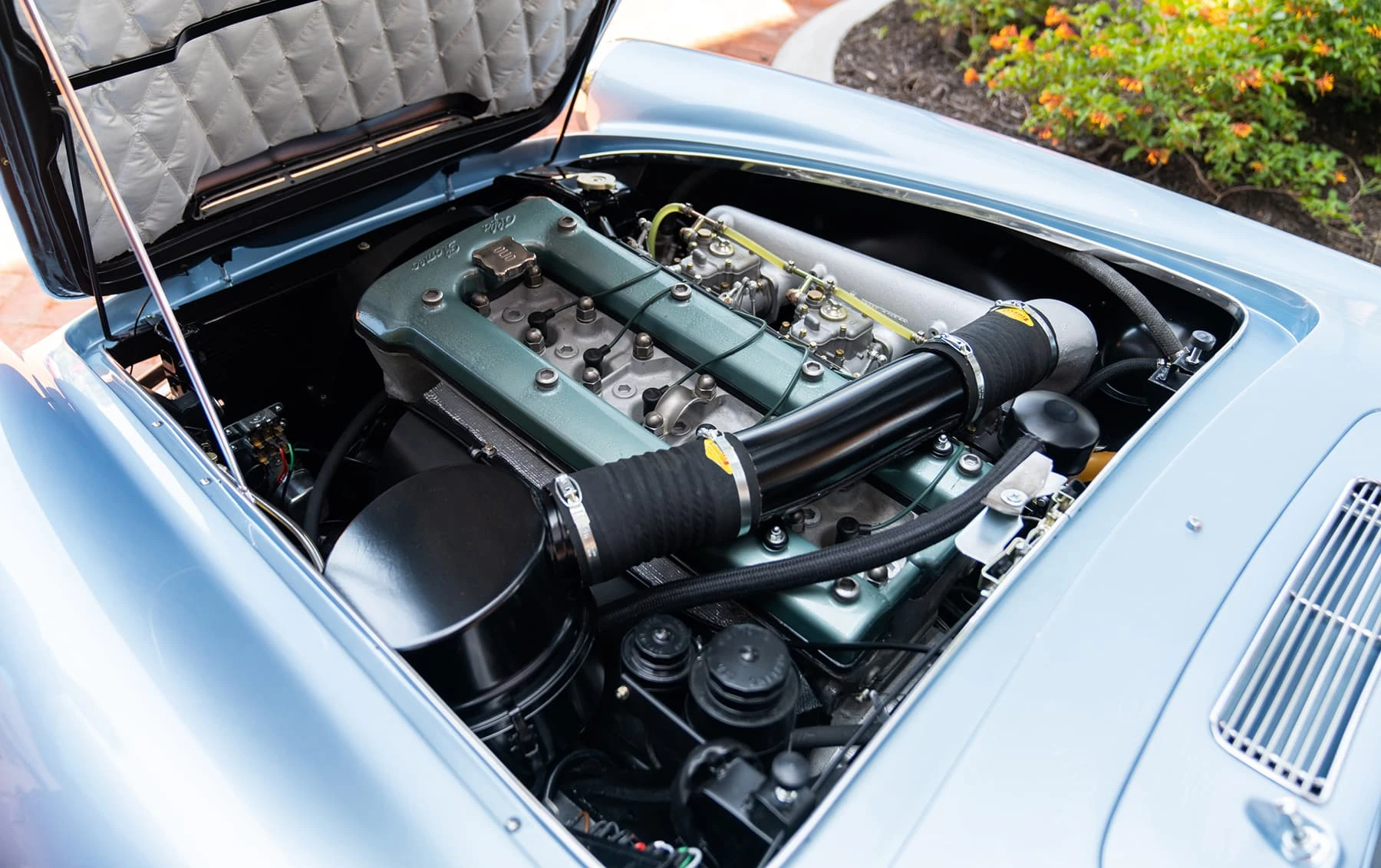 Réduite à l’état de métal nu, cette 2600 Spider a été repeinte dans une superbe teinte de bleu clair métallisé, associée à un intérieur recouvert de cuir de couleur lin. Le tableau de bord, typiquement en vinyle, a été recouvert de cuir bleu, ce qui crée un effet visuel saisissant avec la moquette et les passepoils des sièges bleu foncé. Le moteur a été reconstruit par les experts de la marque, Motorcraft, dans l’Indiana. Comme il s’agit d’une voiture de fin de production, les caches-cames sont finis en vert métallique et un rare jeu de carburateurs Weber plus performants a été installé en usine. En outre, elle est proposée avec un toit rigide en option d’usine – une pièce rare qui est complétée par le nouveau toit décapotable bleu.
