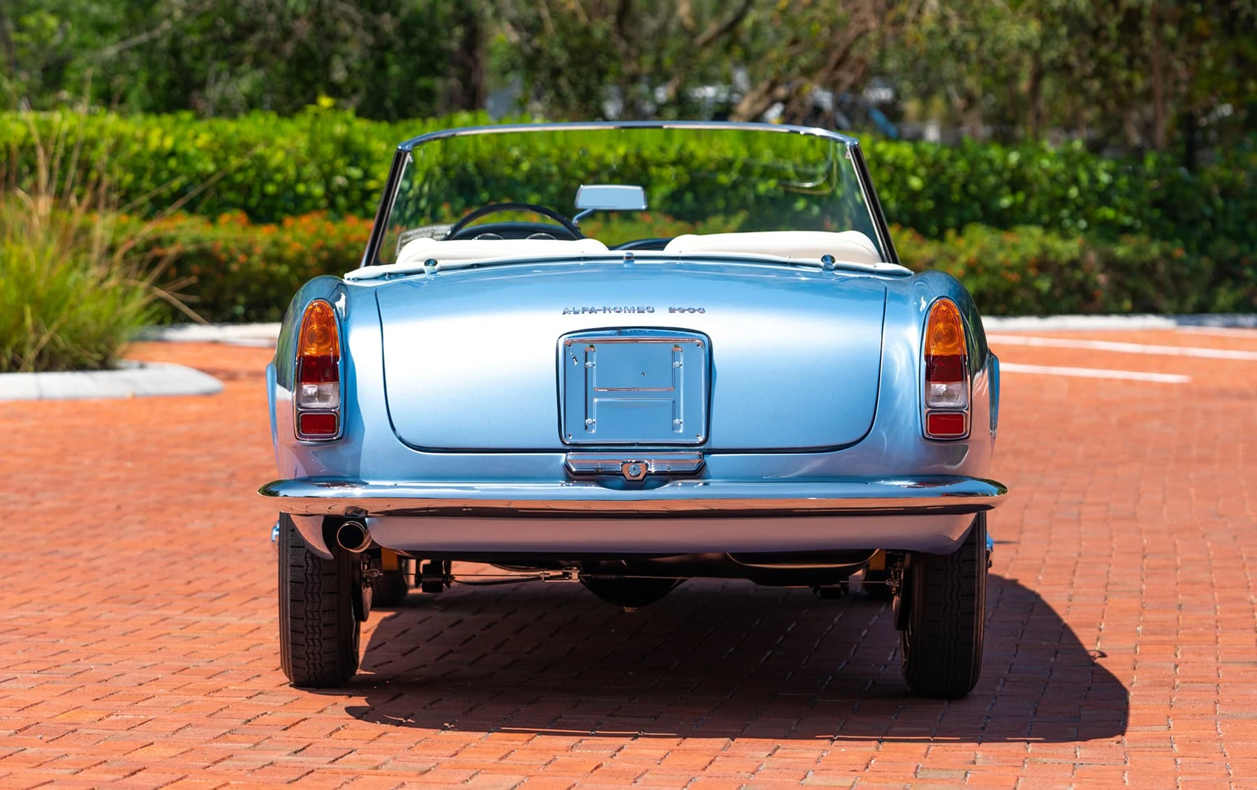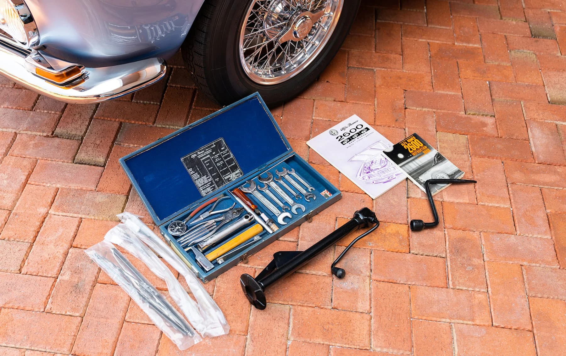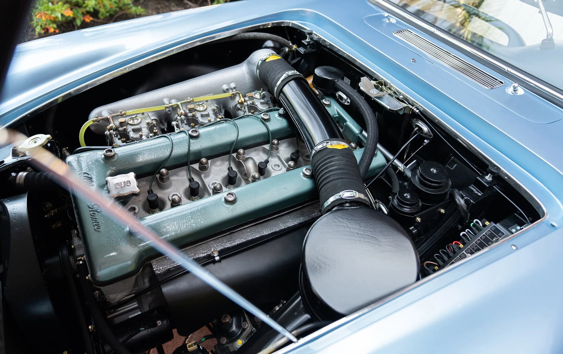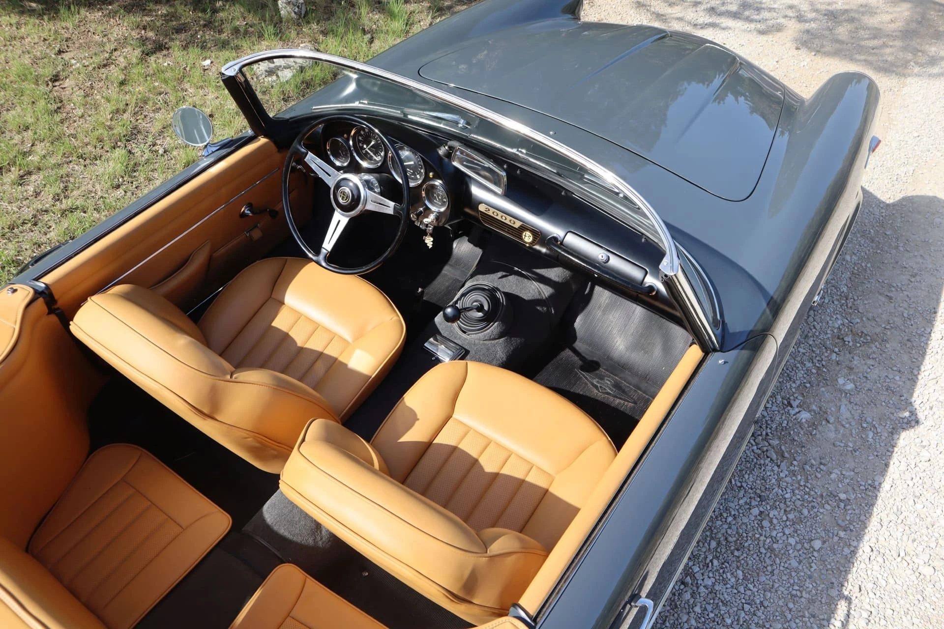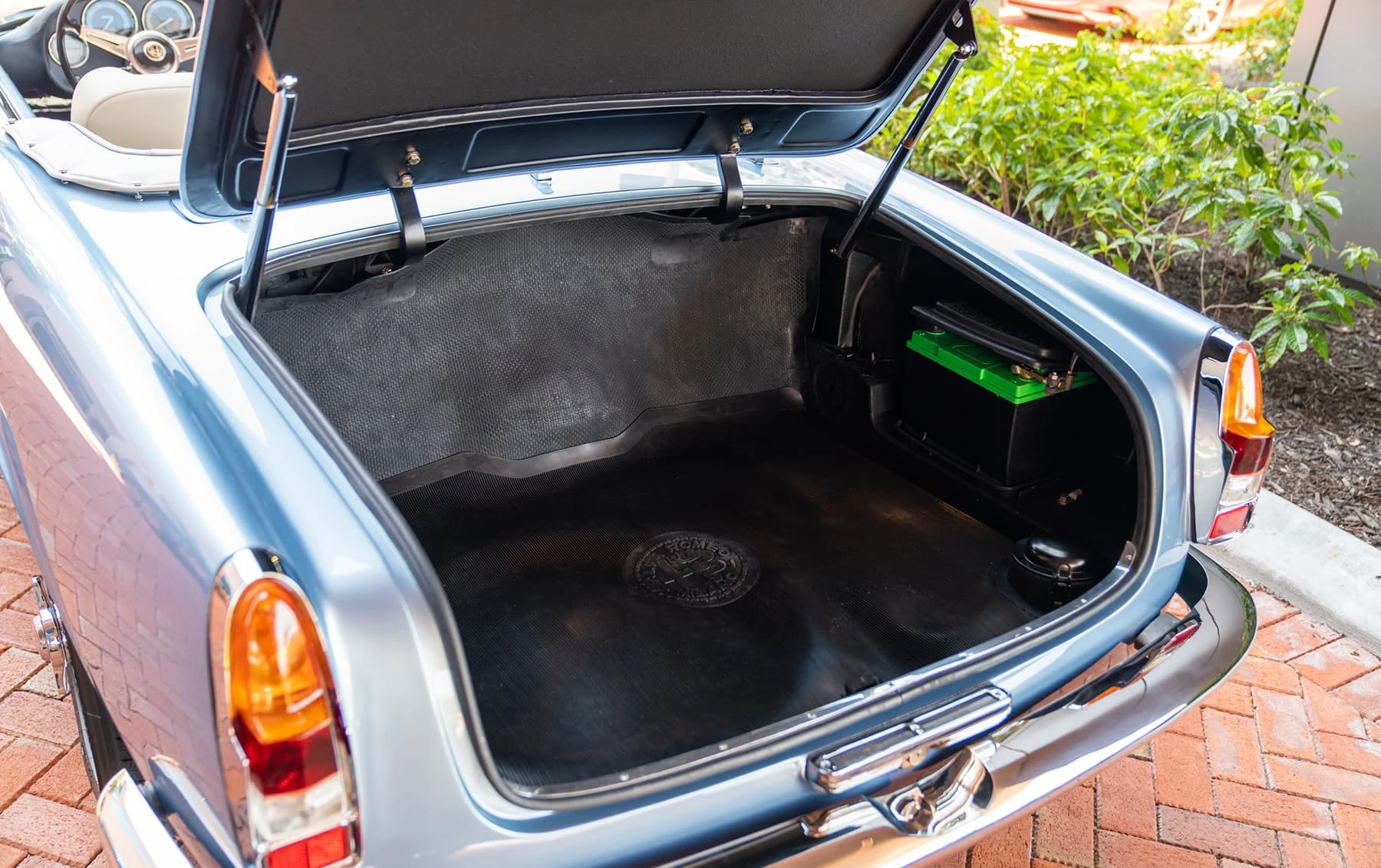 Réduite à l’état de métal nu, cette 2600 Spider a été repeinte dans une superbe teinte de bleu clair métallisé, associée à un intérieur recouvert de cuir de couleur lin. Le tableau de bord, typiquement en vinyle, a été recouvert de cuir bleu, ce qui crée un effet visuel saisissant avec la moquette et les passepoils des sièges bleu foncé. Le moteur a été reconstruit par les experts de la marque, Motorcraft, dans l’Indiana. Comme il s’agit d’une voiture de fin de production, les caches-cames sont finis en vert métallique et un rare jeu de carburateurs Weber plus performants a été installé en usine. En outre, elle est proposée avec un toit rigide en option d’usine – une pièce rare qui est complétée par le nouveau toit décapotable bleu.
