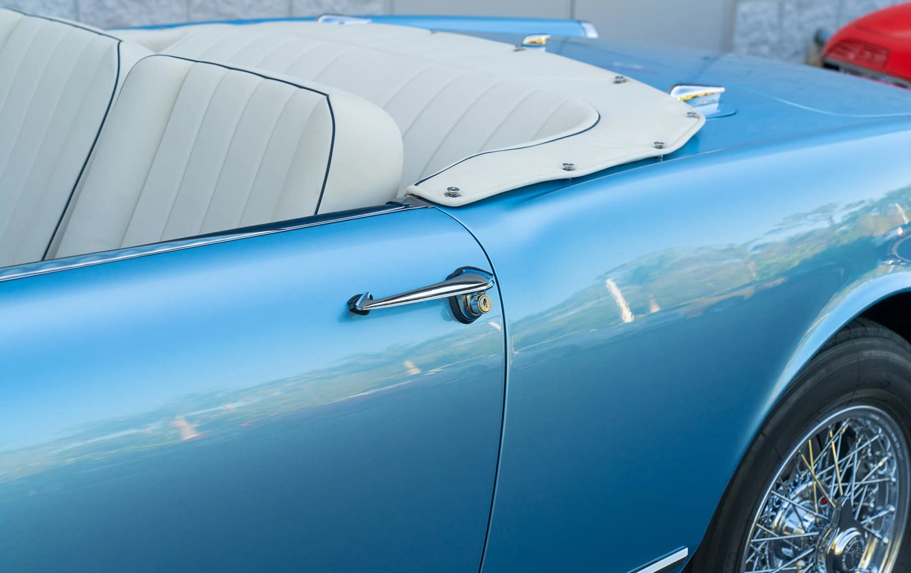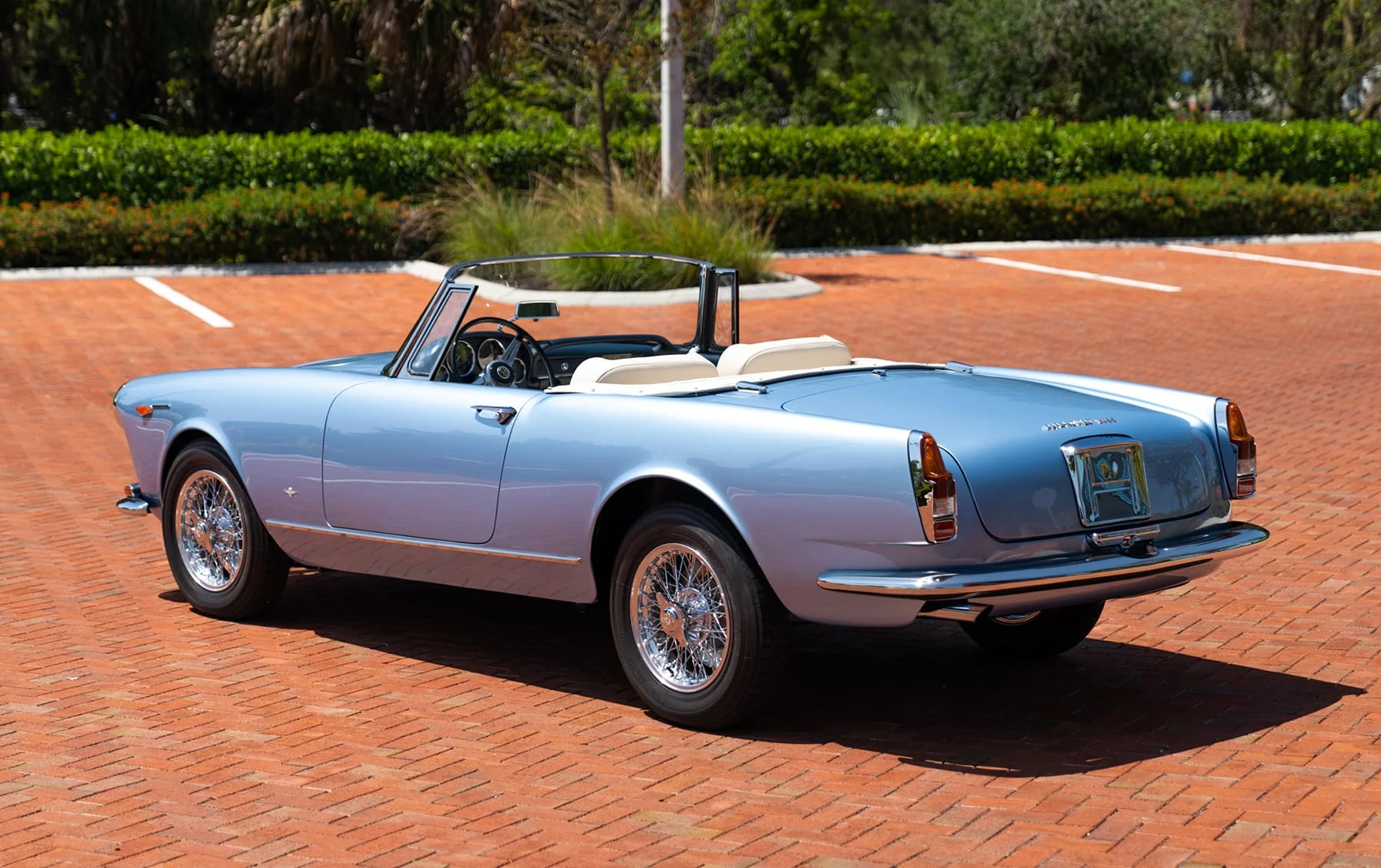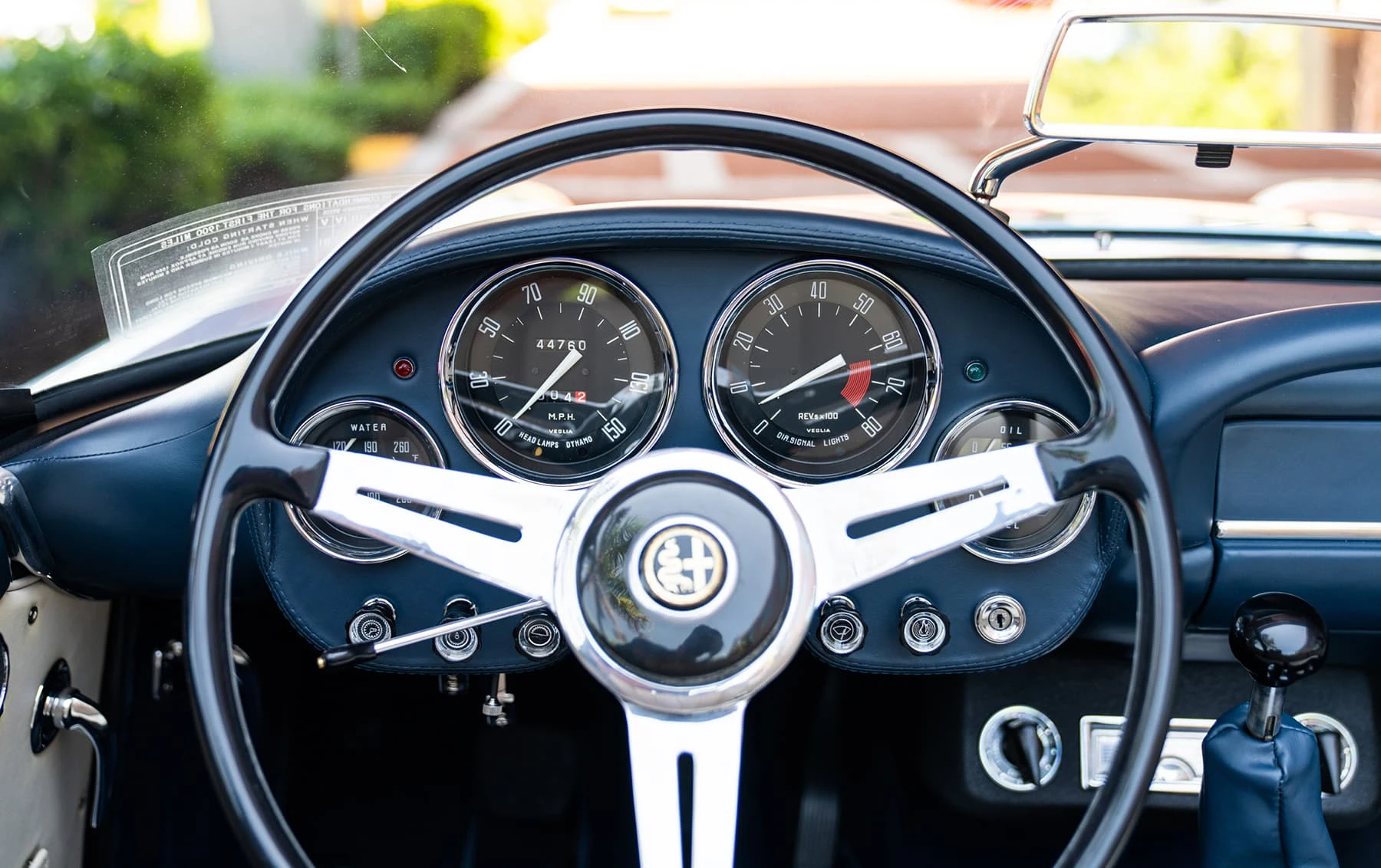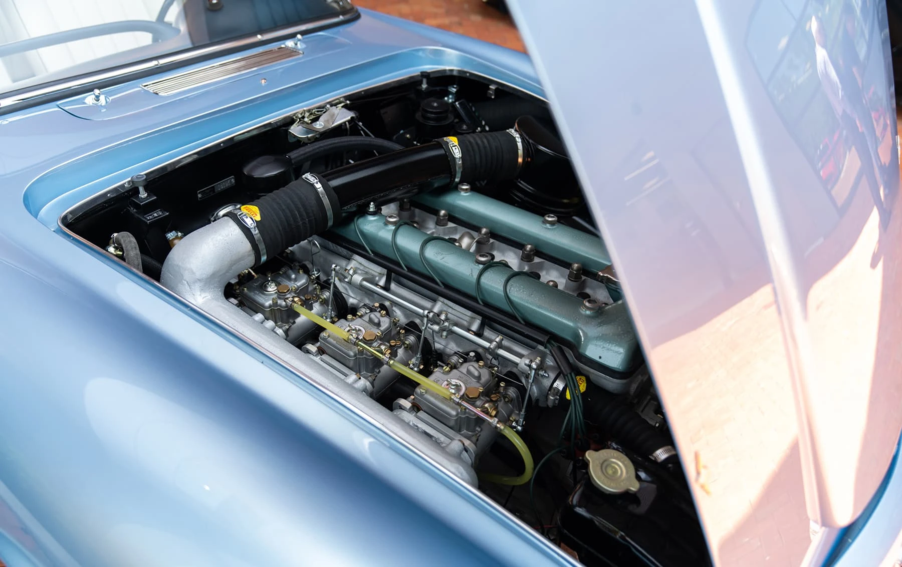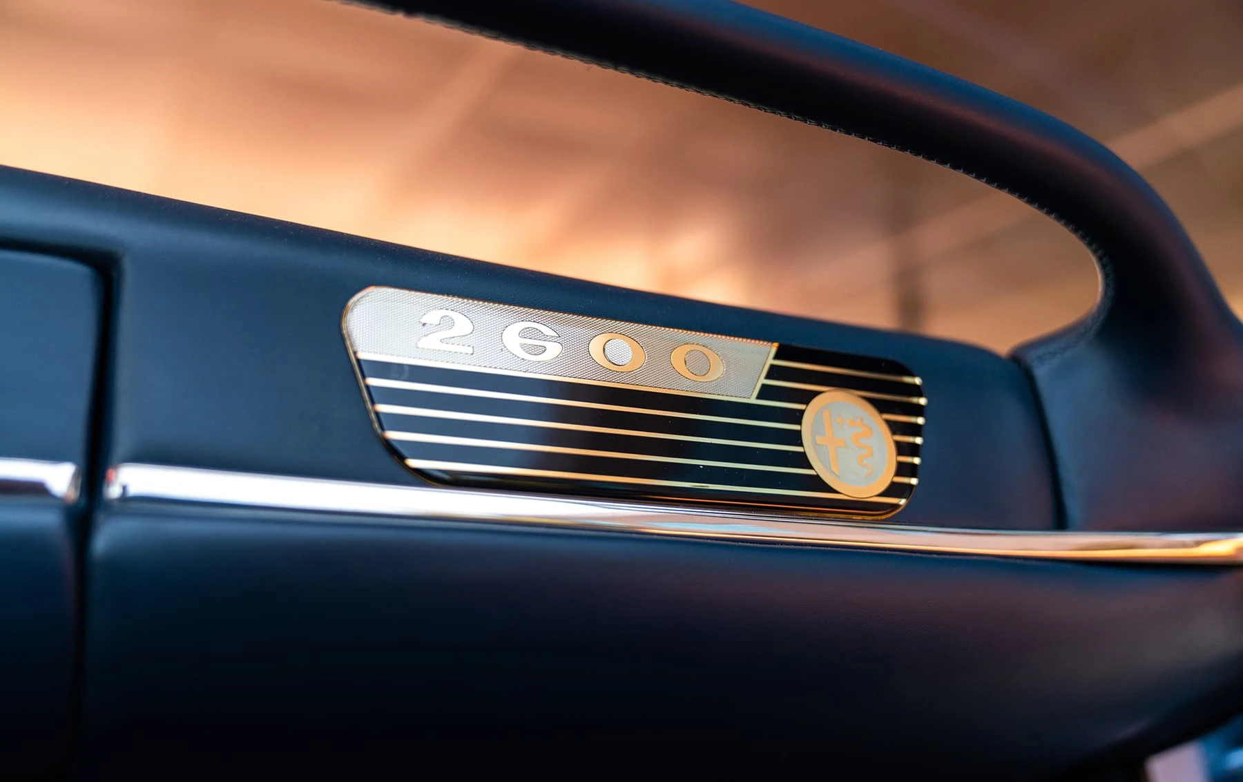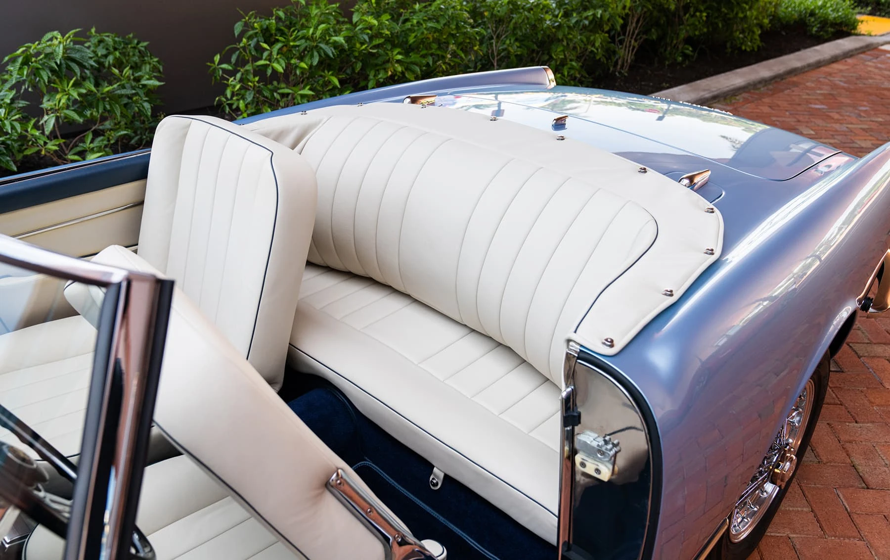 Réduite à l’état de métal nu, cette 2600 Spider a été repeinte dans une superbe teinte de bleu clair métallisé, associée à un intérieur recouvert de cuir de couleur lin. Le tableau de bord, typiquement en vinyle, a été recouvert de cuir bleu, ce qui crée un effet visuel saisissant avec la moquette et les passepoils des sièges bleu foncé. Le moteur a été reconstruit par les experts de la marque, Motorcraft, dans l’Indiana. Comme il s’agit d’une voiture de fin de production, les caches-cames sont finis en vert métallique et un rare jeu de carburateurs Weber plus performants a été installé en usine. En outre, elle est proposée avec un toit rigide en option d’usine – une pièce rare qui est complétée par le nouveau toit décapotable bleu.