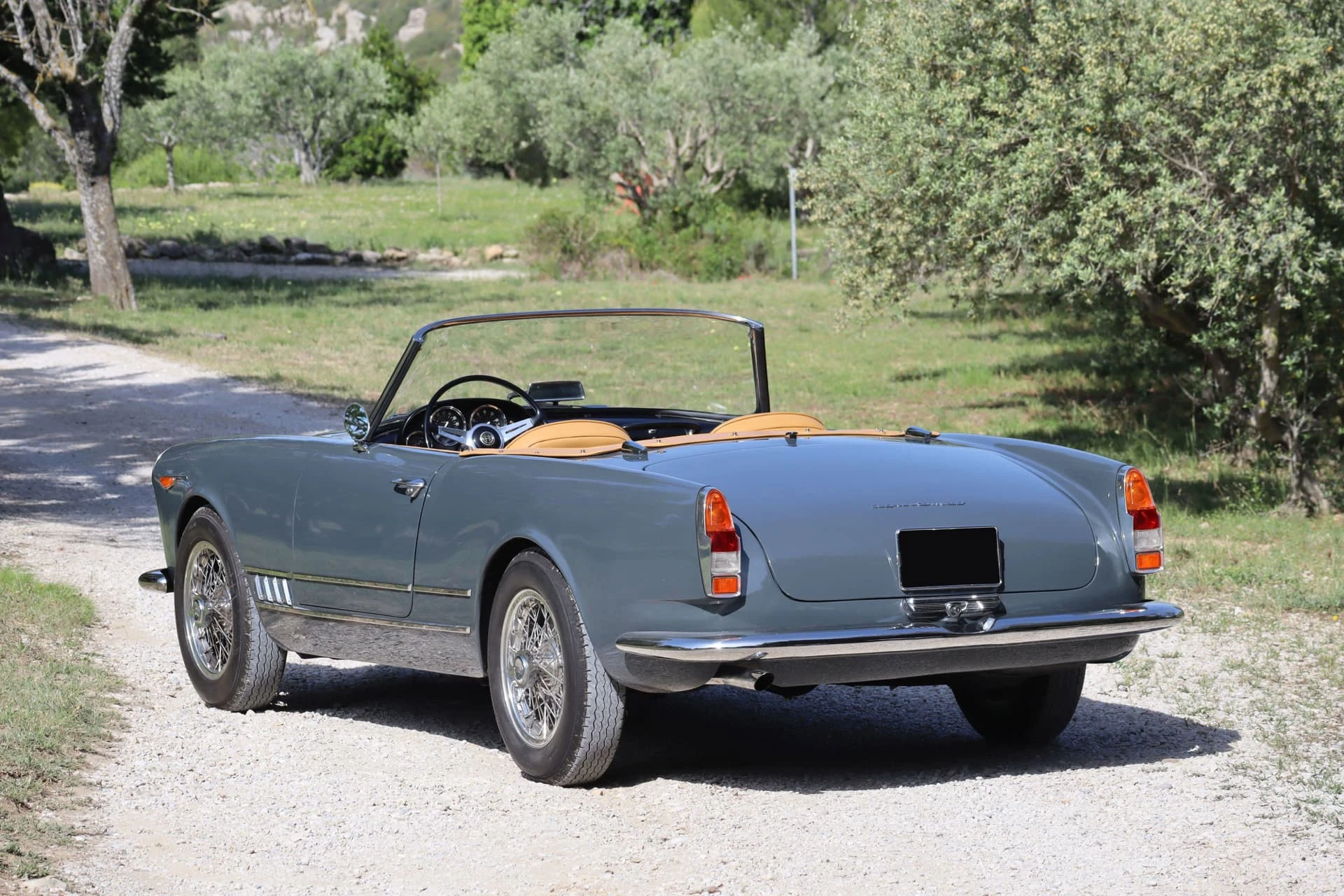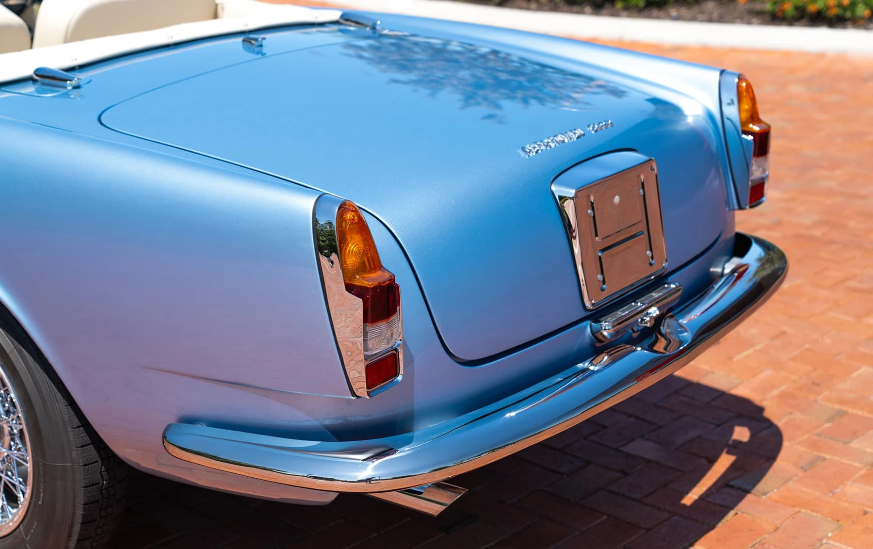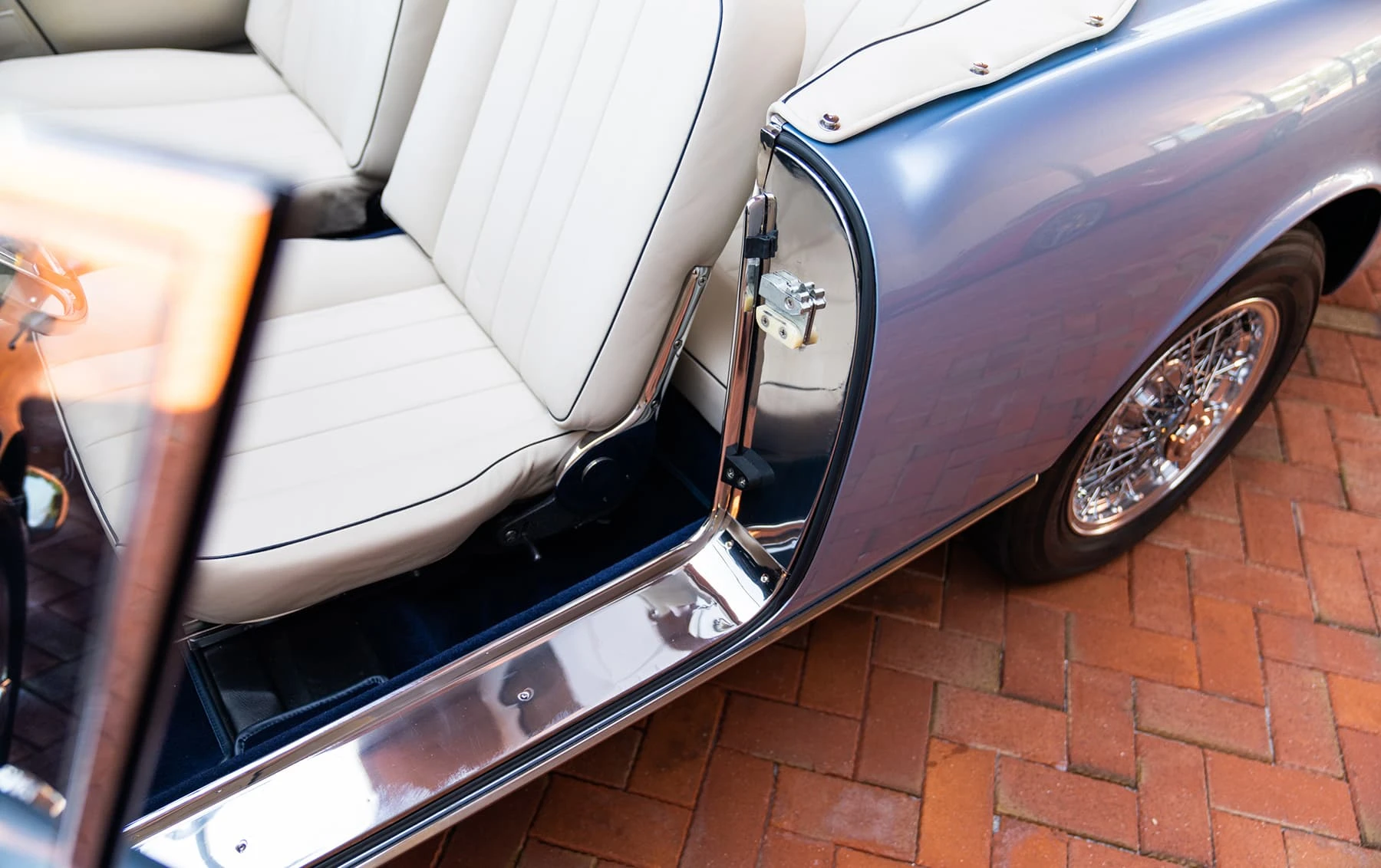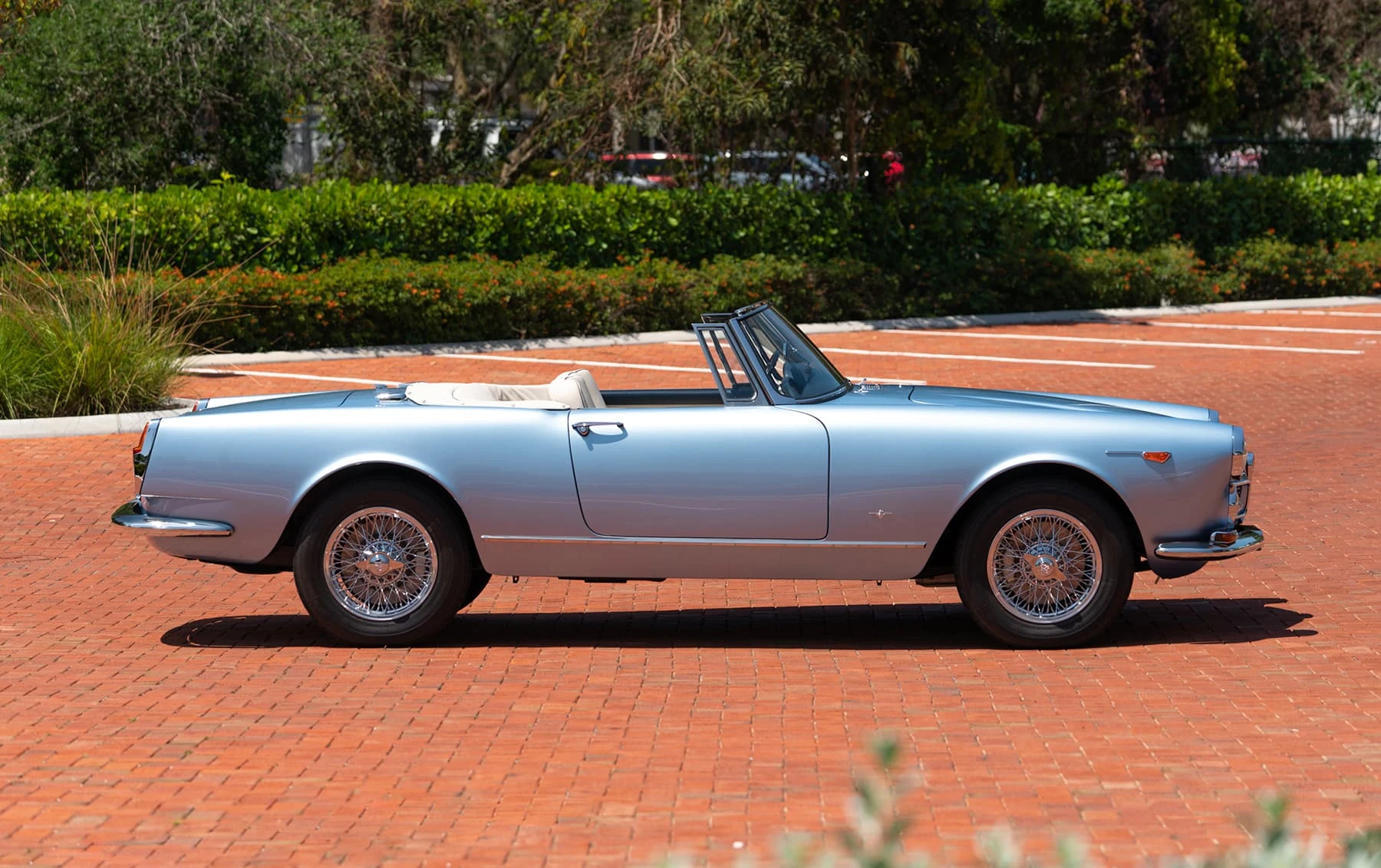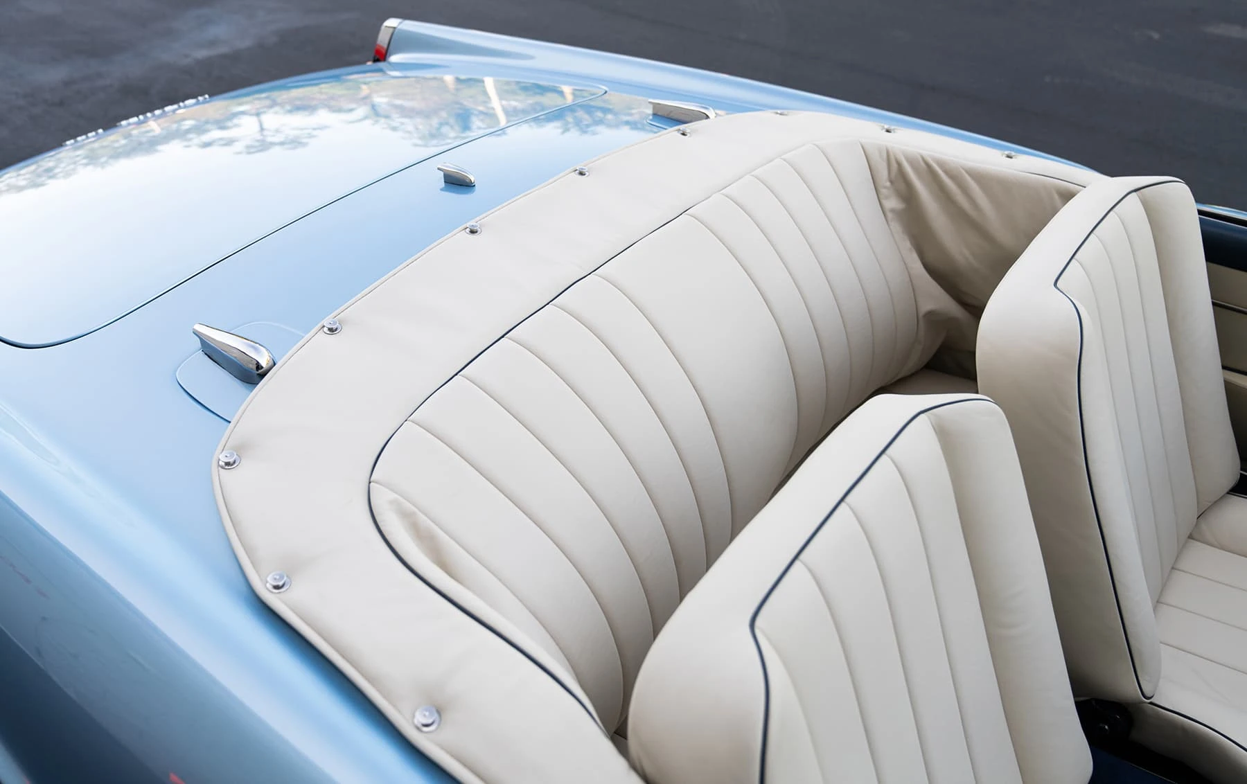 Réduite à l’état de métal nu, cette 2600 Spider a été repeinte dans une superbe teinte de bleu clair métallisé, associée à un intérieur recouvert de cuir de couleur lin. Le tableau de bord, typiquement en vinyle, a été recouvert de cuir bleu, ce qui crée un effet visuel saisissant avec la moquette et les passepoils des sièges bleu foncé. Le moteur a été reconstruit par les experts de la marque, Motorcraft, dans l’Indiana. Comme il s’agit d’une voiture de fin de production, les caches-cames sont finis en vert métallique et un rare jeu de carburateurs Weber plus performants a été installé en usine. En outre, elle est proposée avec un toit rigide en option d’usine – une pièce rare qui est complétée par le nouveau toit décapotable bleu.
