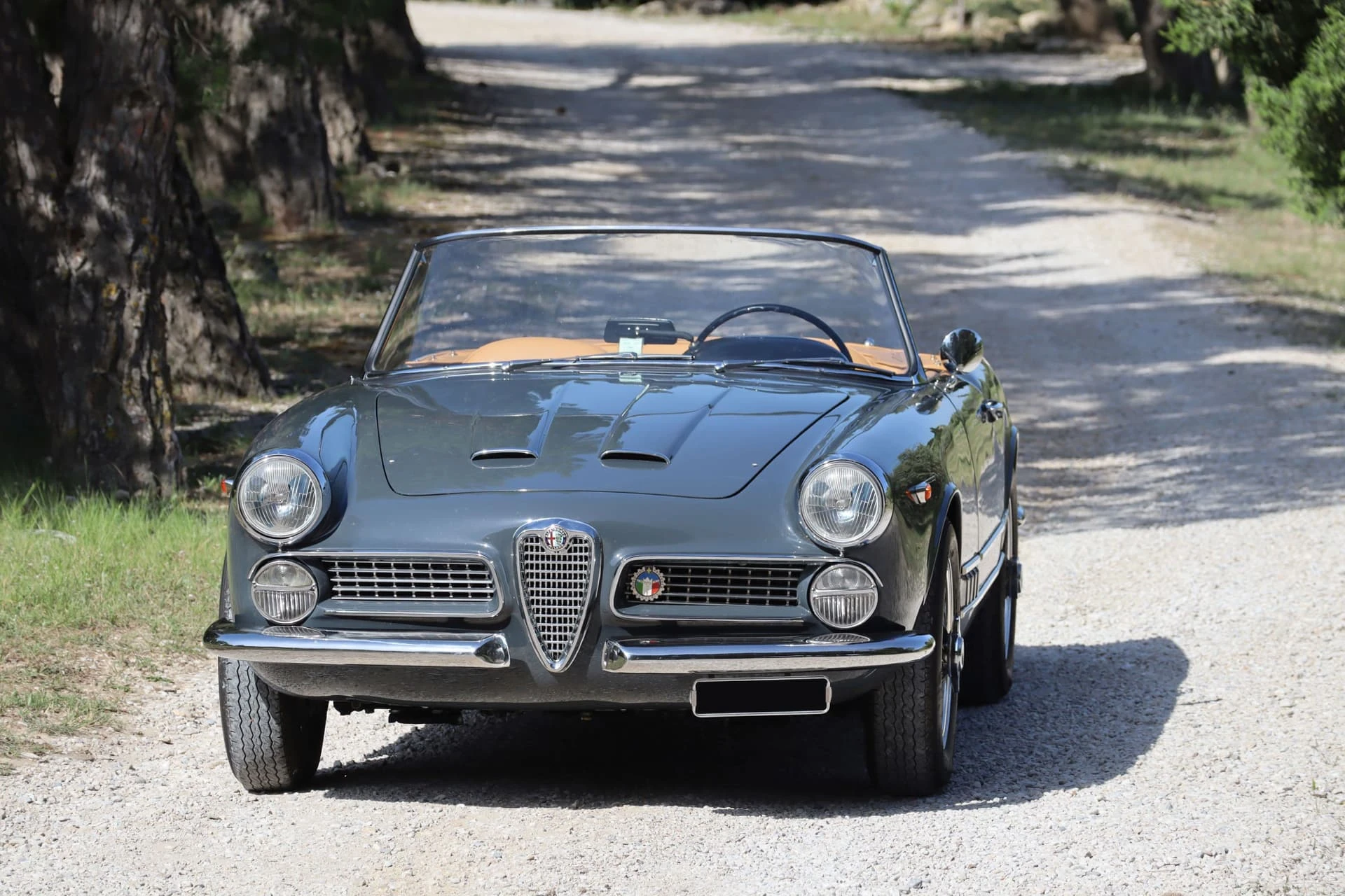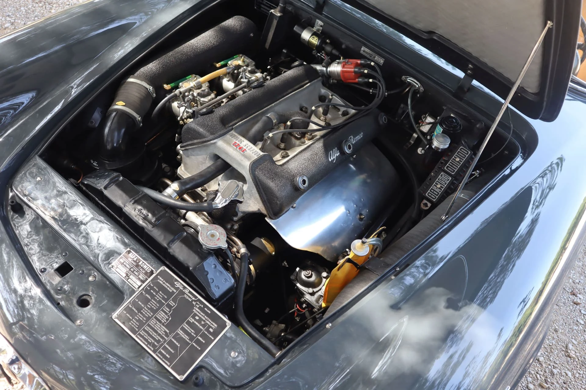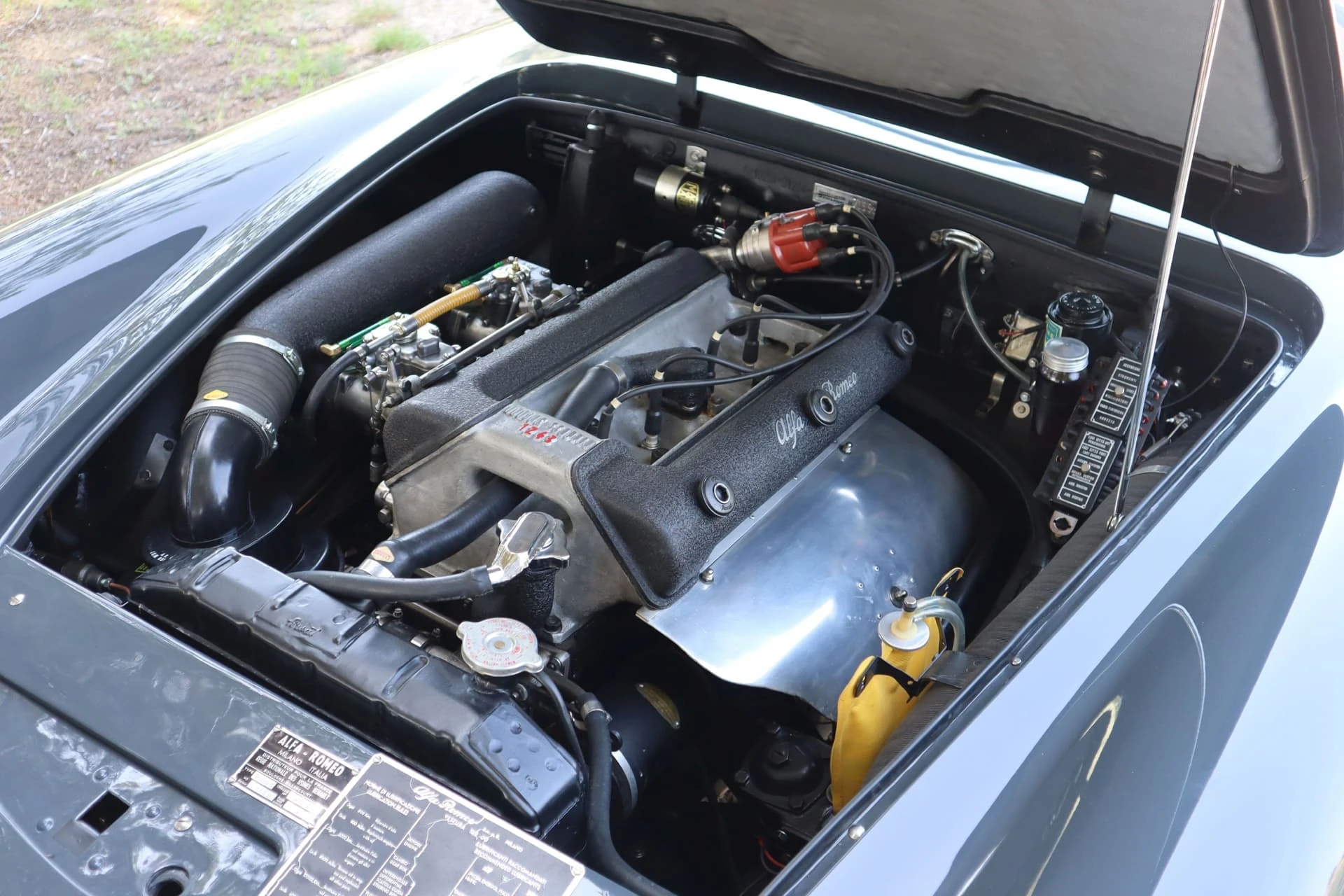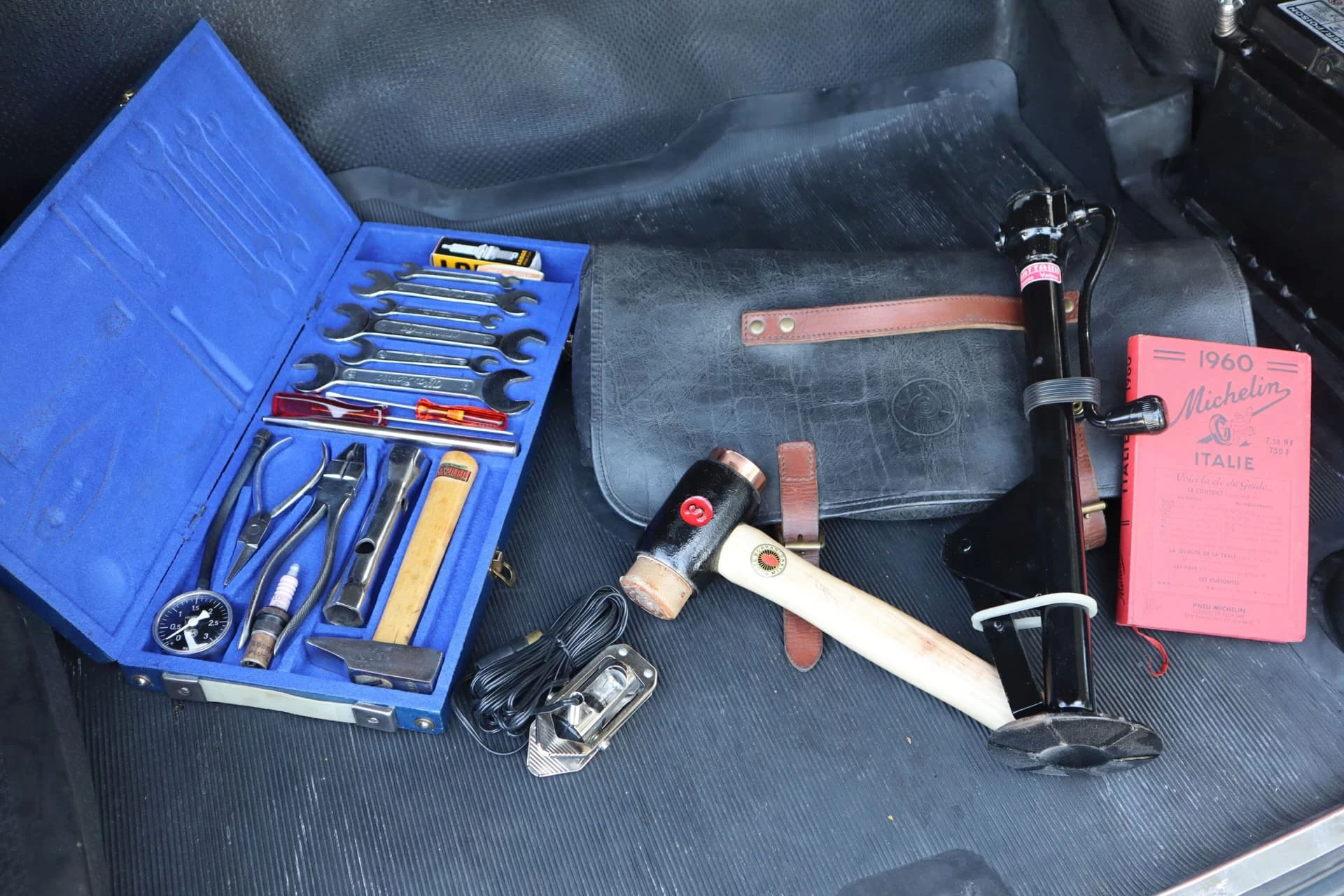 Cet exemplaire (Châssis 01234) de 1960 s’avère aussi très intéressant : le certificat d’origine délivré par Alfa mentionne qu’elle a été vendue neuve à la Régie Renault, ce qui rappelle la collaboration qui existait alors entre Alfa Romeo et la marque française. On retrouve d’ailleurs sous le capot la plaque d’homologation d’époque.
