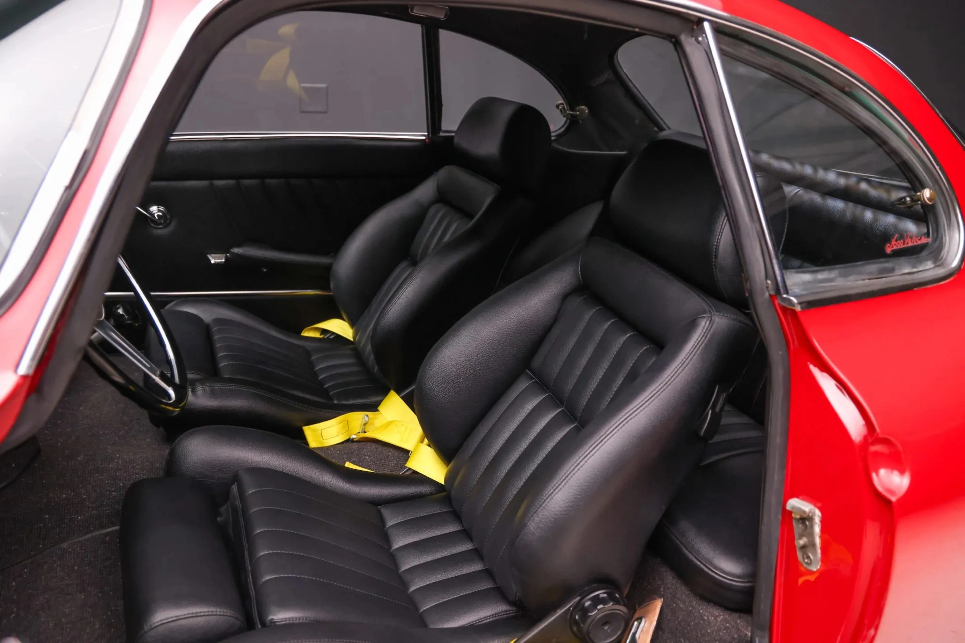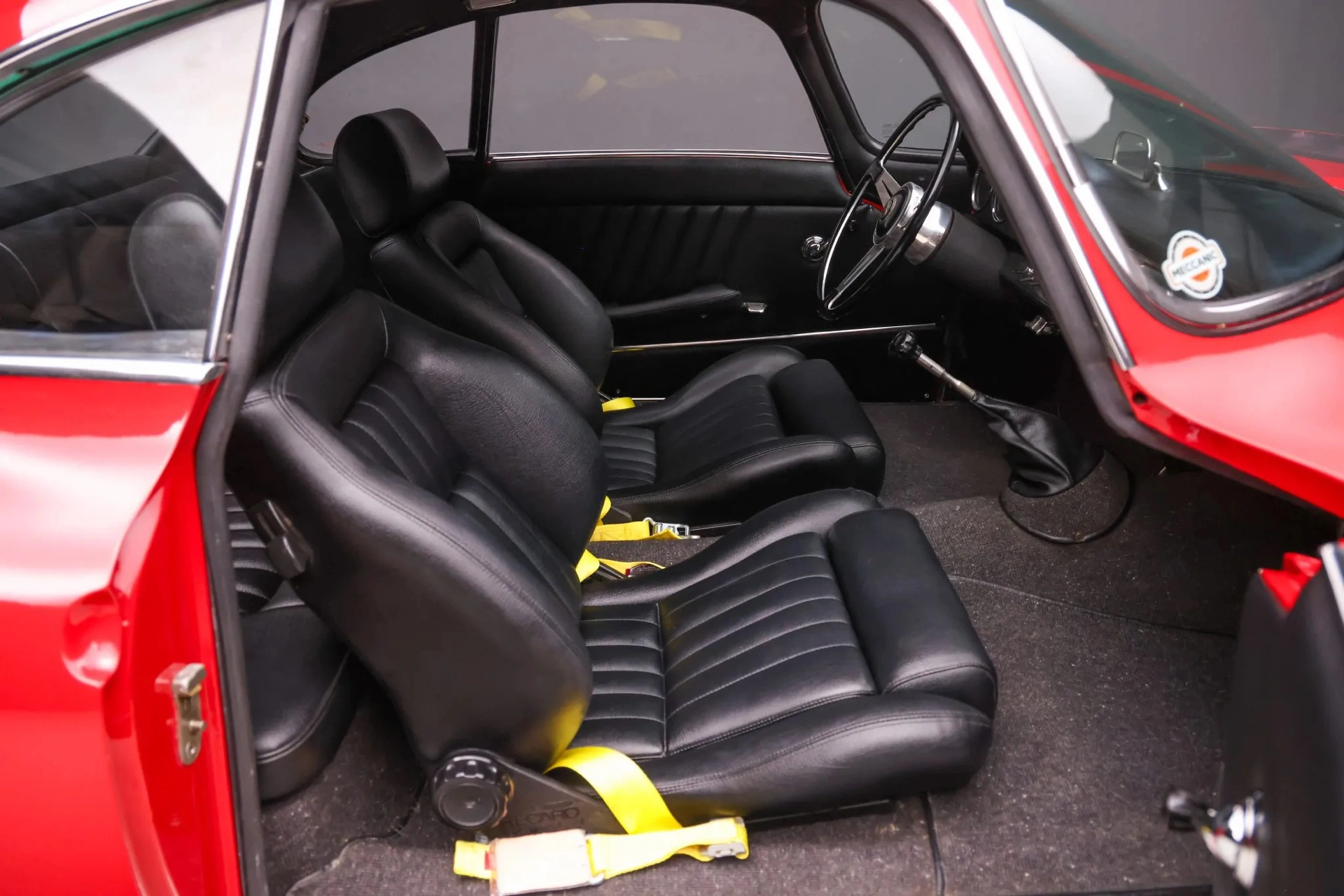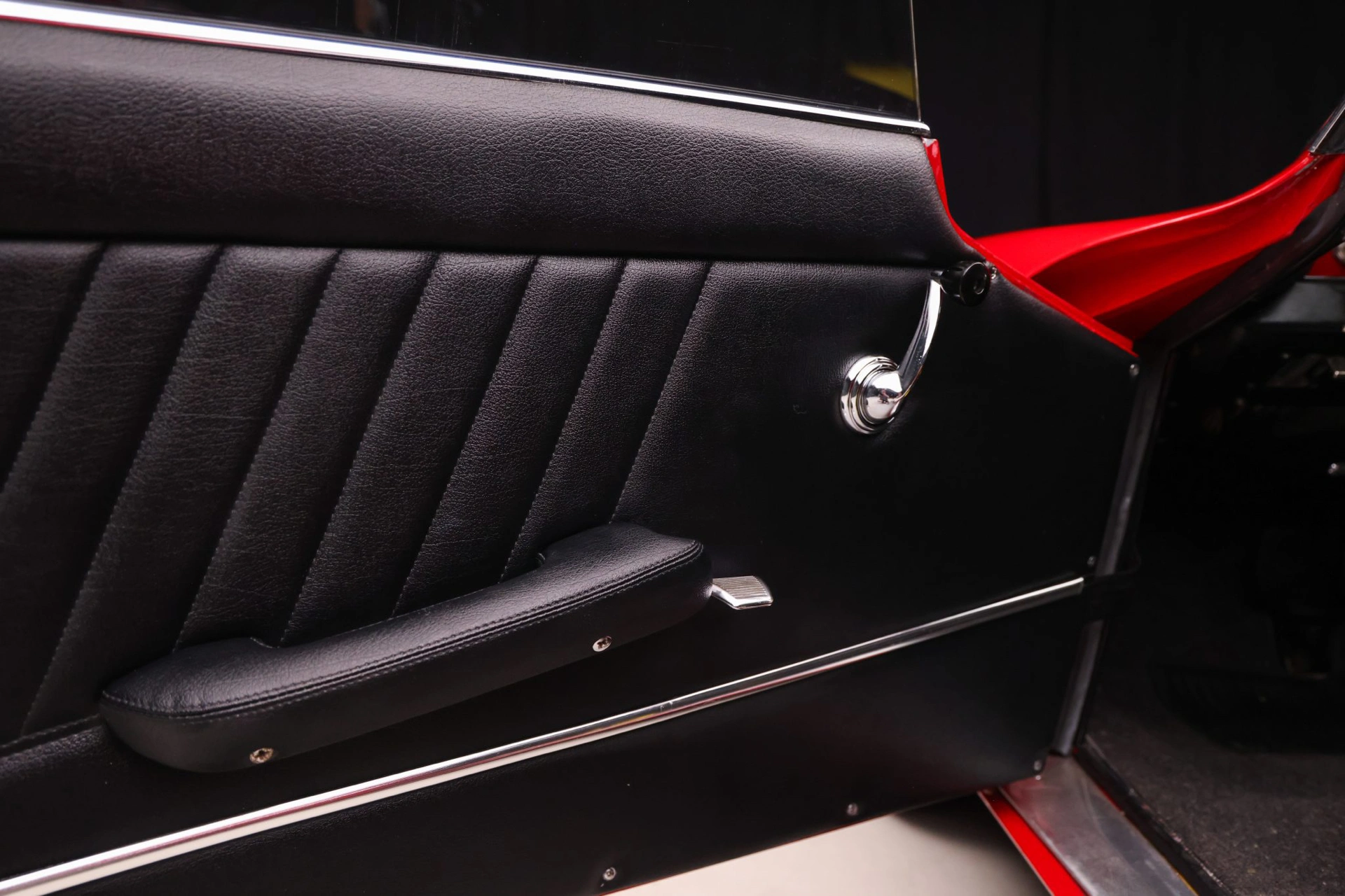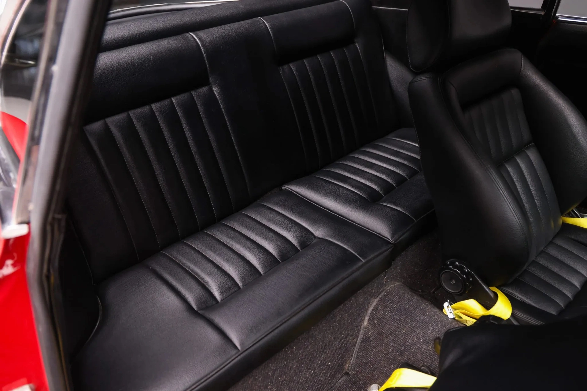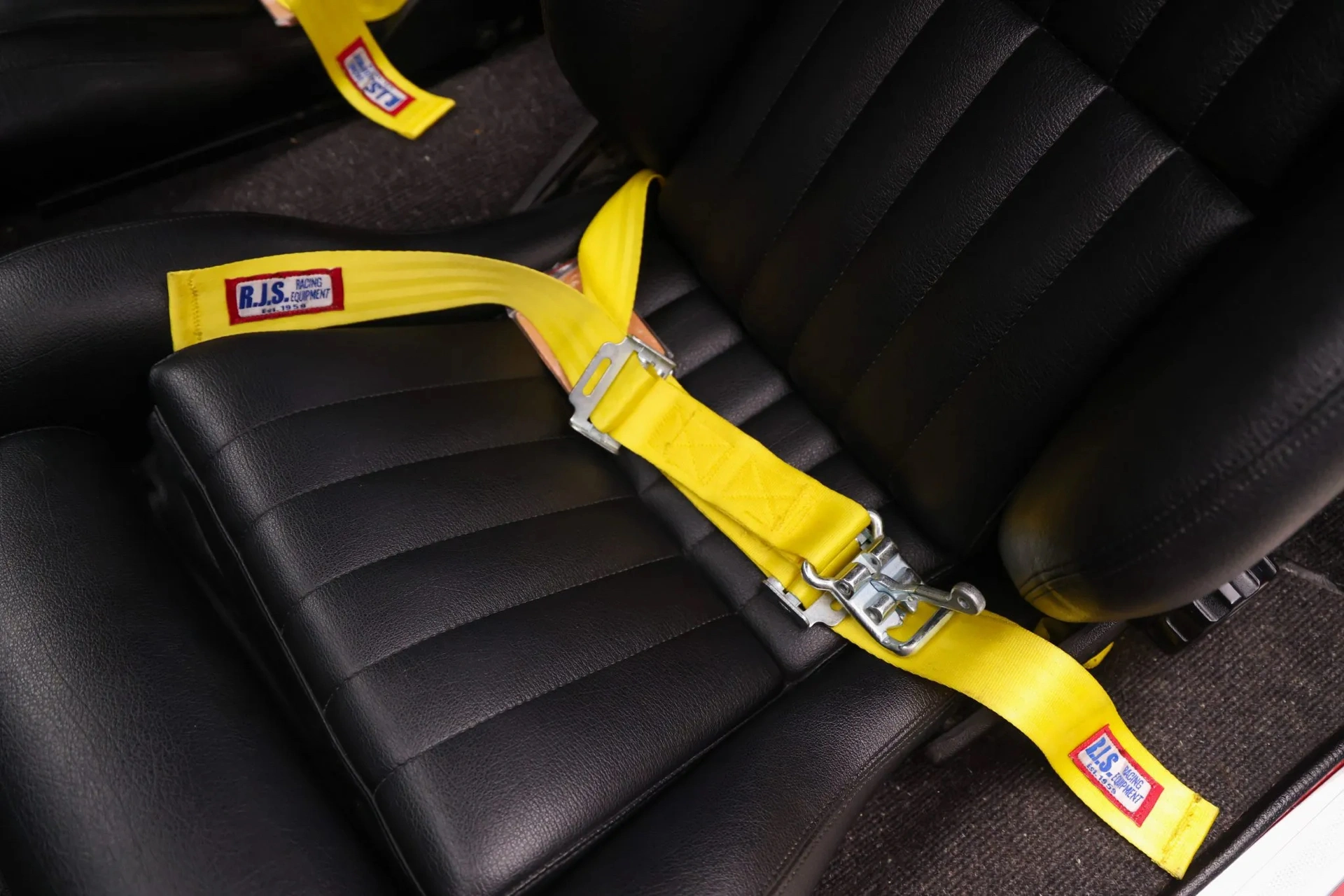 L’habitacle abrite des sièges baquets avant Recaro garnis de cuir noir, accompagnés d’une banquette arrière et de panneaux de porte de couleur coordonnée. Les sièges avant sont équipés de ceintures abdominales R.J.S. Racing Equipment, et des moquettes noires de remplacement recouvrent les sols.