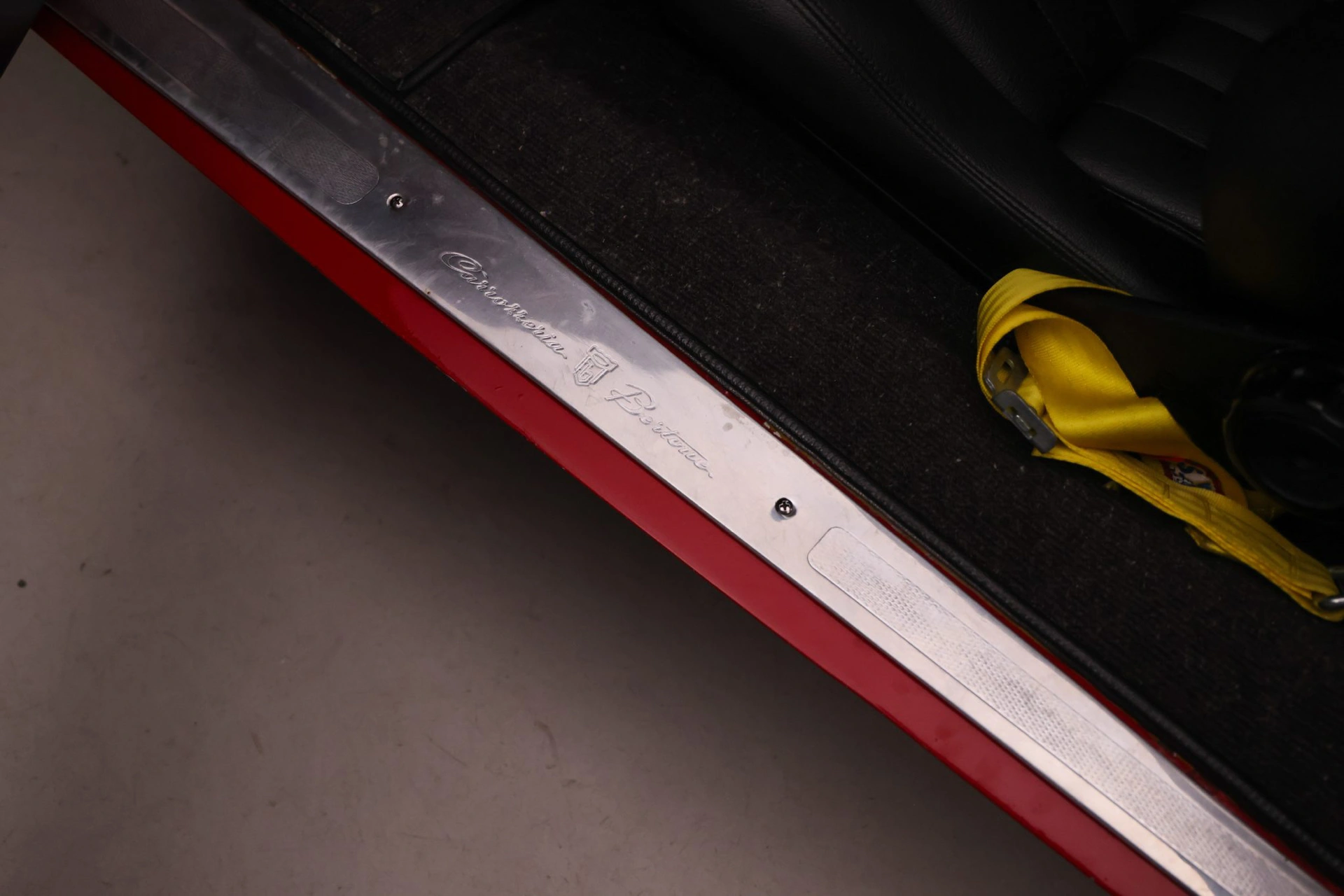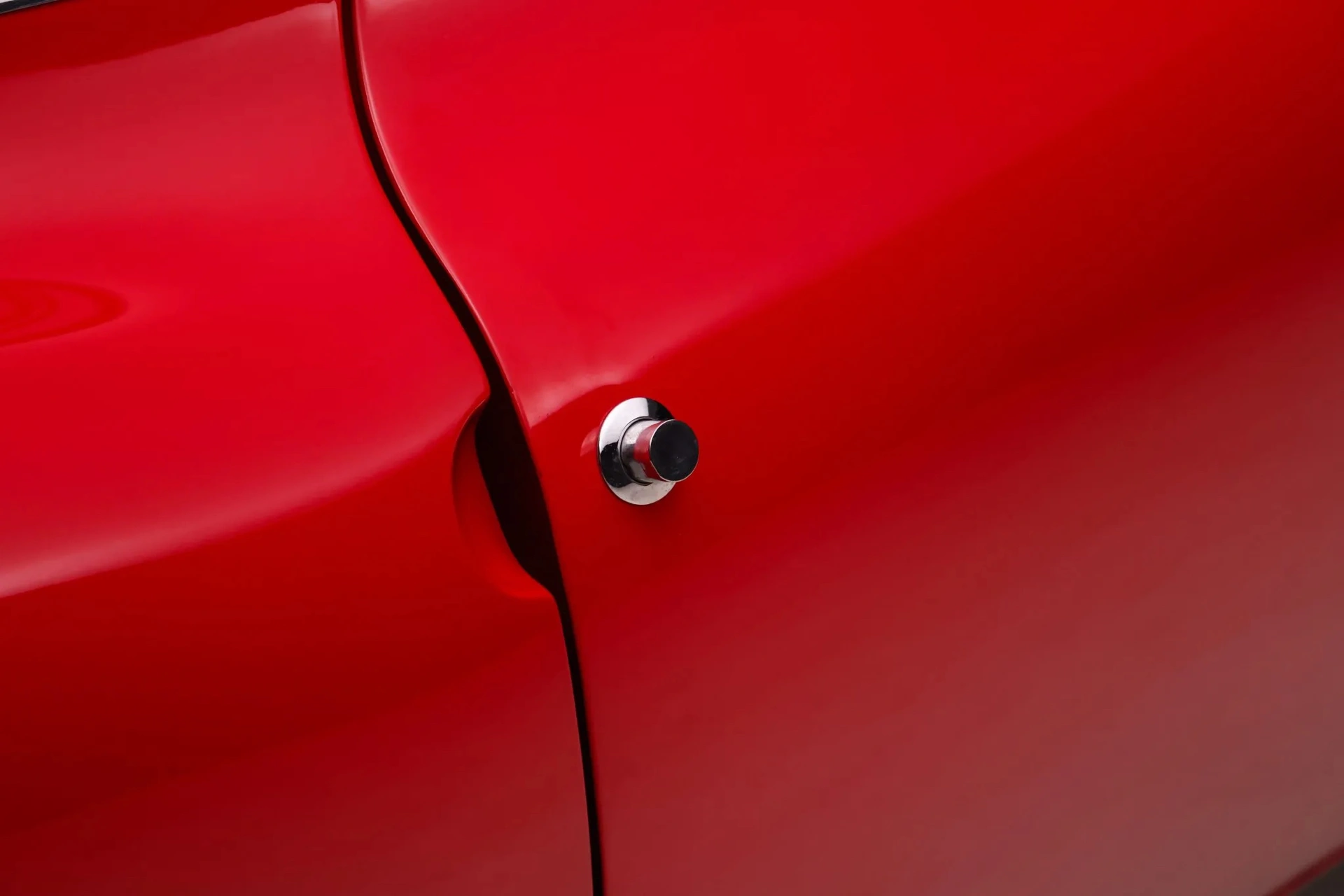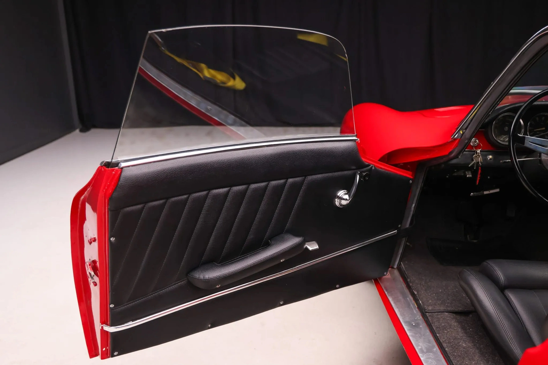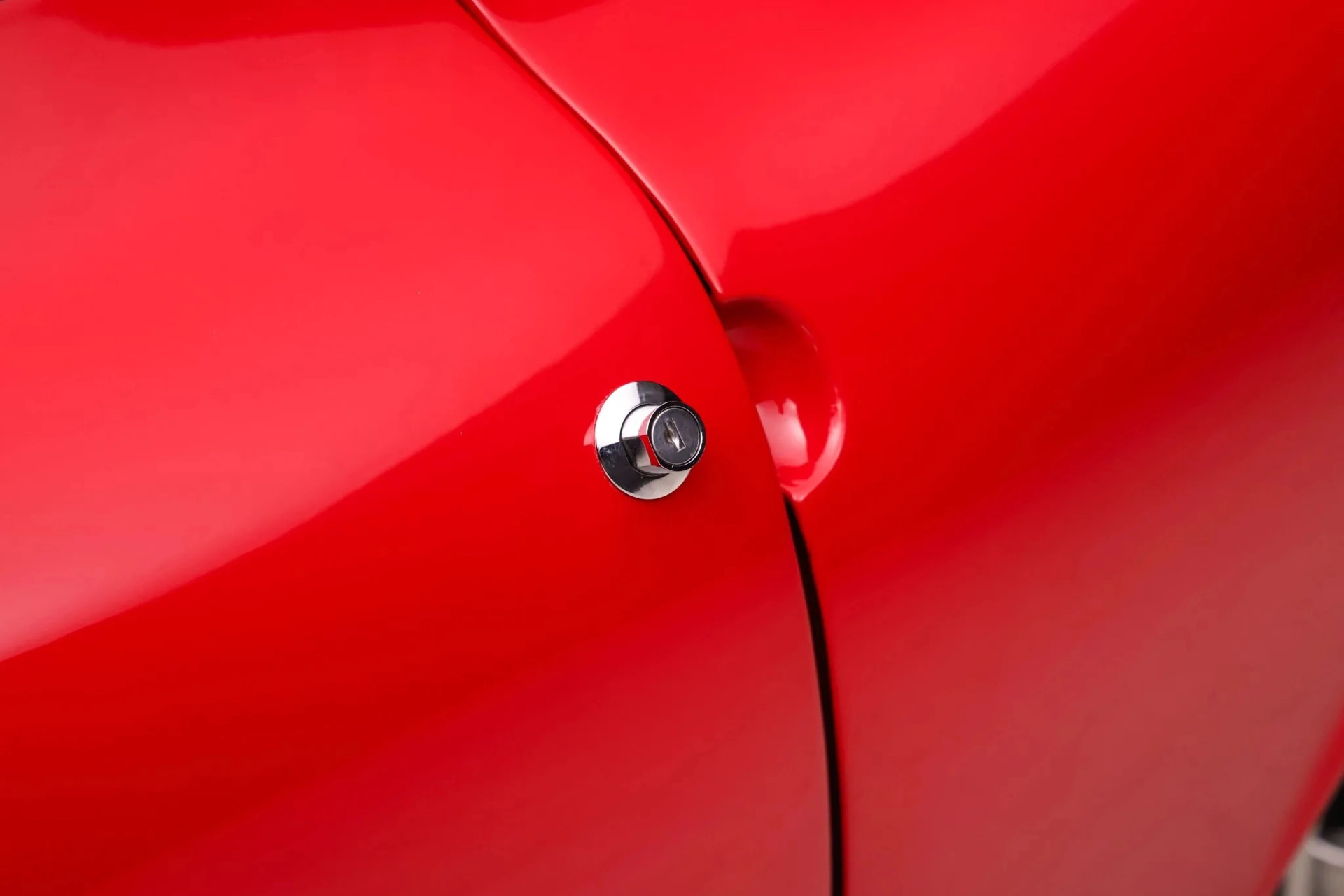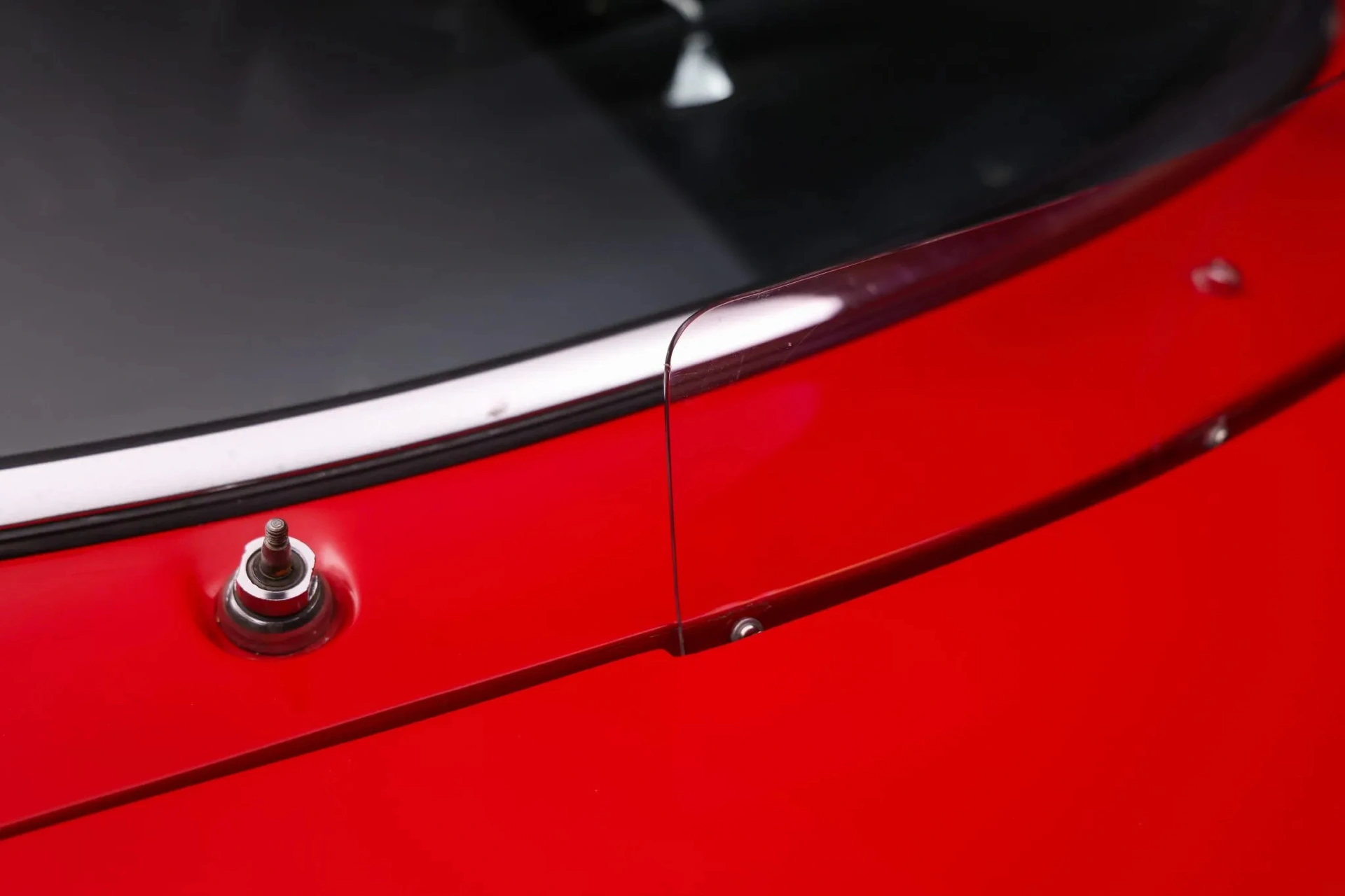 L’habitacle abrite des sièges baquets avant Recaro garnis de cuir noir, accompagnés d’une banquette arrière et de panneaux de porte de couleur coordonnée. Les sièges avant sont équipés de ceintures abdominales R.J.S. Racing Equipment, et des moquettes noires de remplacement recouvrent les sols.