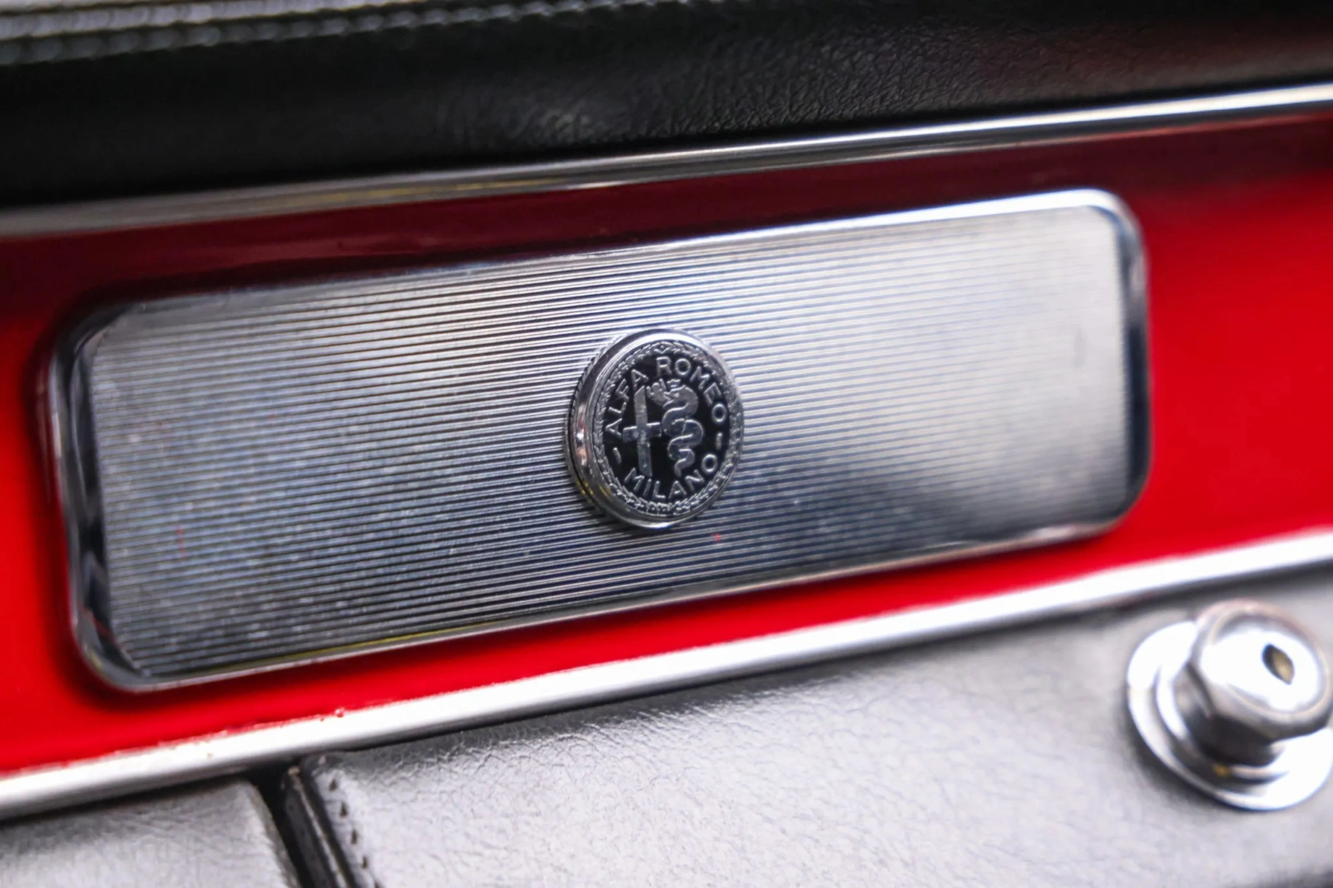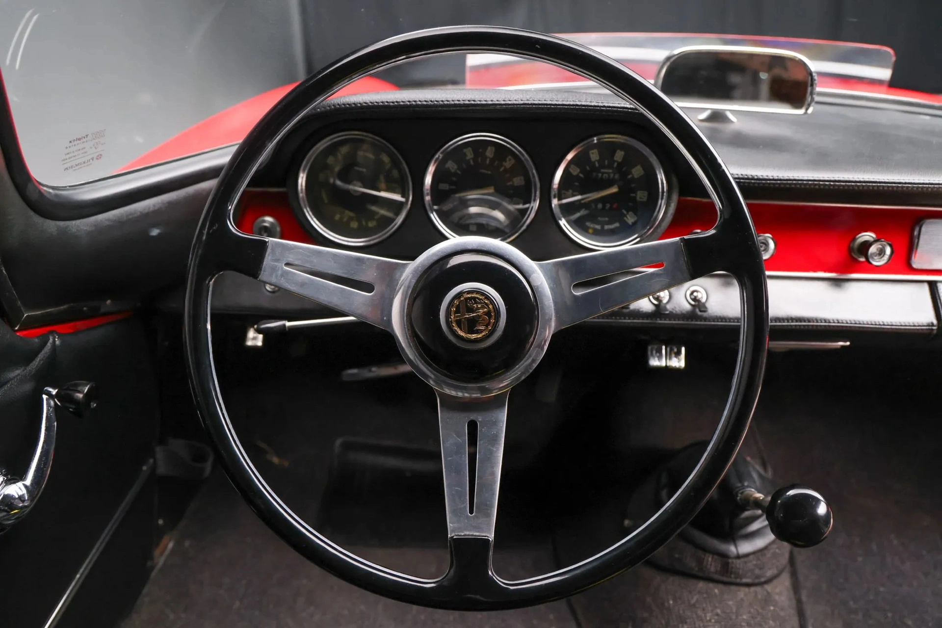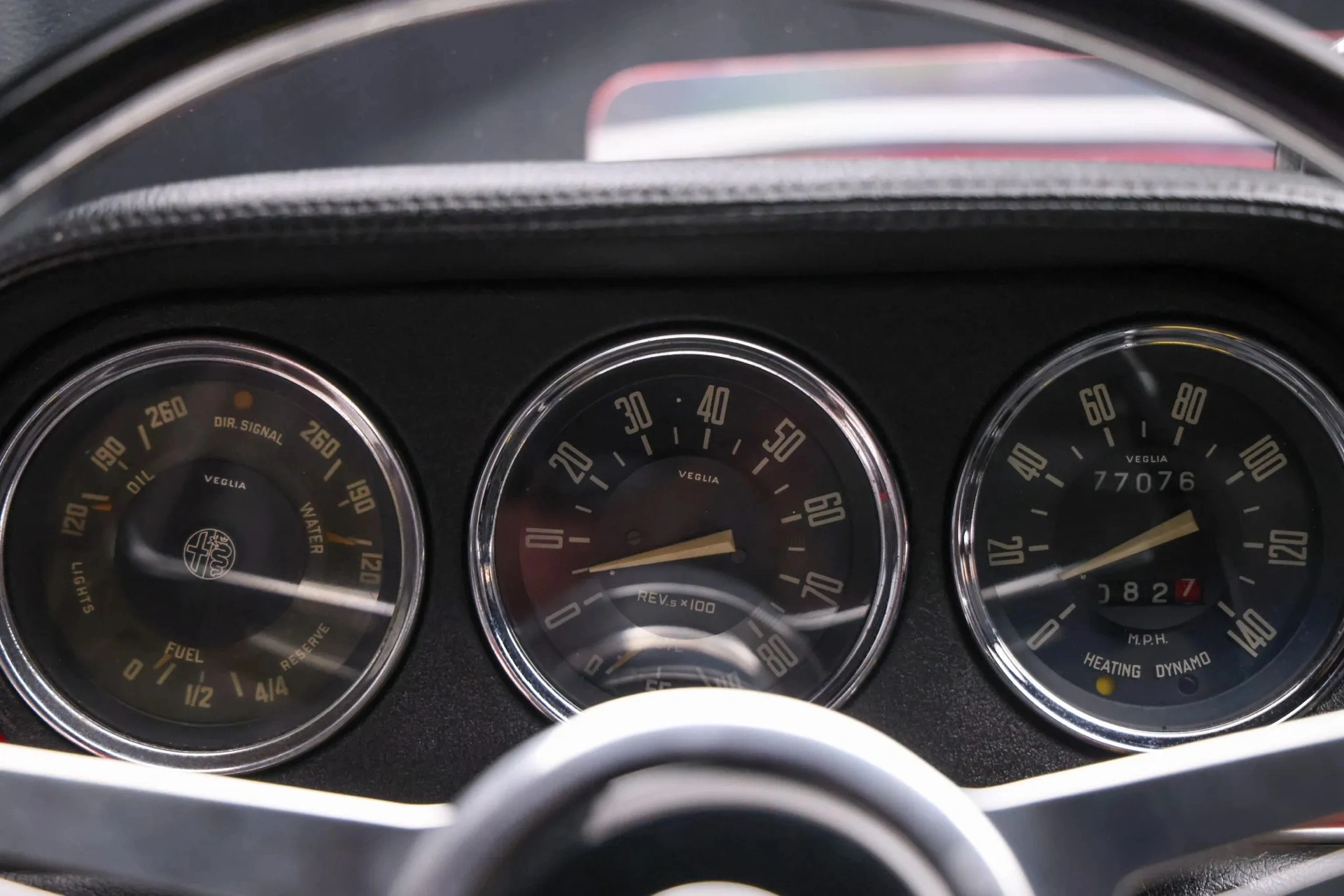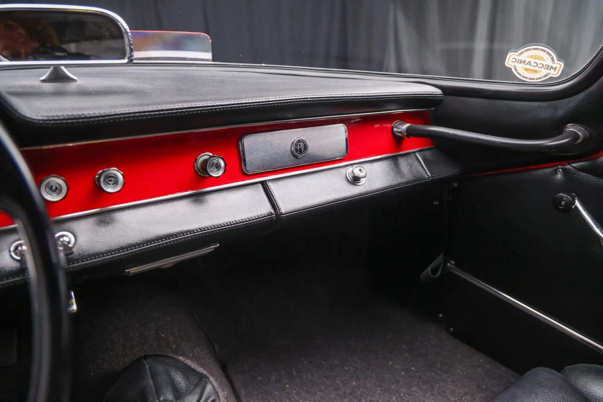Un volant à branches séparées précède l’instrumentation Veglia composée d’un tachymètre à 8 000 tr/min avec un affichage de la pression d’huile, flanqué d’un compteur de vitesse à 140 mph et d’une jauge combinée. La Giulia SS présentait un tableau de bord révisé par rapport à la Giulietta SS, avec l’ajout d’une boîte à gants verrouillable et d’un revêtement en cuir sur la partie inférieure du tableau de bord. Le compteur à cinq chiffres indique 77 000 miles, dont environ 100 ont été ajoutés par le propriétaire actuel.