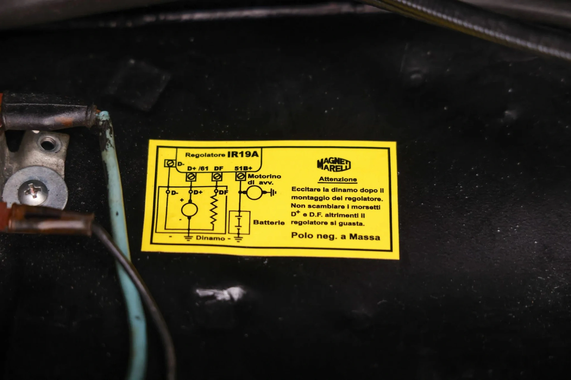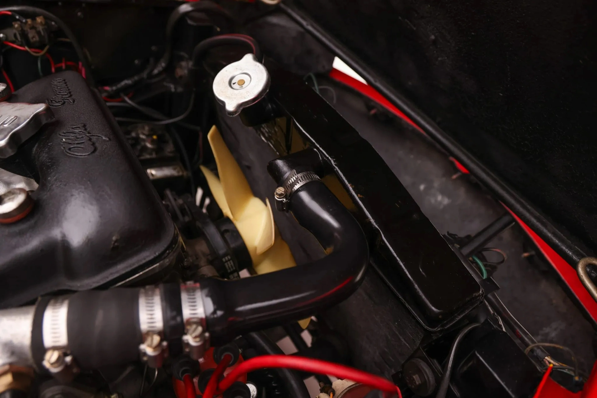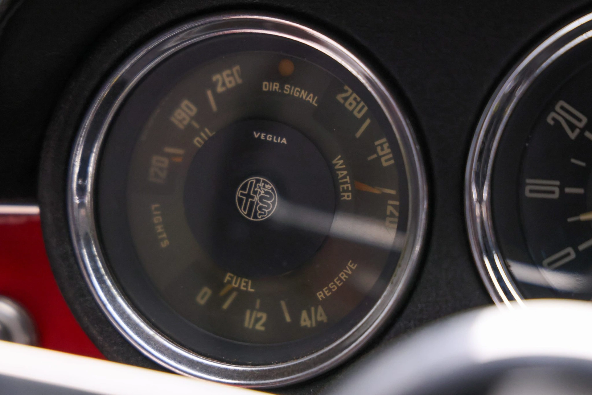 Un volant à branches séparées précède l’instrumentation Veglia composée d’un tachymètre à 8 000 tr/min avec un affichage de la pression d’huile, flanqué d’un compteur de vitesse à 140 mph et d’une jauge combinée. La Giulia SS présentait un tableau de bord révisé par rapport à la Giulietta SS, avec l’ajout d’une boîte à gants verrouillable et d’un revêtement en cuir sur la partie inférieure du tableau de bord. Le compteur à cinq chiffres indique 77 000 miles, dont environ 100 ont été ajoutés par le propriétaire actuel.