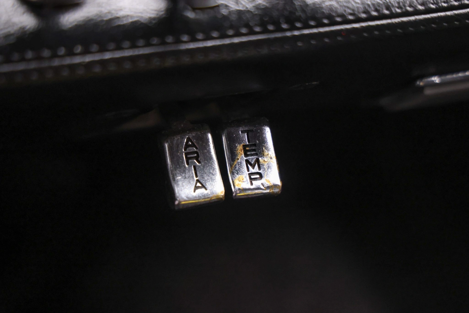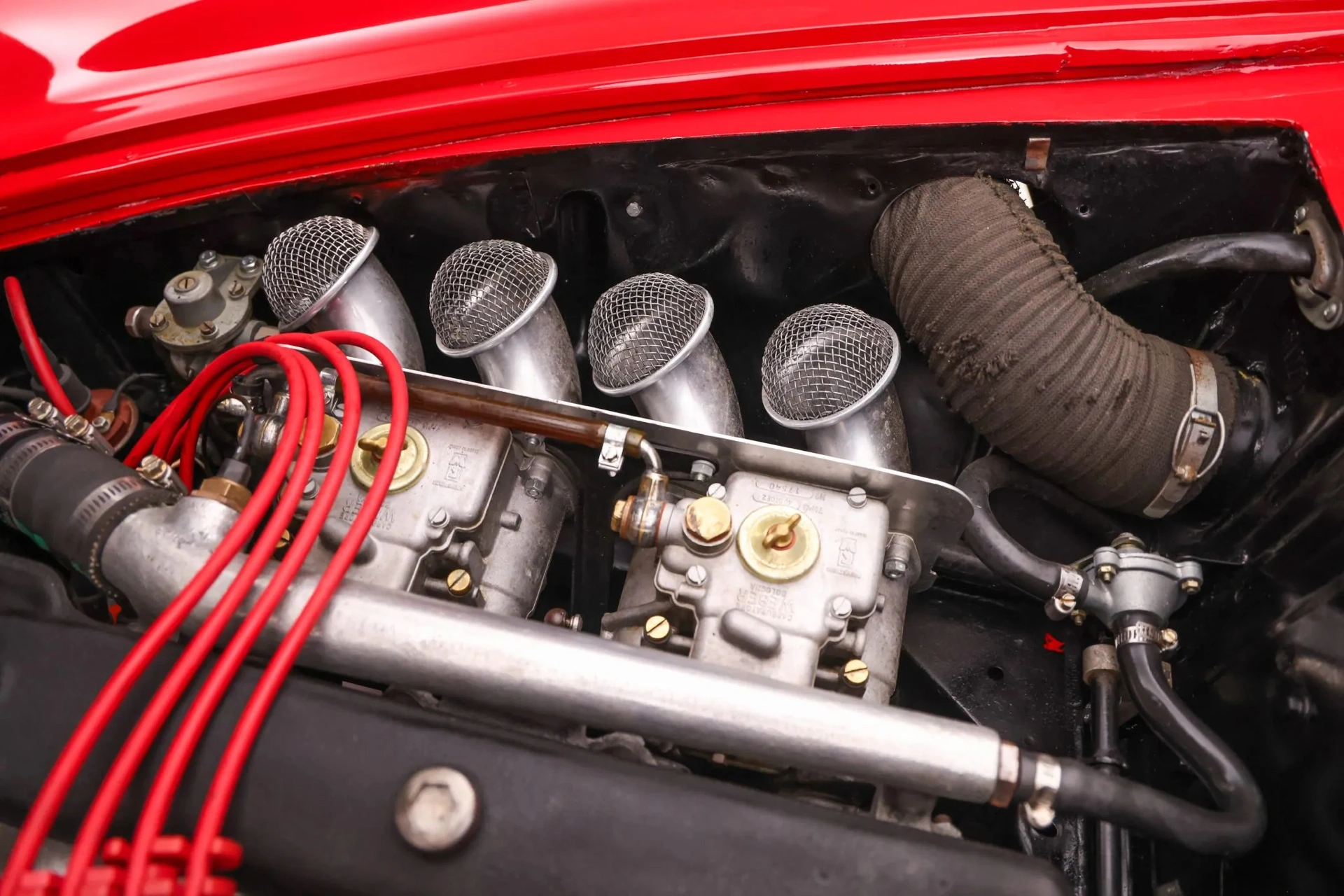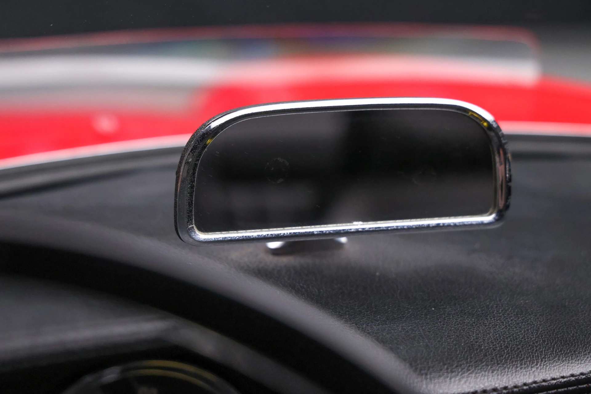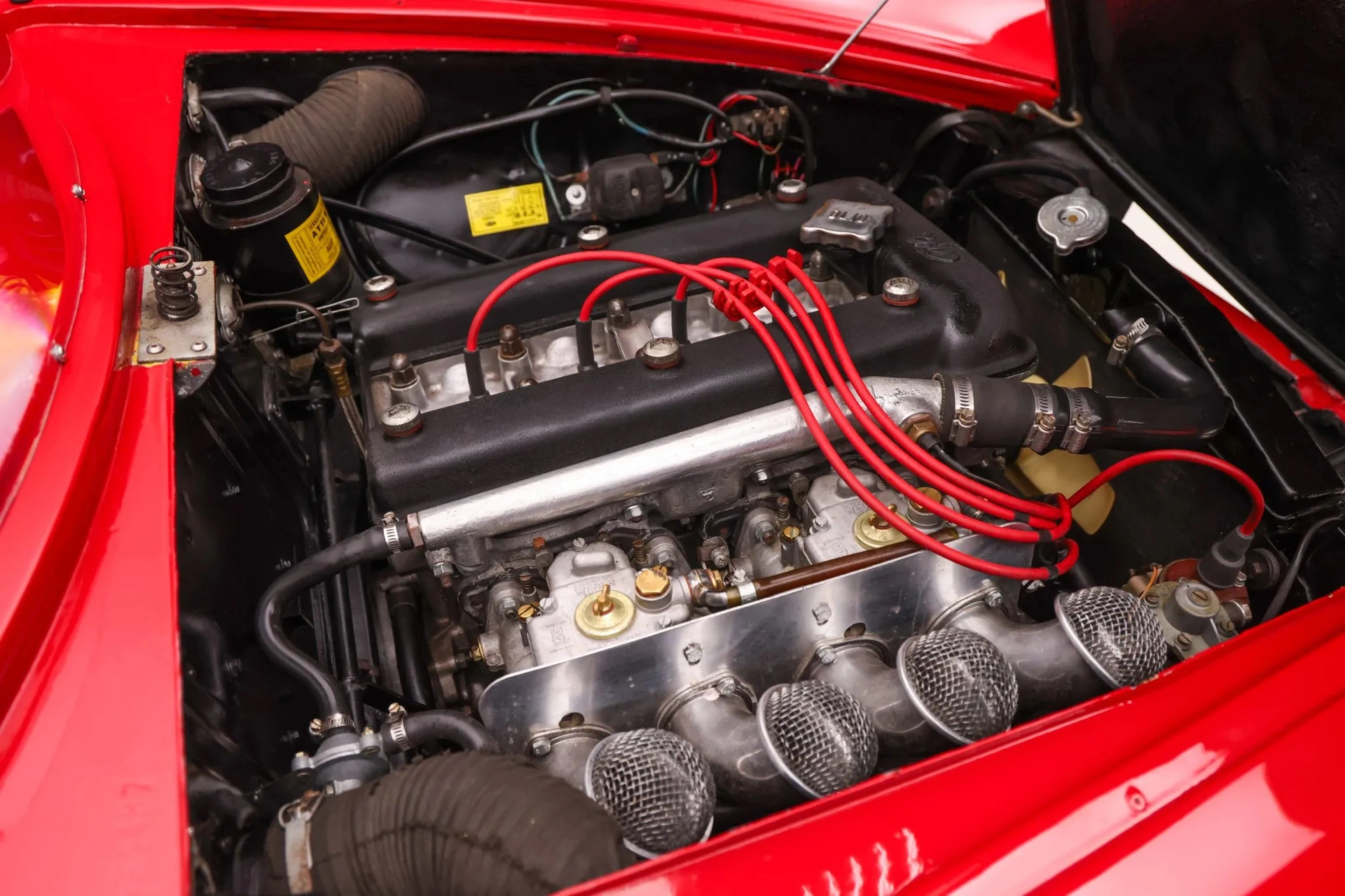 Un volant à branches séparées précède l’instrumentation Veglia composée d’un tachymètre à 8 000 tr/min avec un affichage de la pression d’huile, flanqué d’un compteur de vitesse à 140 mph et d’une jauge combinée. La Giulia SS présentait un tableau de bord révisé par rapport à la Giulietta SS, avec l’ajout d’une boîte à gants verrouillable et d’un revêtement en cuir sur la partie inférieure du tableau de bord. Le compteur à cinq chiffres indique 77 000 miles, dont environ 100 ont été ajoutés par le propriétaire actuel.