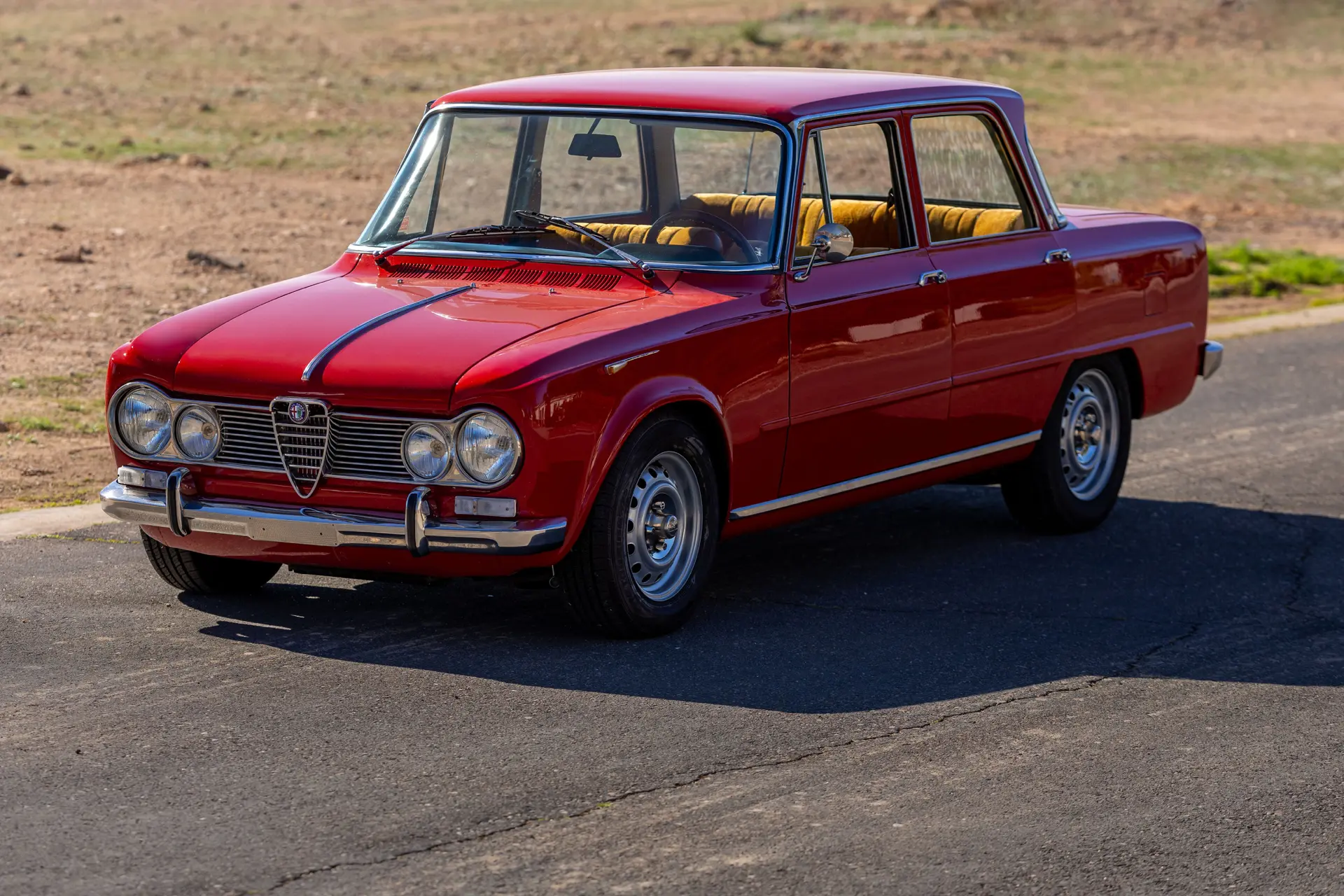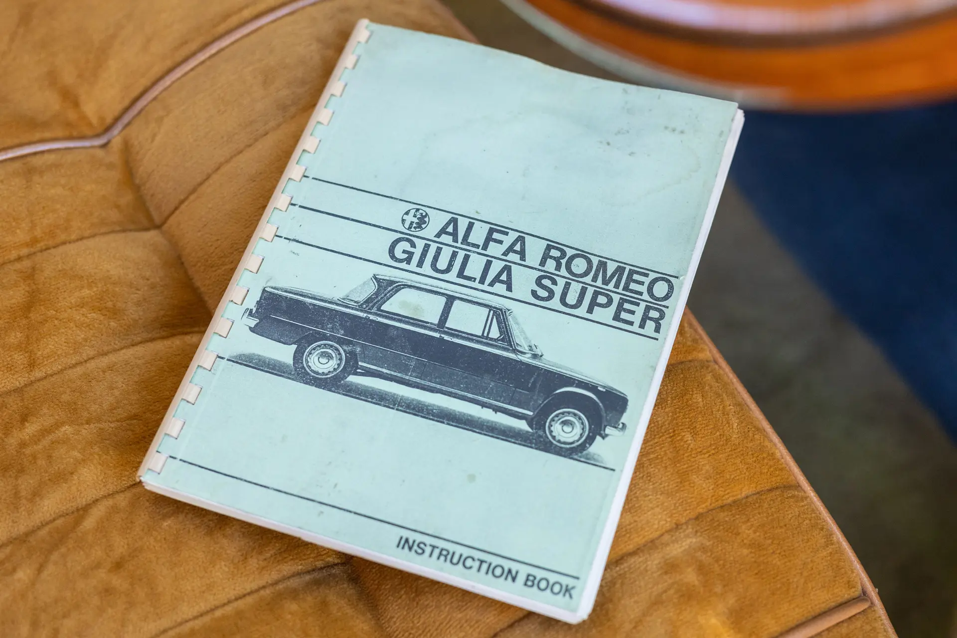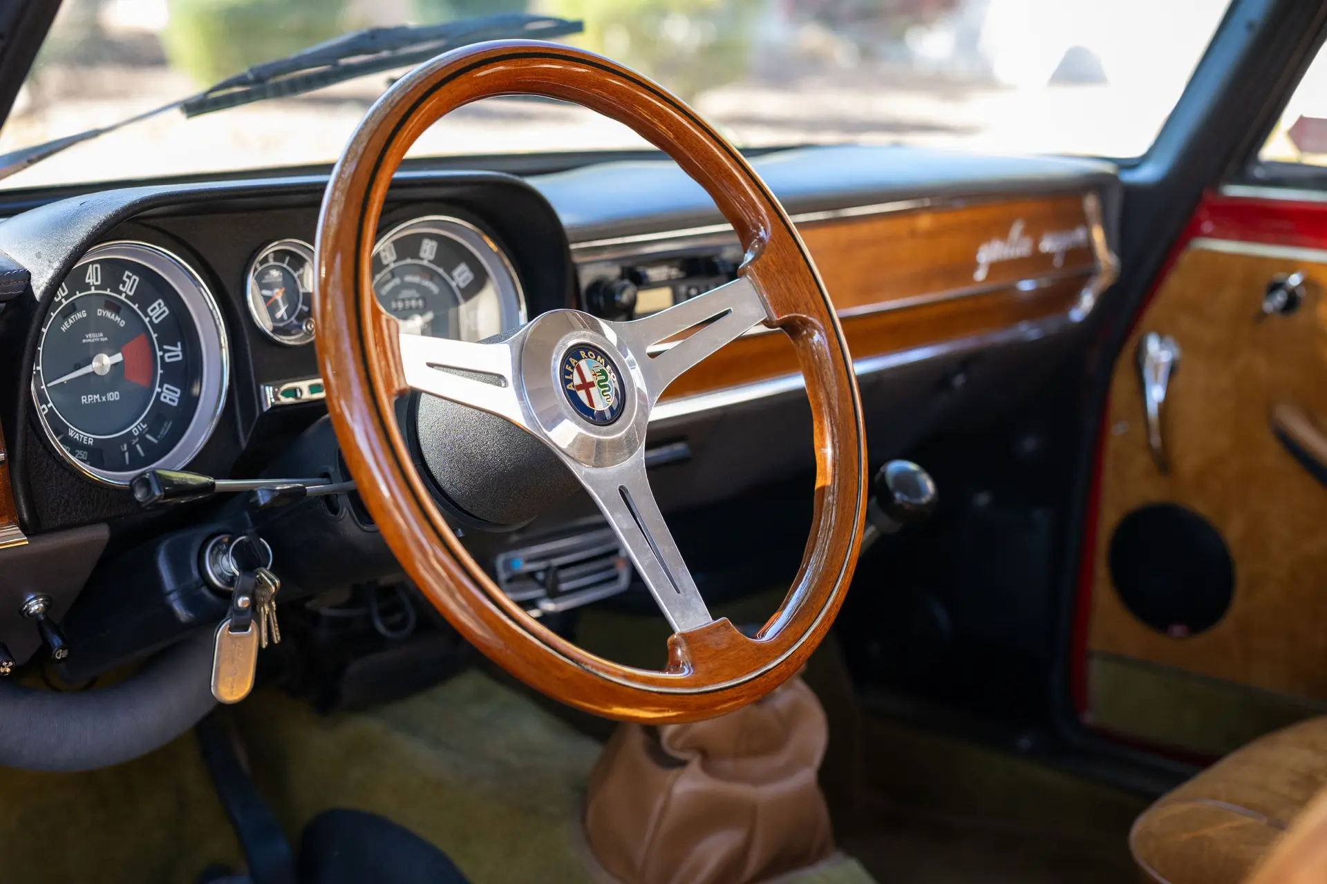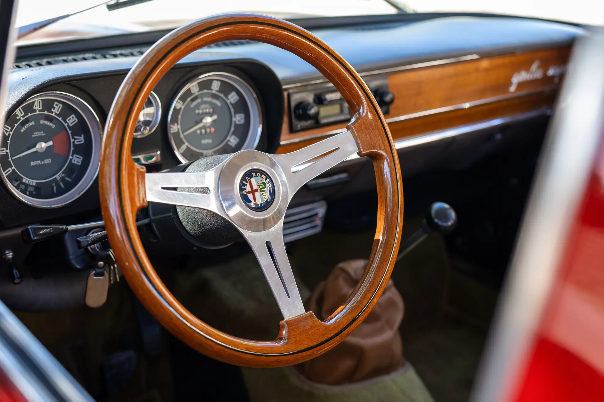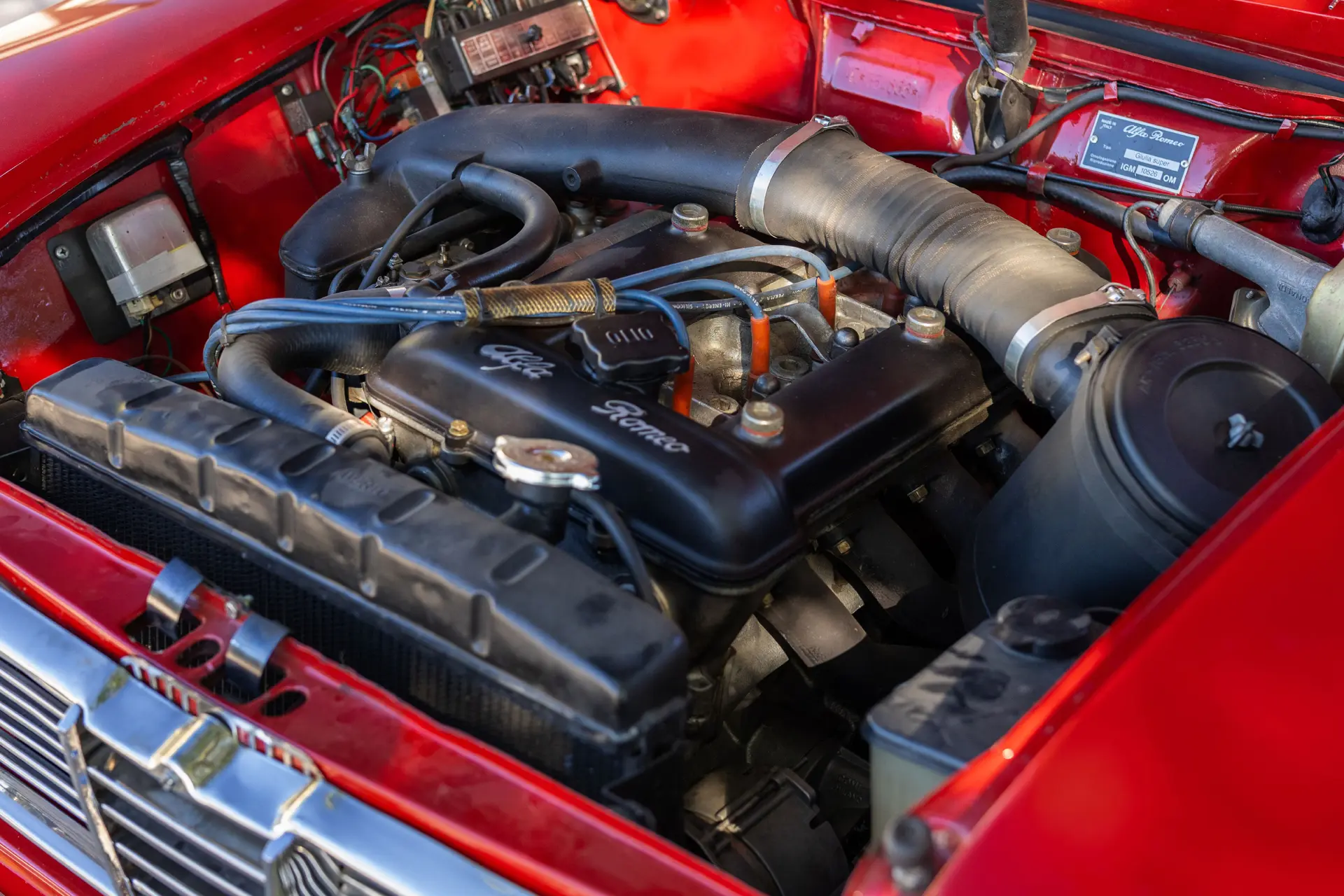 L’intérieur est élégamment aménagé, avec une sellerie en cuir ou similicuir de qualité, des finitions soignées et la disposition emblématique de la planche de bord de la série 105. Les badges distinctifs « Bollino d’Oro » et l’attention méticuleuse portée aux détails de finition distinguent ce modèle des Giulia Super standard.