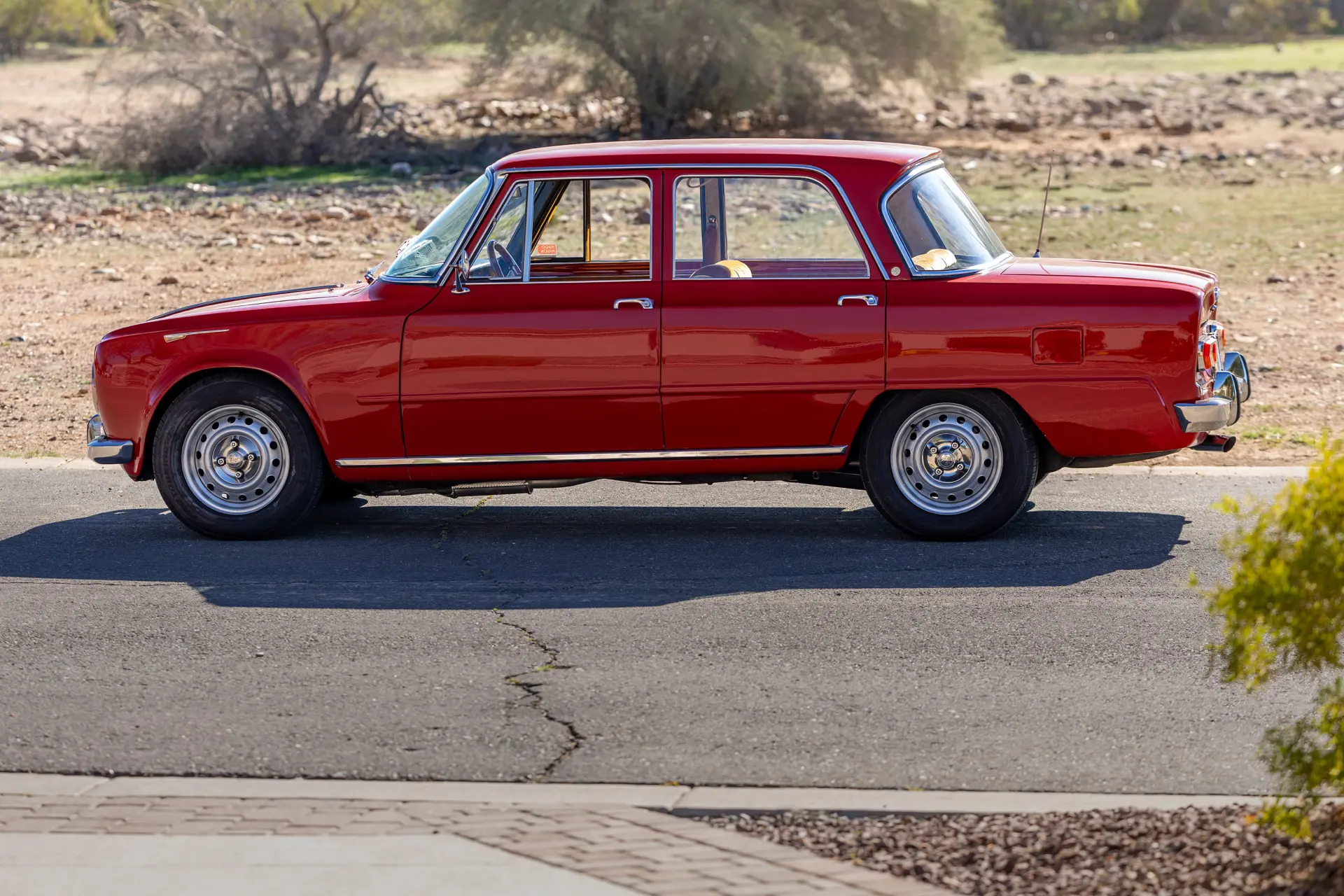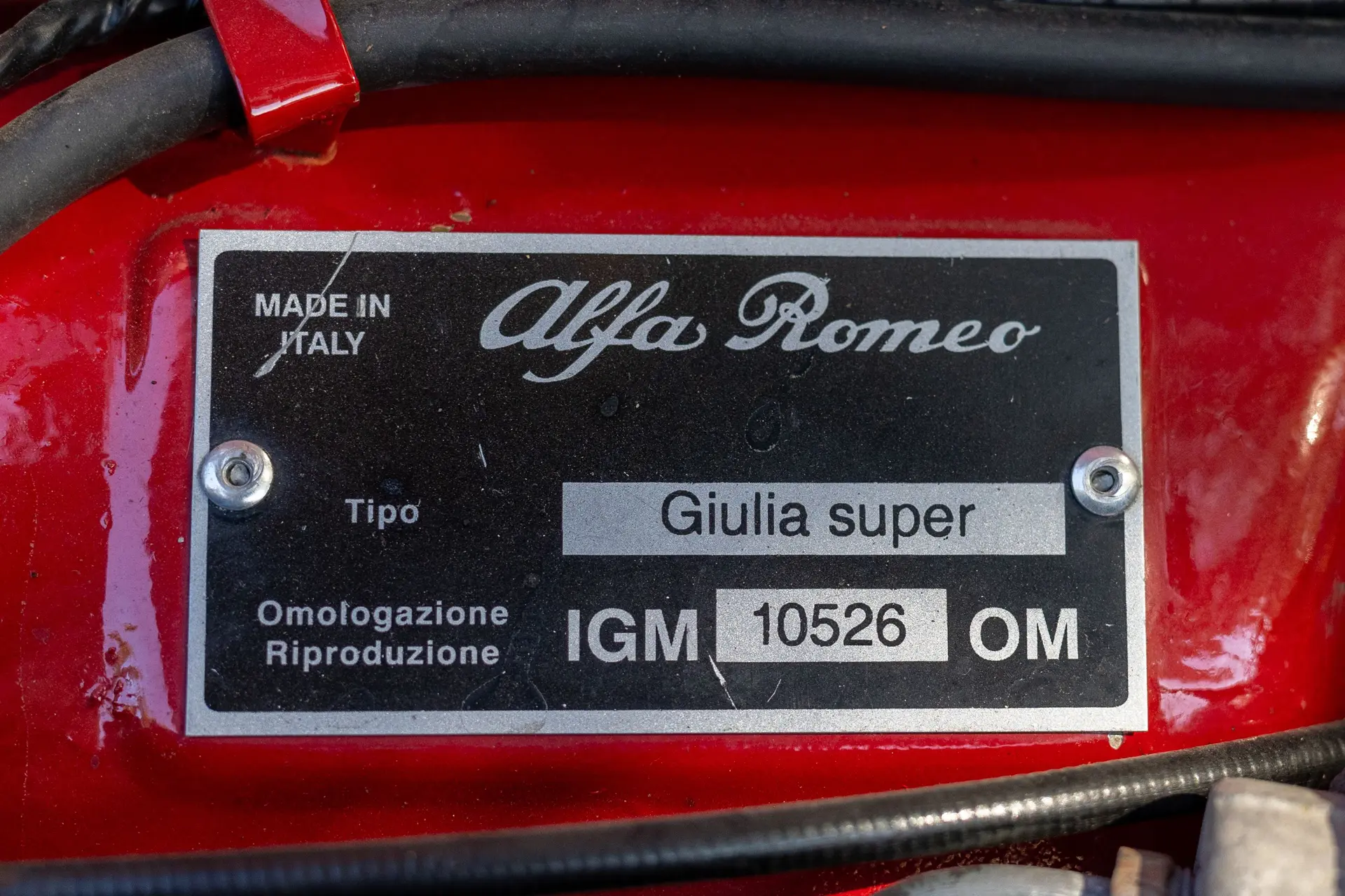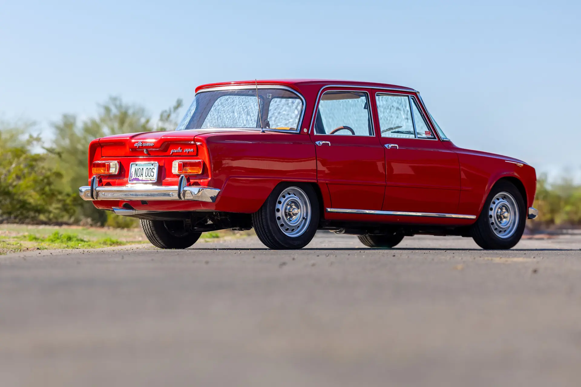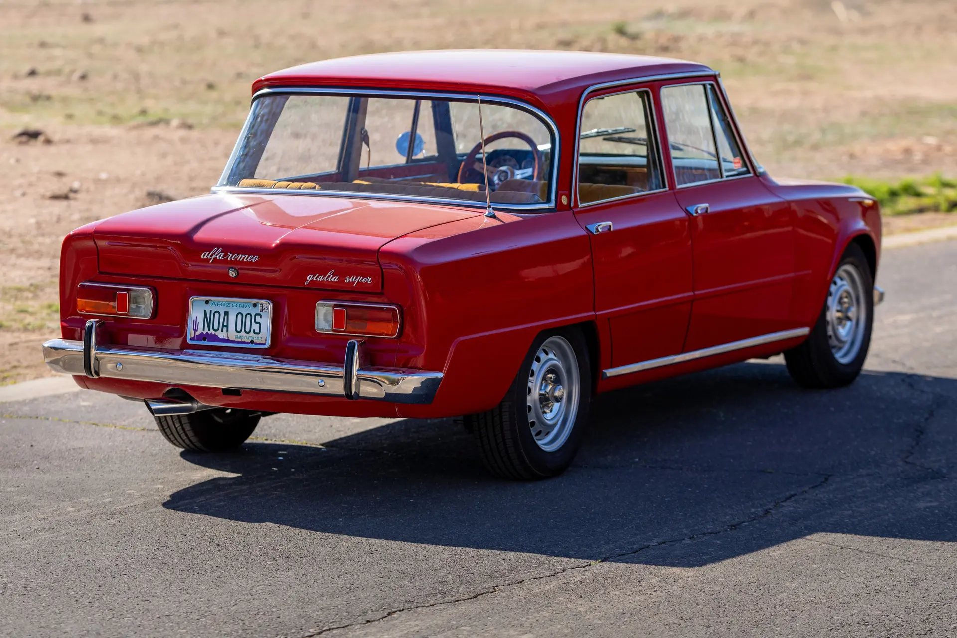 L’intérieur est élégamment aménagé, avec une sellerie en cuir ou similicuir de qualité, des finitions soignées et la disposition emblématique de la planche de bord de la série 105. Les badges distinctifs « Bollino d’Oro » et l’attention méticuleuse portée aux détails de finition distinguent ce modèle des Giulia Super standard.