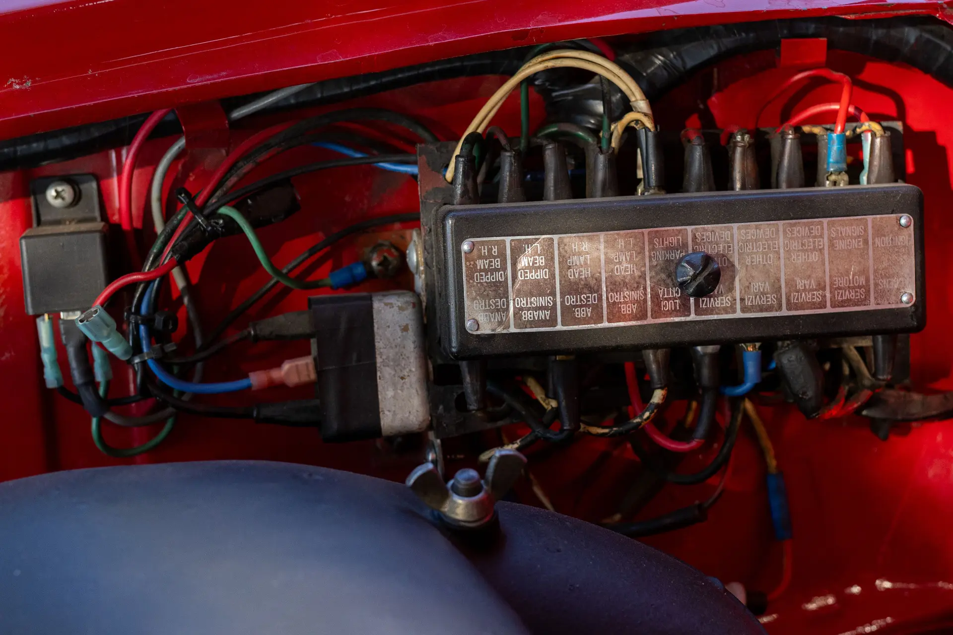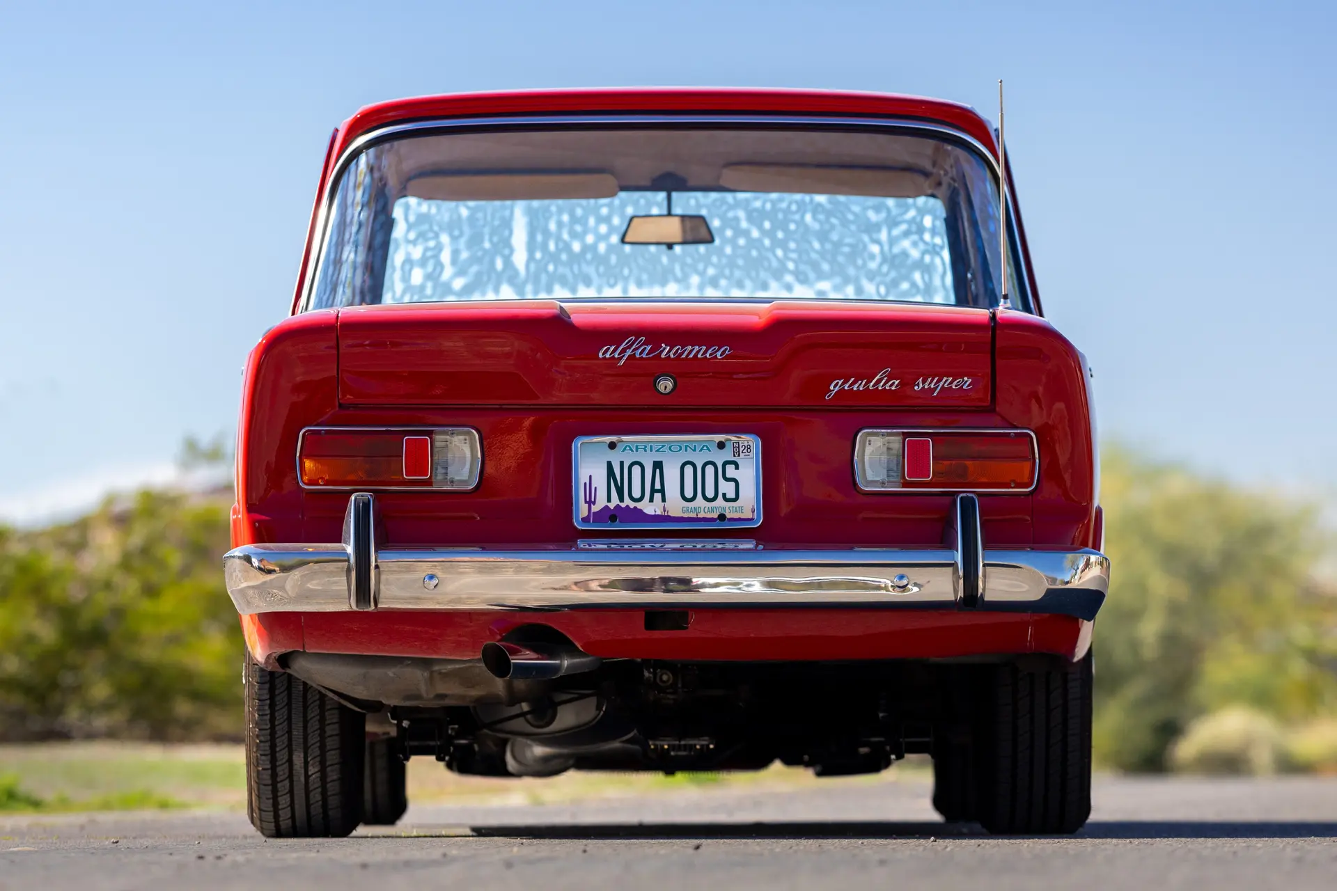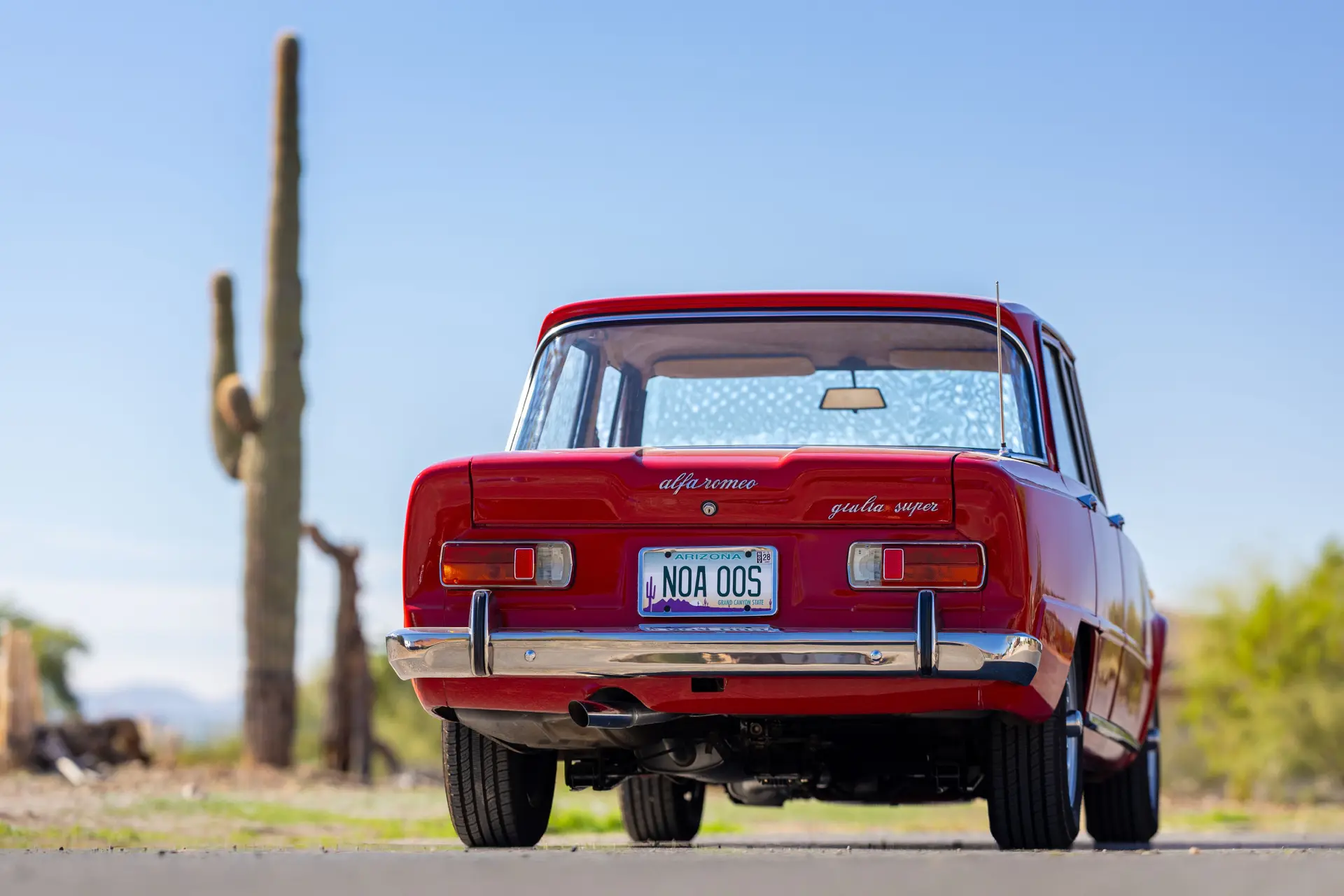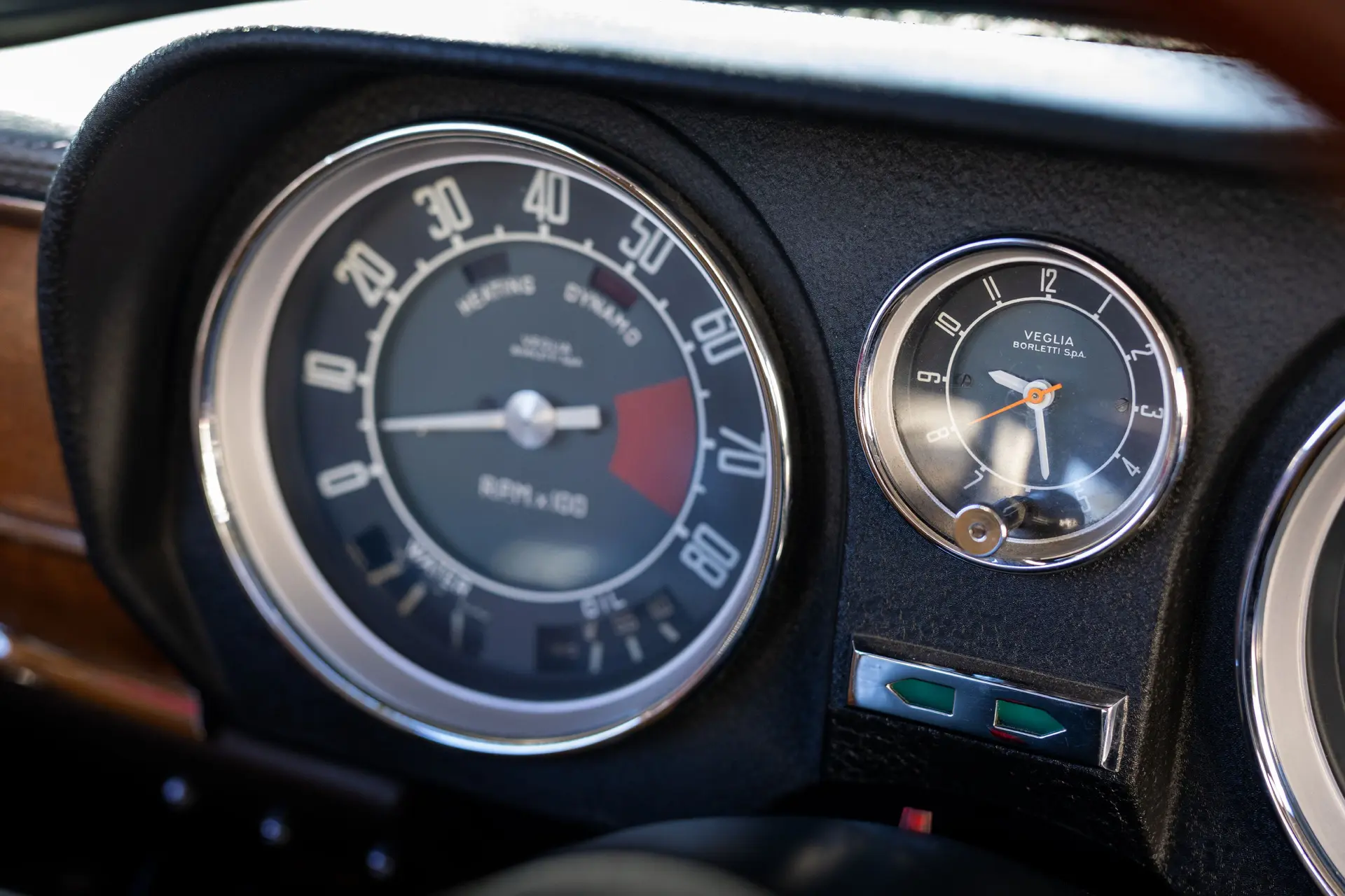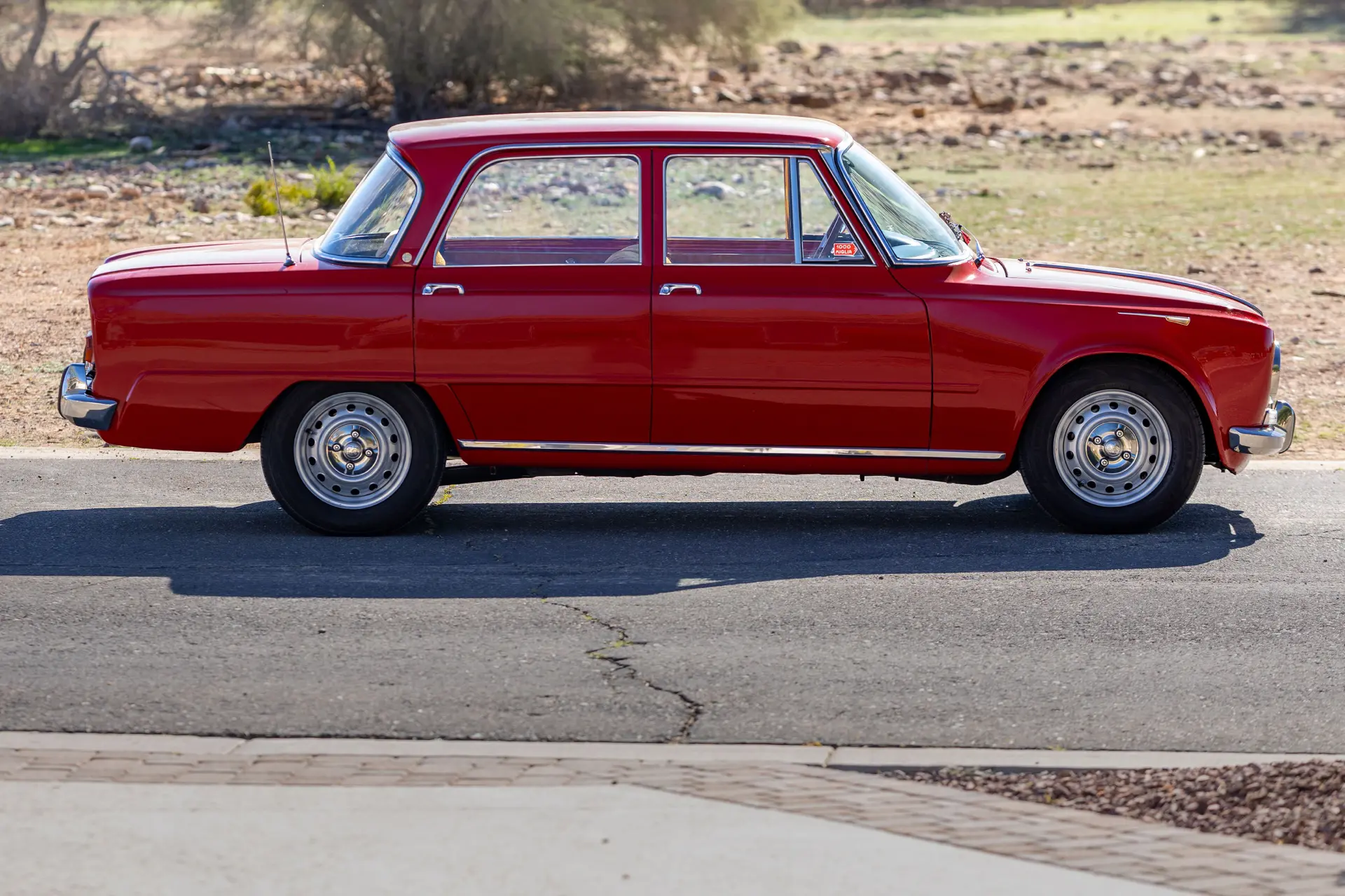 L’intérieur est élégamment aménagé, avec une sellerie en cuir ou similicuir de qualité, des finitions soignées et la disposition emblématique de la planche de bord de la série 105. Les badges distinctifs « Bollino d’Oro » et l’attention méticuleuse portée aux détails de finition distinguent ce modèle des Giulia Super standard.