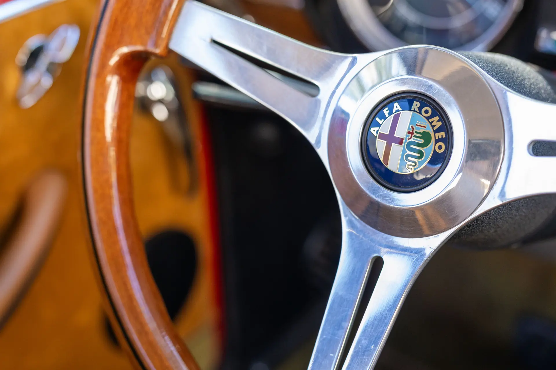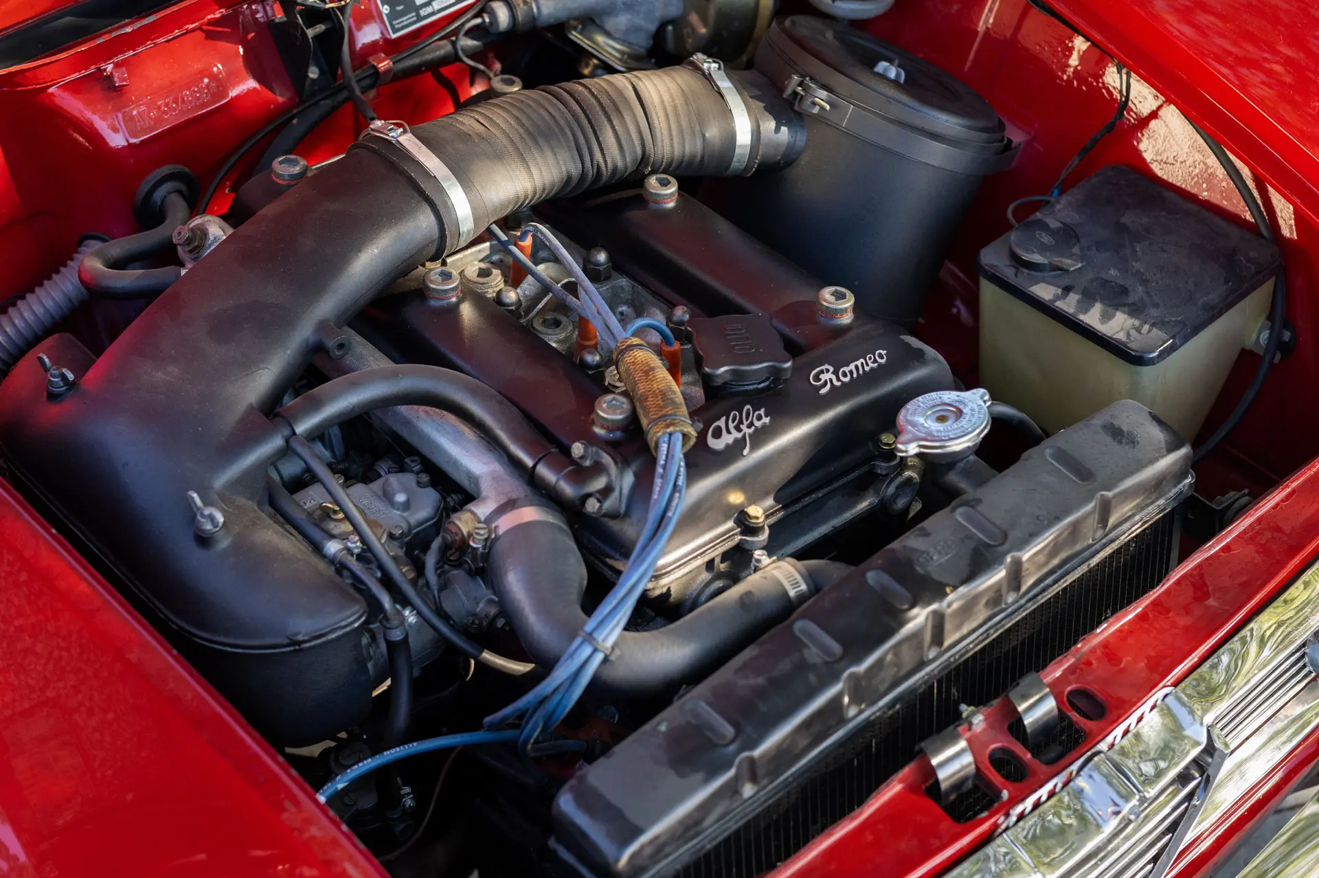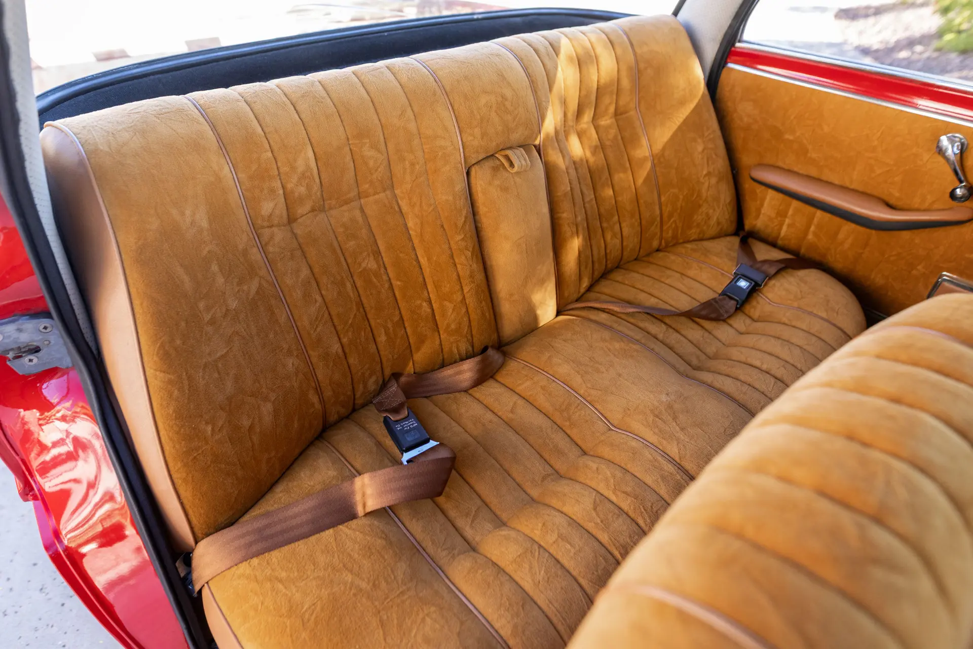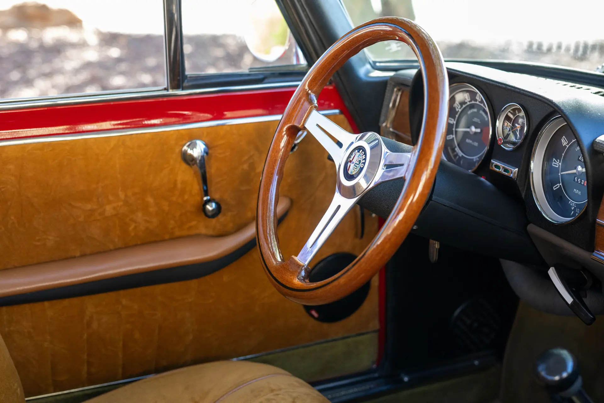 Présentée dans une teinte Rosso Alfa avec un intérieur en tissu/cuir beige, l’habitacle propose des sièges avant de type baquet à dossiers inclinables, un volant en bois et une planche de bord classique de la série 105 comprenant compteur de vitesse, compte-tours, jauges de carburant, de pression d’huile et de température.