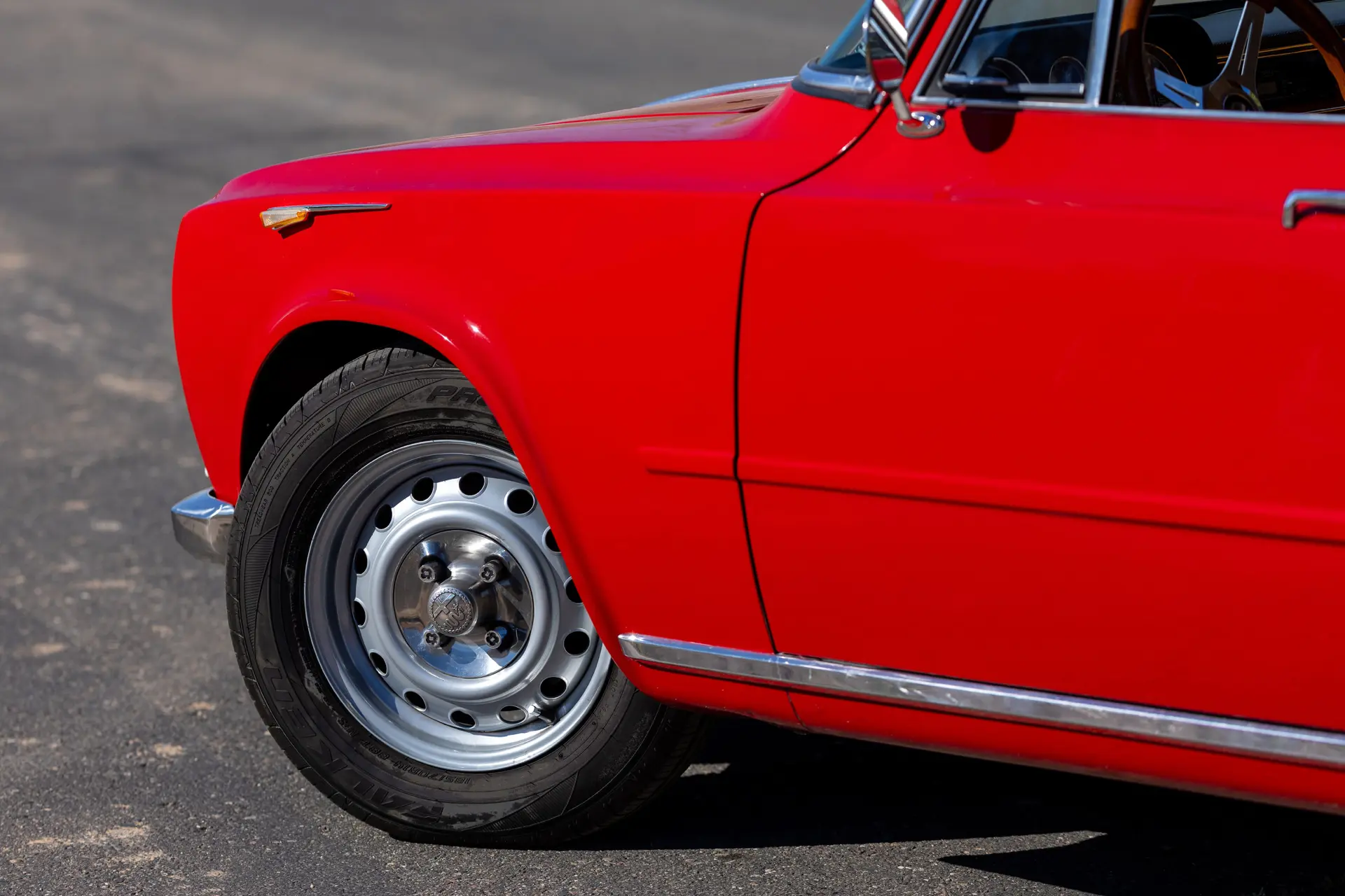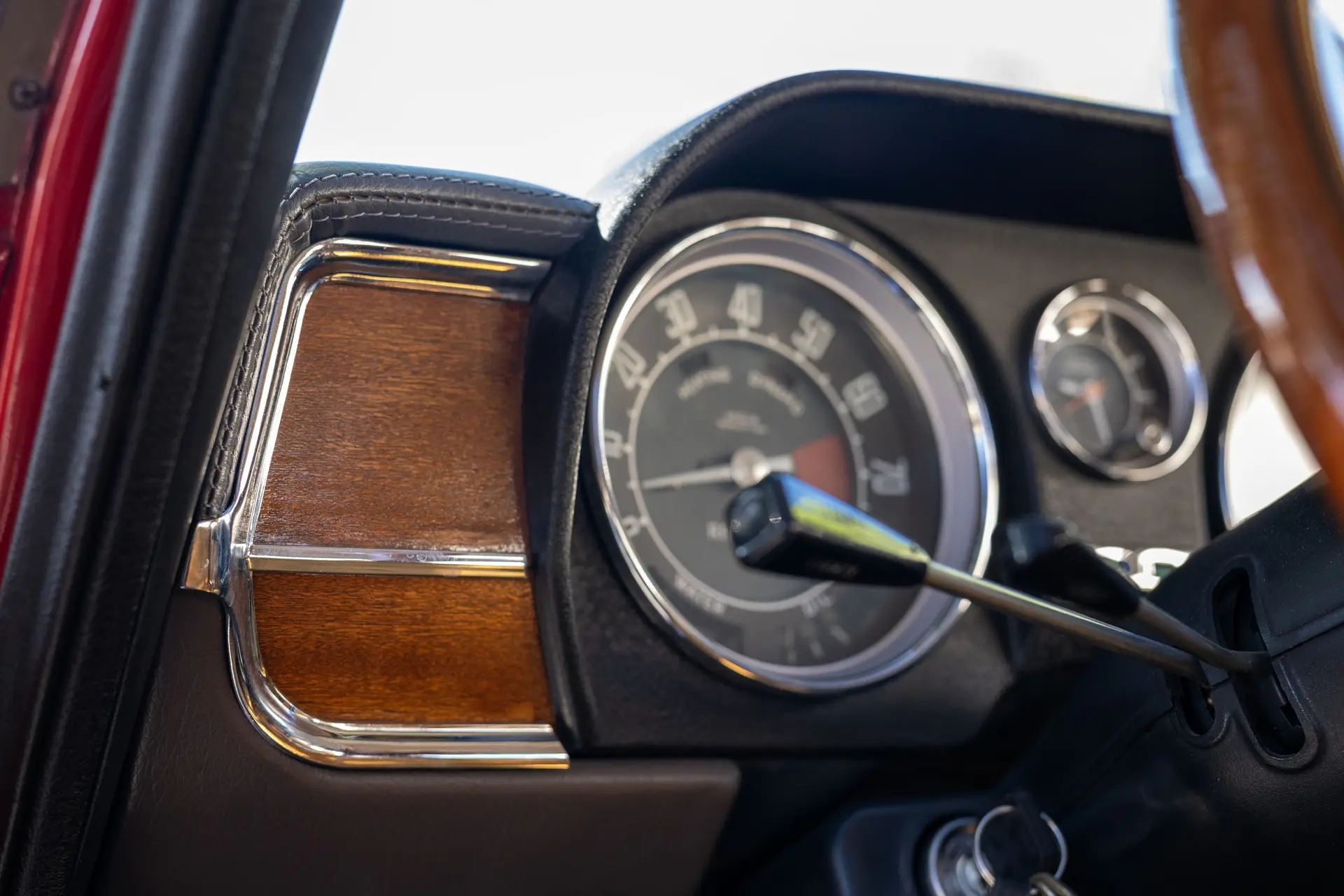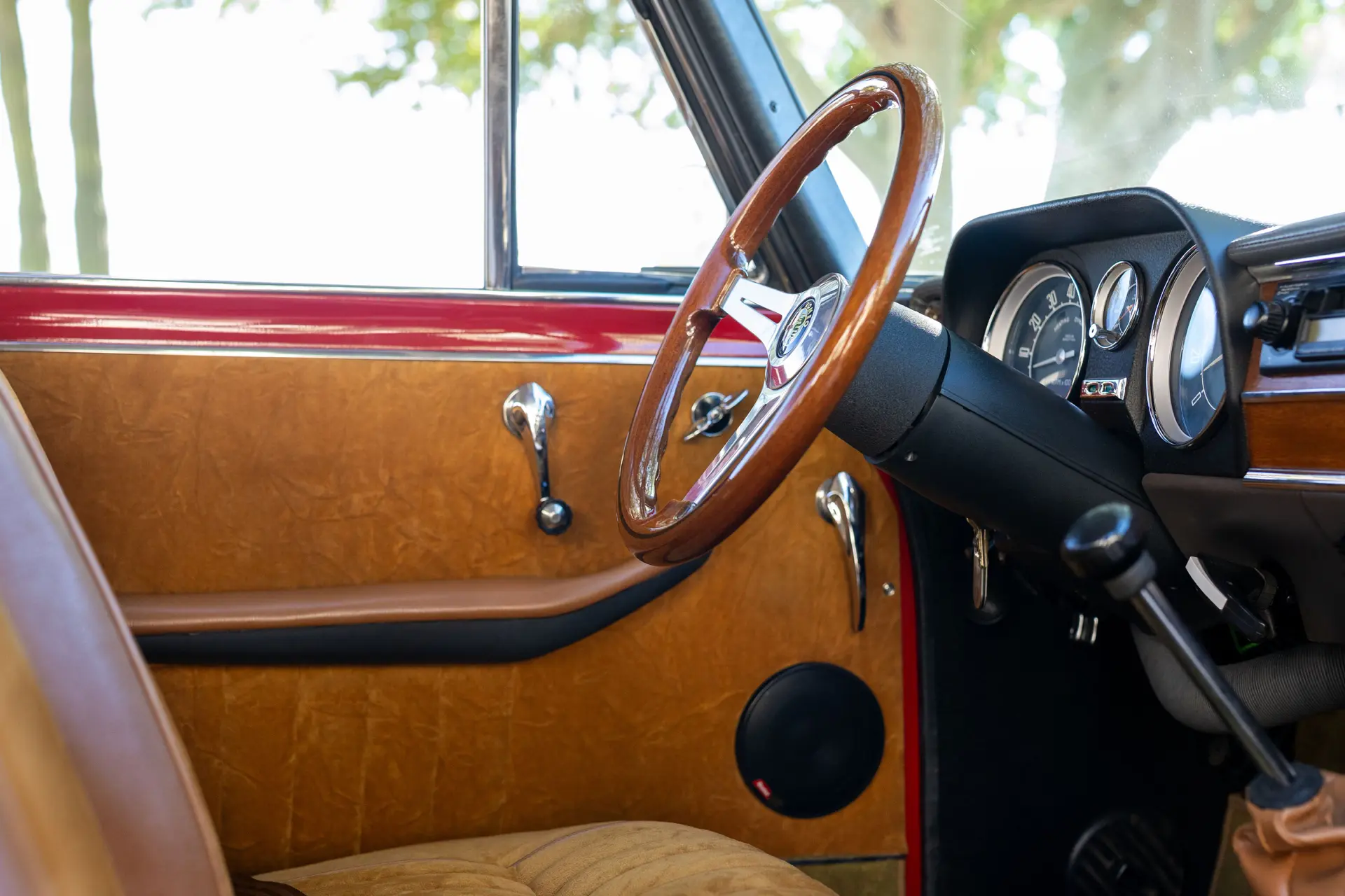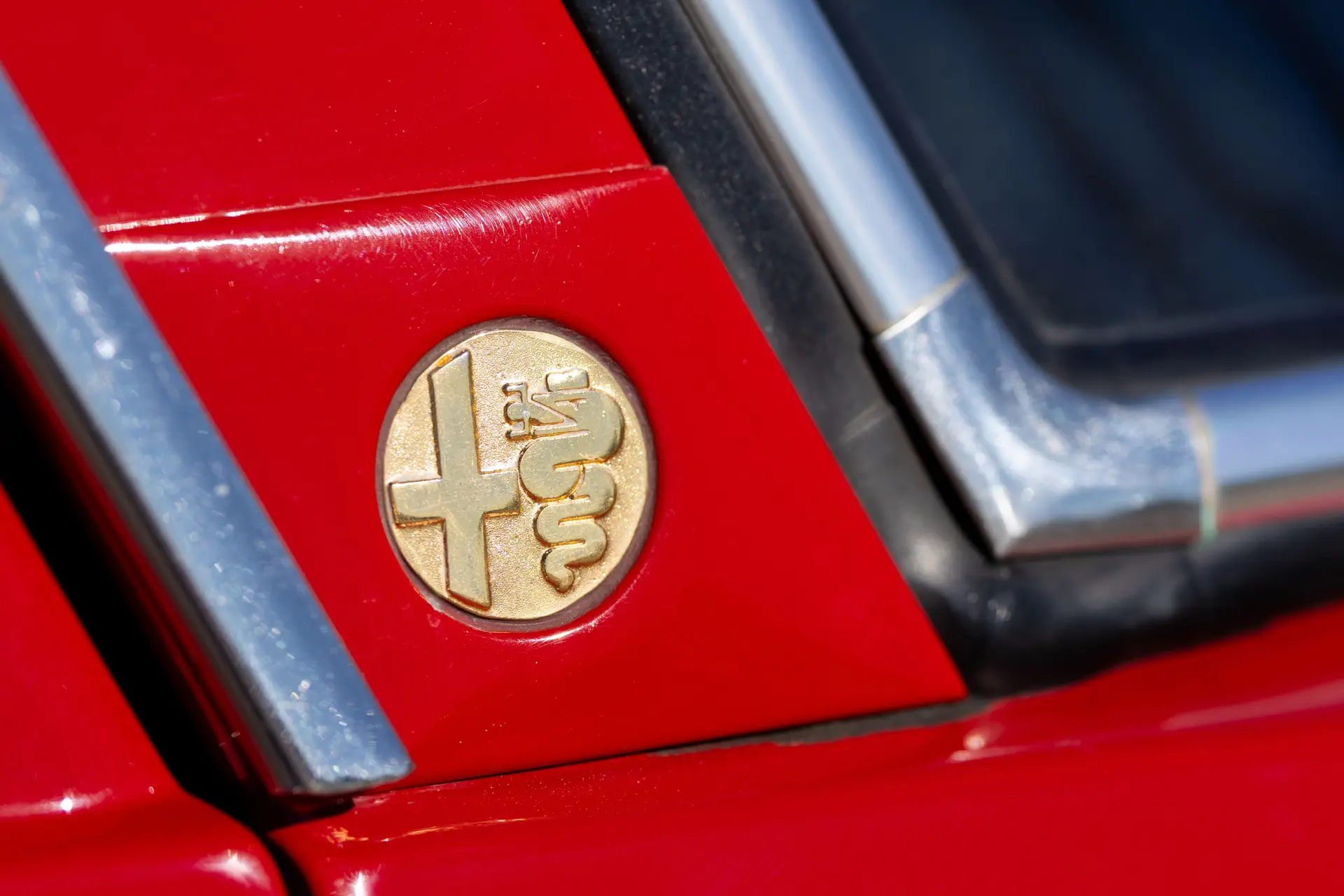 Présentée dans une teinte Rosso Alfa avec un intérieur en tissu/cuir beige, l’habitacle propose des sièges avant de type baquet à dossiers inclinables, un volant en bois et une planche de bord classique de la série 105 comprenant compteur de vitesse, compte-tours, jauges de carburant, de pression d’huile et de température.