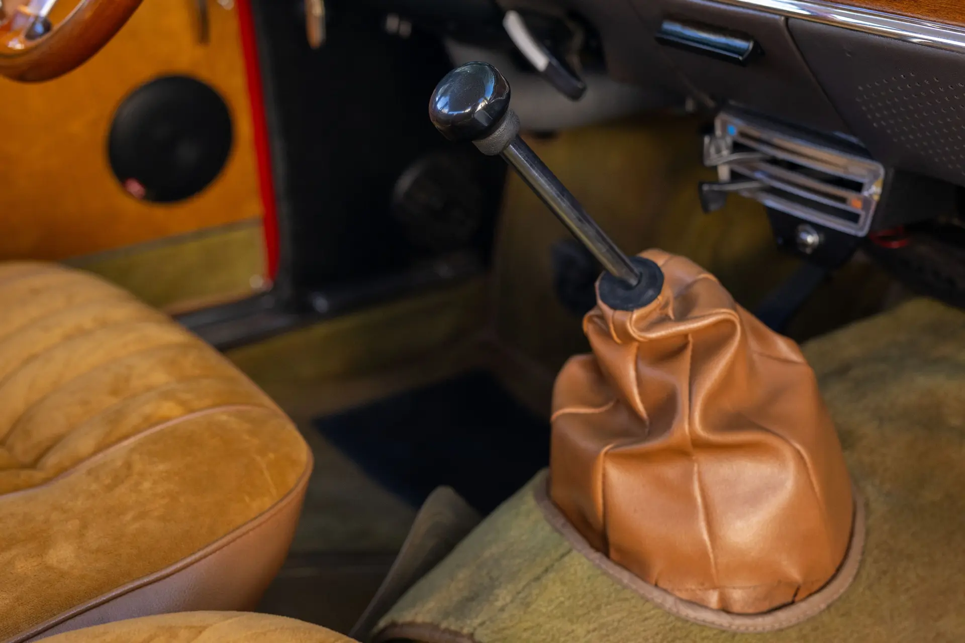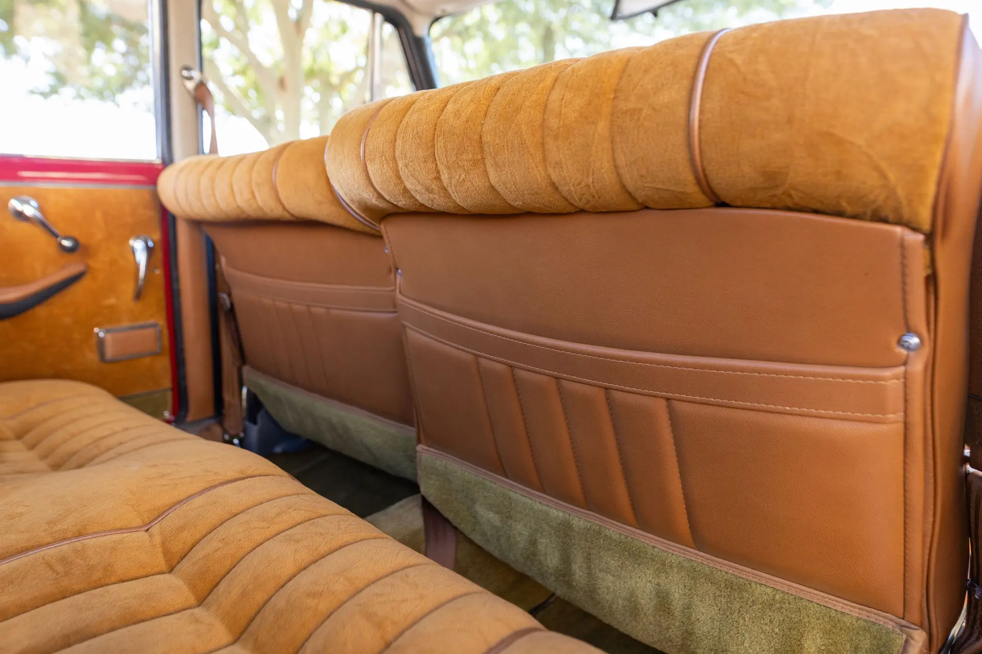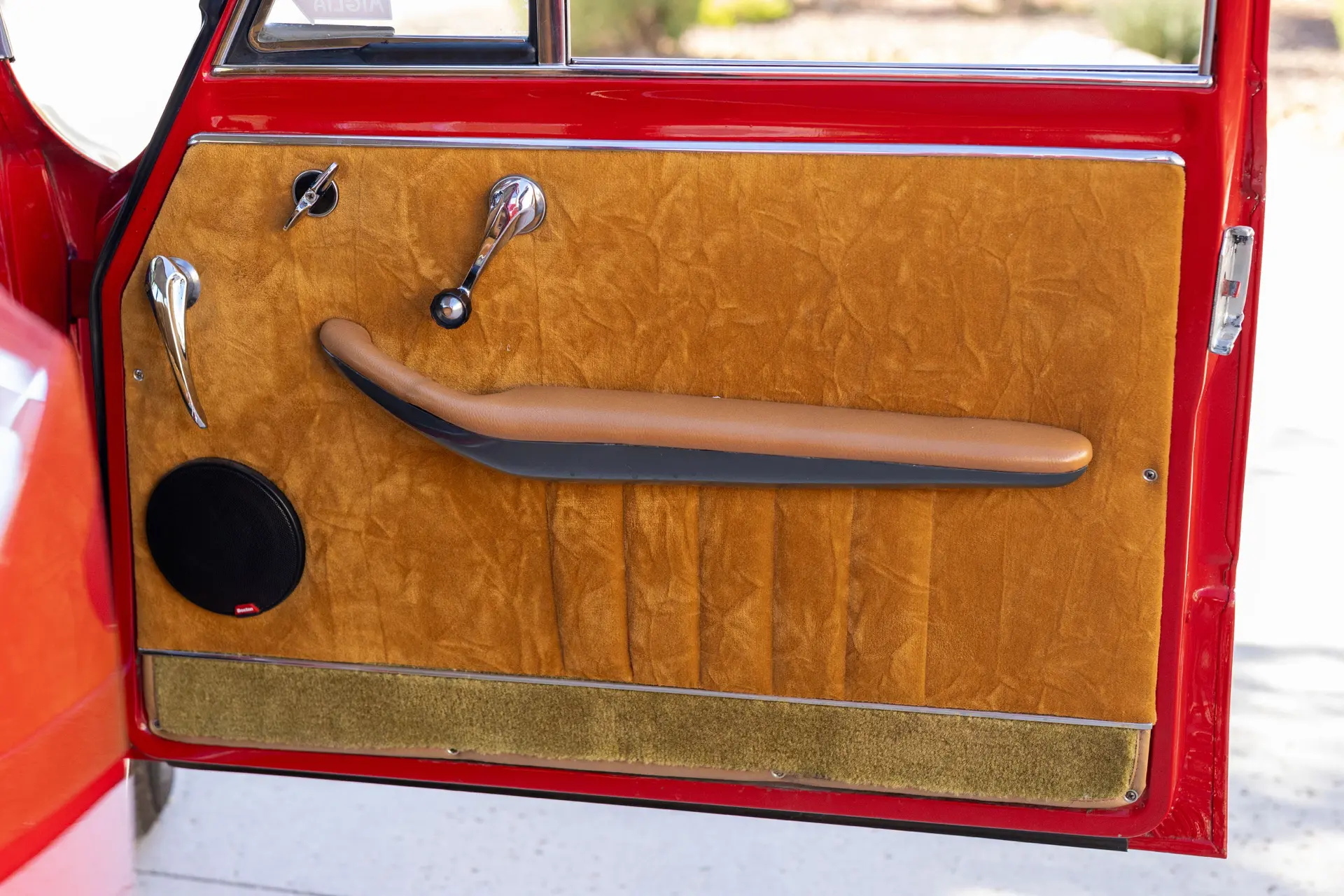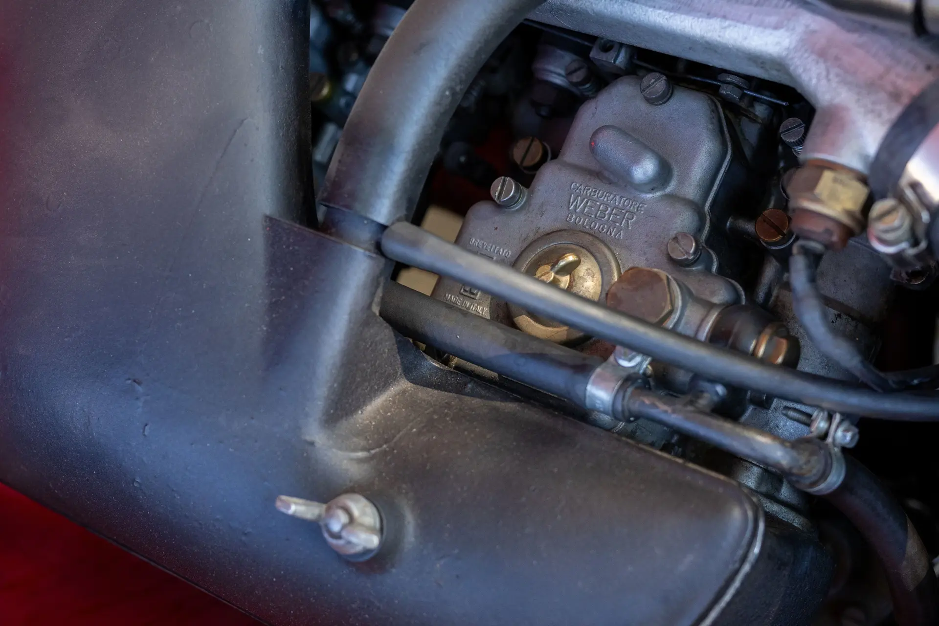 Présentée dans une teinte Rosso Alfa avec un intérieur en tissu/cuir beige, l’habitacle propose des sièges avant de type baquet à dossiers inclinables, un volant en bois et une planche de bord classique de la série 105 comprenant compteur de vitesse, compte-tours, jauges de carburant, de pression d’huile et de température.