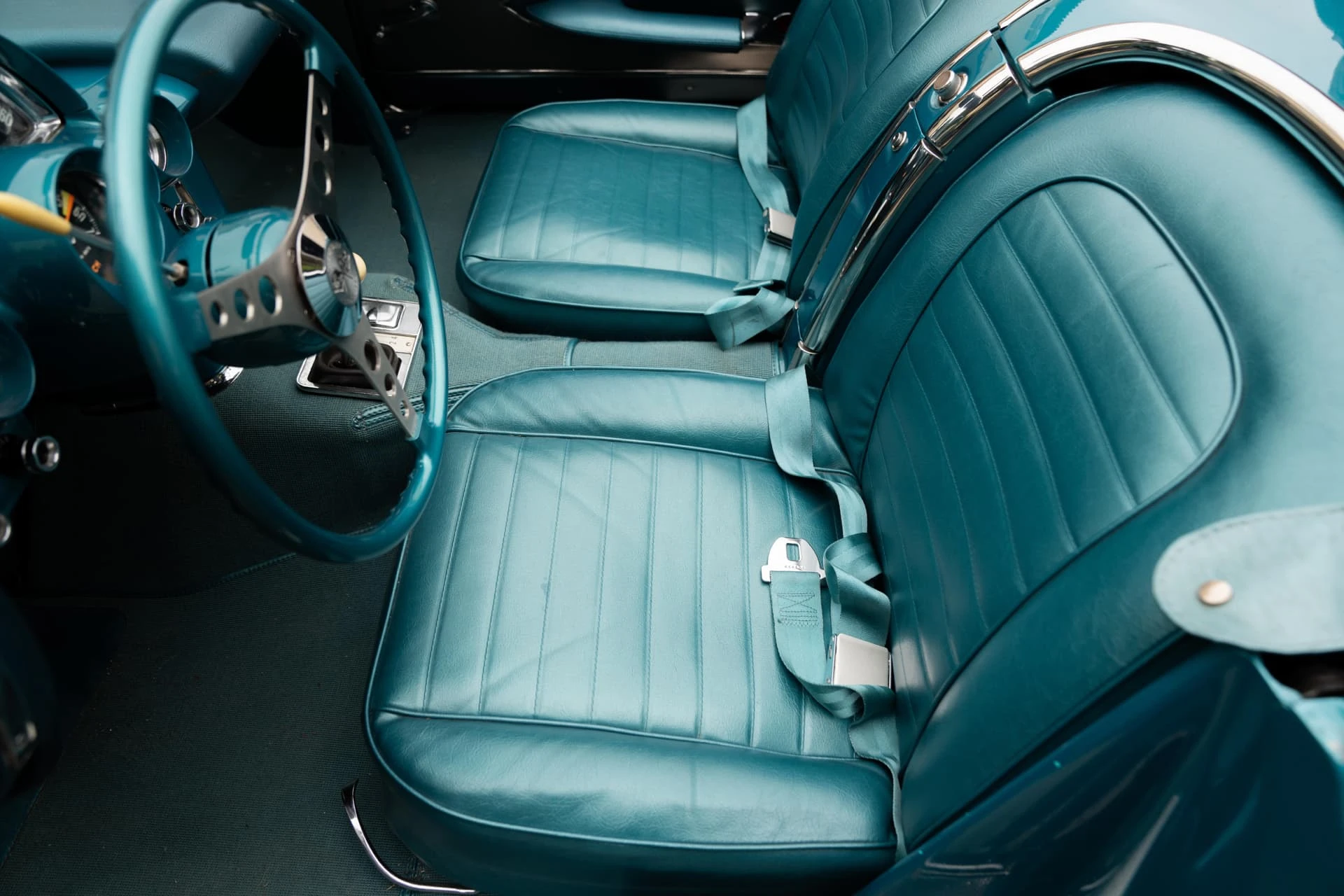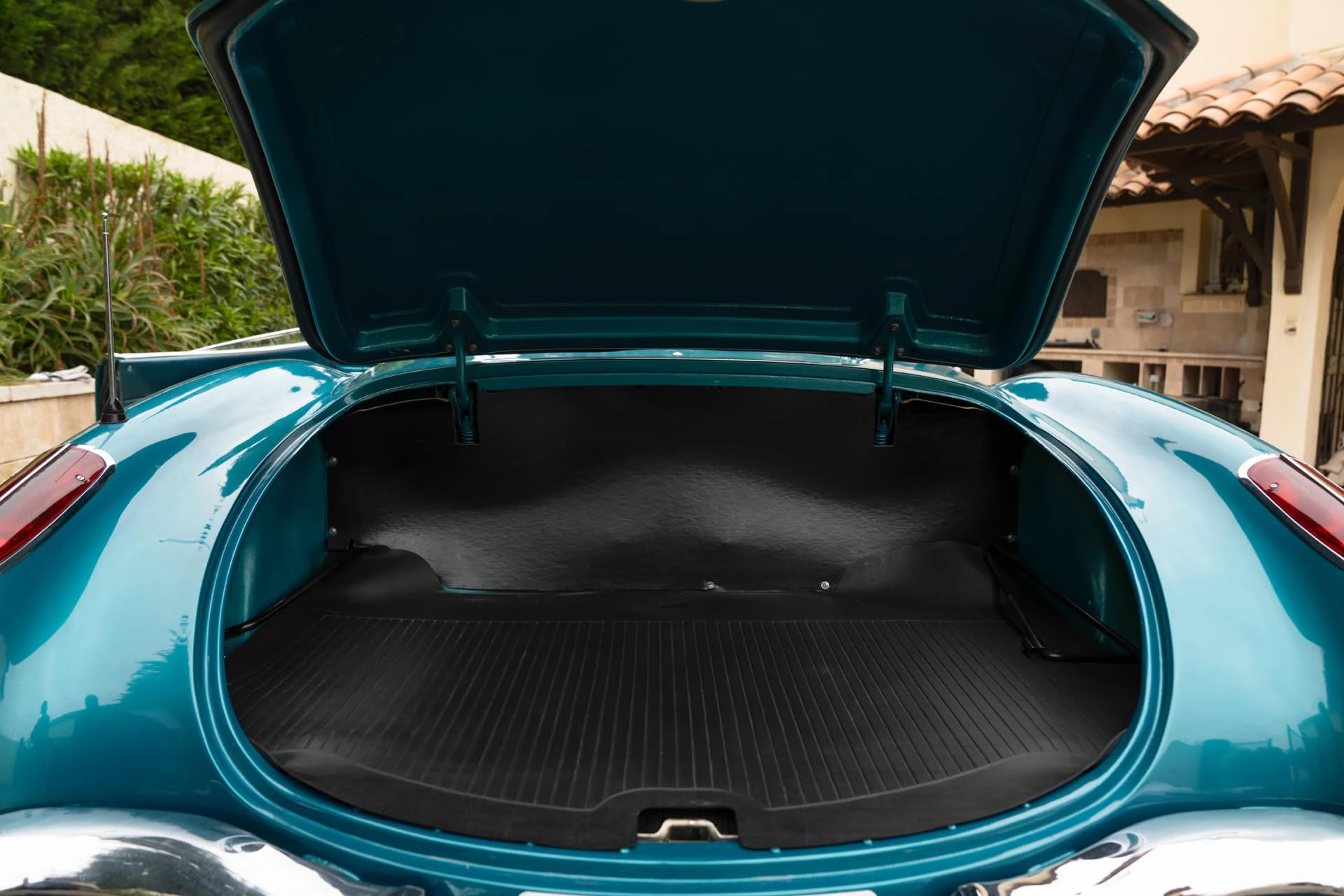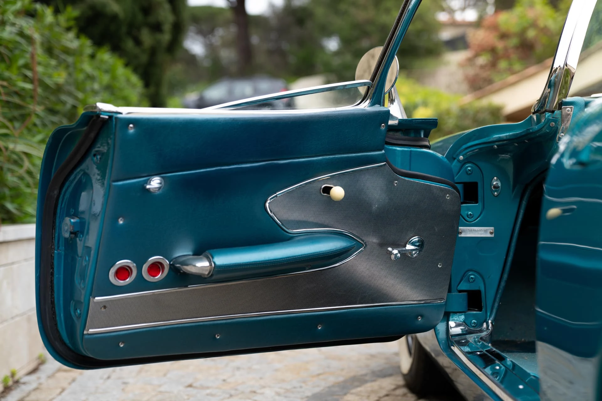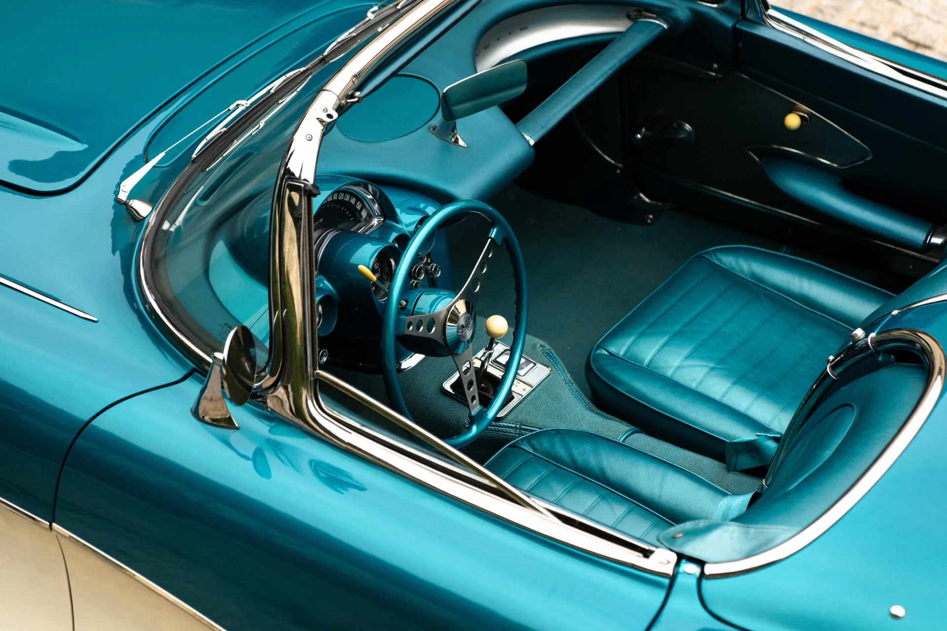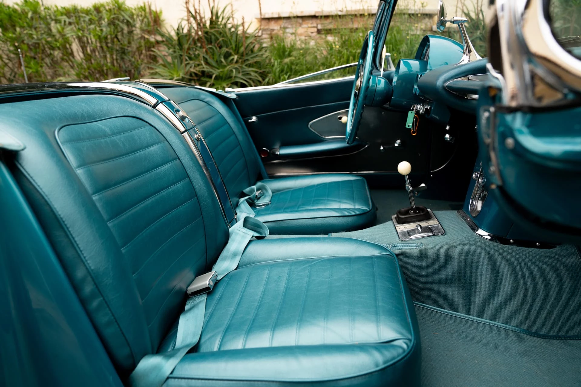 Cet exemplaire (Châssis J59S109549) est équipée de la séduisante combinaison du V8 283 ci (4,6 litres) et de la boîte manuelle à quatre rapports, appartenait au précédent propriétaire depuis 2014. Le rapport d’expertise de 2021 qui l’accompagne établit que la voiture a subi une restauration complète en respectant ses spécifications d’origine et la décrit comme étant dans un état mécanique parfait, comme neuve et en parfait état de marche. La carrosserie en fibre de verre est en parfait état également, après une restauration de grande qualité, ainsi que le châssis, sans signe de corrosion. Équipée d’une radio conforme à l’époque, l’intérieur d’origine est joliment patiné et la capote est en bon état de marche de même que tous les équipements électriques. L’actuel propriétaire a par ailleurs fait équiper la voiture d’une direction assistée.