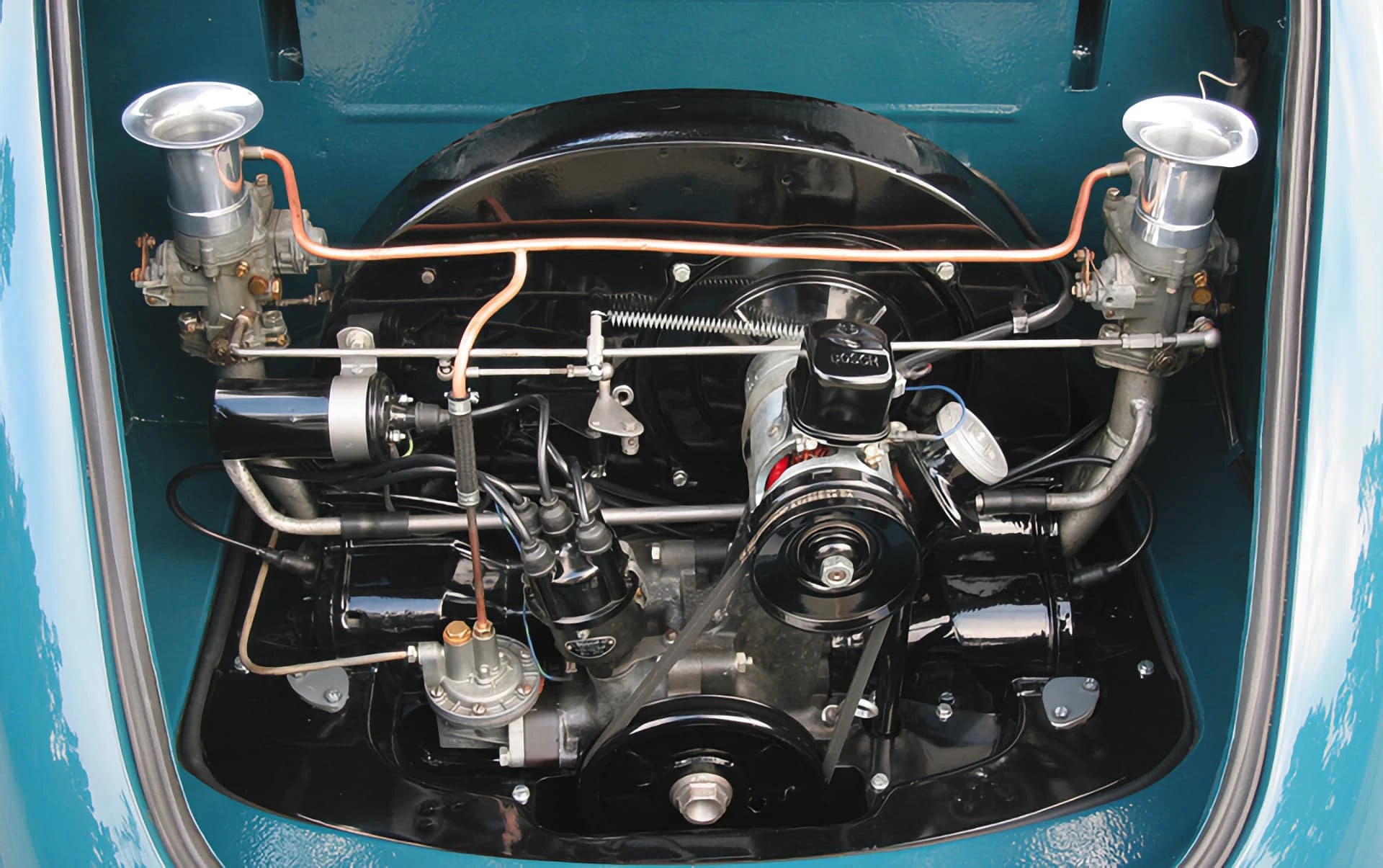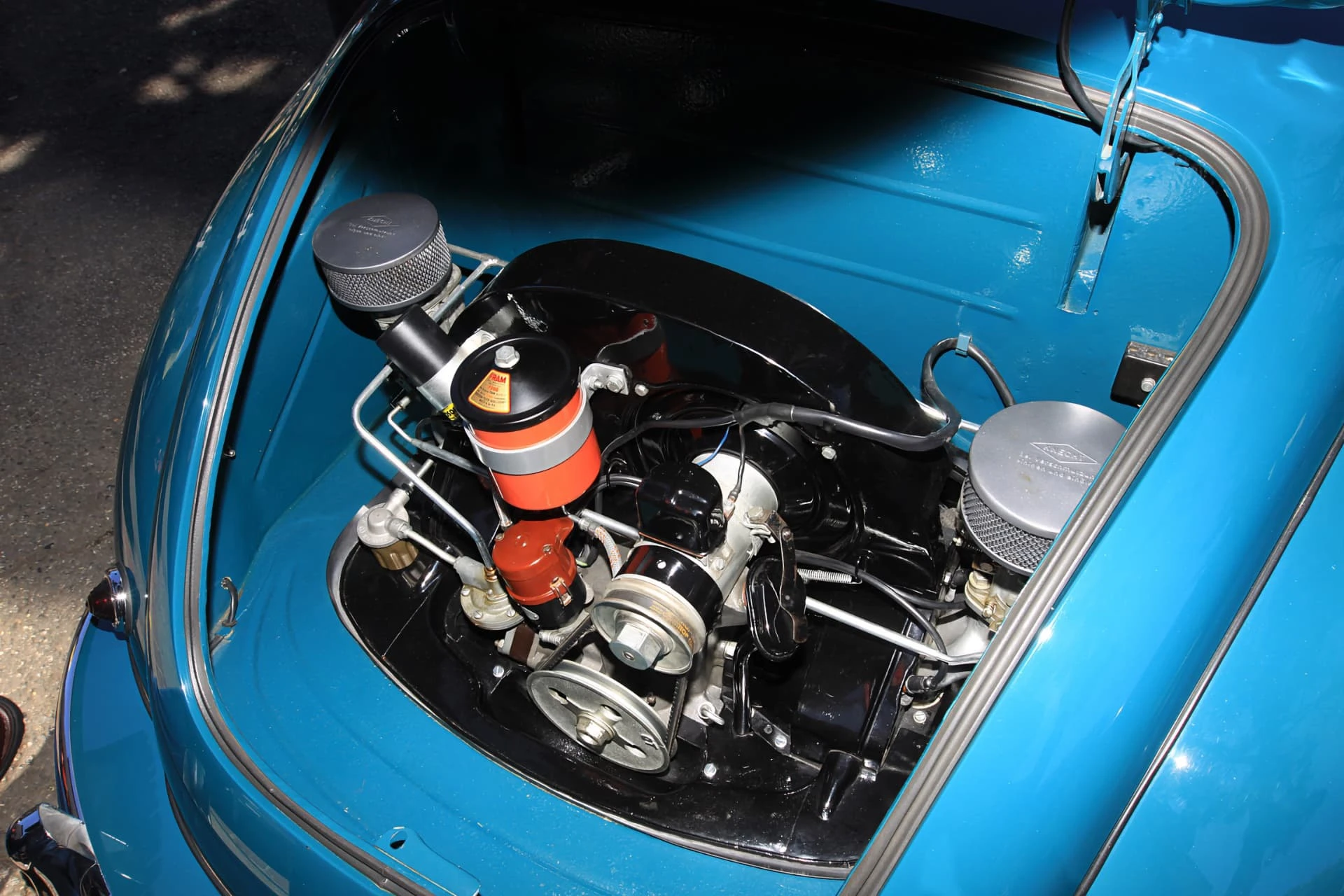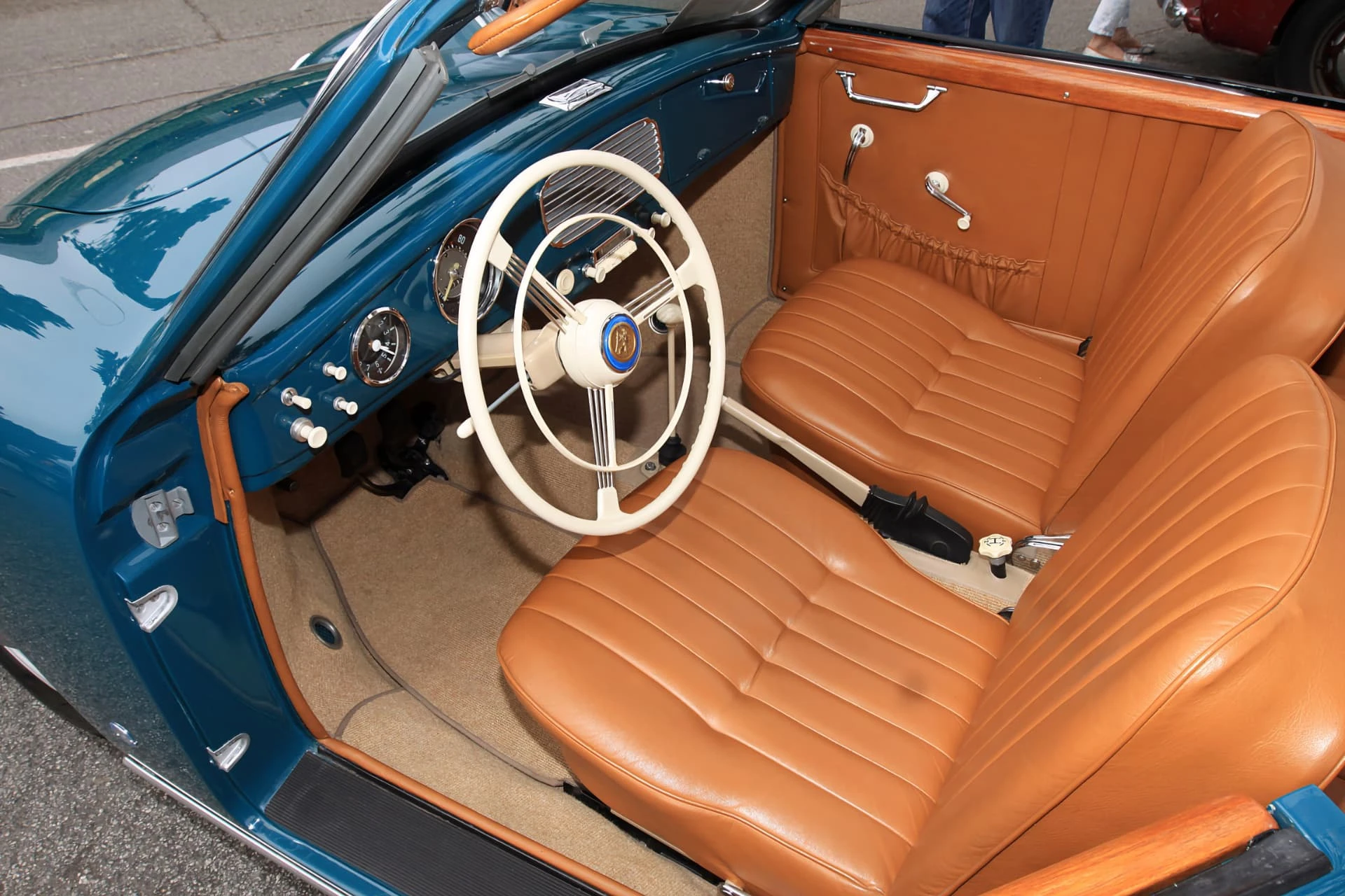 La carrosserie étant plus basse que celle d’une Coccinelle VW, les sièges ont été spécialement fabriqués. Une sellerie en cuir, comme celle la voiture présentée ici, était proposée en option. Les éléments de l’habitacle s’inspiraient largement du catalogue de pièces détachées de VW, ce qui a donné lieu à des mises à jour. Par exemple, les 53 ont adopté le compteur de vitesse centré sur le conducteur, la grille de radio centrale chromée et la boîte à gants couverte.