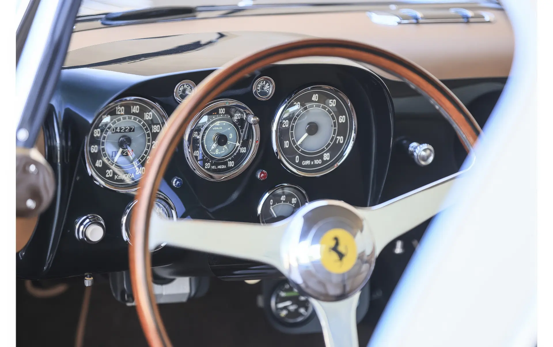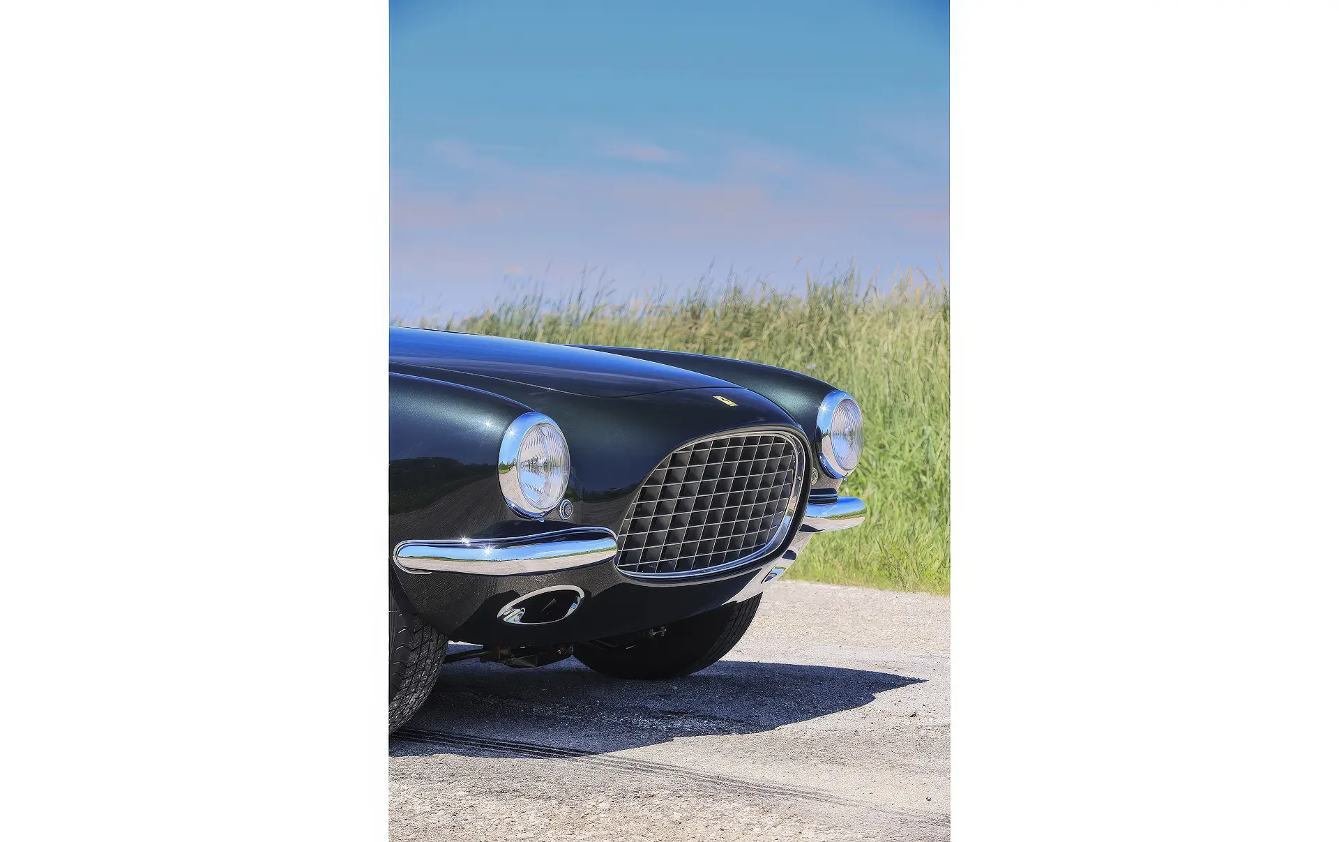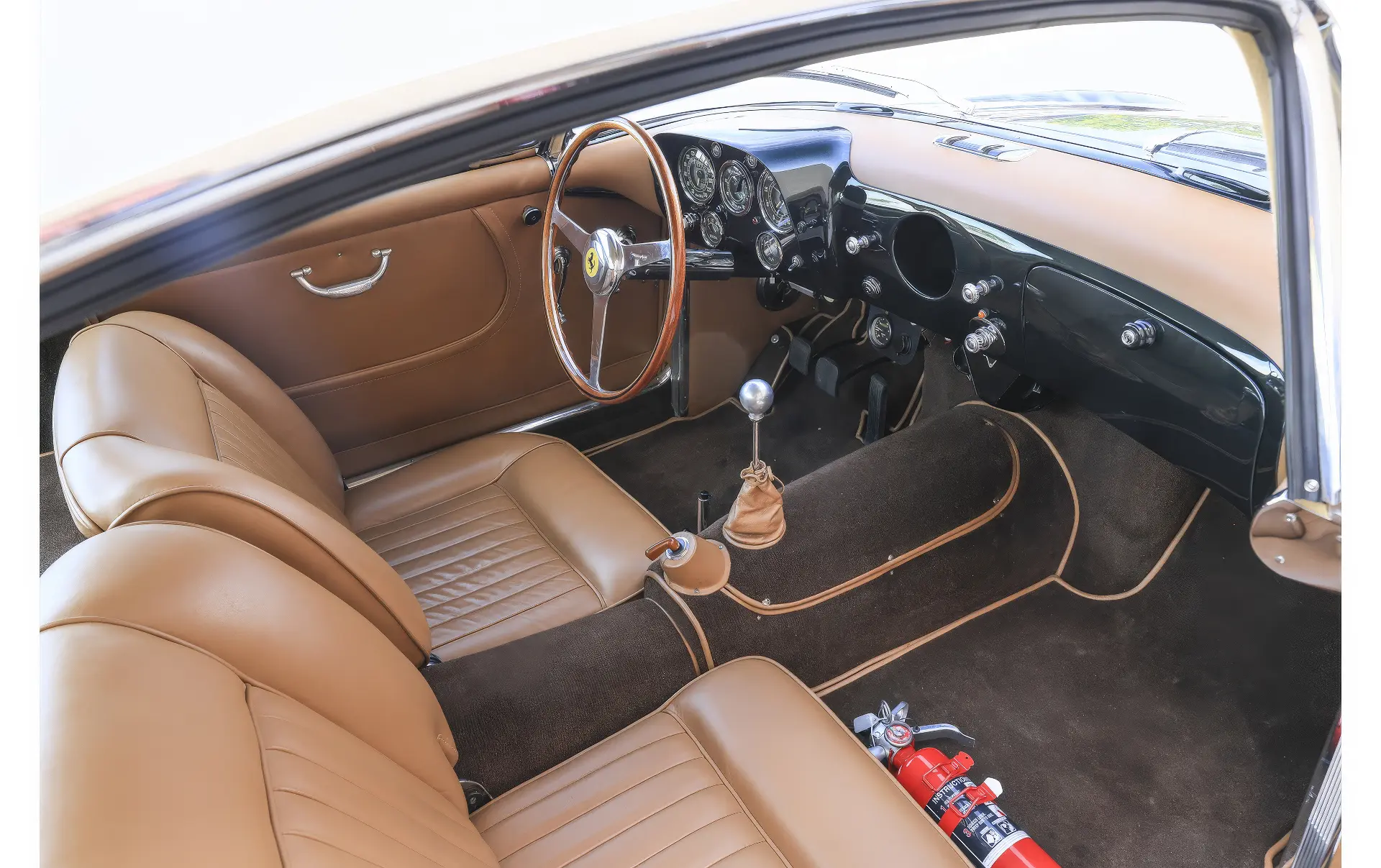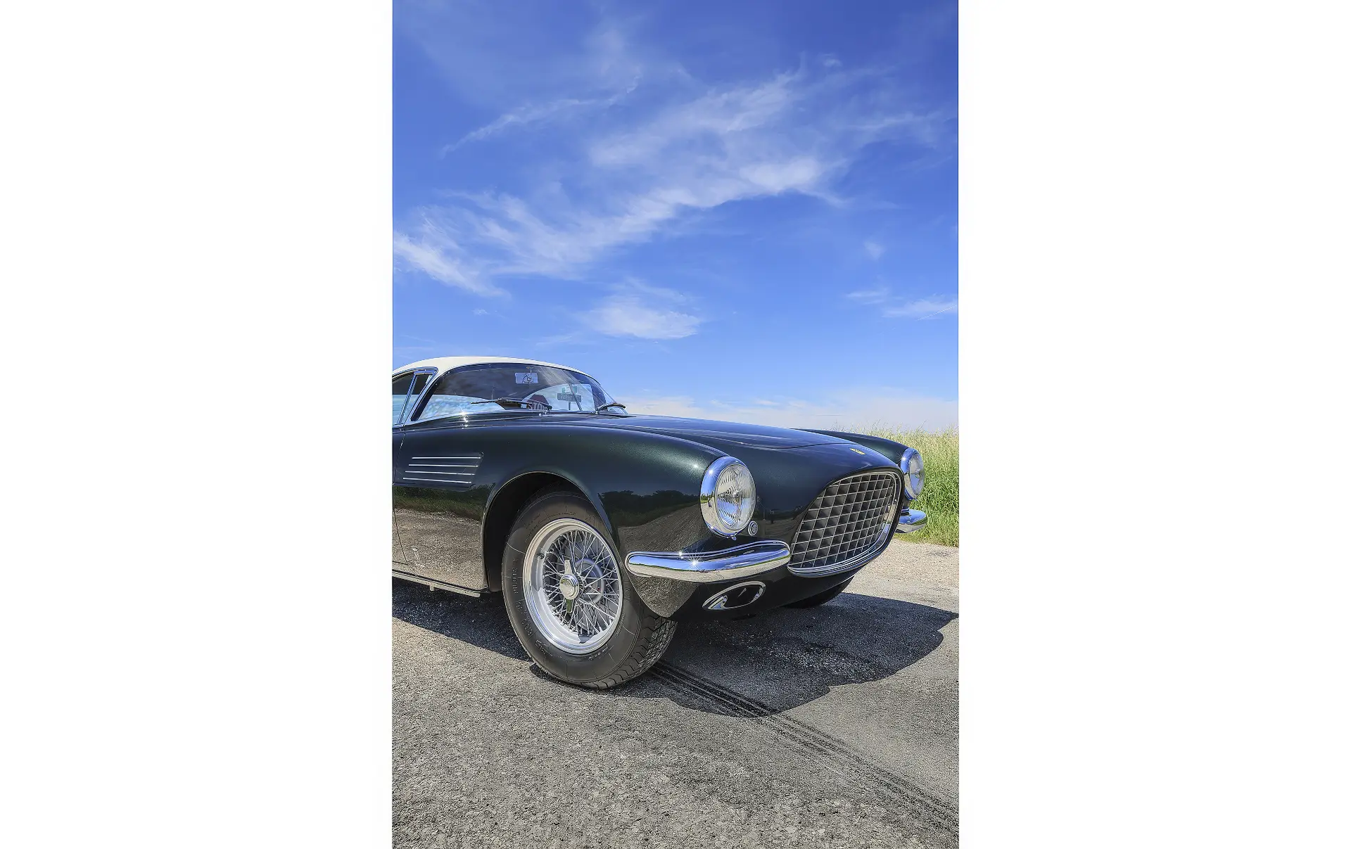 D’origine, la finition était vert foncé métallisé avec un toit blanc contrasté et une sellerie en cuir beige. La carrosserie spectaculaire était complétée par un badge Ferrari traditionnel sur le bord avant du nez et par les badges Vignale classiques sur les ailes avant inférieures, soulignés par des écritures chromées décoratives.