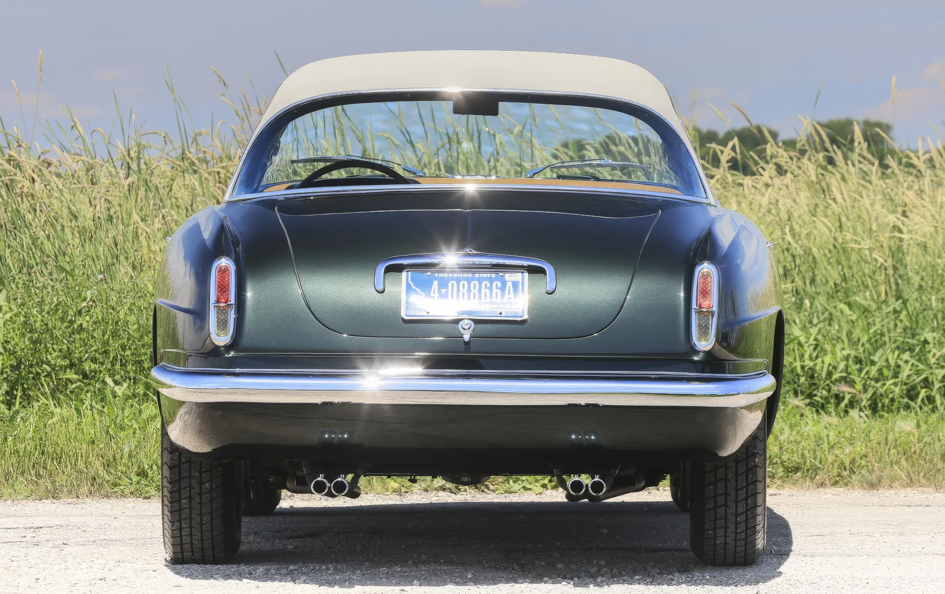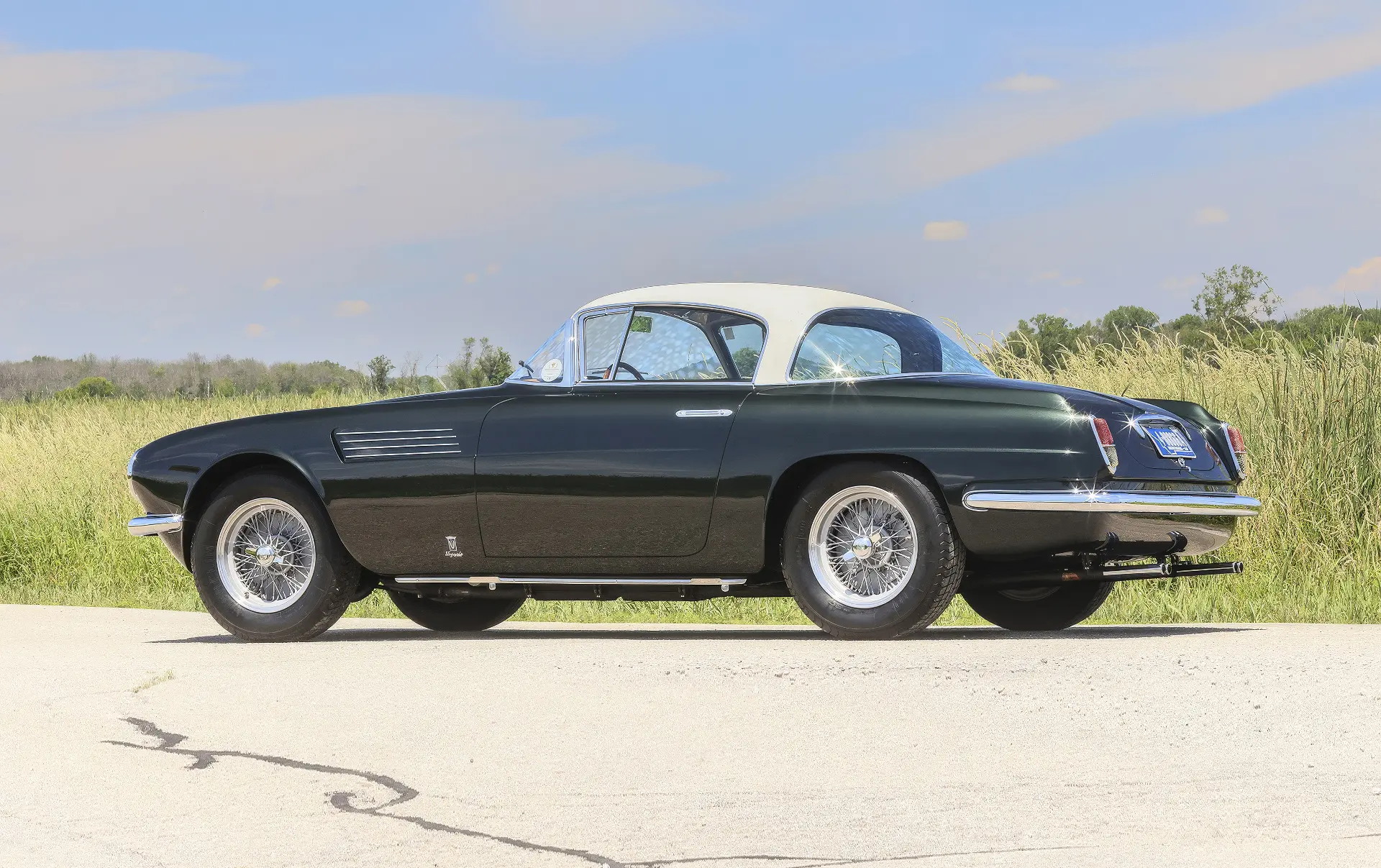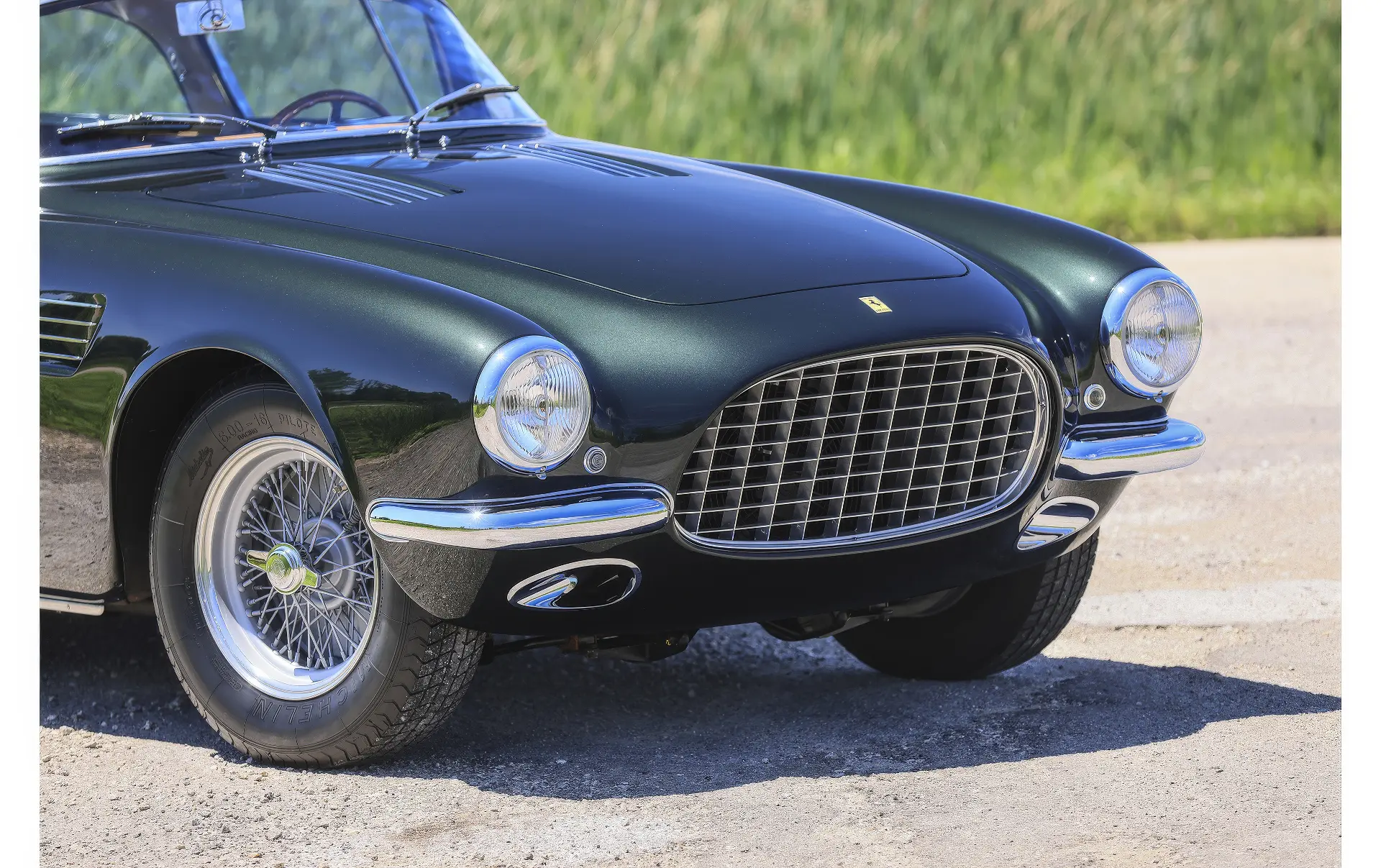 D’origine, la finition était vert foncé métallisé avec un toit blanc contrasté et une sellerie en cuir beige. La carrosserie spectaculaire était complétée par un badge Ferrari traditionnel sur le bord avant du nez et par les badges Vignale classiques sur les ailes avant inférieures, soulignés par des écritures chromées décoratives.