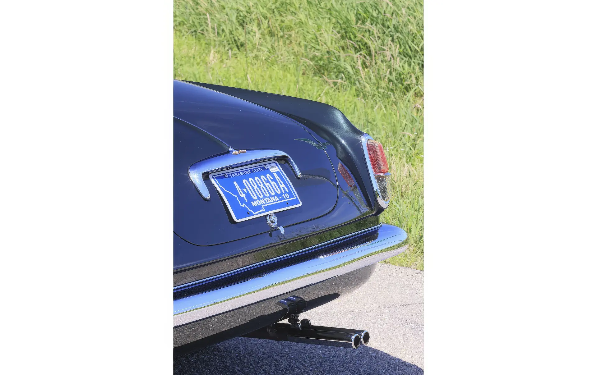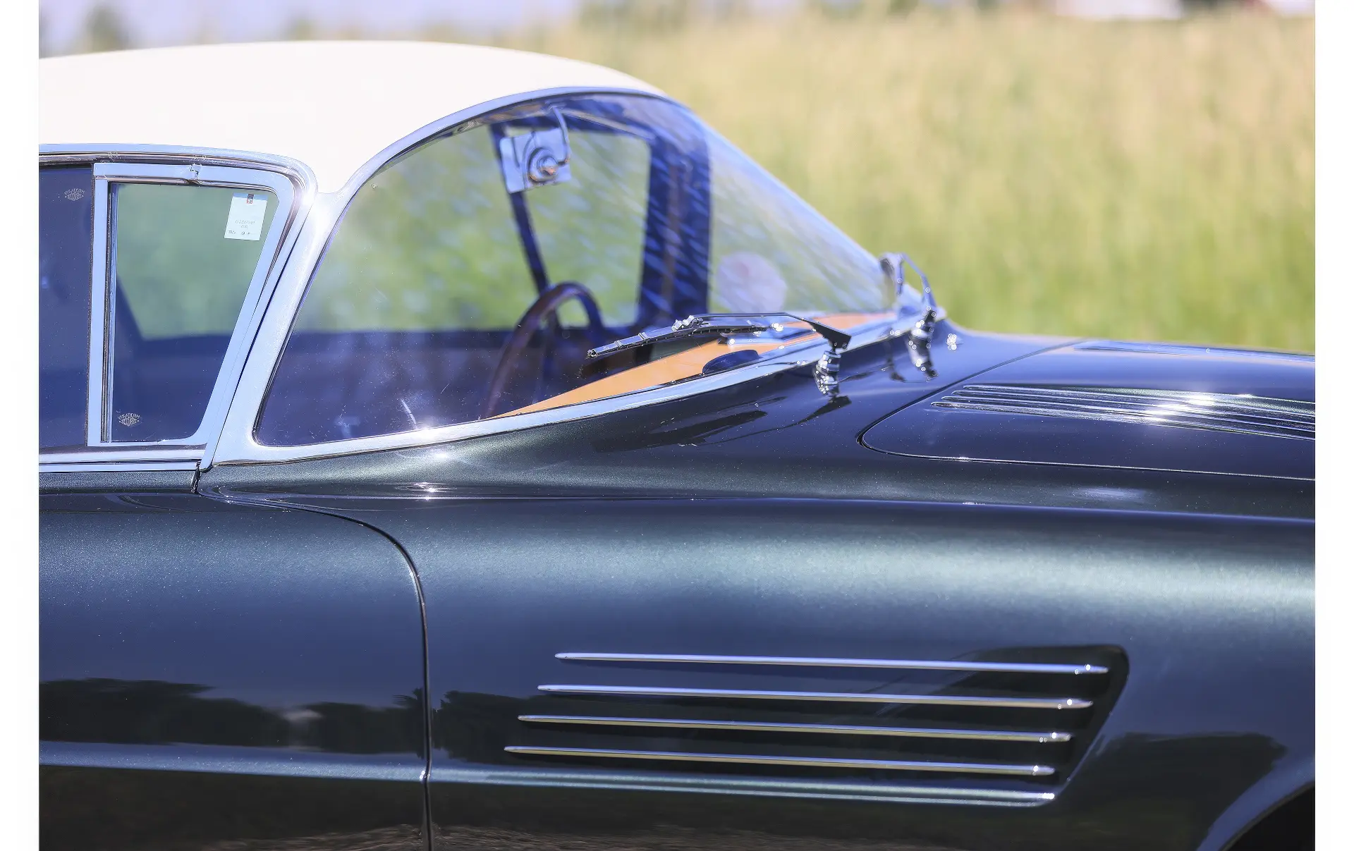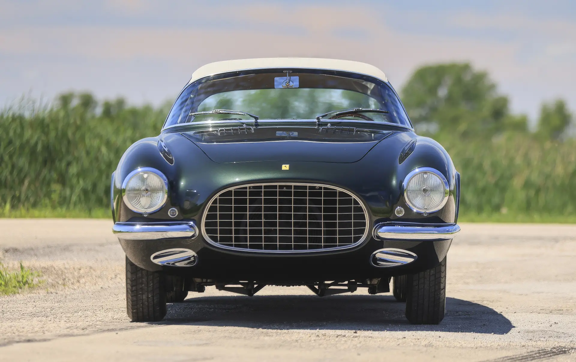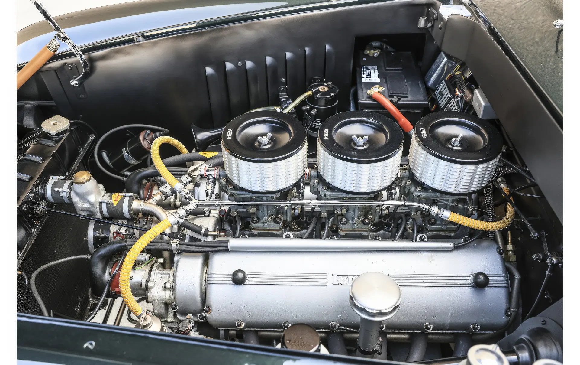 D’origine, la finition était vert foncé métallisé avec un toit blanc contrasté et une sellerie en cuir beige. La carrosserie spectaculaire était complétée par un badge Ferrari traditionnel sur le bord avant du nez et par les badges Vignale classiques sur les ailes avant inférieures, soulignés par des écritures chromées décoratives.