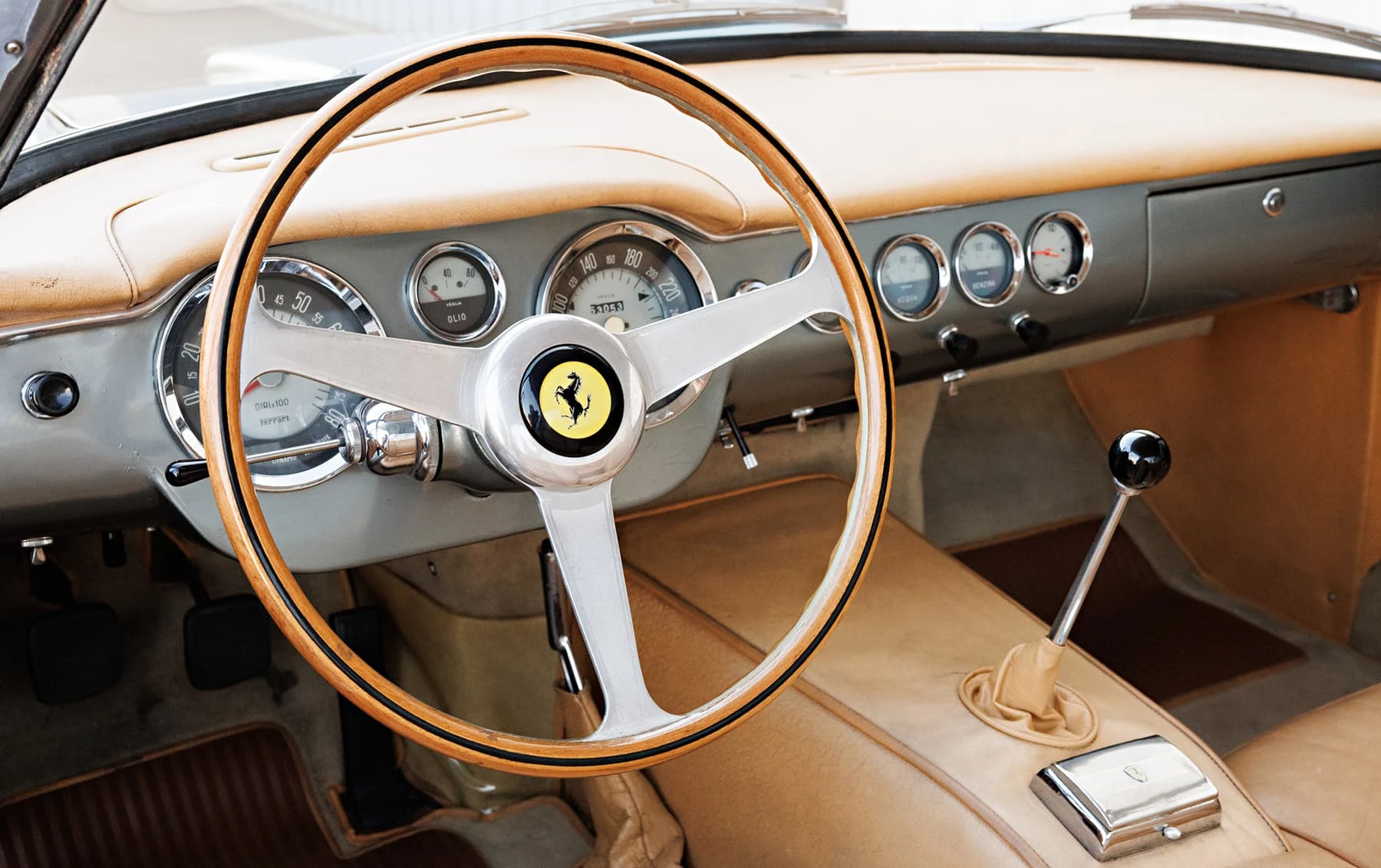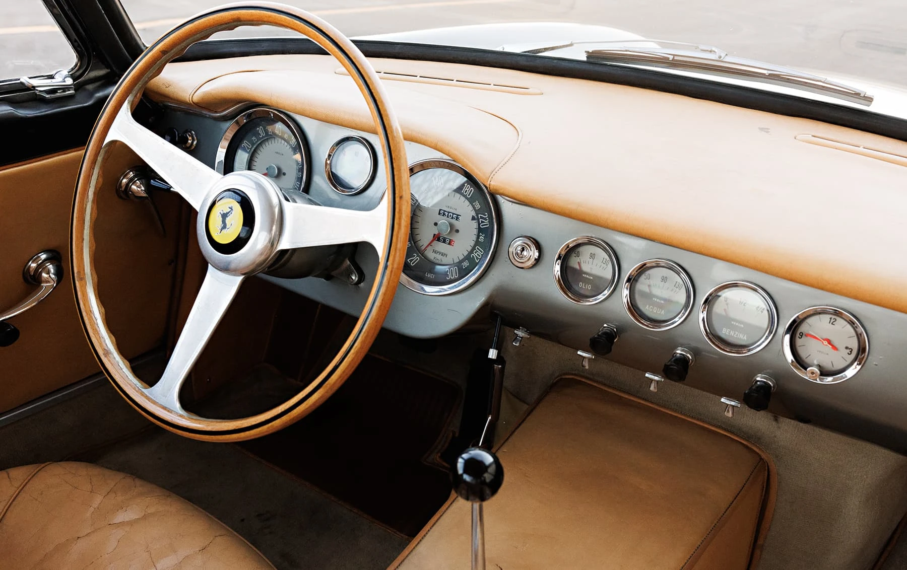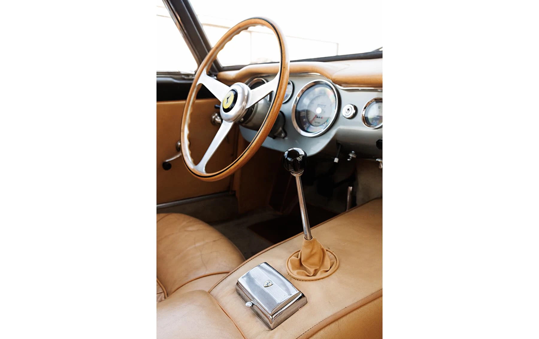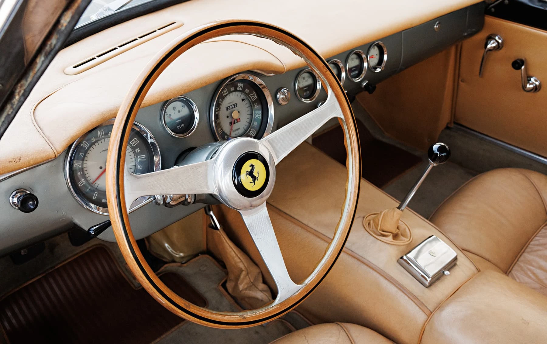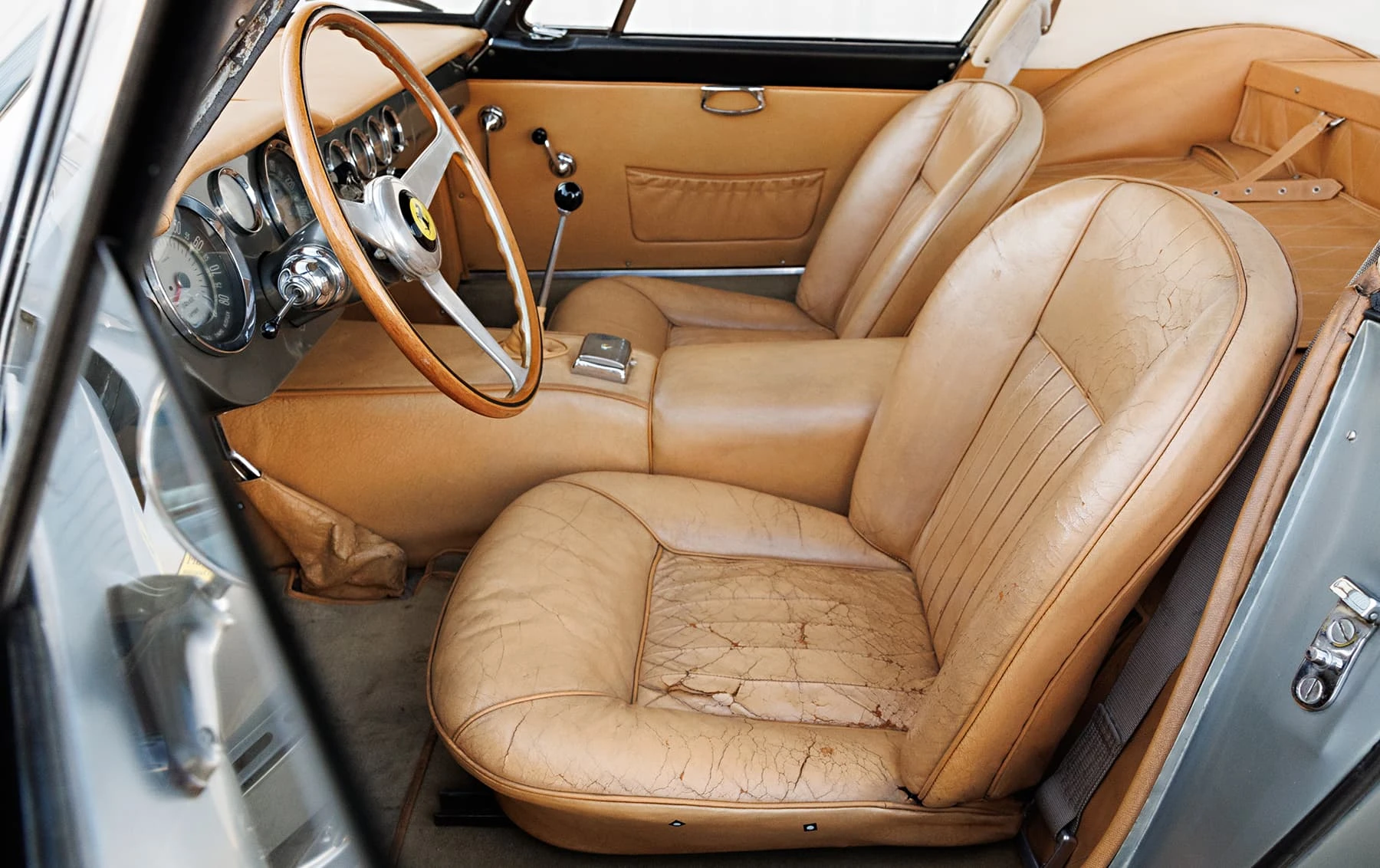 Aujourd’hui encore, cette Ferrari conserve sa sellerie en cuir beige d’origine, qui possède une patine fantastique et irremplaçable. Cette magnifique sellerie s’accorde parfaitement avec la peinture grise tachetée de la voiture, qui a été retouchée au fil des ans, selon les besoins. En outre, la SWB Berlinetta possède de merveilleux détails d’origine – vitres d’origine, ceintures de sécurité Irvin d’époque, et jantes Borrani RW3690 en fil de fer. Il est important de noter qu’il n’existe aucune trace de remplacement des composants mécaniques d’origine de la 3507 GT ou d’accident – une rareté parmi les berlinettes SWB. En fait, les exemples qui ont survécu dans un état similaire, bien entretenu et non restauré, se comptent sur les doigts d’une main.