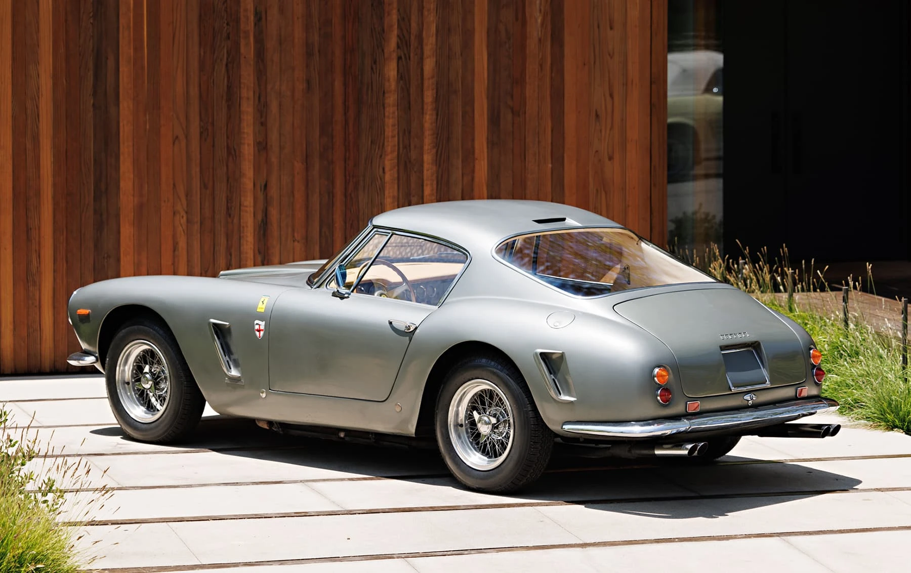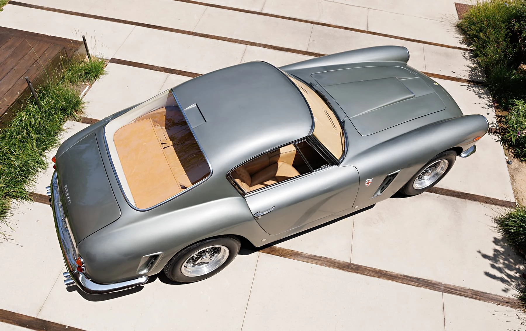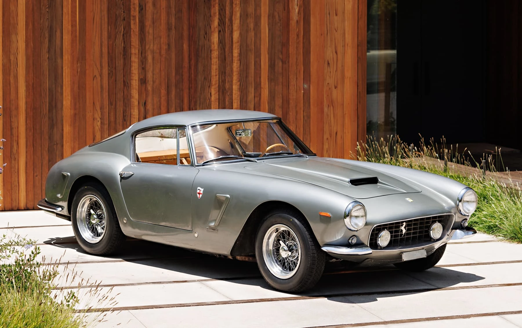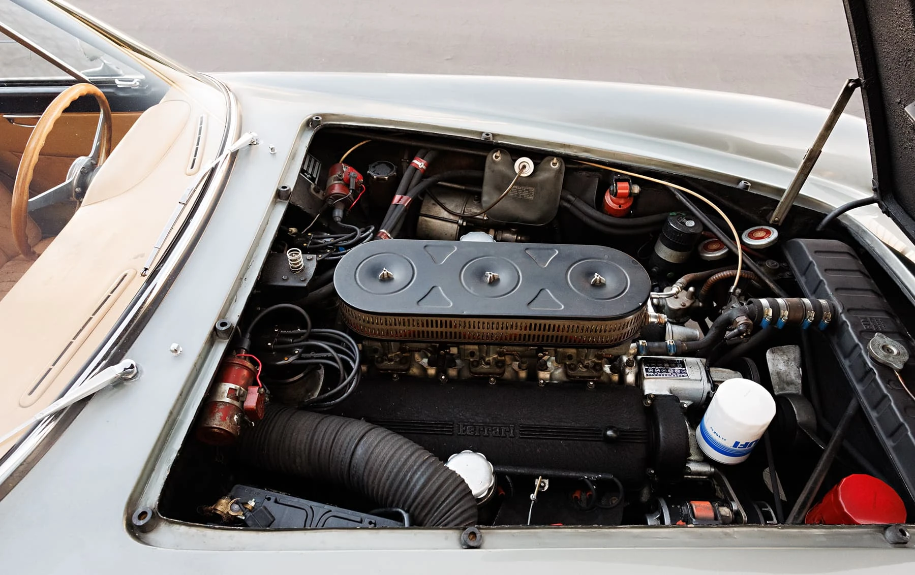 Aujourd’hui encore, cette Ferrari conserve sa sellerie en cuir beige d’origine, qui possède une patine fantastique et irremplaçable. Cette magnifique sellerie s’accorde parfaitement avec la peinture grise tachetée de la voiture, qui a été retouchée au fil des ans, selon les besoins. En outre, la SWB Berlinetta possède de merveilleux détails d’origine – vitres d’origine, ceintures de sécurité Irvin d’époque, et jantes Borrani RW3690 en fil de fer. Il est important de noter qu’il n’existe aucune trace de remplacement des composants mécaniques d’origine de la 3507 GT ou d’accident – une rareté parmi les berlinettes SWB. En fait, les exemples qui ont survécu dans un état similaire, bien entretenu et non restauré, se comptent sur les doigts d’une main.