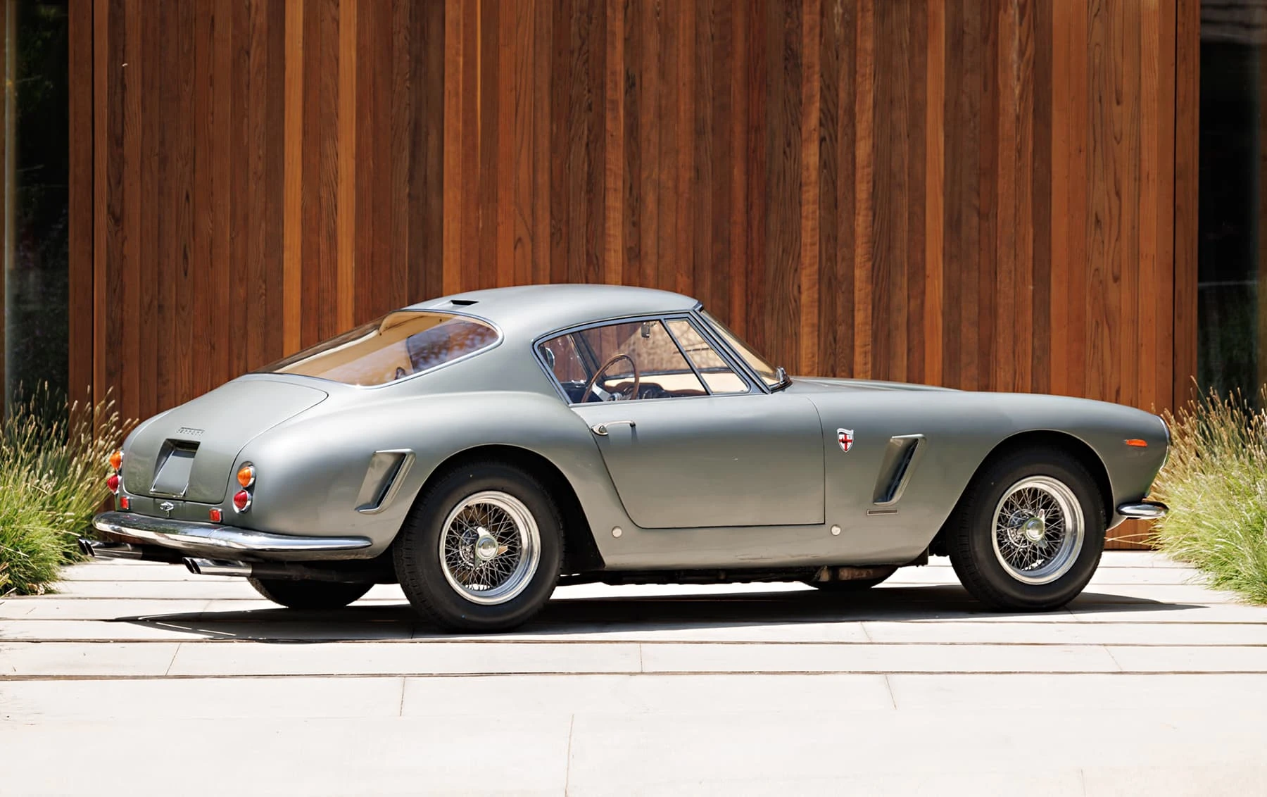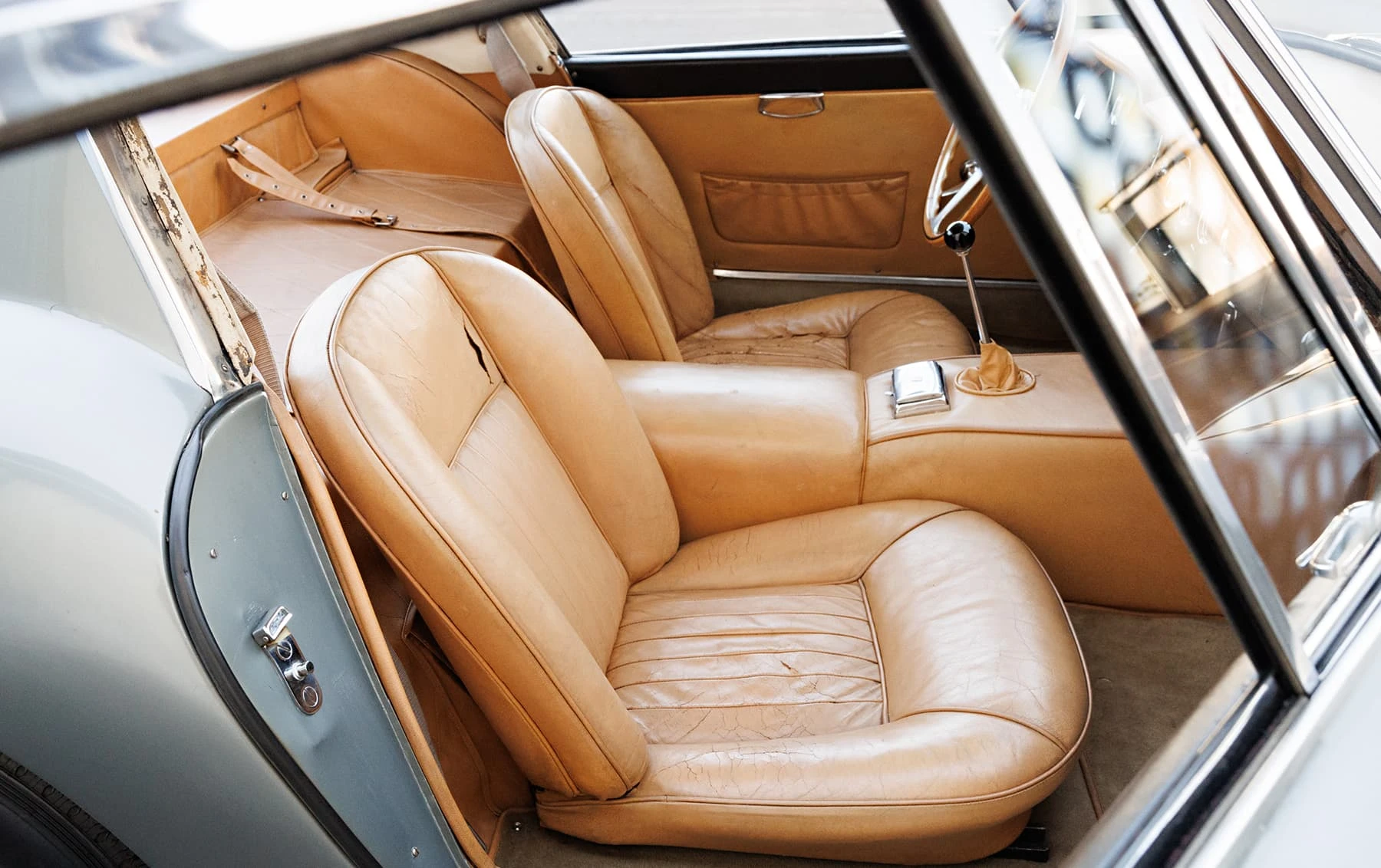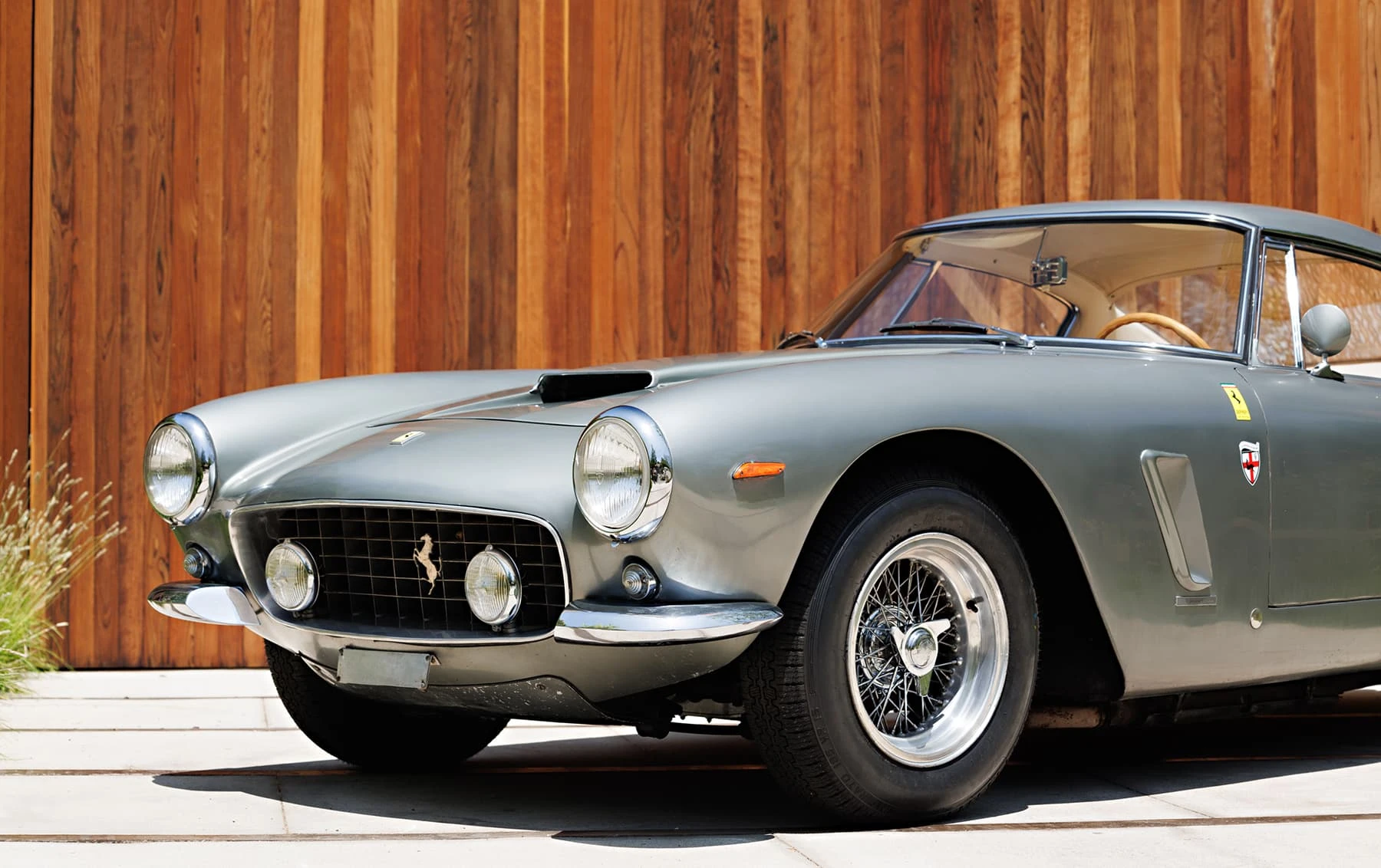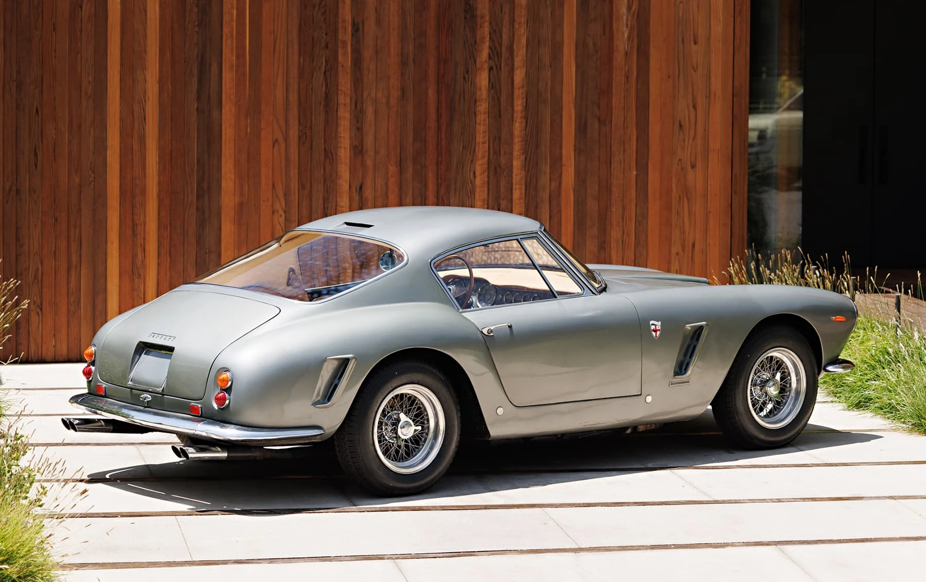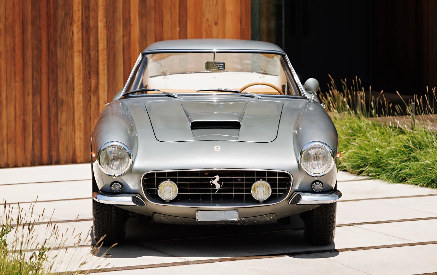 Aujourd’hui encore, cette Ferrari conserve sa sellerie en cuir beige d’origine, qui possède une patine fantastique et irremplaçable. Cette magnifique sellerie s’accorde parfaitement avec la peinture grise tachetée de la voiture, qui a été retouchée au fil des ans, selon les besoins. En outre, la SWB Berlinetta possède de merveilleux détails d’origine – vitres d’origine, ceintures de sécurité Irvin d’époque, et jantes Borrani RW3690 en fil de fer. Il est important de noter qu’il n’existe aucune trace de remplacement des composants mécaniques d’origine de la 3507 GT ou d’accident – une rareté parmi les berlinettes SWB. En fait, les exemples qui ont survécu dans un état similaire, bien entretenu et non restauré, se comptent sur les doigts d’une main.