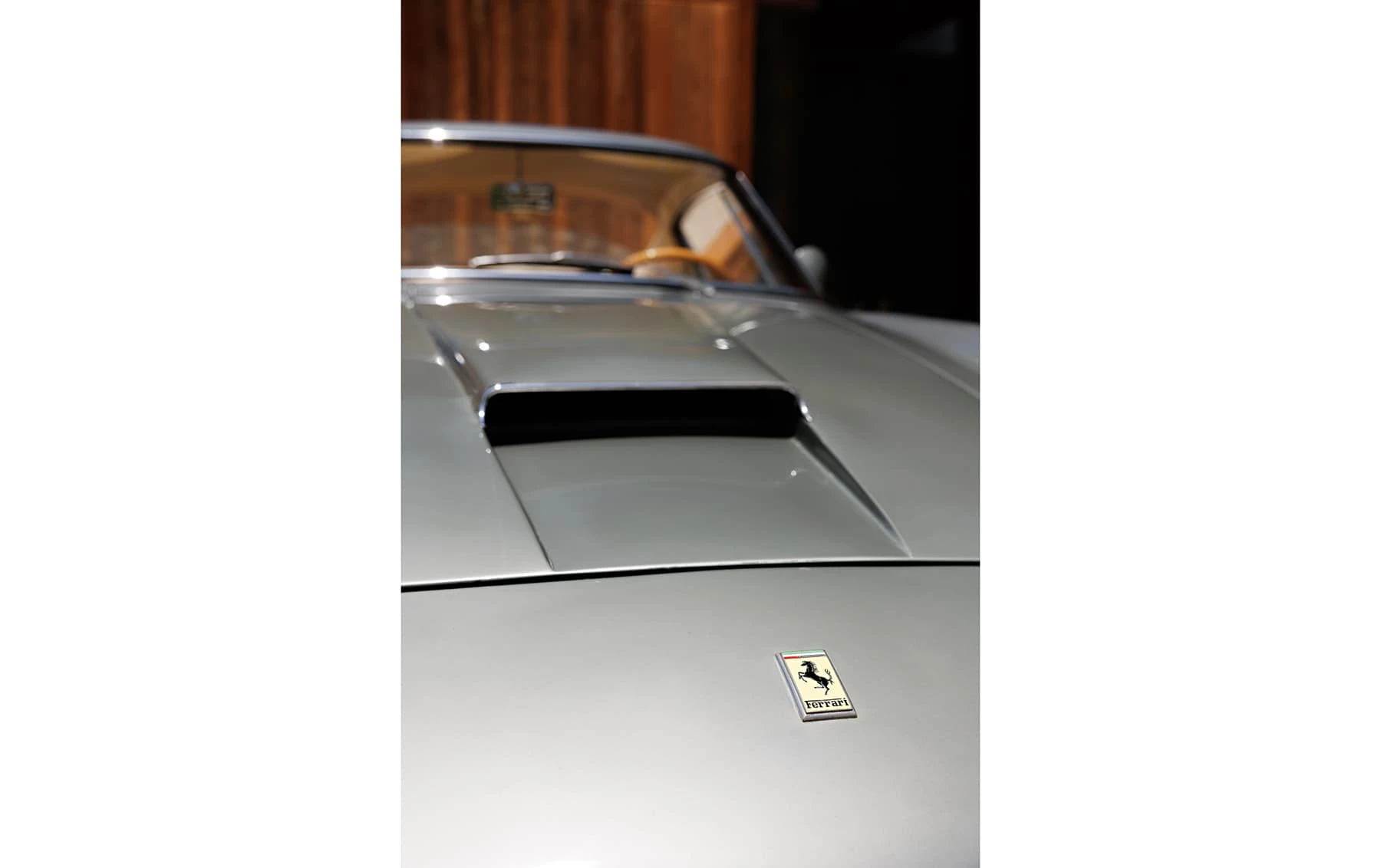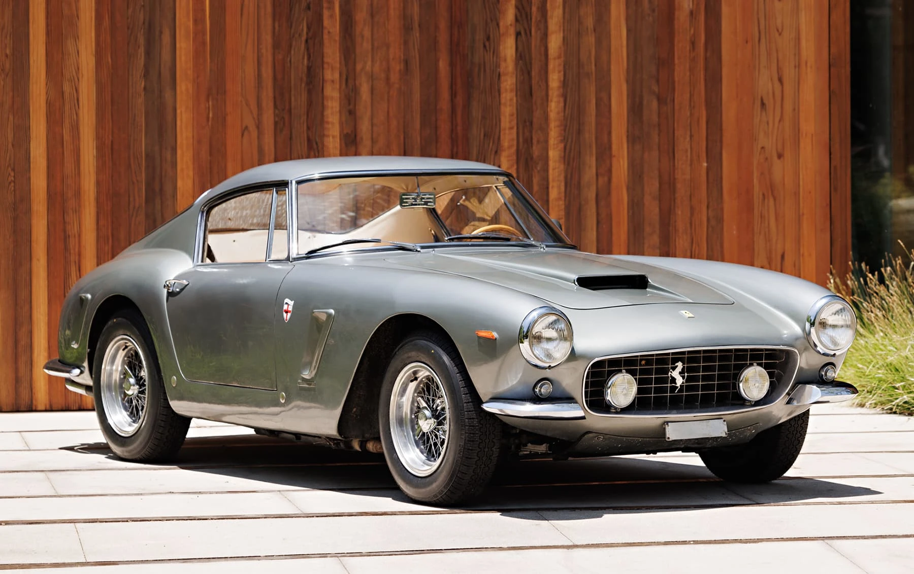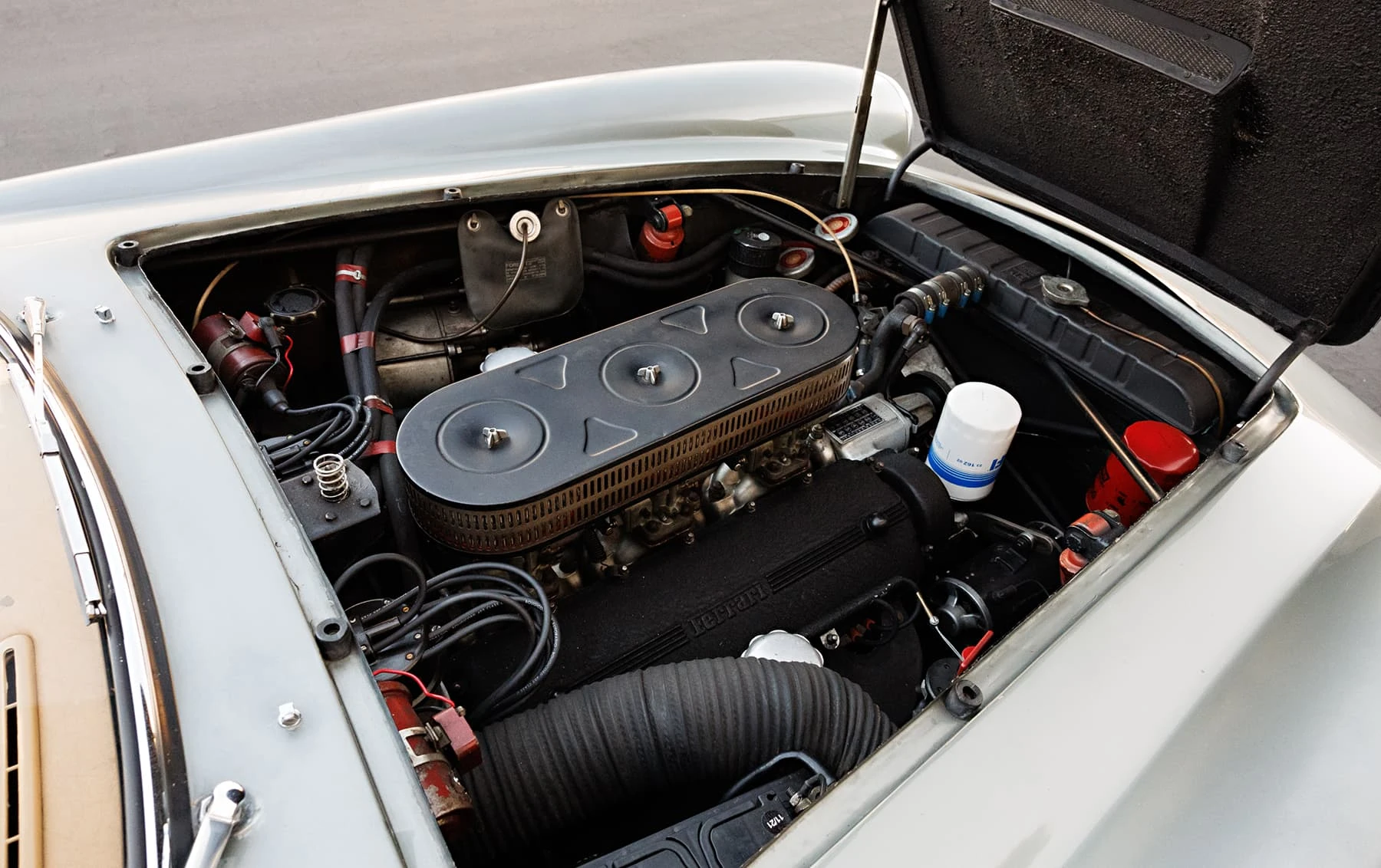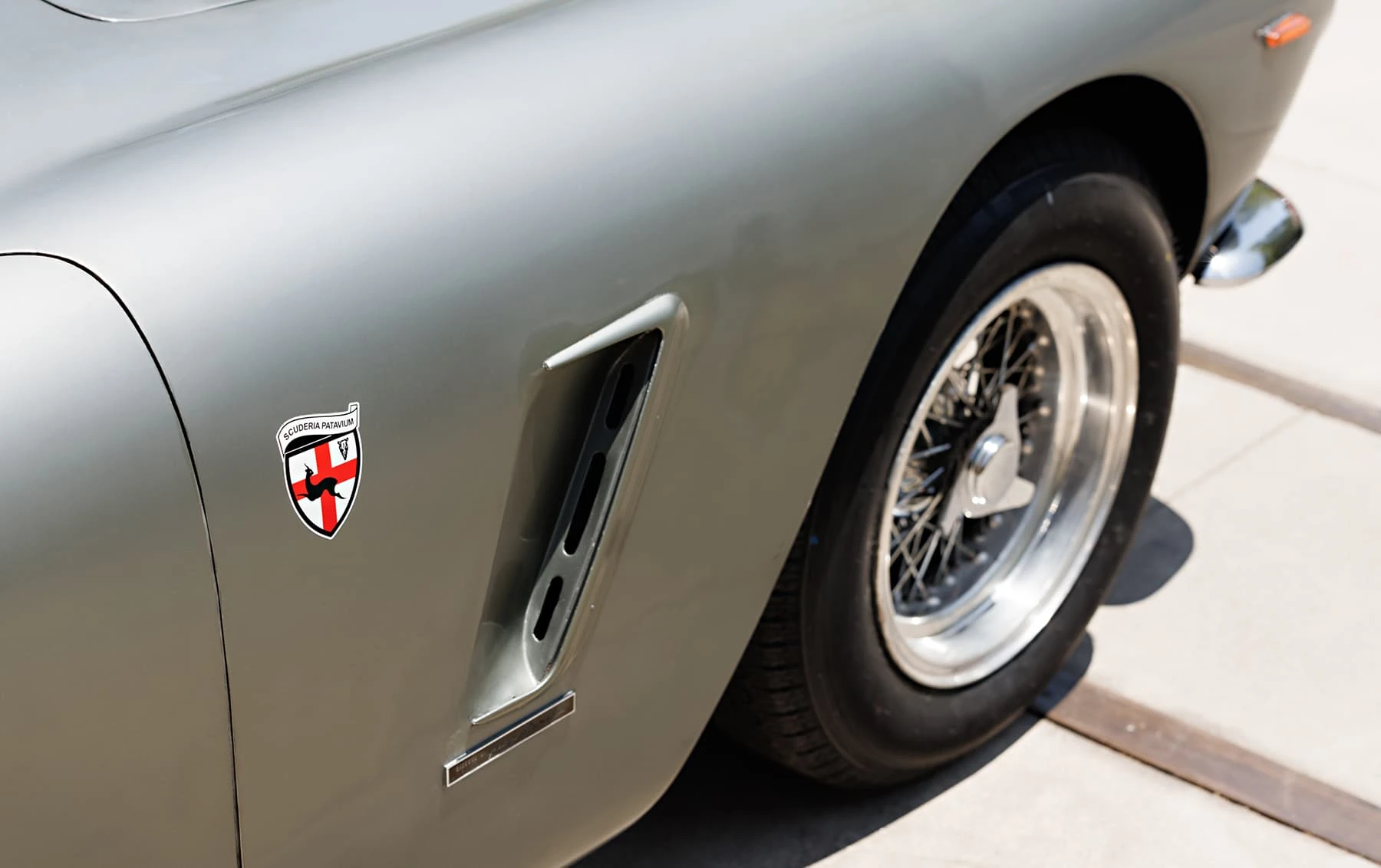 Aujourd’hui encore, cette Ferrari conserve sa sellerie en cuir beige d’origine, qui possède une patine fantastique et irremplaçable. Cette magnifique sellerie s’accorde parfaitement avec la peinture grise tachetée de la voiture, qui a été retouchée au fil des ans, selon les besoins. En outre, la SWB Berlinetta possède de merveilleux détails d’origine – vitres d’origine, ceintures de sécurité Irvin d’époque, et jantes Borrani RW3690 en fil de fer. Il est important de noter qu’il n’existe aucune trace de remplacement des composants mécaniques d’origine de la 3507 GT ou d’accident – une rareté parmi les berlinettes SWB. En fait, les exemples qui ont survécu dans un état similaire, bien entretenu et non restauré, se comptent sur les doigts d’une main.