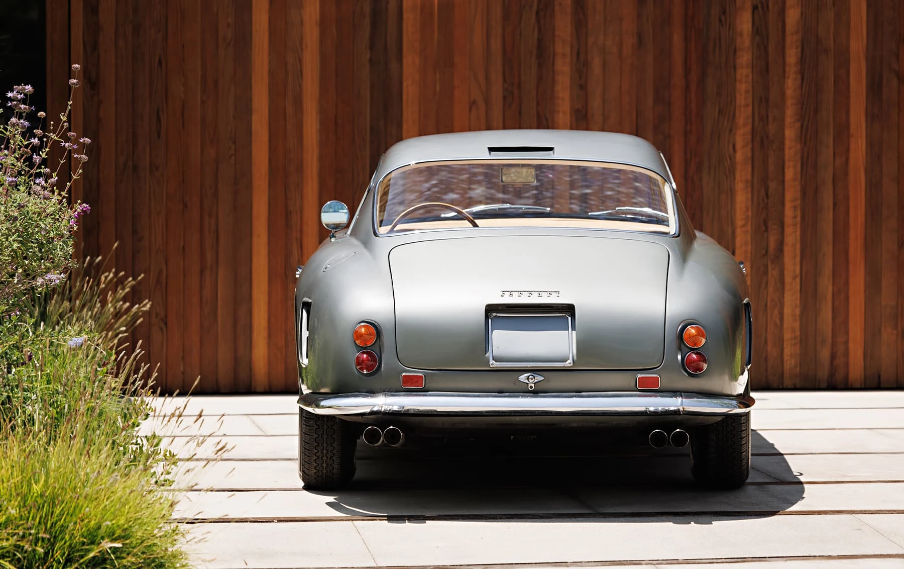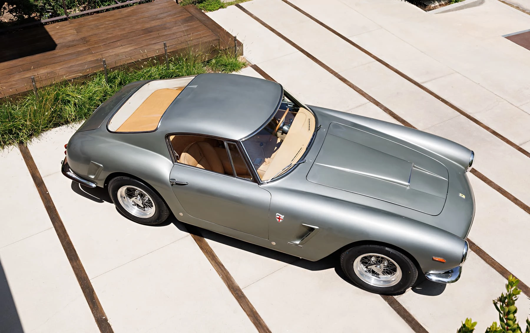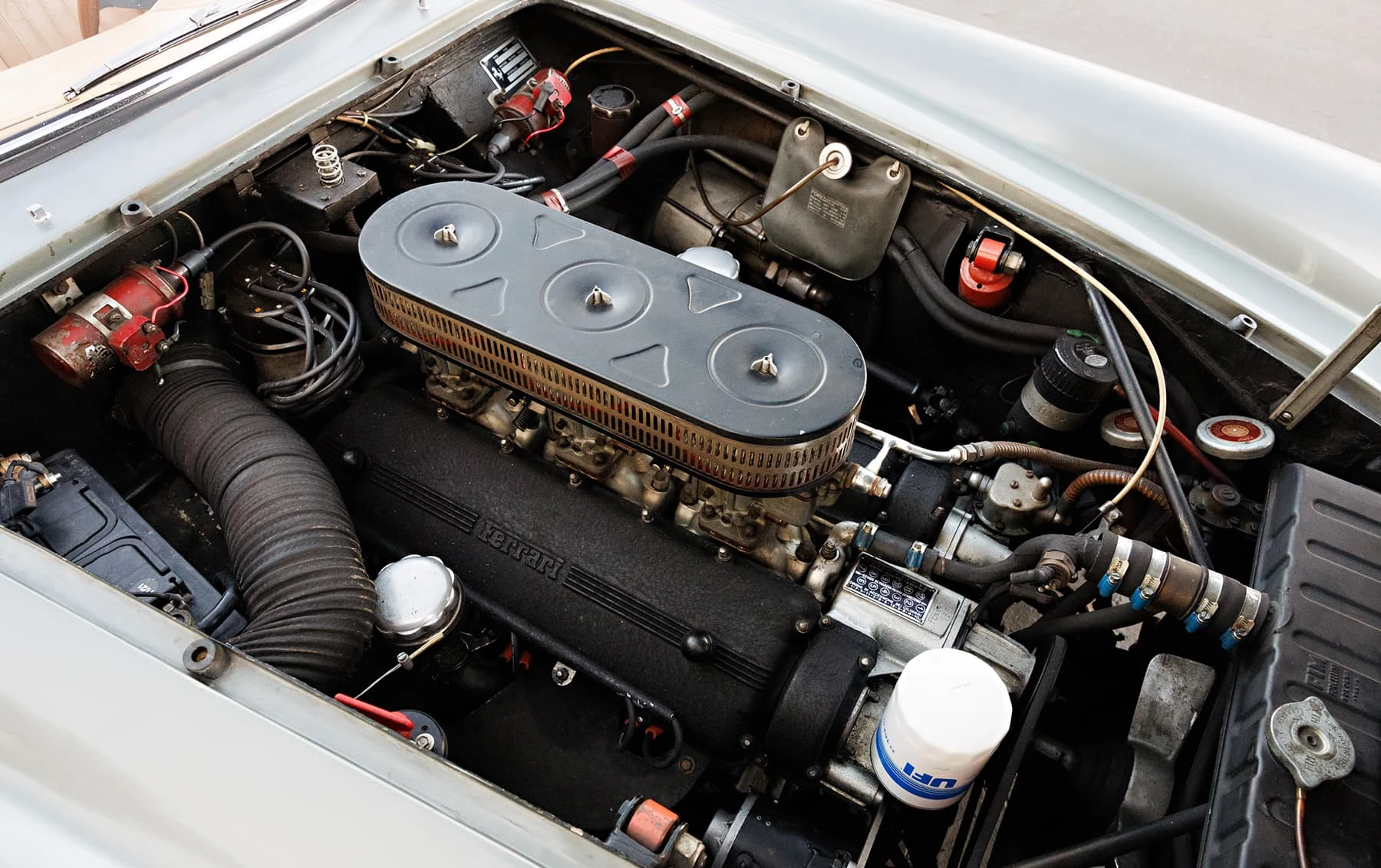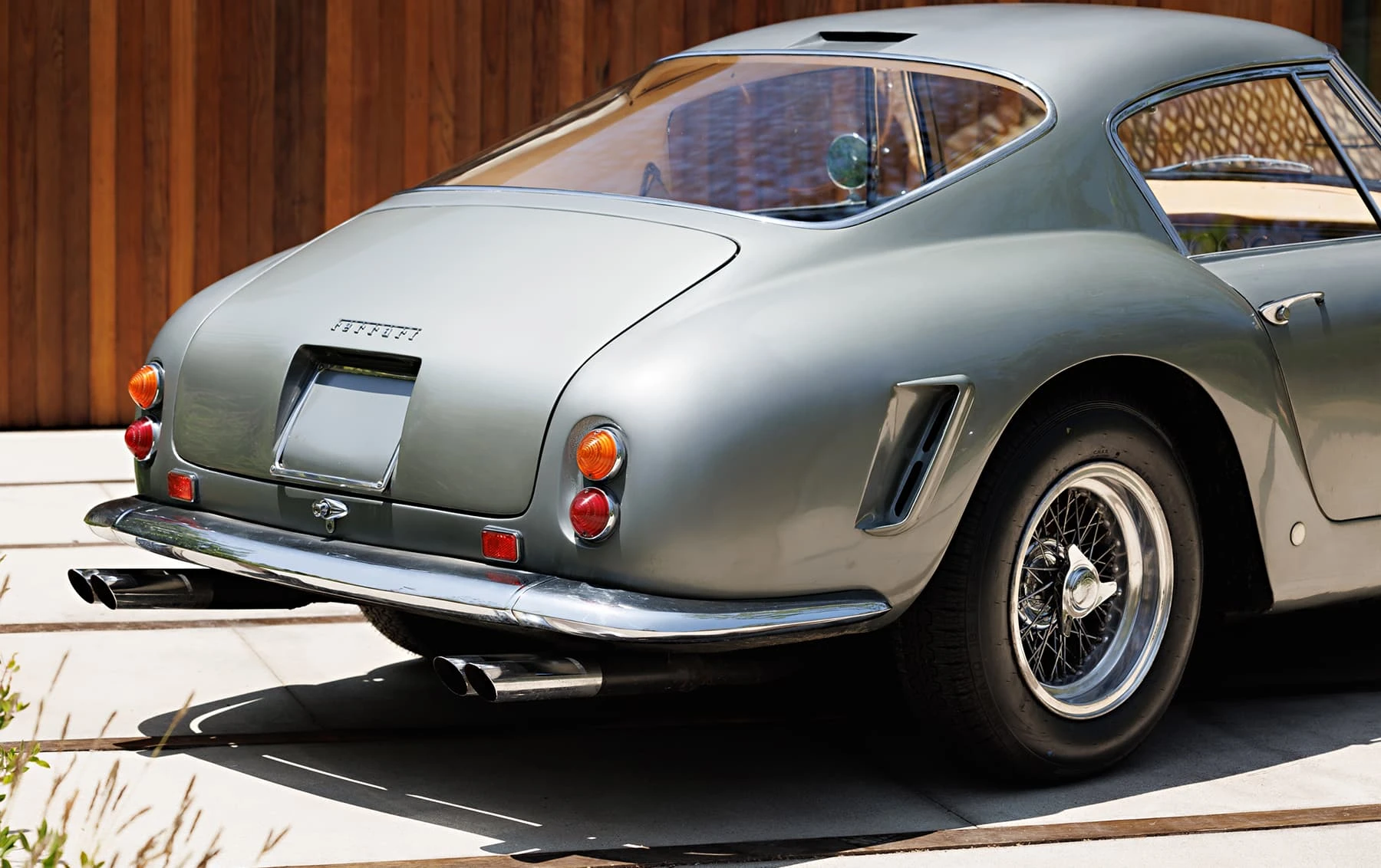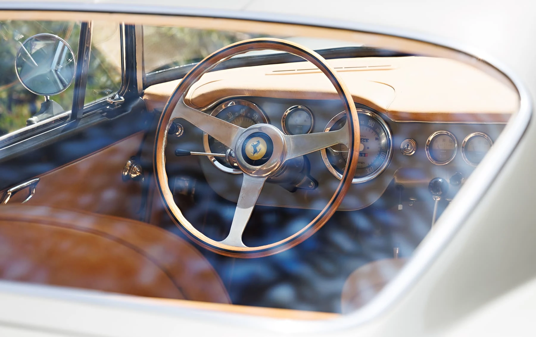 Aujourd’hui encore, cette Ferrari conserve sa sellerie en cuir beige d’origine, qui possède une patine fantastique et irremplaçable. Cette magnifique sellerie s’accorde parfaitement avec la peinture grise tachetée de la voiture, qui a été retouchée au fil des ans, selon les besoins. En outre, la SWB Berlinetta possède de merveilleux détails d’origine – vitres d’origine, ceintures de sécurité Irvin d’époque, et jantes Borrani RW3690 en fil de fer. Il est important de noter qu’il n’existe aucune trace de remplacement des composants mécaniques d’origine de la 3507 GT ou d’accident – une rareté parmi les berlinettes SWB. En fait, les exemples qui ont survécu dans un état similaire, bien entretenu et non restauré, se comptent sur les doigts d’une main.