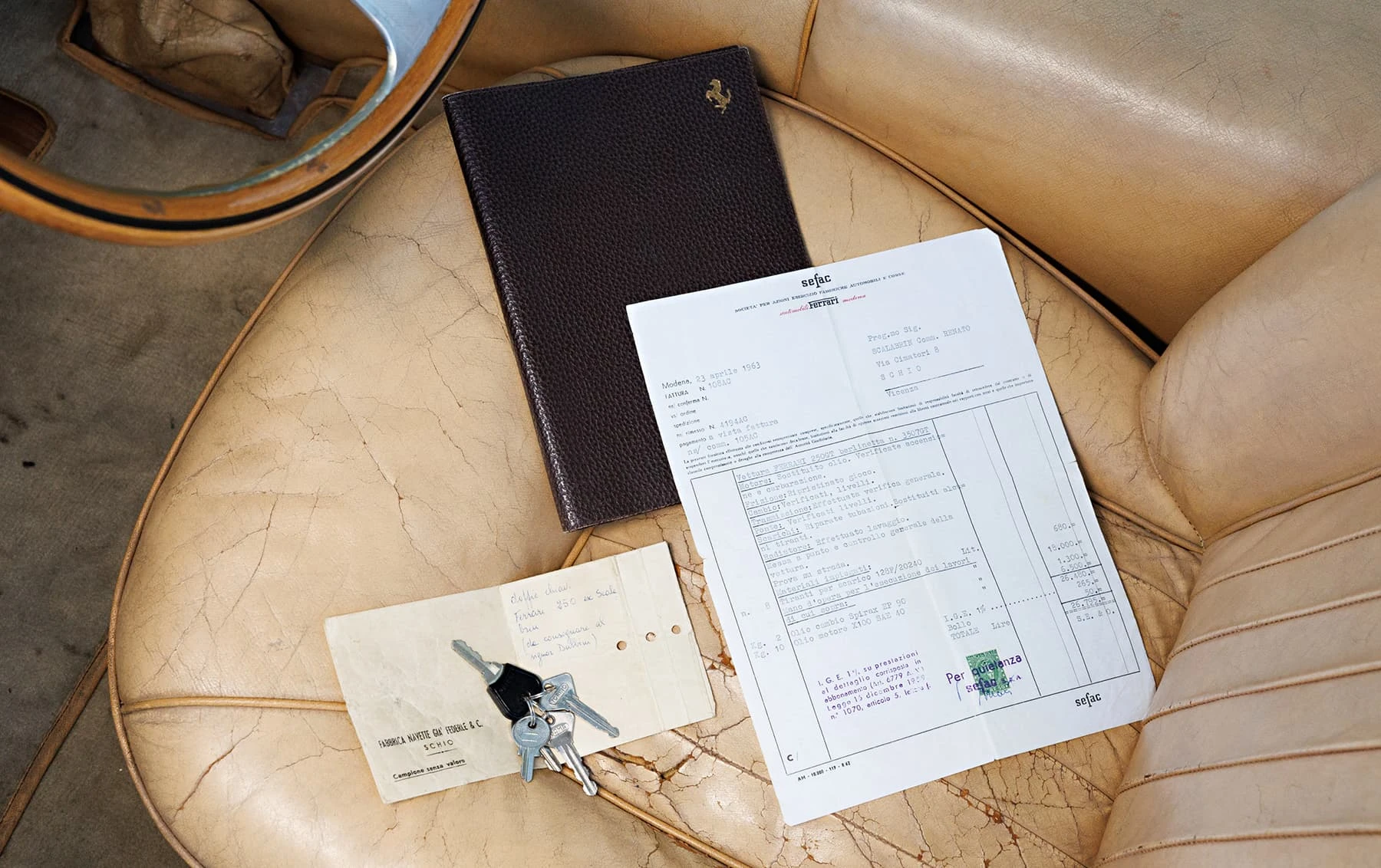 Conformément à son caractère plein d’âme, la 3507 GT est offerte avec ses clés d’origine, un rouleau d’outils approprié et un dossier de documentation qui comprend un rapport d’histoire produit par Marcel Massini, des copies des registres d’immatriculation de l’Automobile Club d’Italia, des papiers de régularité ACI-CSAI et même une facture originale du département de service de Ferrari datée du 23 avril 1963.