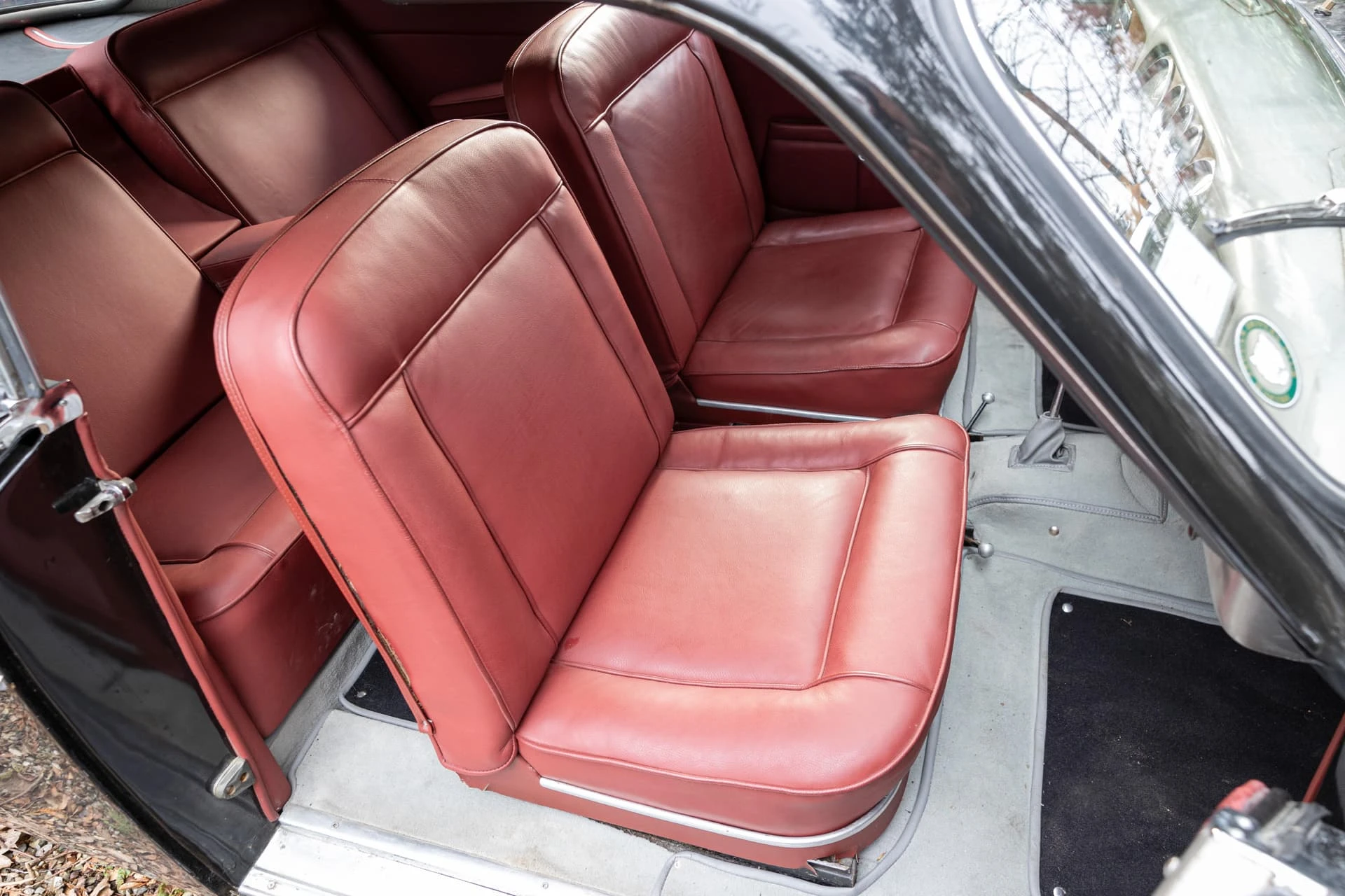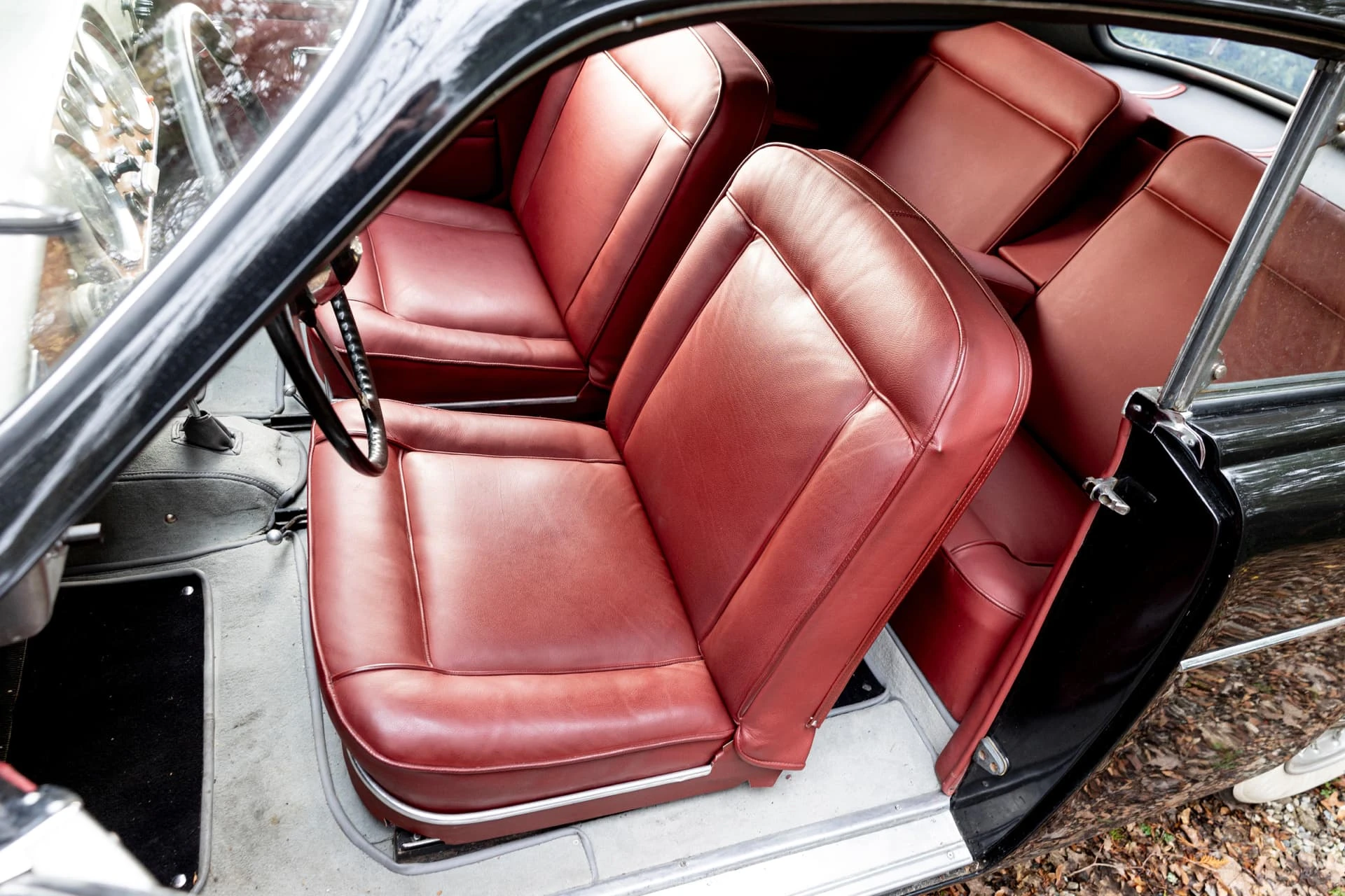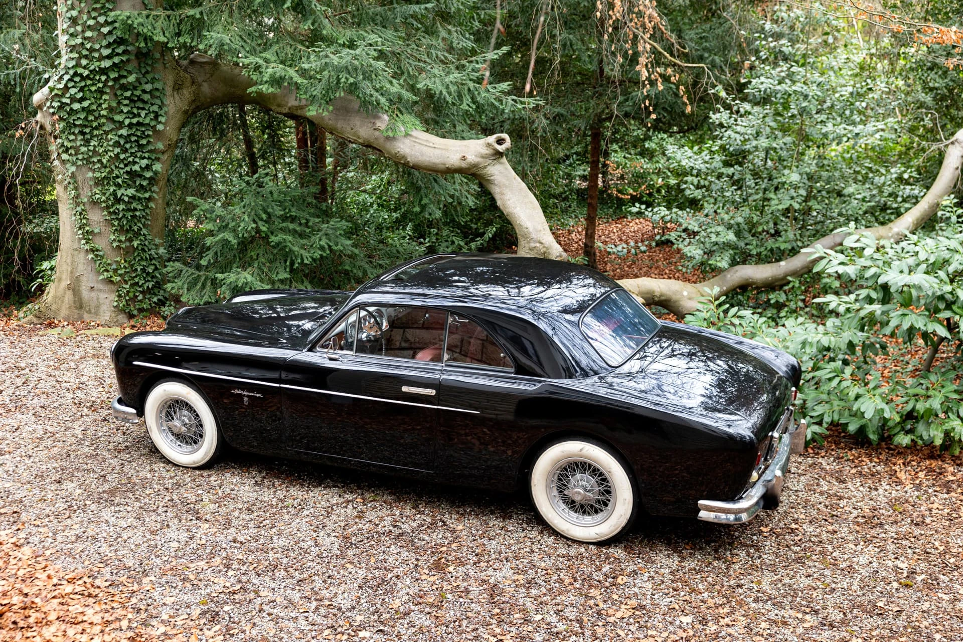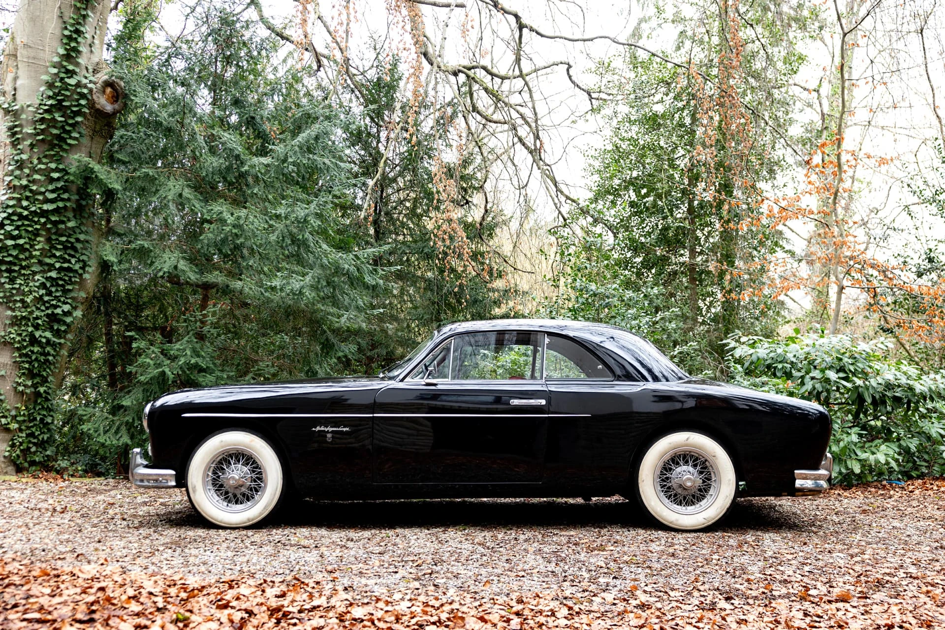 Cet élégant coupé noir à la sellerie en cuir lie de vin et aux attrayantes roues Borrani à rayons chromés, équipé du beau six-cylindres XK de 3,5 litres, est un exemplaire unique et l’une des dernières créations des Stabilimenti Farina, qui fermèrent en 1953. Il associe une allure italienne raffinée, un luxe tout britannique et une touche de sportivité.