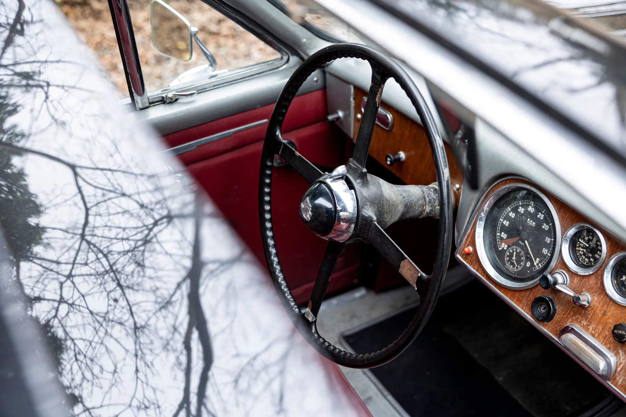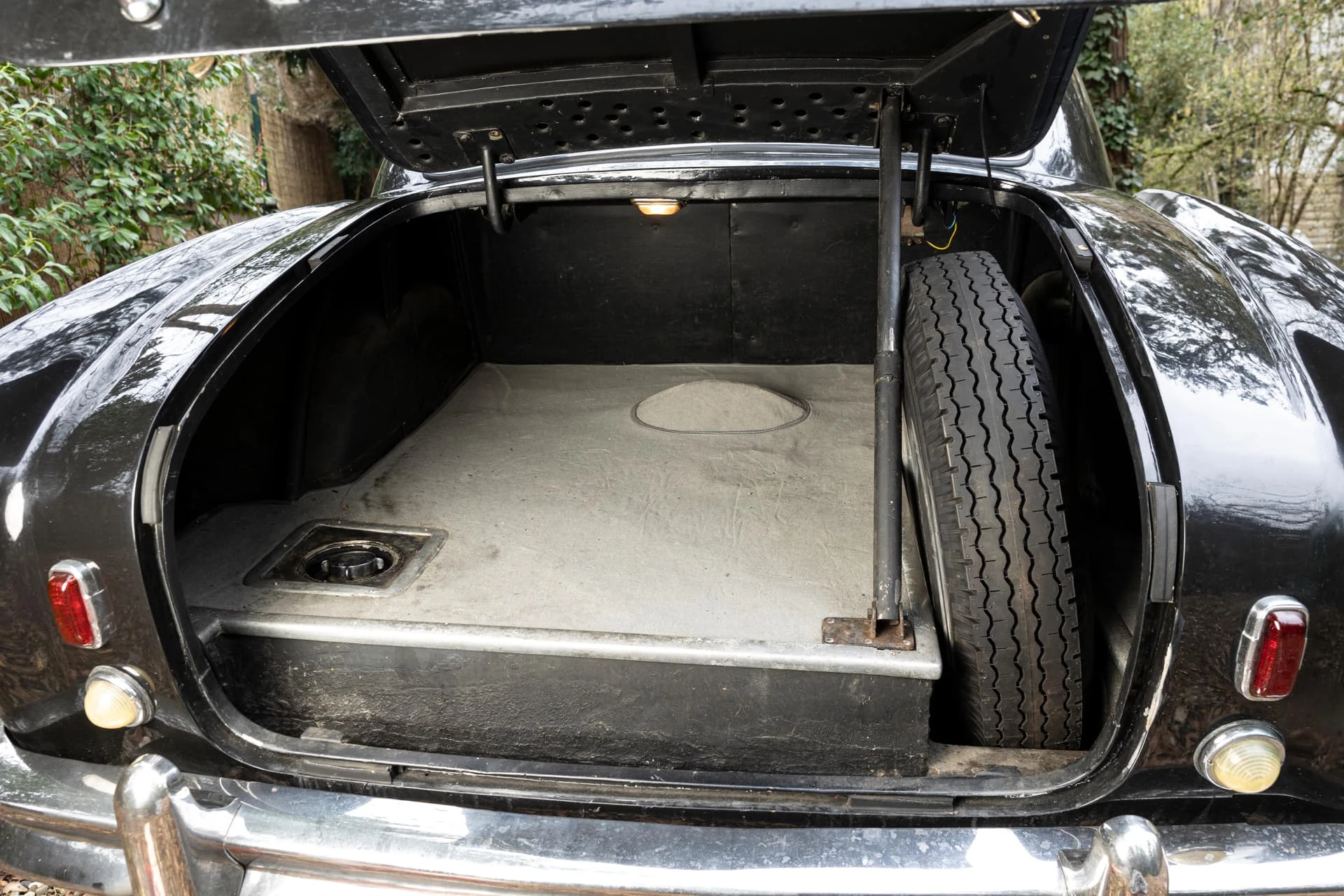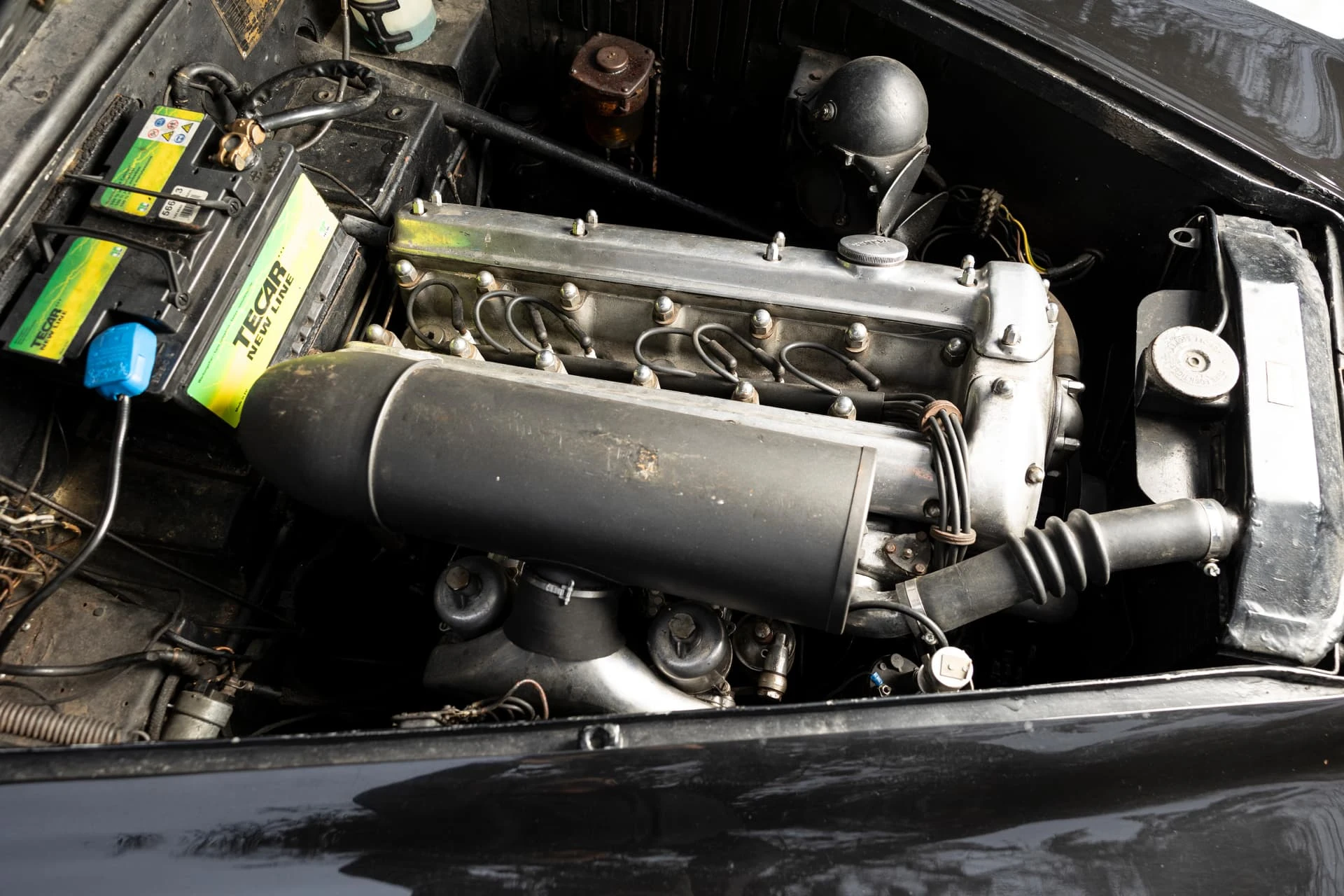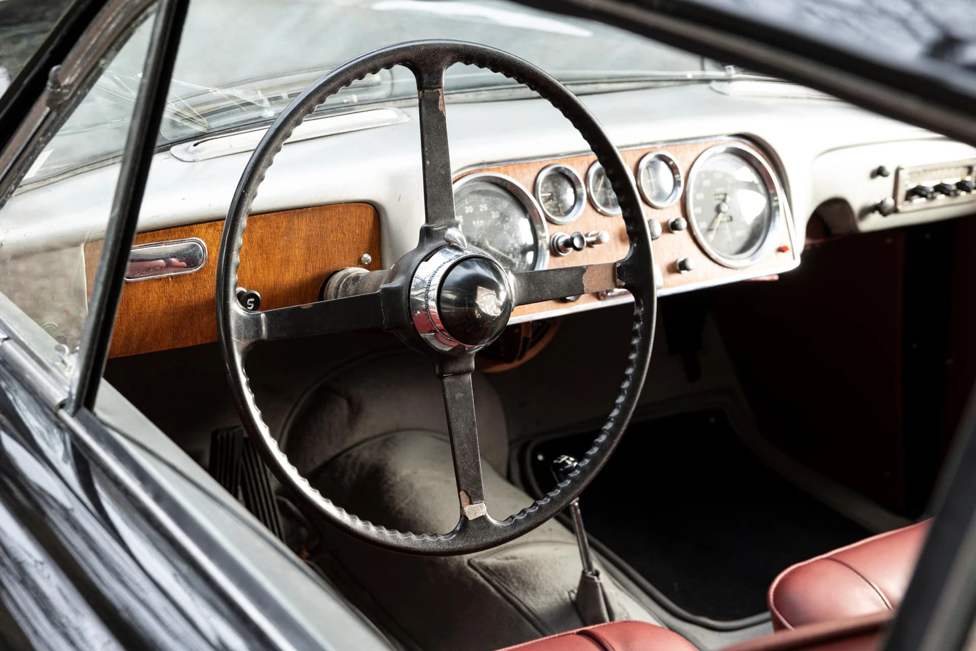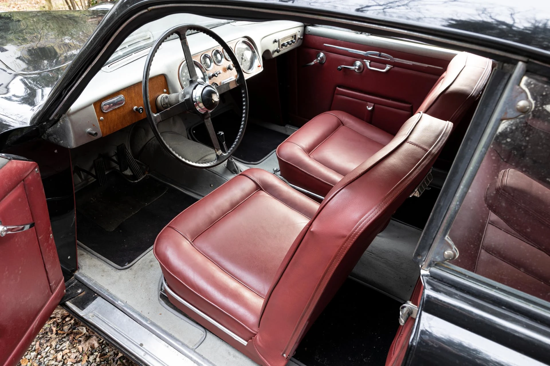 Cet élégant coupé noir à la sellerie en cuir lie de vin et aux attrayantes roues Borrani à rayons chromés, équipé du beau six-cylindres XK de 3,5 litres, est un exemplaire unique et l’une des dernières créations des Stabilimenti Farina, qui fermèrent en 1953. Il associe une allure italienne raffinée, un luxe tout britannique et une touche de sportivité.