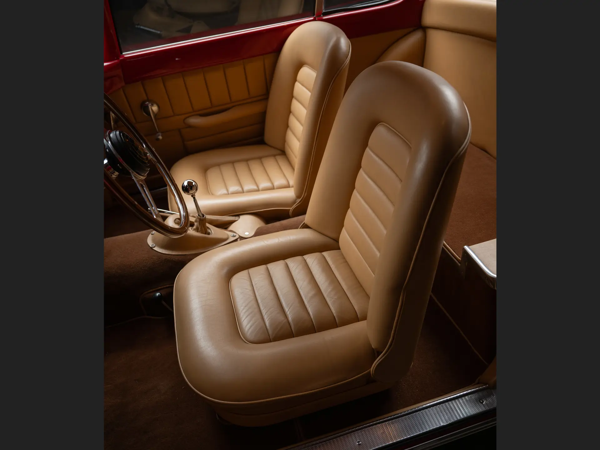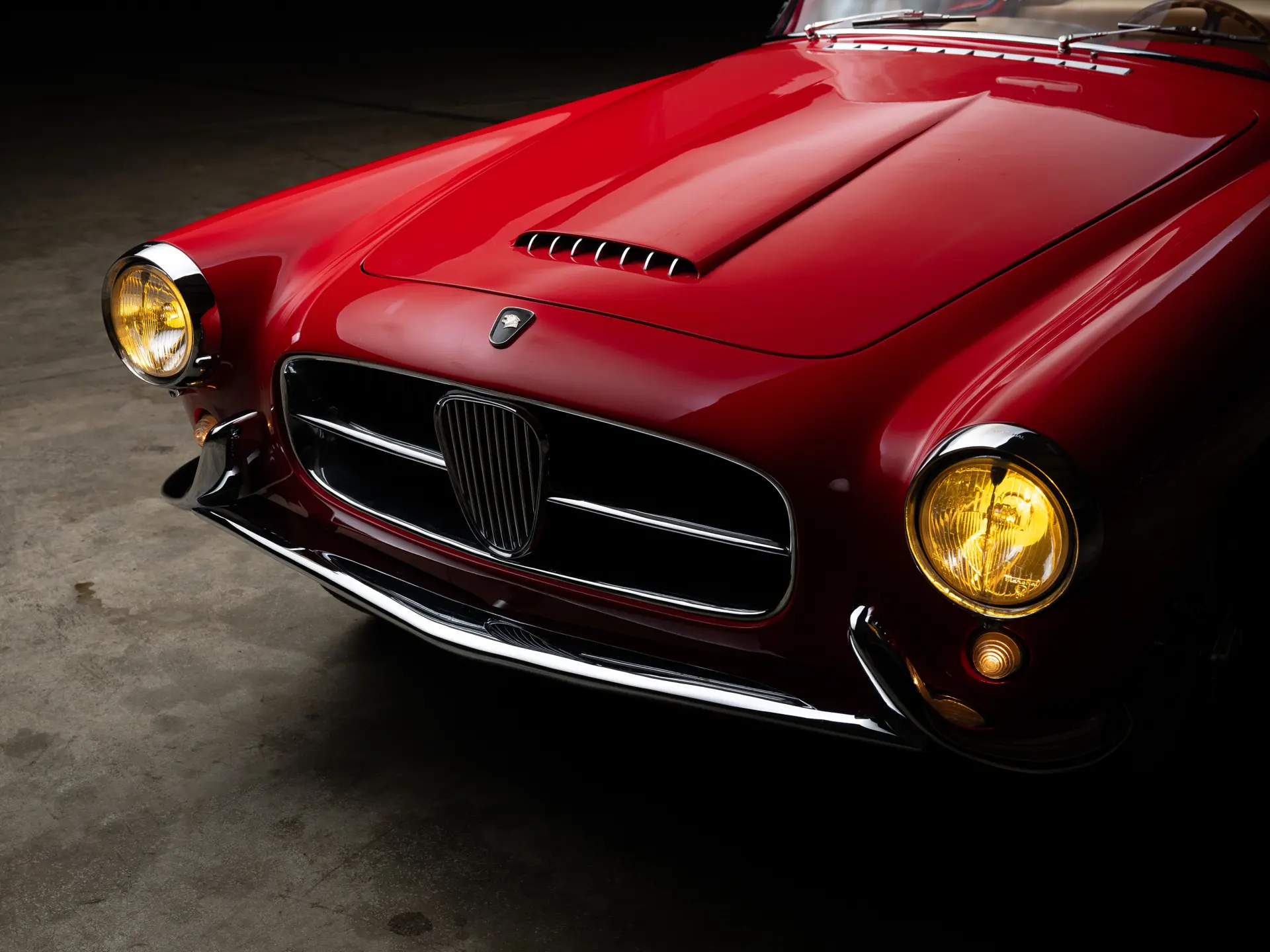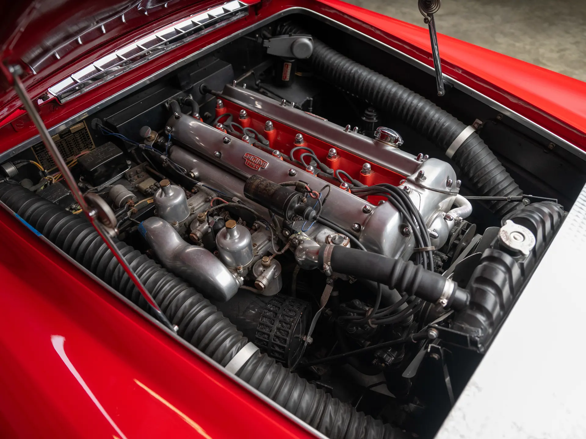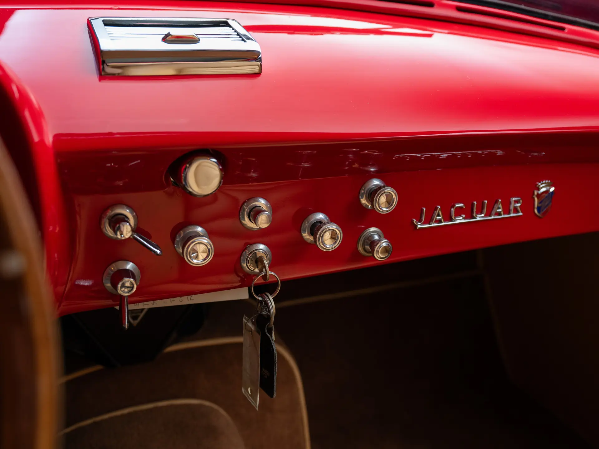 Après avoir pris le chemin du Japon au début des années 1990, S 815404 est ensuite apparue dans la prestigieuse Blackhawk Collection à Danville, en Californie. Au cours de son séjour, elle a été exposée de manière sélective et a participé au concours d’élégance de Pebble Beach en 1992 et en 1996. À cette époque, elle a été restaurée pour retrouver son apparence actuelle, rouge sur un intérieur en cuir fauve – bien qu’il ne s’agisse pas d’un intérieur corinthien, d’après les recherches effectuées – et des détails importants tels que les phares Marchal ont été conservés. Elle conserve également son moteur à double carburation SU et sa culasse, comme l’indique le certificat de traçabilité du dossier de production du Jaguar Heritage Trust qui l’accompagne (et qui confirme que le véhicule a été expédié en tant que châssis nu). À un moment donné, une prise d’air a été montée sur le capot, ce qui permet à cette voiture de s’aligner stylistiquement sur au moins l’une des autres XK 140 à carrosserie Ghia connues.