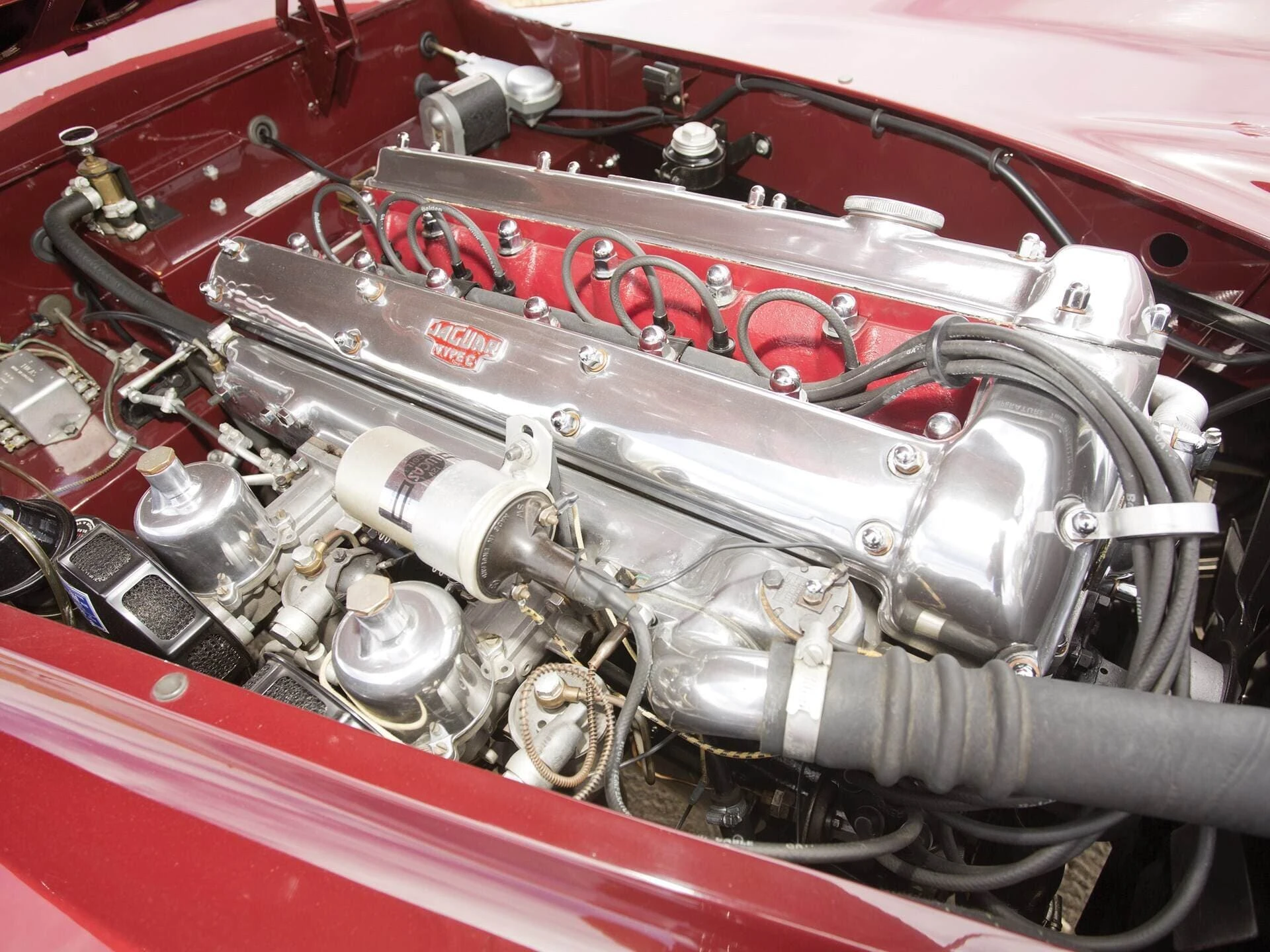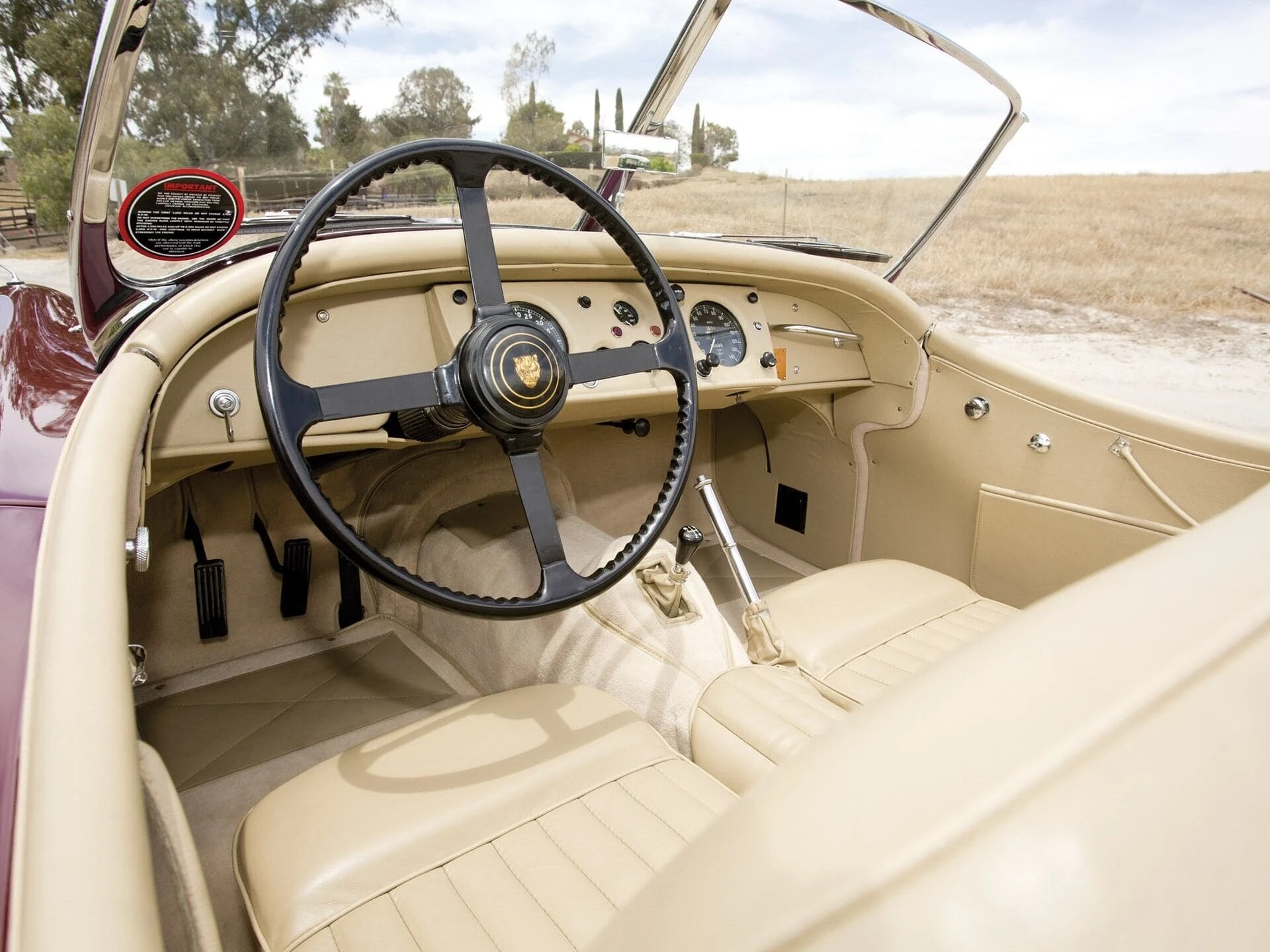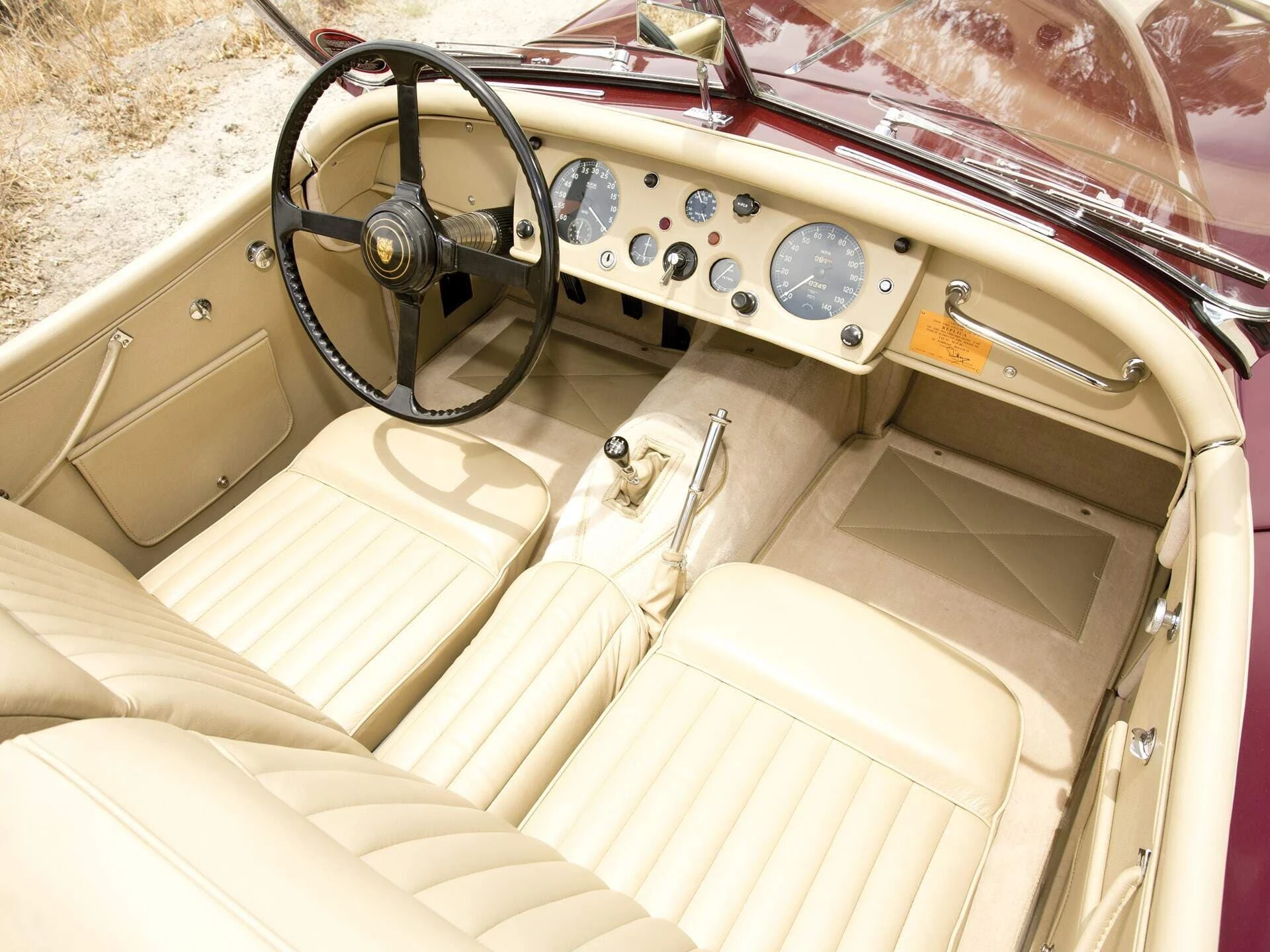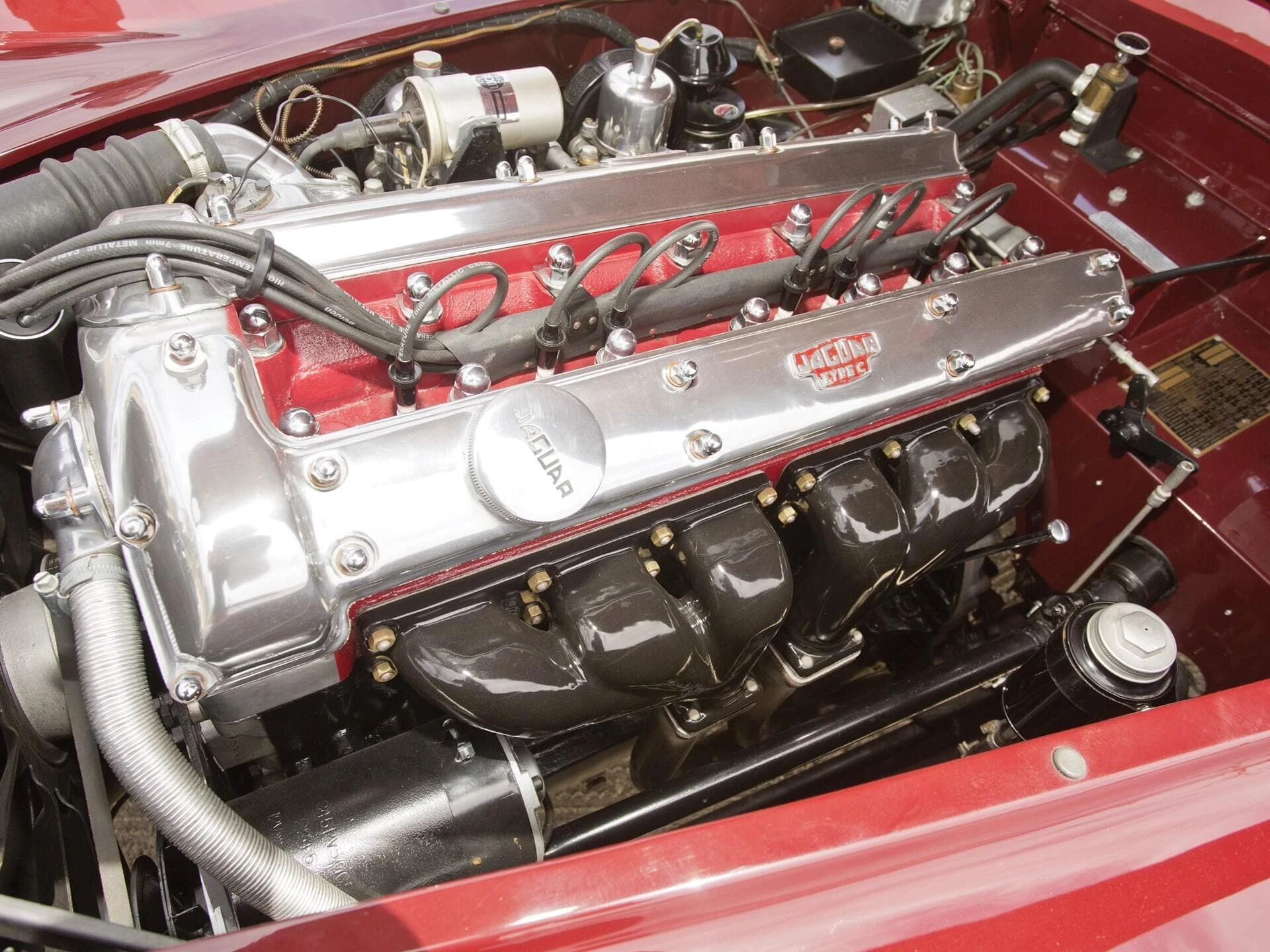 La XK140 était déjà l’une des voitures de série les plus rapides au monde lorsqu’elle a été introduite en 1954 pour succéder au modèle XK120 sortant. La version MC (« Modified with C head », également appelé spécifications SE en Europe) du XK140 était équipée de culasses dérivées de la course, de deux carburateurs SU 8 plus gros, de barres de torsion robustes et d’un système d’échappement double pour des performances considérablement améliorées et une puissance de 213 ch. Le moteur était repositionné trois pouces vers l’avant sur le châssis, offrant plus d’espace pour les passagers et de l’espace pour la batterie dans le puits d’aile avant et libérant la zone derrière les sièges pour un strapontin ou un espace de rangement supplémentaire.