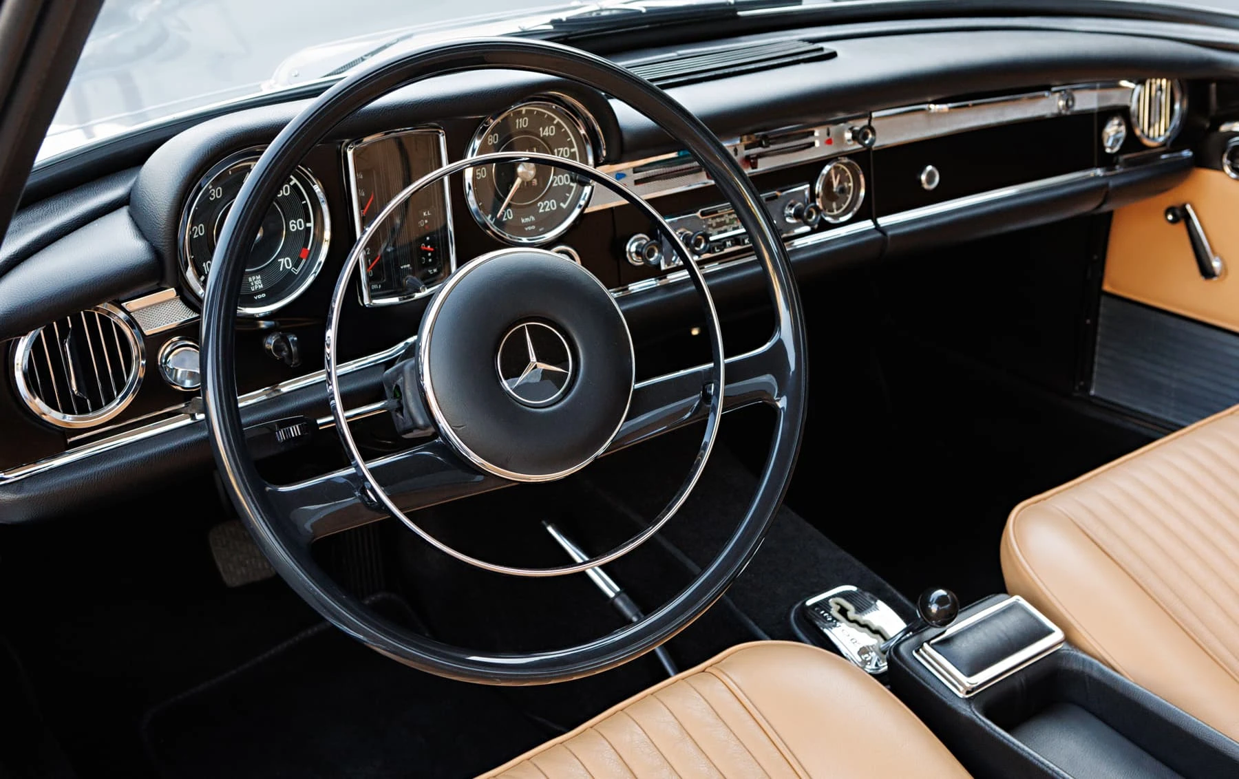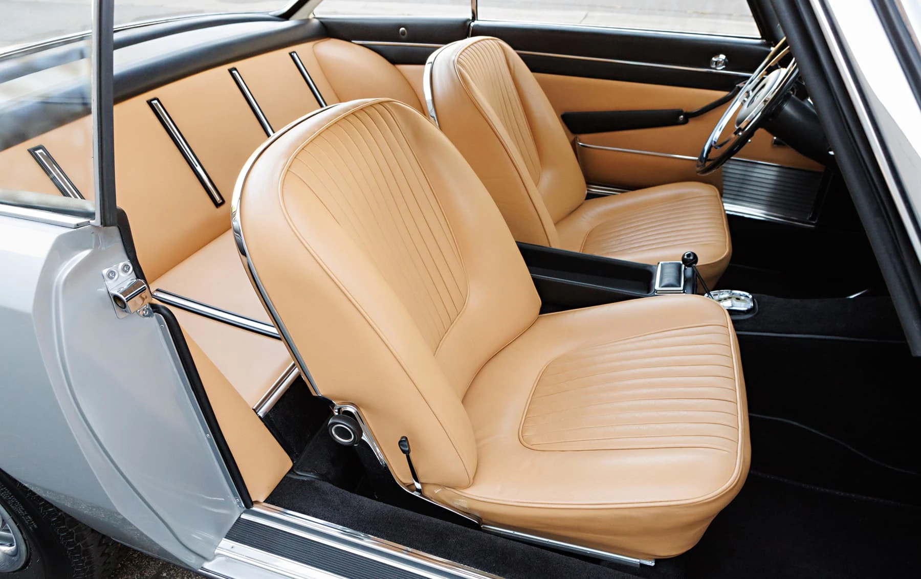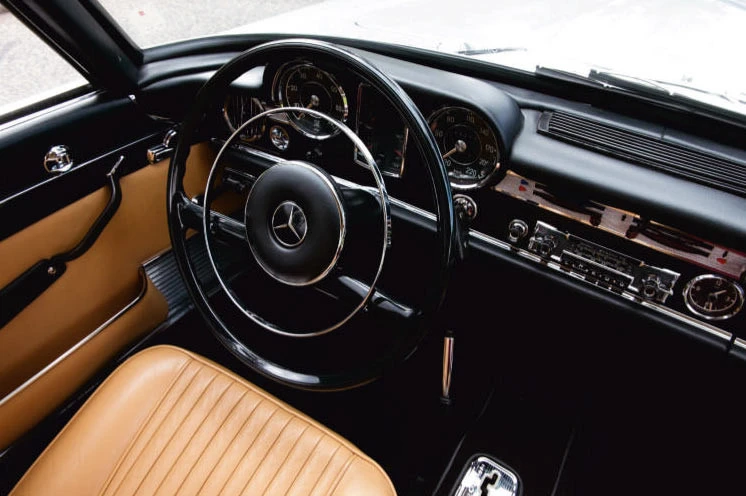 L’habitacle est peut-être la partie la plus inspirée du design, avec des montants très fins et fortement inclinés, qui redéfinissent complètement le coupé moderne et élégant . L’intérieur est en grande partie celui d’une 230 SL standard, mais les finitions sont résolument différentes. Les sièges ont un design plus sophistiqué, avec un cuir à plis étroits, et sont garnis de chrome. La garniture de pavillon est également plissée avec un matériau non perforé, de la même manière que les autres pièces uniques Pininfarina de l’époque. Les panneaux de porte modifiés comportent des plaques de seuil que l’on retrouve couramment sur les Ferrari des années 1960, et la plage arrière a été revue, ce qui permet de compléter l’espace intérieur.