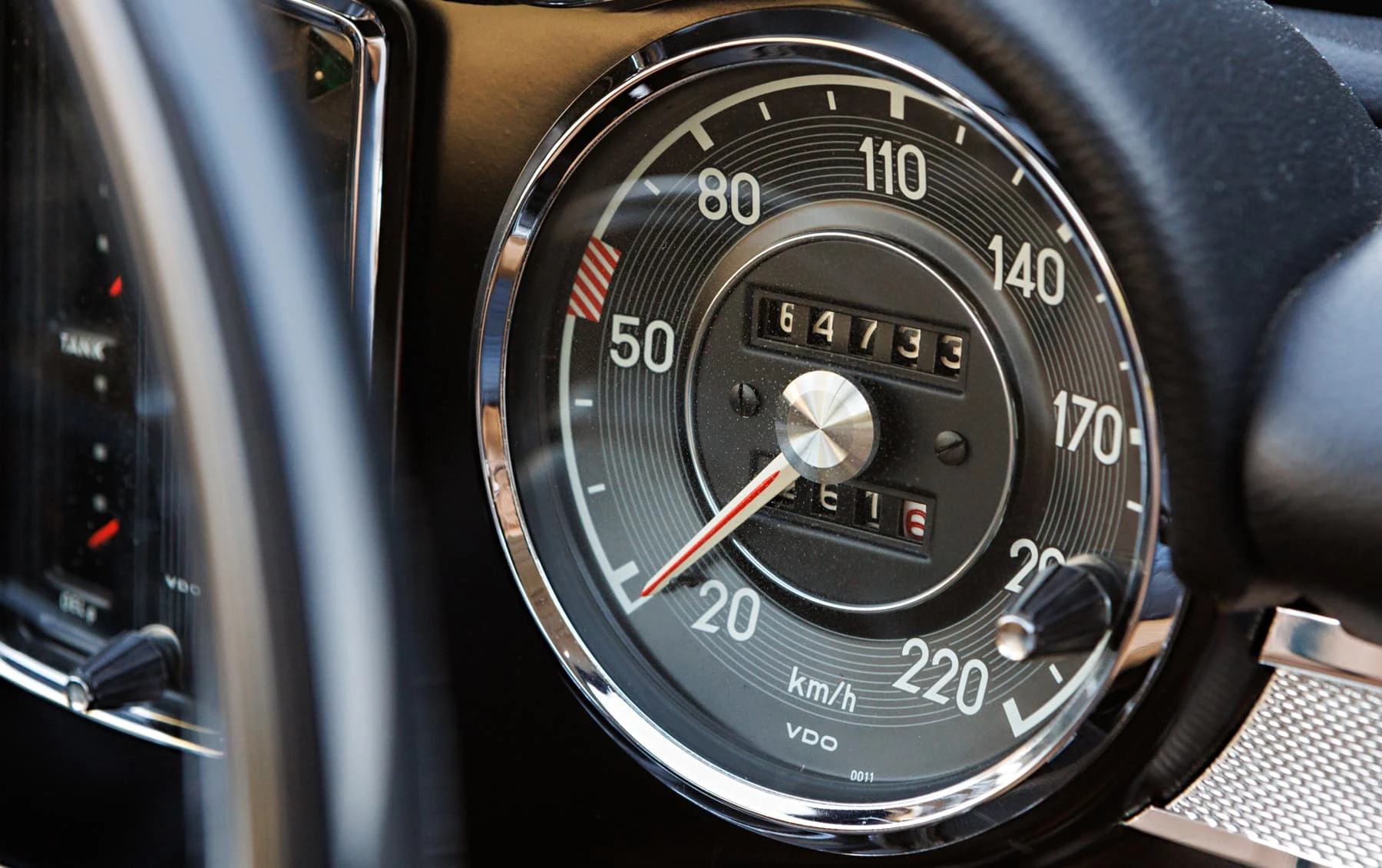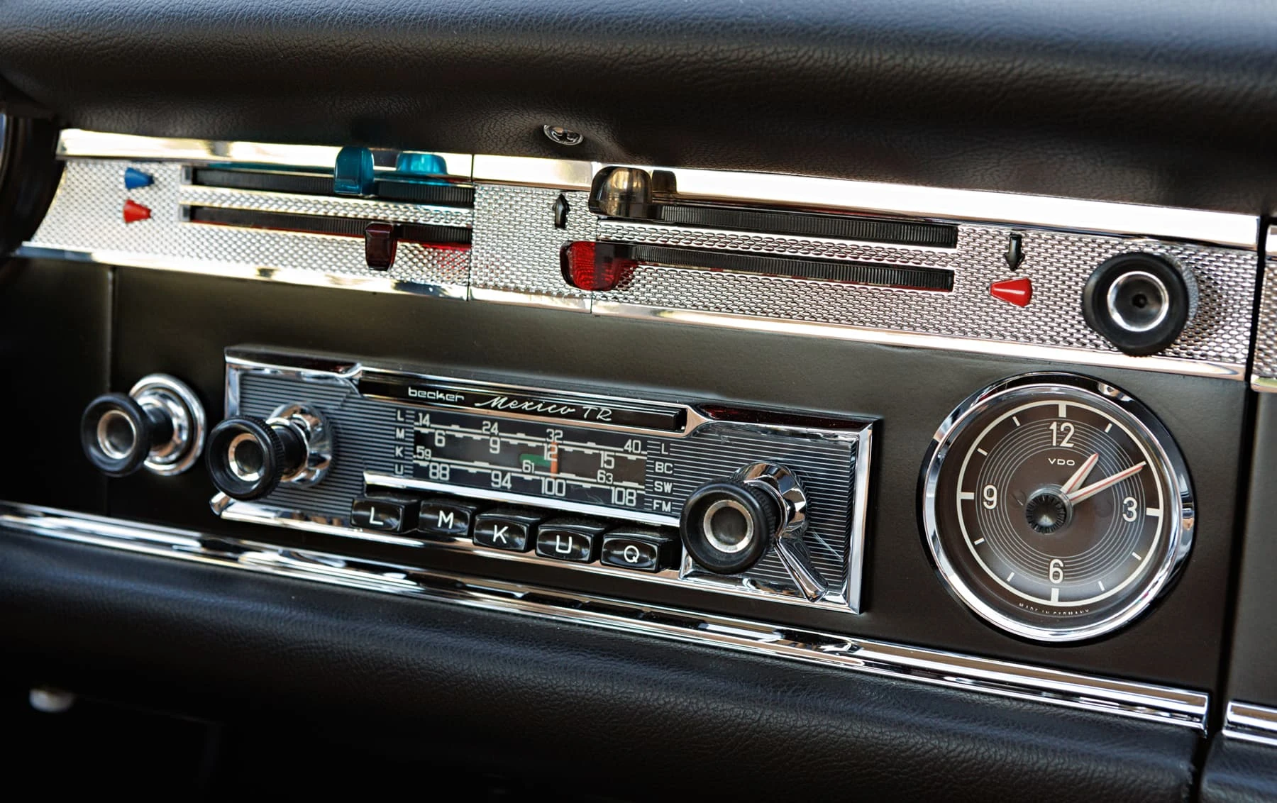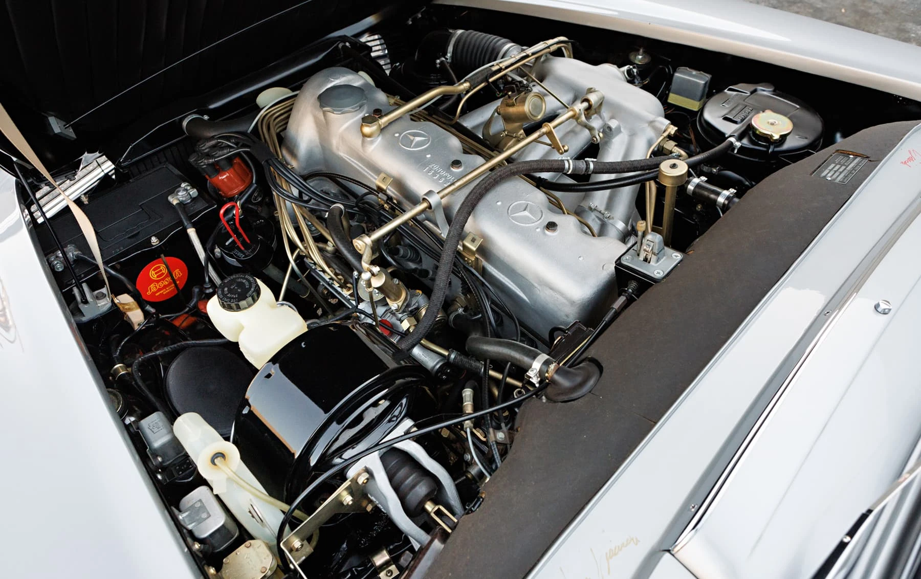 L’habitacle est peut-être la partie la plus inspirée du design, avec des montants très fins et fortement inclinés, qui redéfinissent complètement le coupé moderne et élégant . L’intérieur est en grande partie celui d’une 230 SL standard, mais les finitions sont résolument différentes. Les sièges ont un design plus sophistiqué, avec un cuir à plis étroits, et sont garnis de chrome. La garniture de pavillon est également plissée avec un matériau non perforé, de la même manière que les autres pièces uniques Pininfarina de l’époque. Les panneaux de porte modifiés comportent des plaques de seuil que l’on retrouve couramment sur les Ferrari des années 1960, et la plage arrière a été revue, ce qui permet de compléter l’espace intérieur.