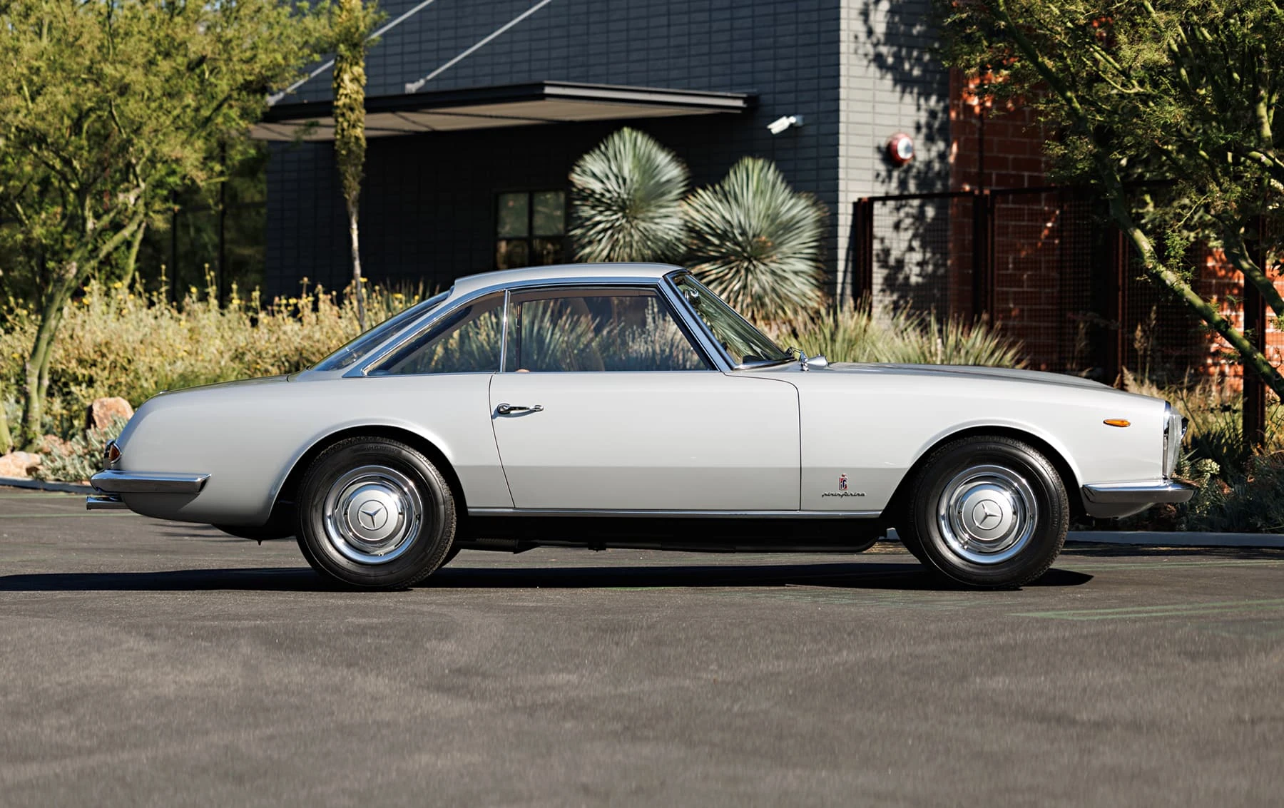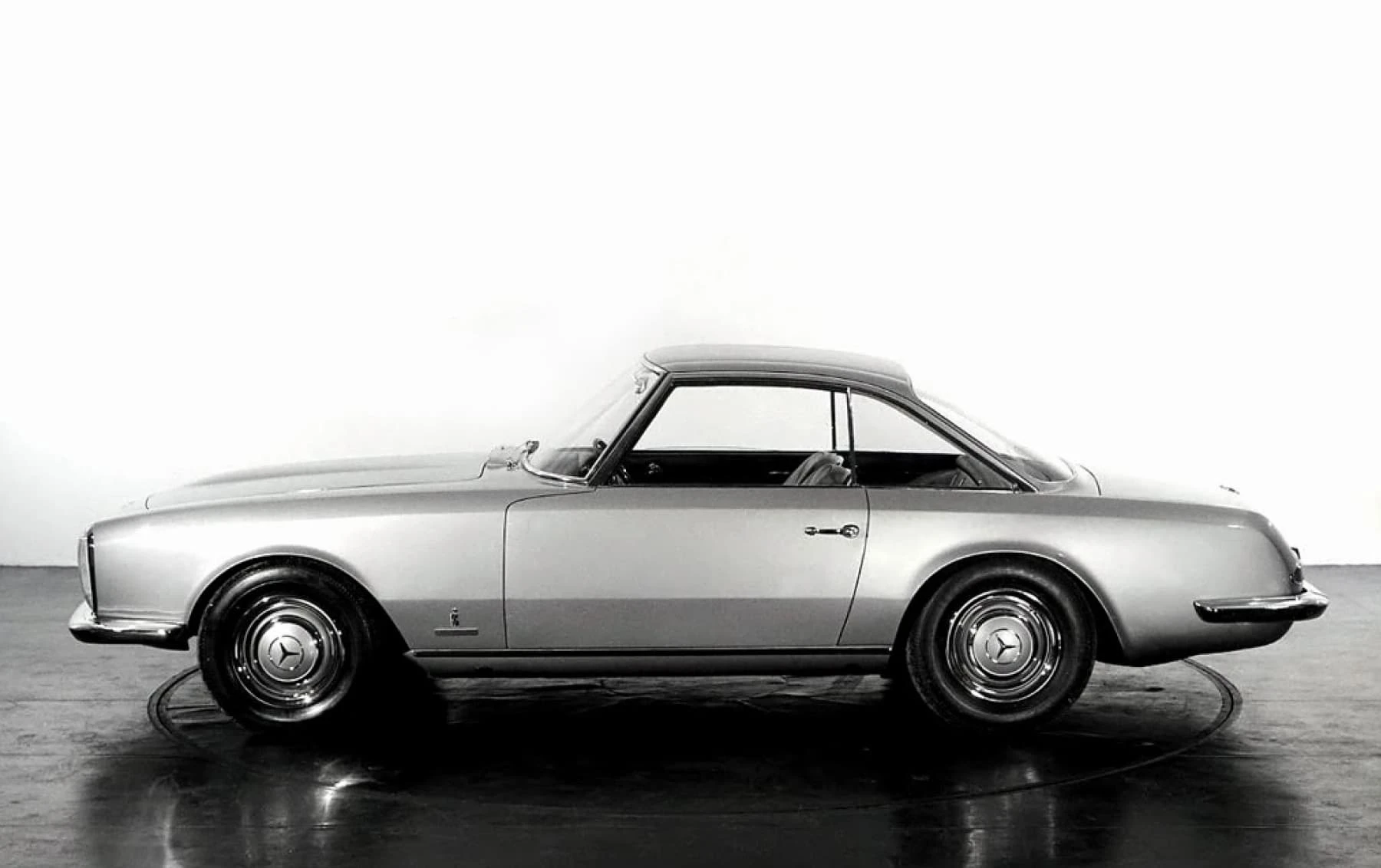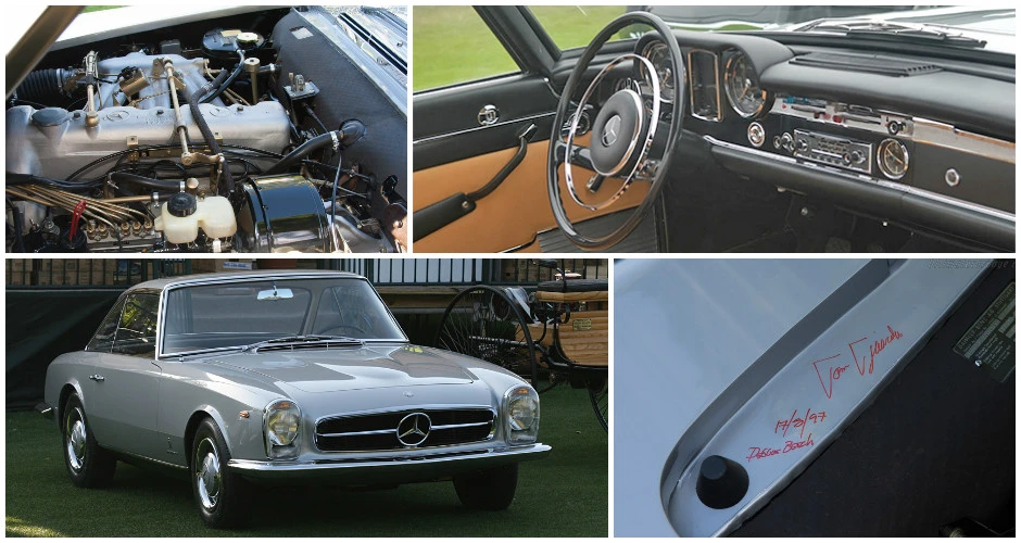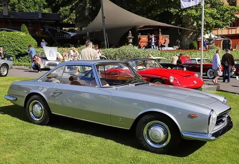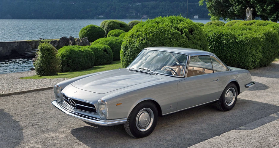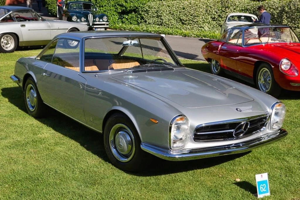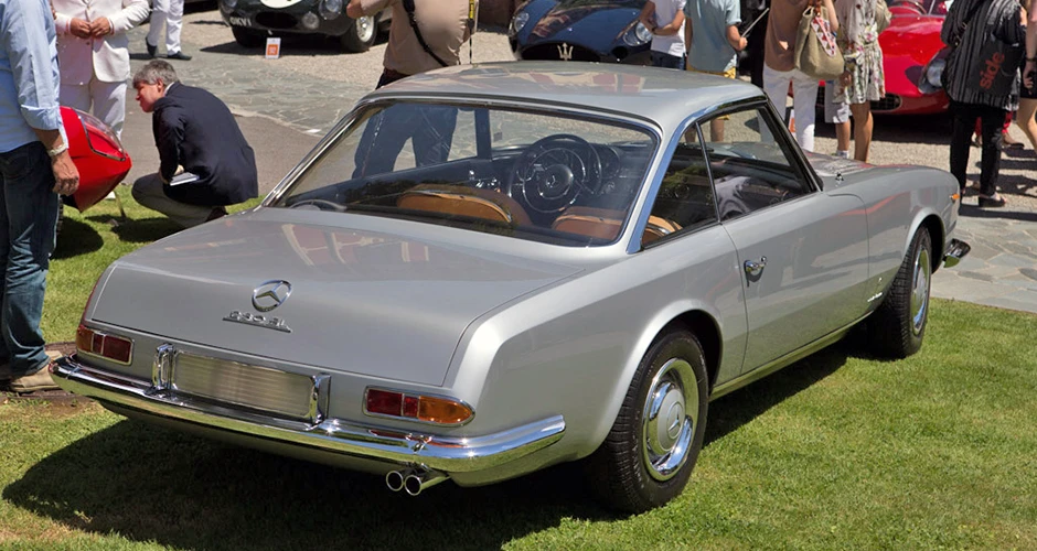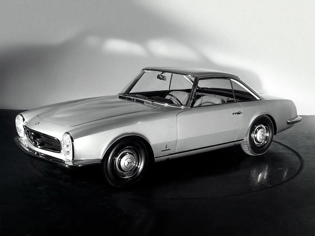 Deux mois seulement après la première mondiale de la nouvelle W113 230SL Karl Wilfert, chef du département carrosserie de l’usine de Sindelfingen, reçoit une lettre de Pininfarina lui demandant d’autoriser la création d’une nouvelle coupé basé sur le W113.. De manière quelque peu inhabituelle, Mercedes-Benz a approuvé le projet et a fourni une voiture au célèbre carrossier de Turin, en précisant que la voiture finie devait conserver l’image de marque générale de l’entreprise. En interne, Pininfaina a choisi Tom Tjaarda, 29 ans, né aux États-Unis, qui avait récemment terminé le design de la Ferrari 330 GT 2+2, pour diriger le projet. Conservant les proportions générales de la voiture de série, M. Tjaarda a magistralement réimaginé le SL comme un coupé gracieux, replaçant la calandre sur un nez allongé – avec une inclinaison plus agressive vers l’avant – entre les phares de série du marché européen. Les flancs sont biseautés au niveau de la ceinture de caisse, avec un angle plus élevé et plus prononcé au niveau des bas de caisse. Les ailes arrière et le couvercle de coffre reçoivent un traitement plus anguleux, tandis que le panneau arrière présente des feux arrière de taille réduite et un pare-chocs arrière sculpté en trois parties, commun aux véhicules de l’époque construits par Modenese.