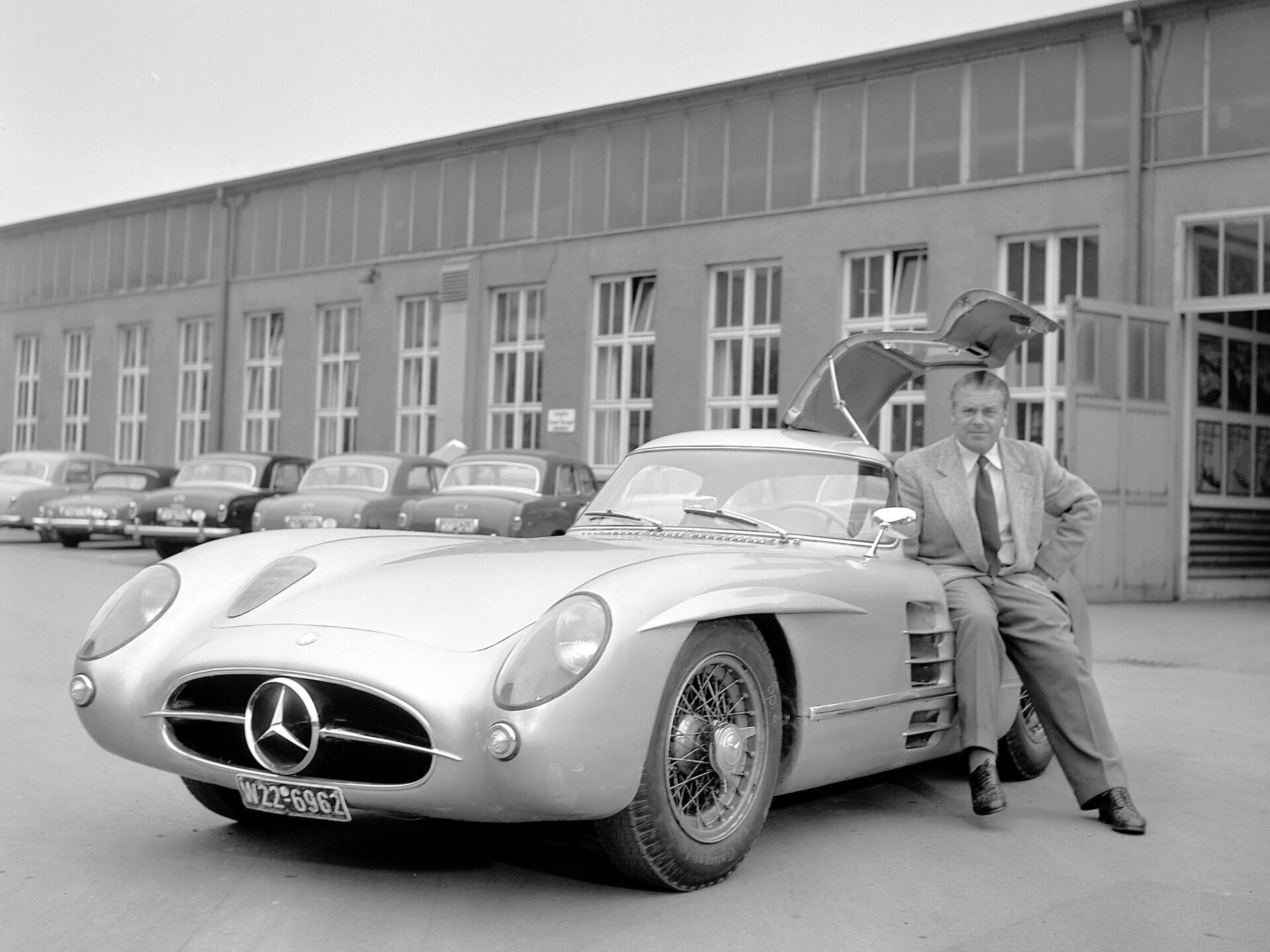 Rudolf Ulhenhaut, pilote et ingénieur pour Mercedes-Benz, avait personnellement transformé la légendaire 300 SLR de course (une barquette ouverte de 1955) en un coupé fermé à portes papillon. Il voulait à la fois imposer l’auto en endurance et la commercialiser dans une version routière, avec l’idée d’en faire la voiture la plus performante du moment.