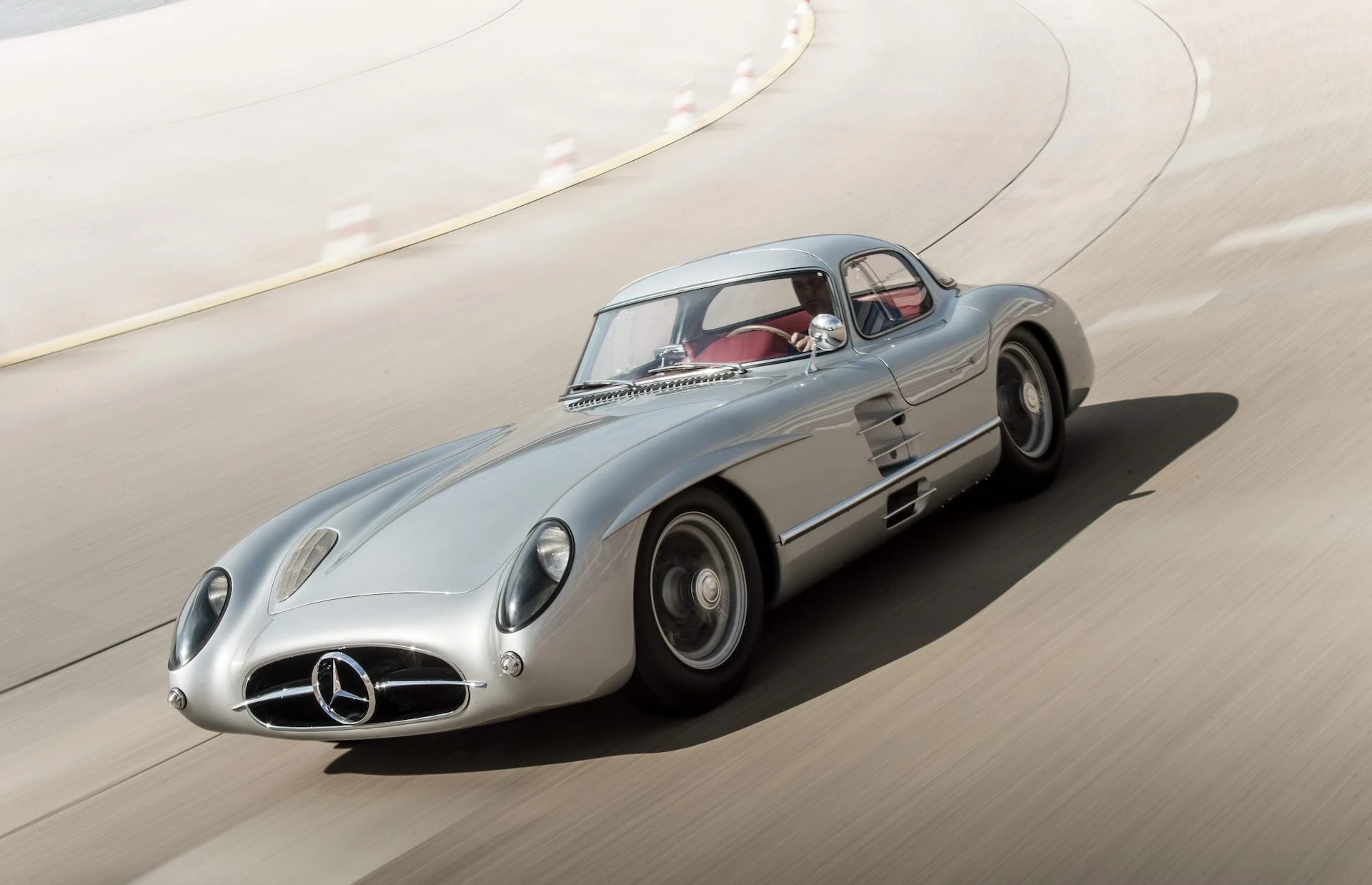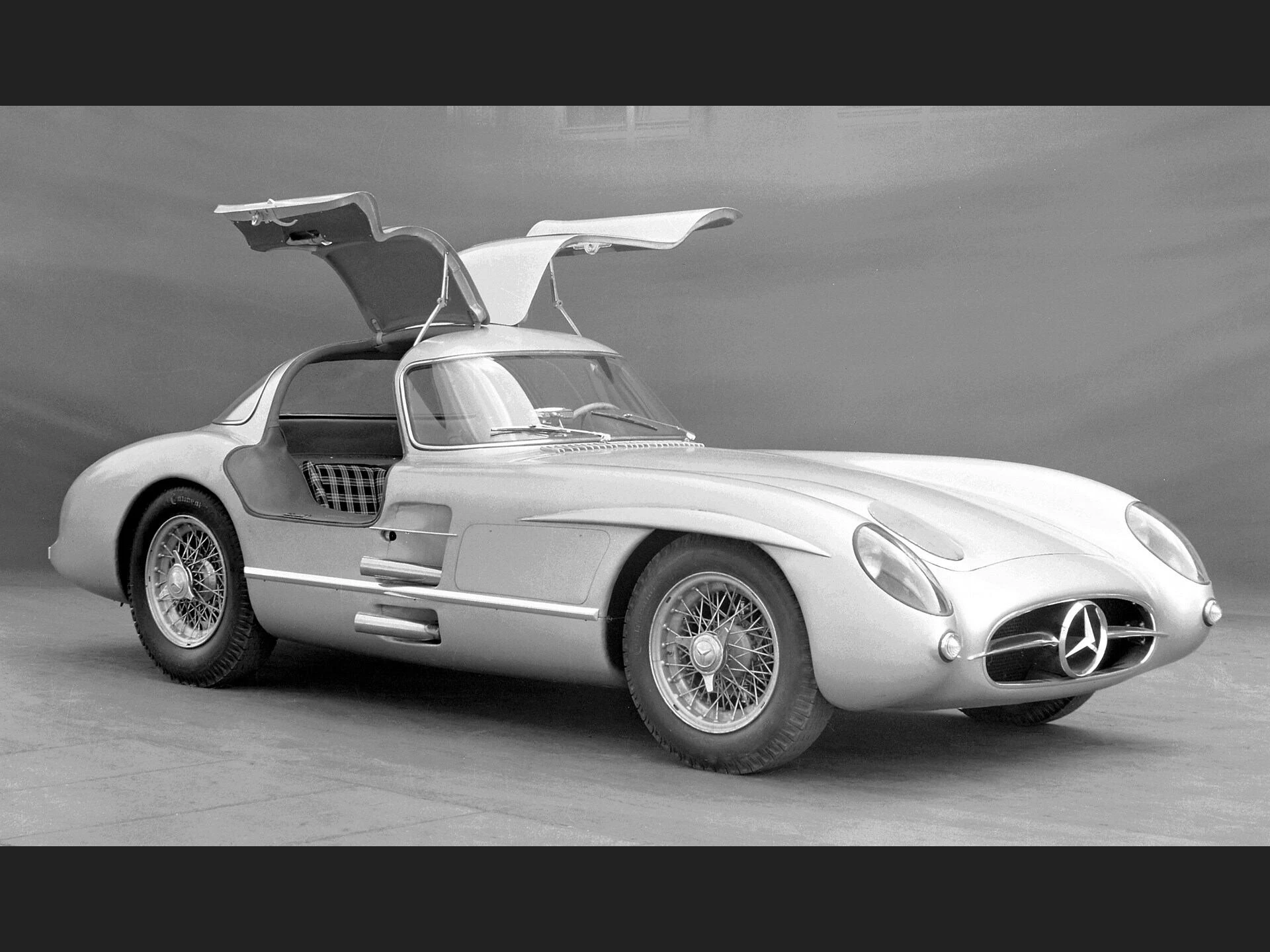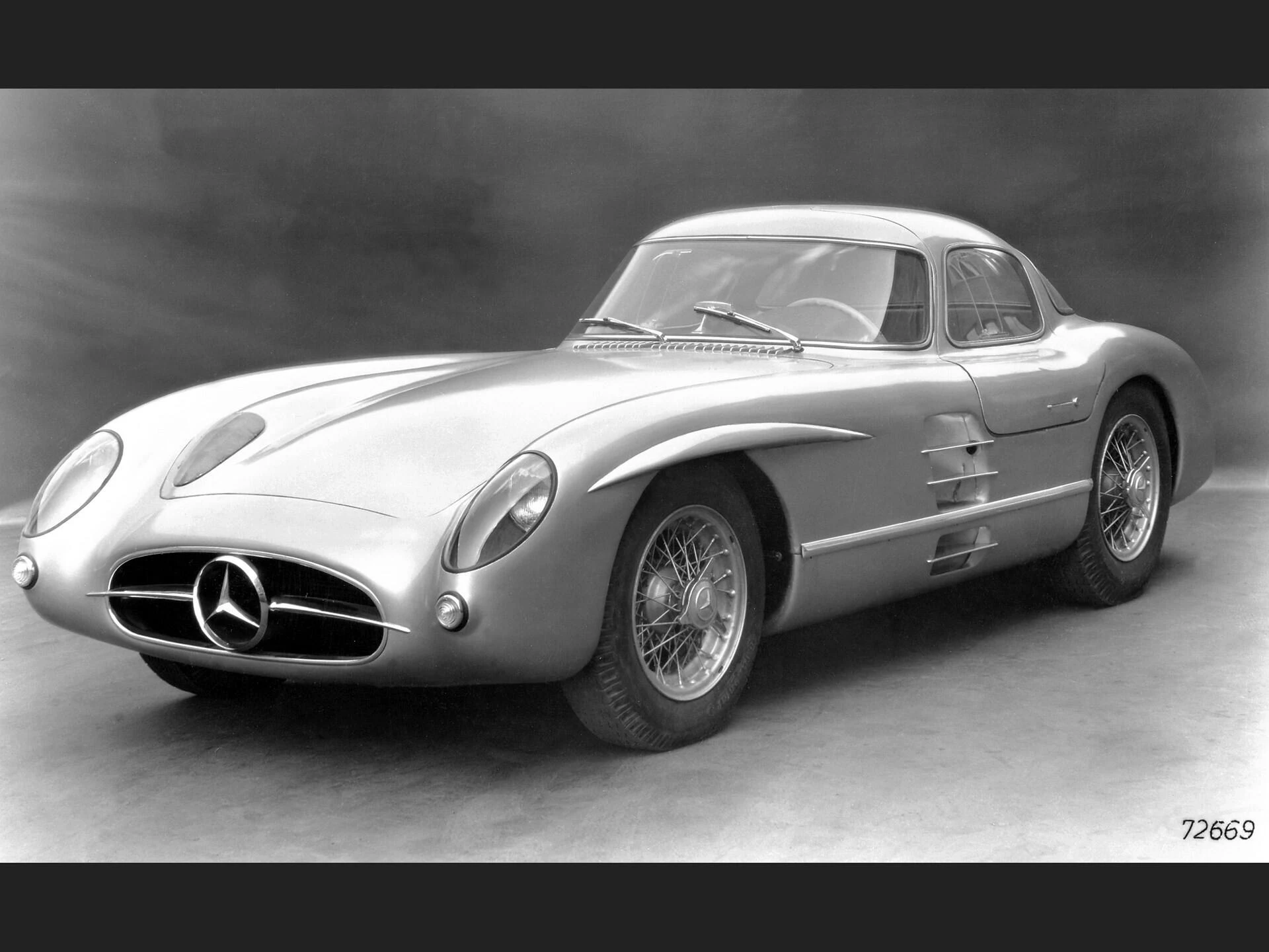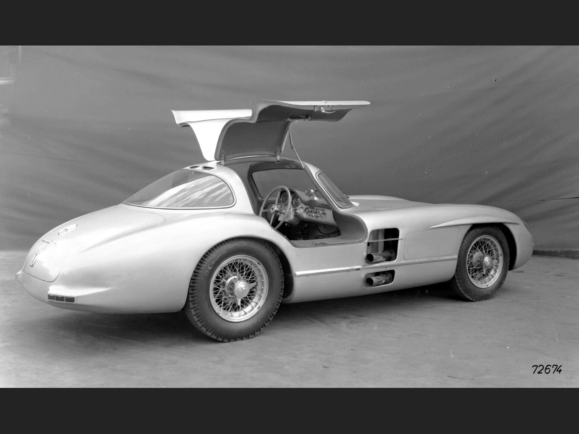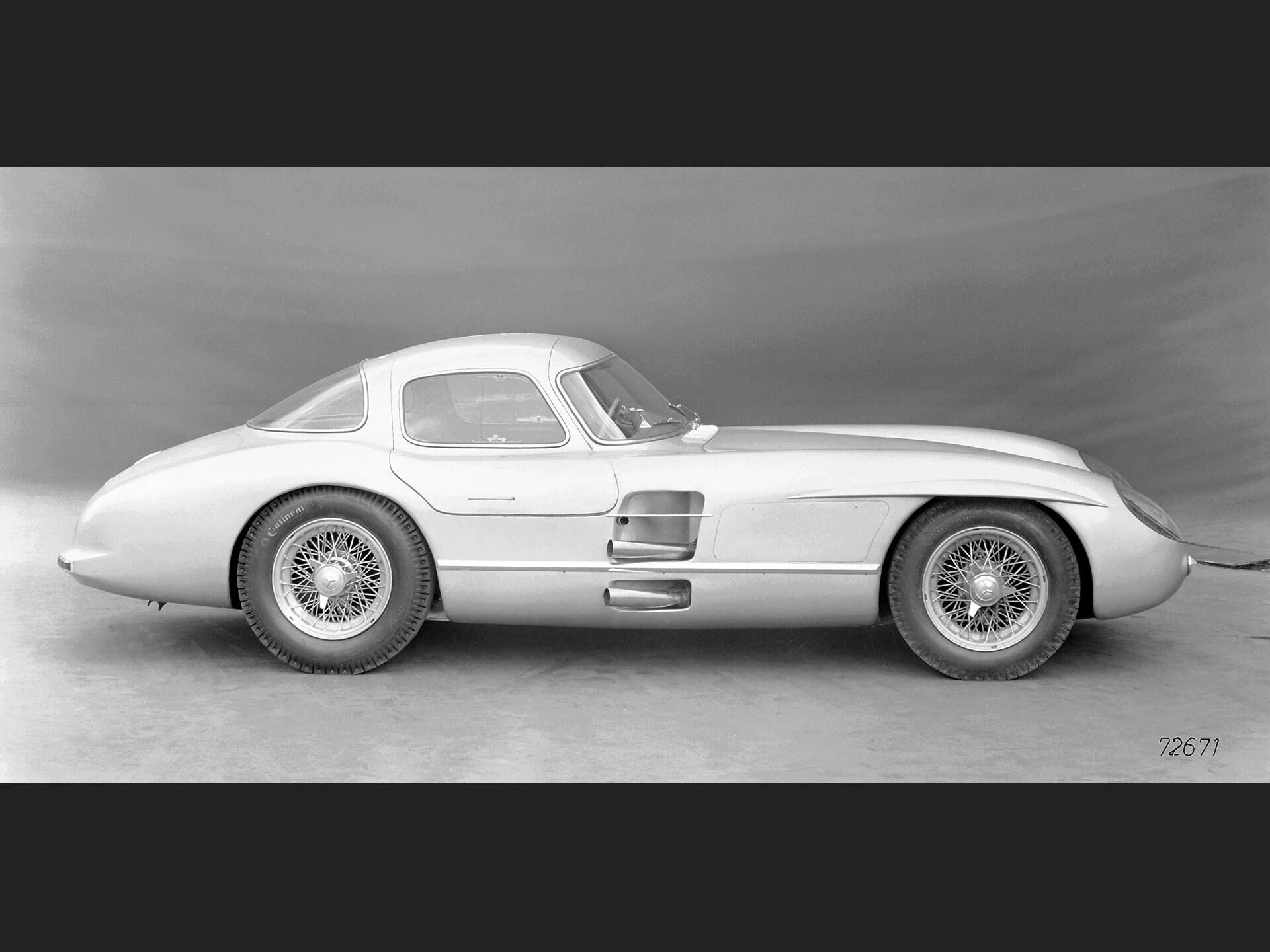 Ce coupé, habillé en tôles d’aluminium et doté du même moteur que ses sœurs, était la plus rapide des autos de route au monde à sa sortie, capable d’une vitesse de pointe de 290 km/h en 1955. Sur une structure tubulaire, l’étoile d’argent est apposée au nez devant son long compartiment moteur qui n’en finit pas de s’allonger devant son habitacle biplace, et avec ses portières qui s’ouvrent en papillon ; c’était le nec plus ultra des ateliers courses de Mercedes.