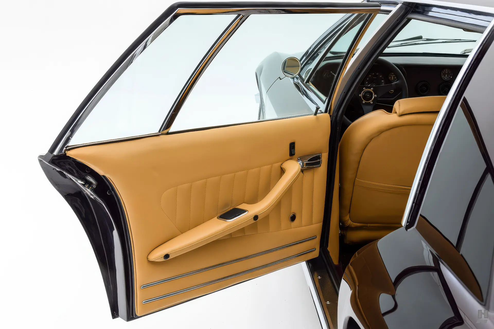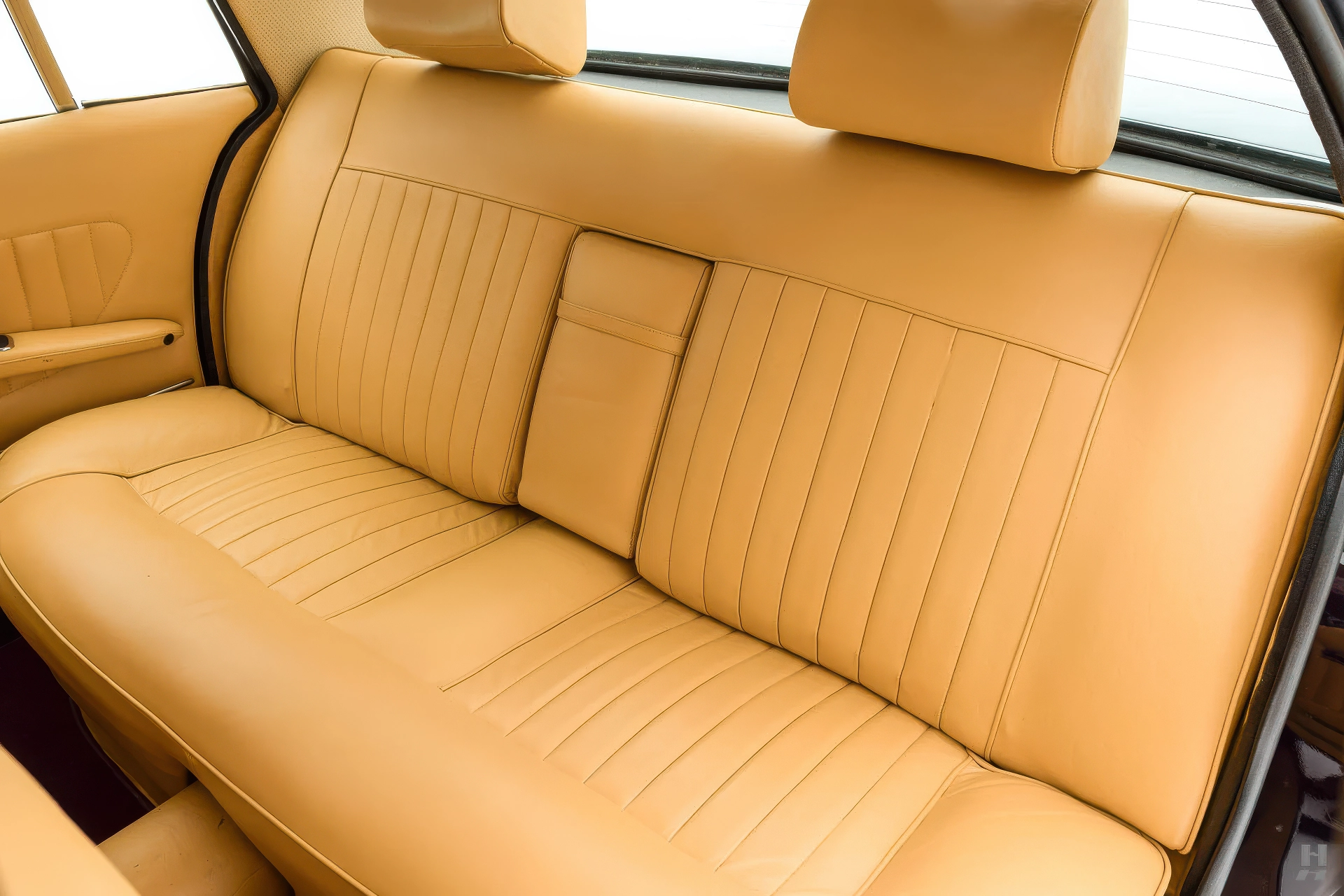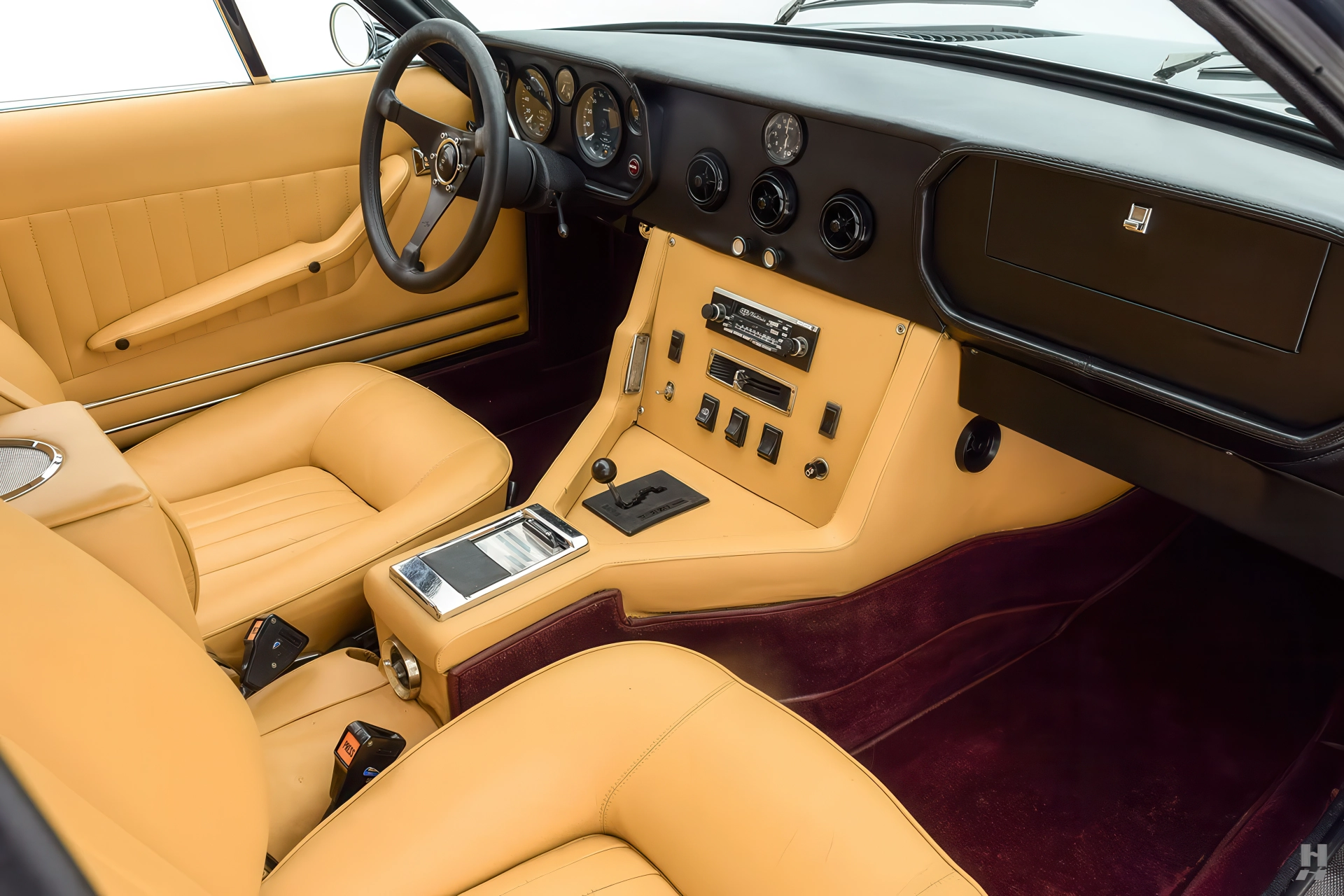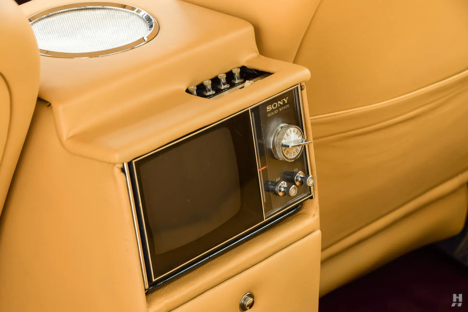 La 375/4 a été conçue comme une limousine à grande vitesse qui pouvait être conduite par un chauffeur ou par son propriétaire, donc l’habitacle est bien sûr garni du plus grand raffinement et du plus grand luxe d’époque. Les garnitures souples de cette voiture sont en grande partie d’origine, avec des éléments tels que le tableau de bord, la console et la garniture de pavillon perforée qui sont restés en très bon état d’origine. Les cuirs biscuit tan sur les sièges et les panneaux de porte sont en excellent état, tout comme les tapis aubergine qui complètent la couleur de la carrosserie. Aucune limousine ultra-luxueuse des années 1970 ne serait complète sans un téléviseur, et notre 375/4 ne déçoit pas avec son énorme téléviseur à semi-conducteurs Sony de 6 pouces monté dans une console garnie de cuir personnalisée pour les passagers arrière. La radio d’origine reste dans le tableau de bord, et les commandes de commutation et de CVC d’origine semblent toutes en bon état.