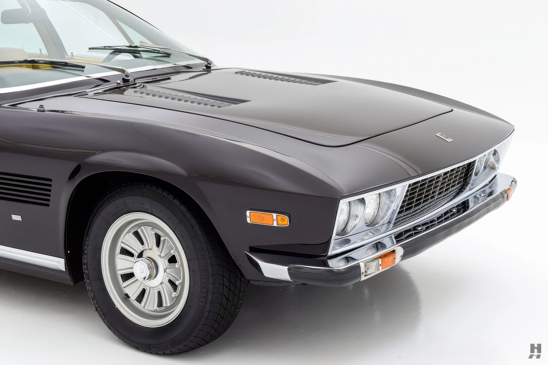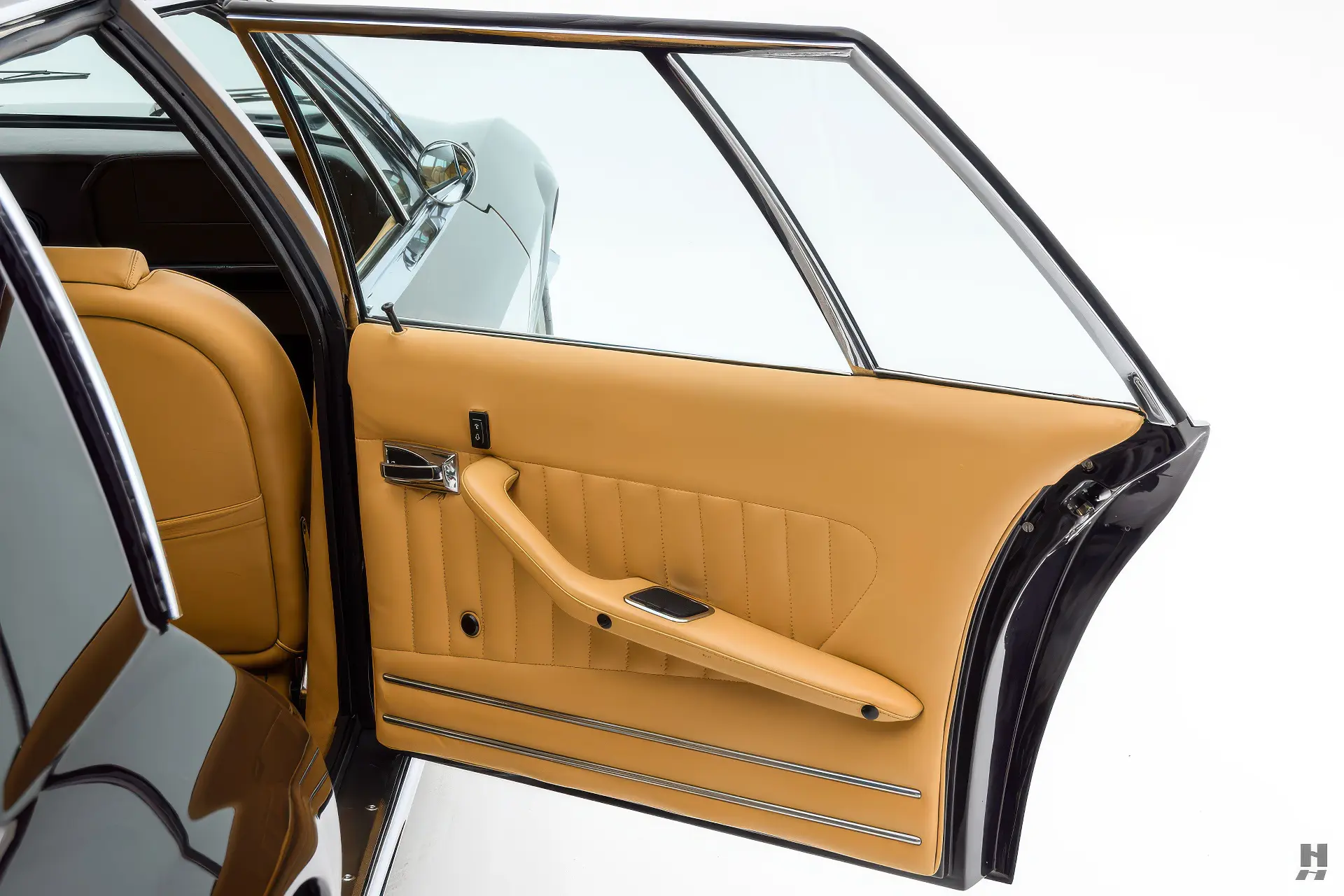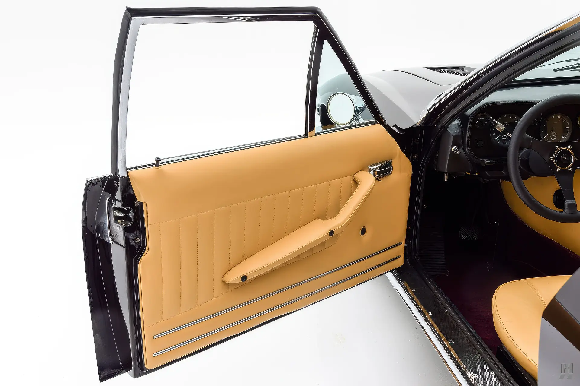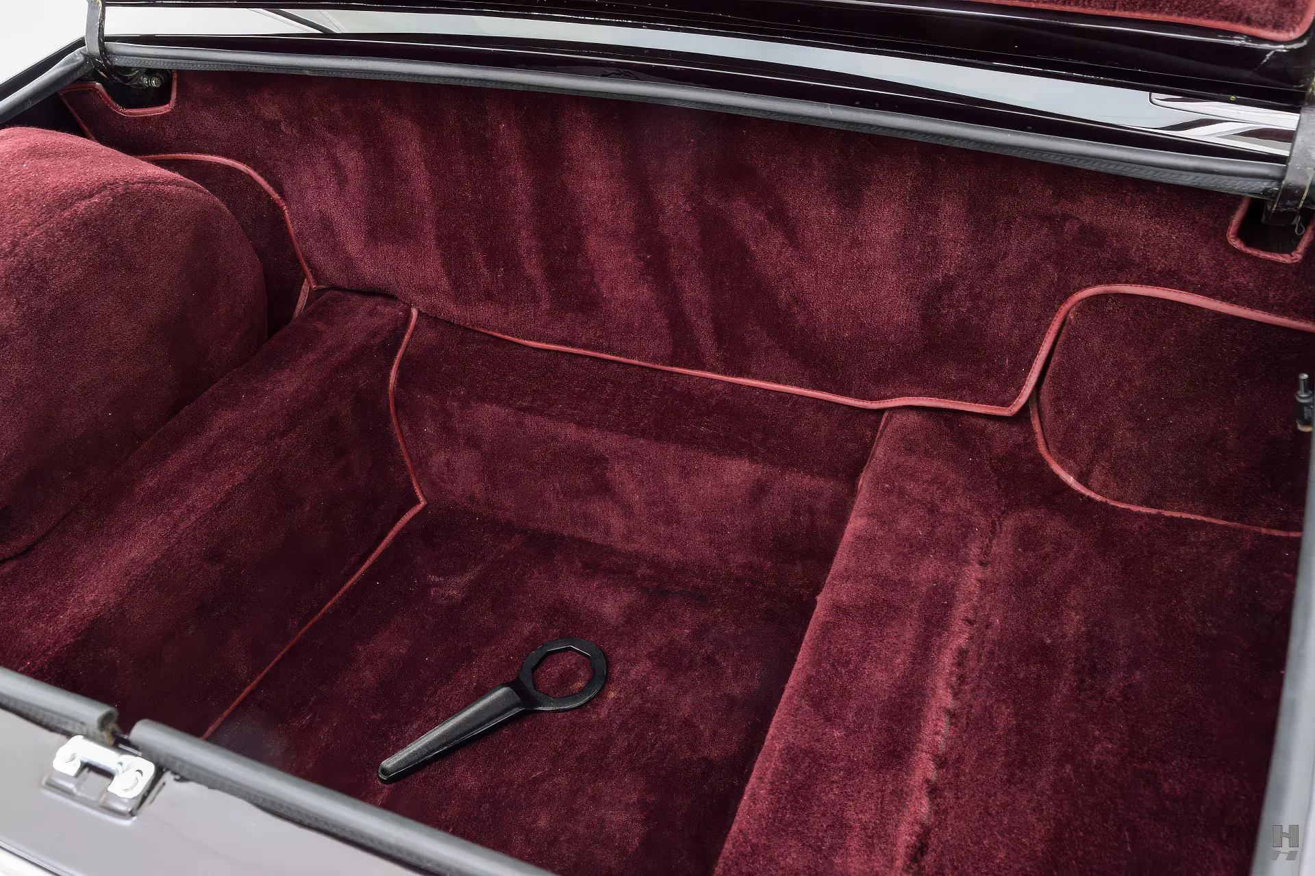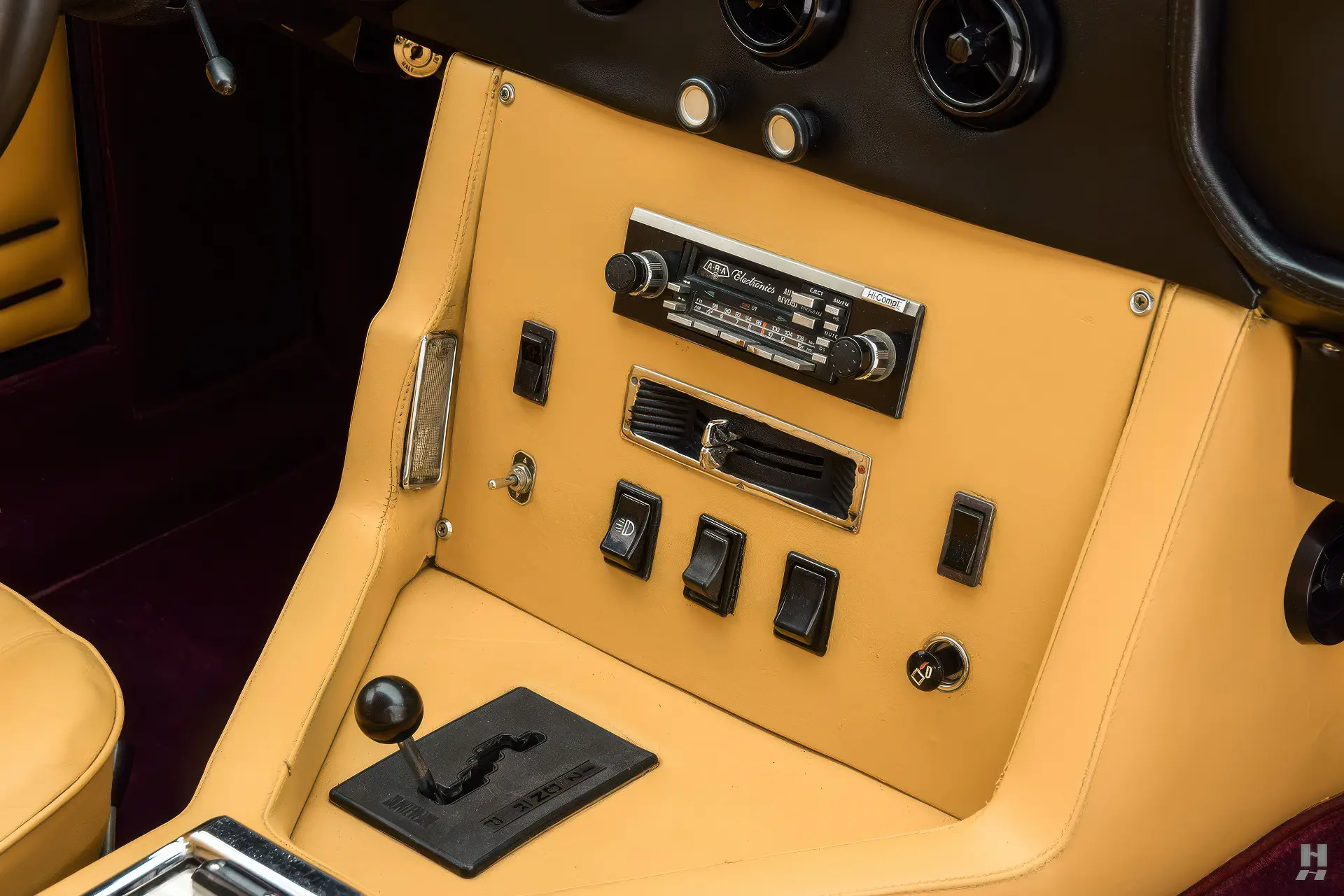 La 375/4 a été conçue comme une limousine à grande vitesse qui pouvait être conduite par un chauffeur ou par son propriétaire, donc l’habitacle est bien sûr garni du plus grand raffinement et du plus grand luxe d’époque. Les garnitures souples de cette voiture sont en grande partie d’origine, avec des éléments tels que le tableau de bord, la console et la garniture de pavillon perforée qui sont restés en très bon état d’origine. Les cuirs biscuit tan sur les sièges et les panneaux de porte sont en excellent état, tout comme les tapis aubergine qui complètent la couleur de la carrosserie. Aucune limousine ultra-luxueuse des années 1970 ne serait complète sans un téléviseur, et notre 375/4 ne déçoit pas avec son énorme téléviseur à semi-conducteurs Sony de 6 pouces monté dans une console garnie de cuir personnalisée pour les passagers arrière. La radio d’origine reste dans le tableau de bord, et les commandes de commutation et de CVC d’origine semblent toutes en bon état.