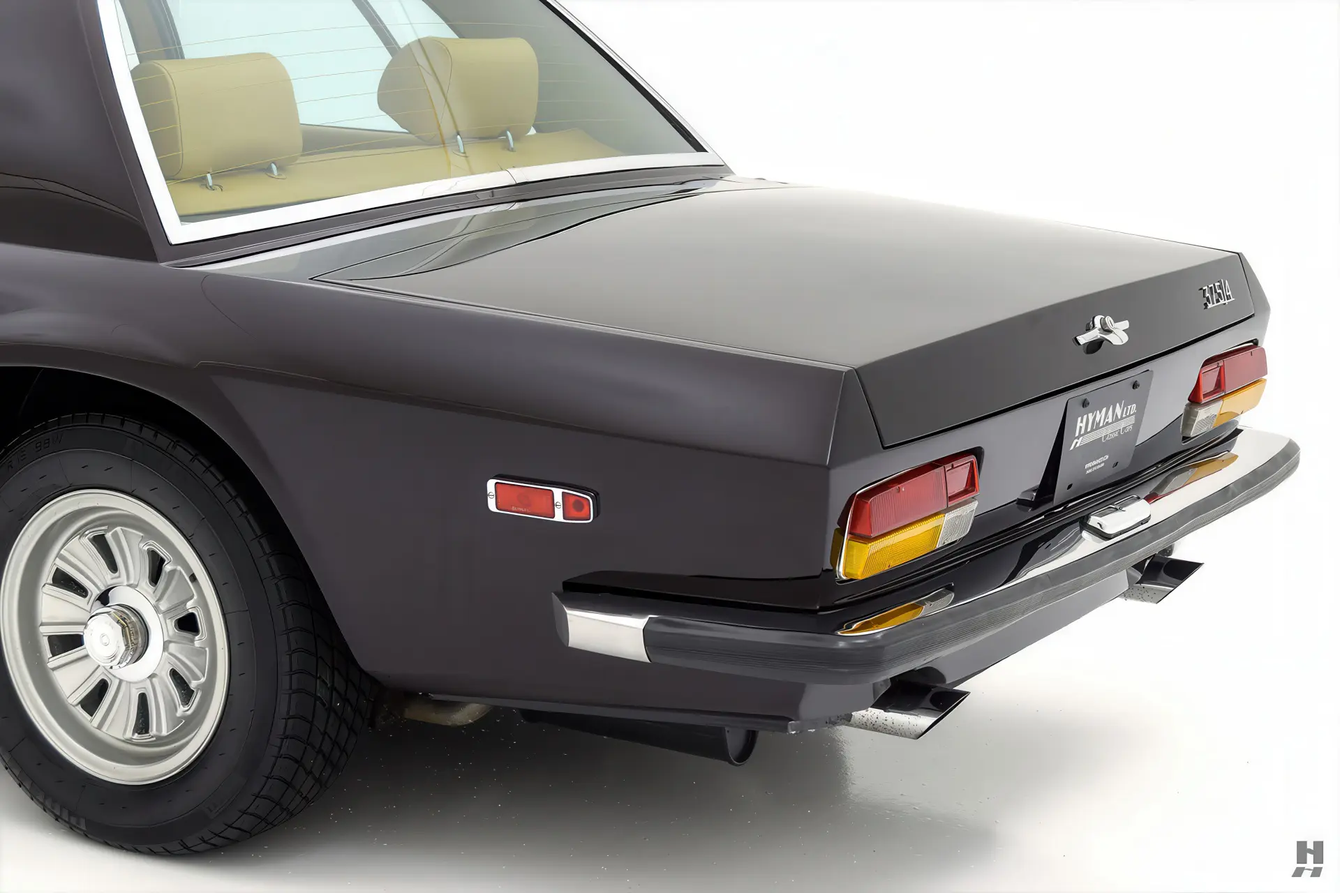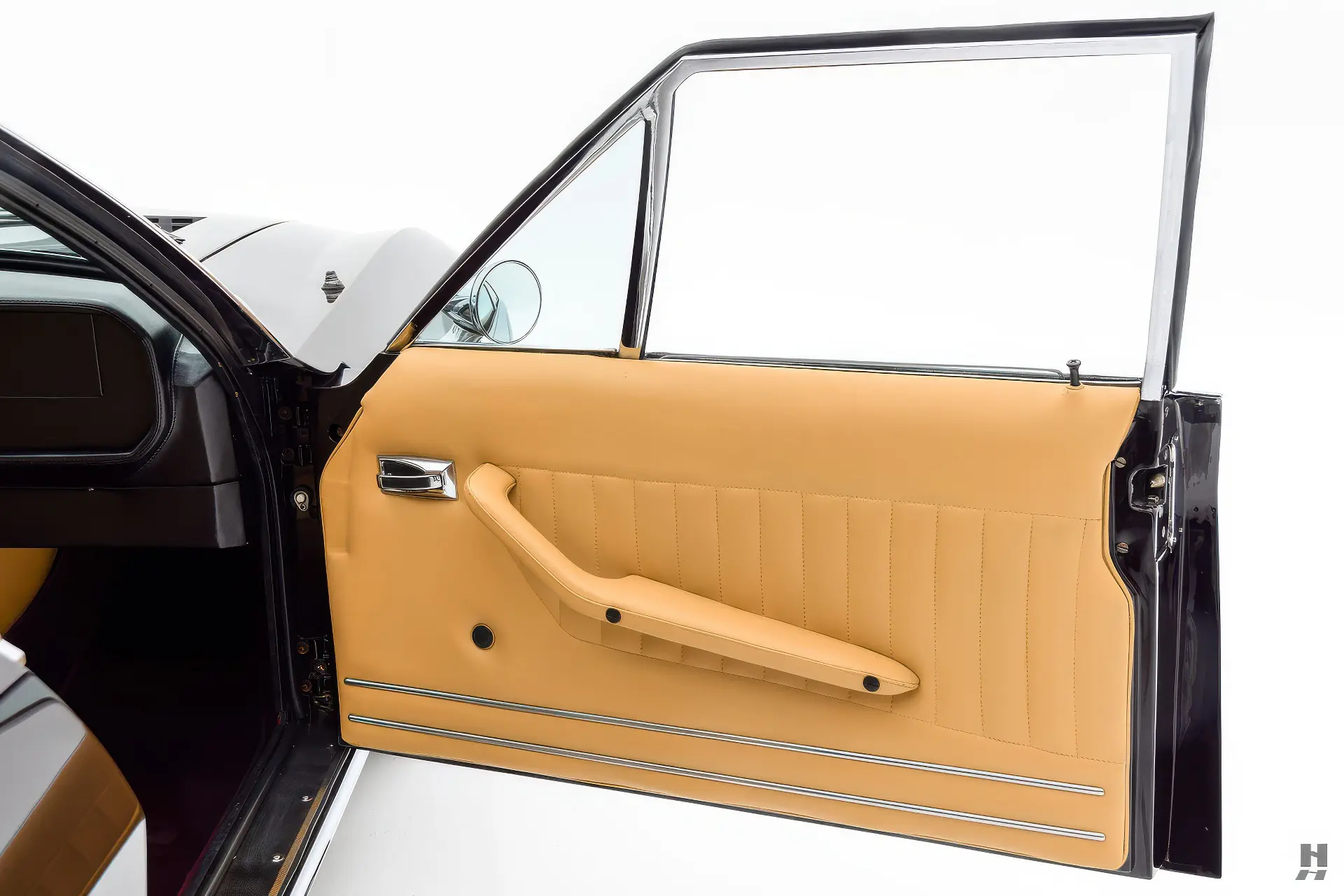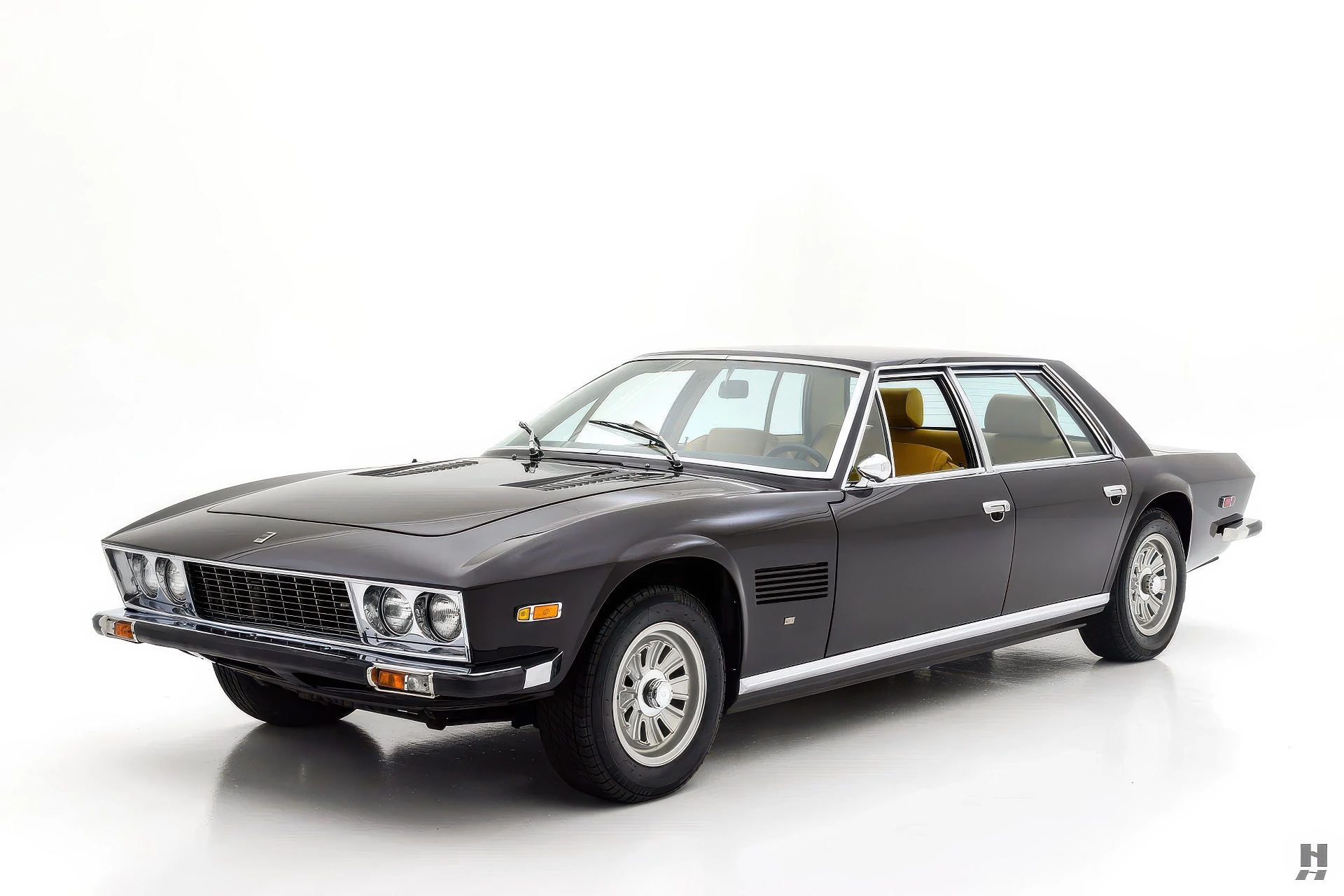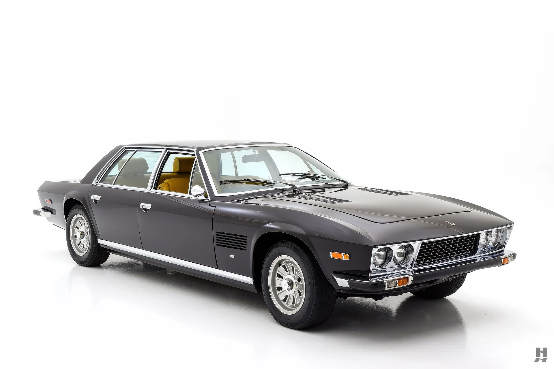 La 375/4 a été conçue comme une limousine à grande vitesse qui pouvait être conduite par un chauffeur ou par son propriétaire, donc l’habitacle est bien sûr garni du plus grand raffinement et du plus grand luxe d’époque. Les garnitures souples de cette voiture sont en grande partie d’origine, avec des éléments tels que le tableau de bord, la console et la garniture de pavillon perforée qui sont restés en très bon état d’origine. Les cuirs biscuit tan sur les sièges et les panneaux de porte sont en excellent état, tout comme les tapis aubergine qui complètent la couleur de la carrosserie. Aucune limousine ultra-luxueuse des années 1970 ne serait complète sans un téléviseur, et notre 375/4 ne déçoit pas avec son énorme téléviseur à semi-conducteurs Sony de 6 pouces monté dans une console garnie de cuir personnalisée pour les passagers arrière. La radio d’origine reste dans le tableau de bord, et les commandes de commutation et de CVC d’origine semblent toutes en bon état.