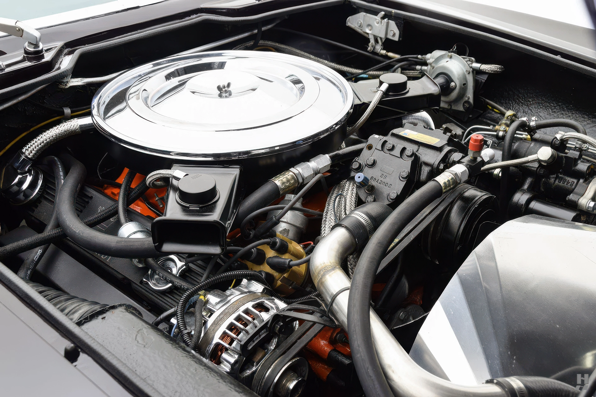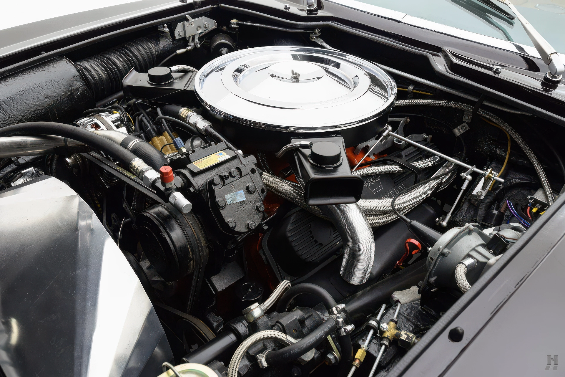 Le puissant V8 de 440 ci (7,2 Litres) de Chrysler est couplé à une transmission automatique Torque-Flite et est livré avec tous les éléments nécessaires à une limousine haute performance, tels que la direction assistée, la climatisation et le régulateur de vitesse. Comme pour l’intérieur, la présentation sous le capot est très originale et bien détaillée. Les très rares couvercles de soupapes à ailettes de marque Monteverdi sont toujours en place, et le moteur est bien détaillé et très soigné. Le châssis et le train de roulement montrent une certaine utilisation, semblant être en grande partie non restaurés mais toujours assez propres et en bon état. Dans l’ensemble, la 375/4 fonctionne bien et se comporte admirablement sur la route, avec seulement quelques ajustements mineurs nécessaires pour la rendre capable de traverser le continent.