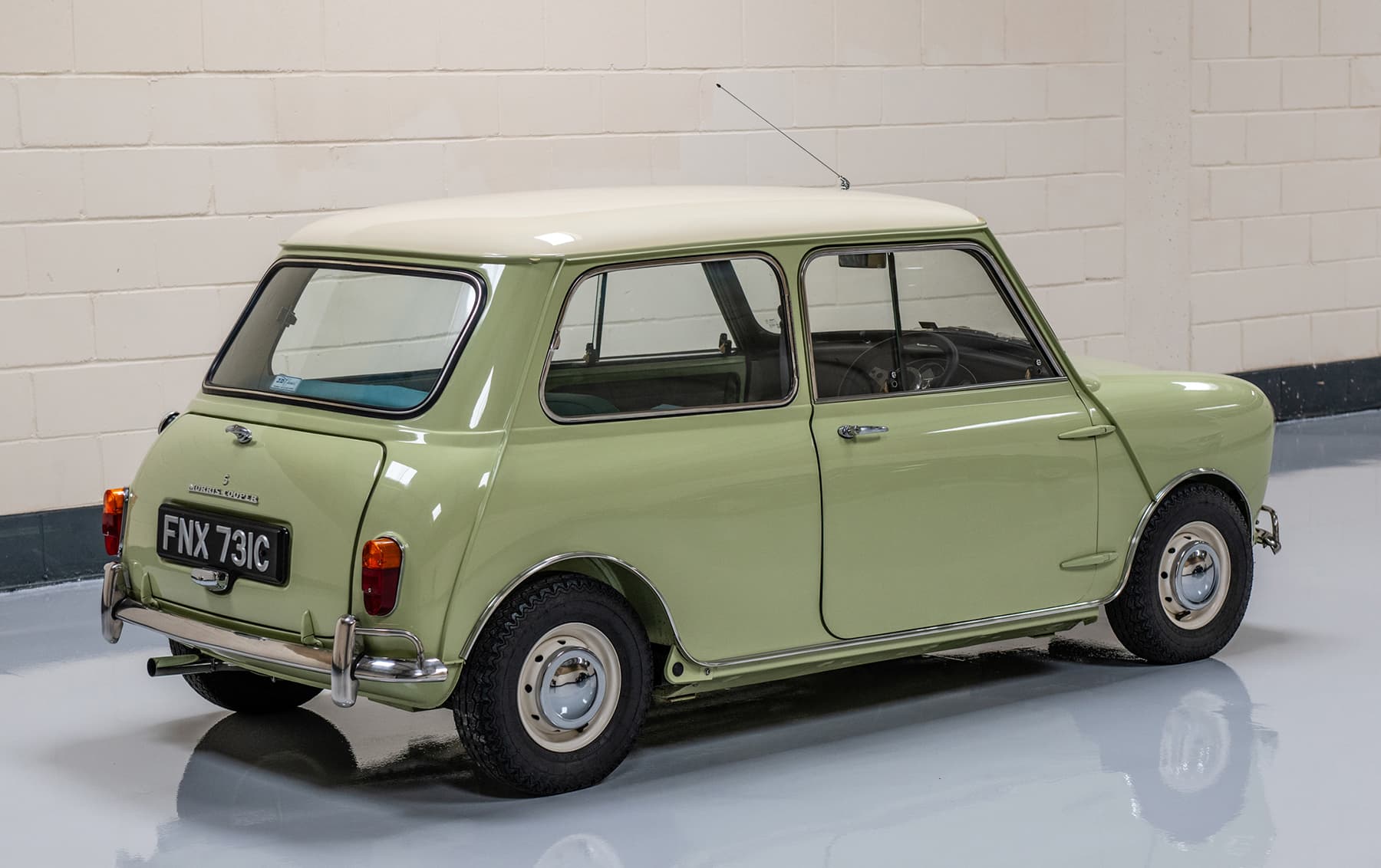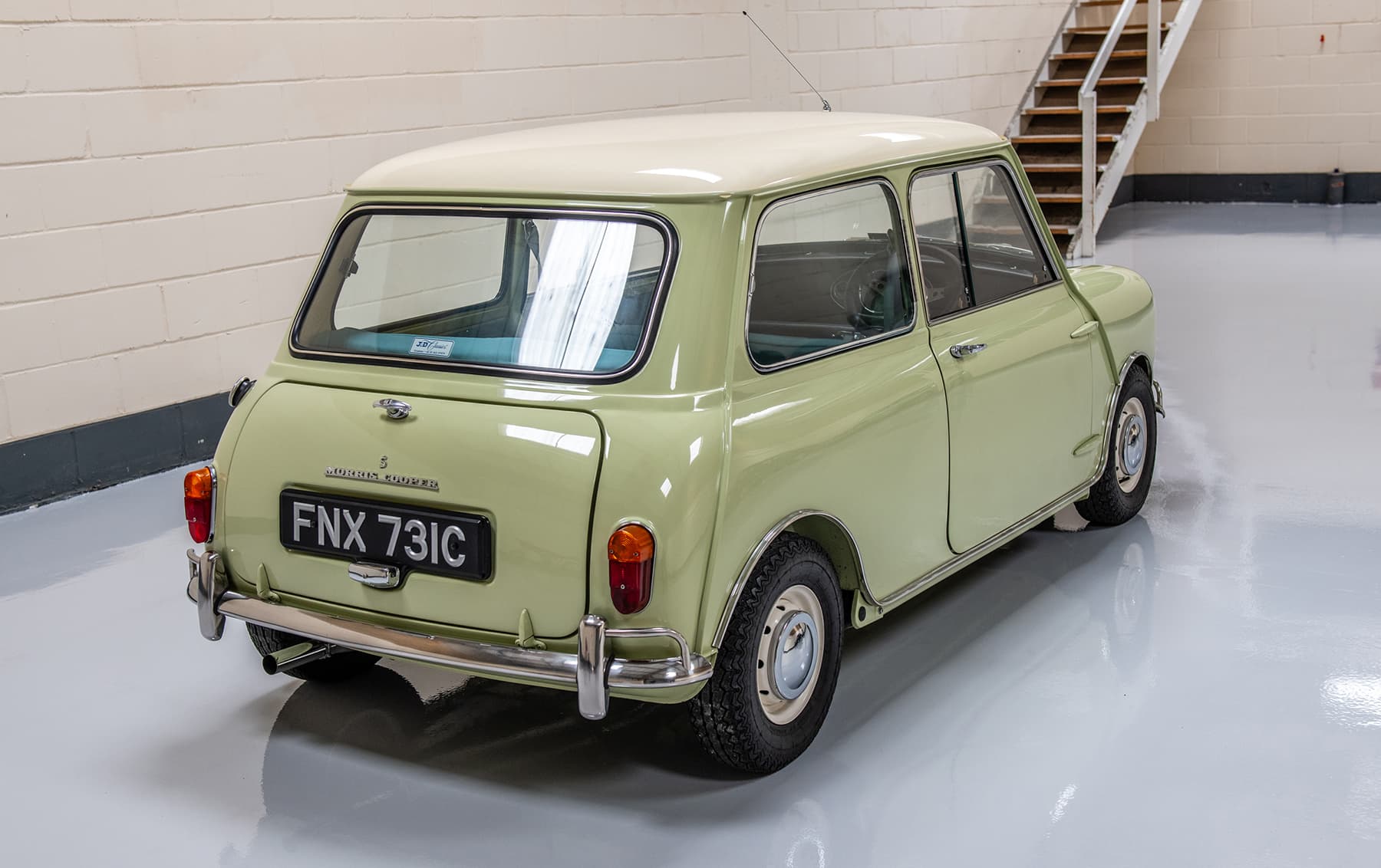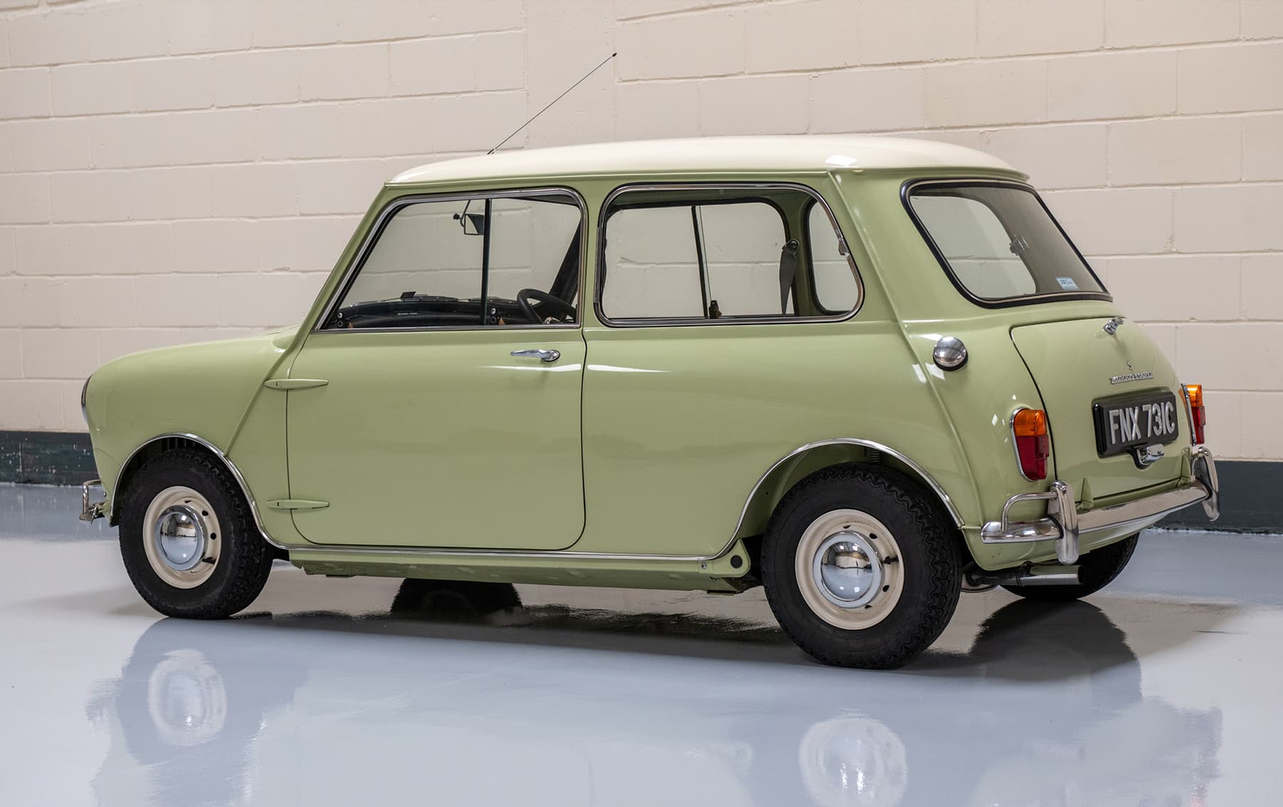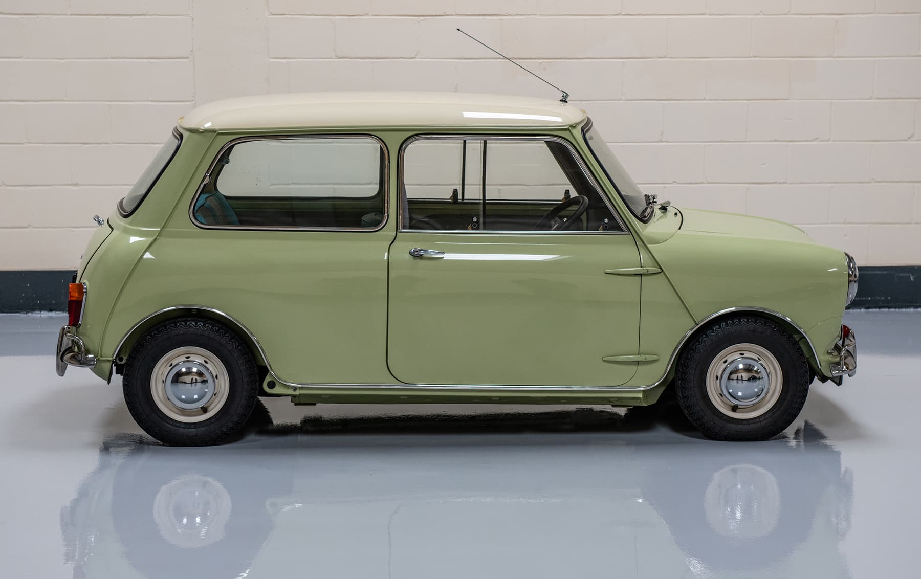 Finie depuis l’origine dans la combinaison de couleurs incroyablement rare de Fiesta Yellow avec un toit Old English White et un intérieur Powder Blue, elle est accompagnée de son carnet de bord buff, de son certificat BMIHT et de son volant d’origine. Proposé à l’occasion du 60ème anniversaire du modèle, il s’agit d’un exemple exceptionnel de la célèbre Mini Cooper S.