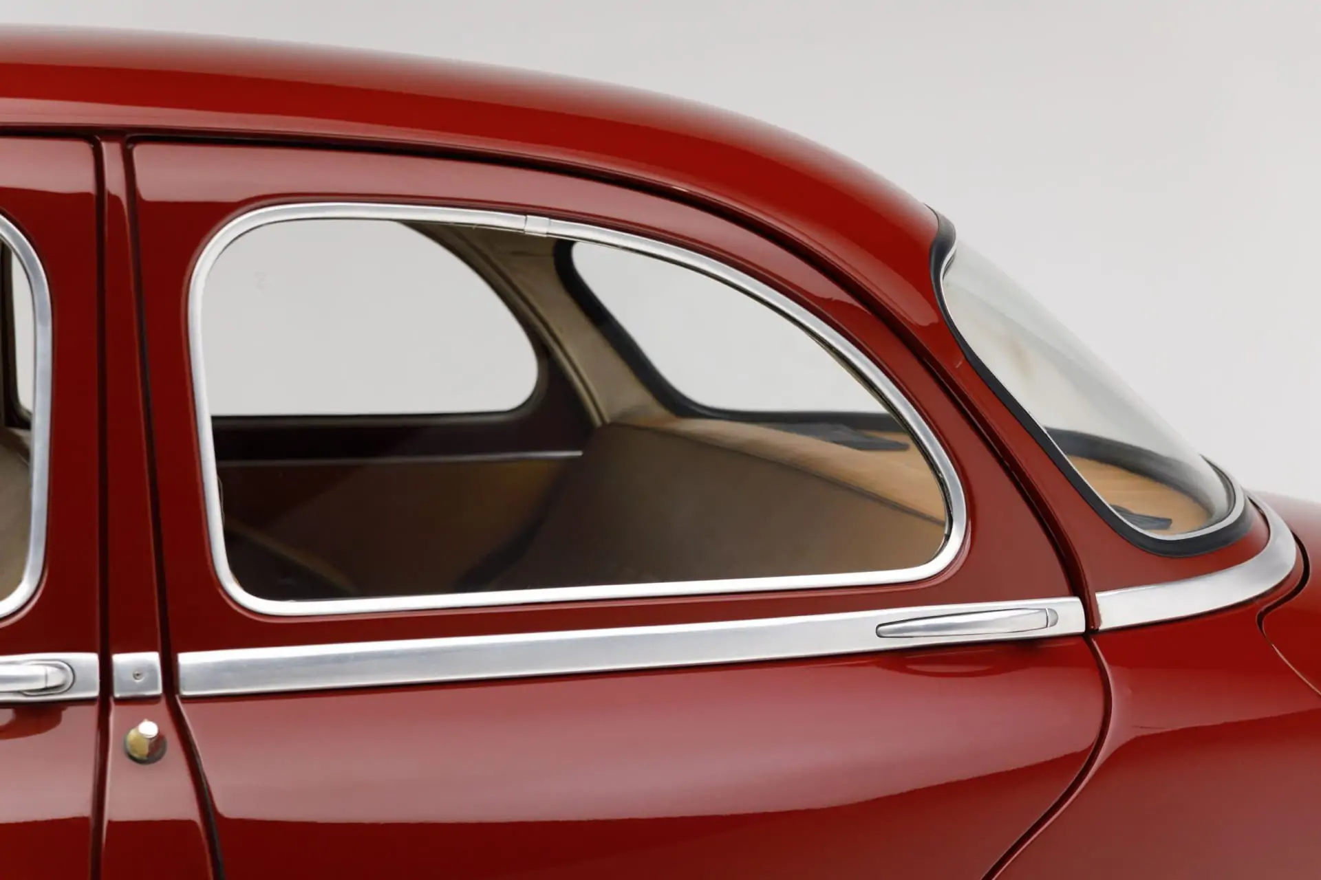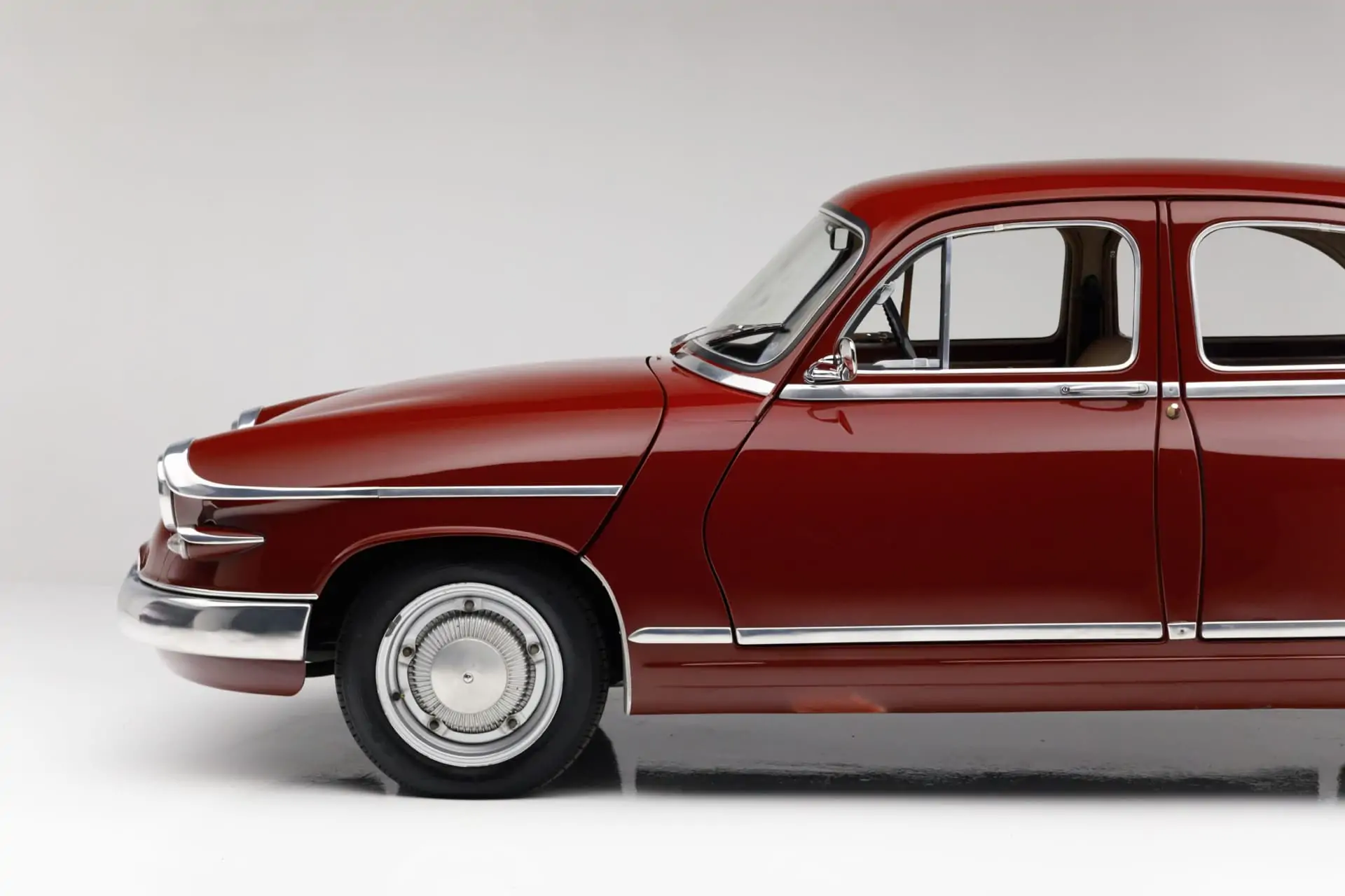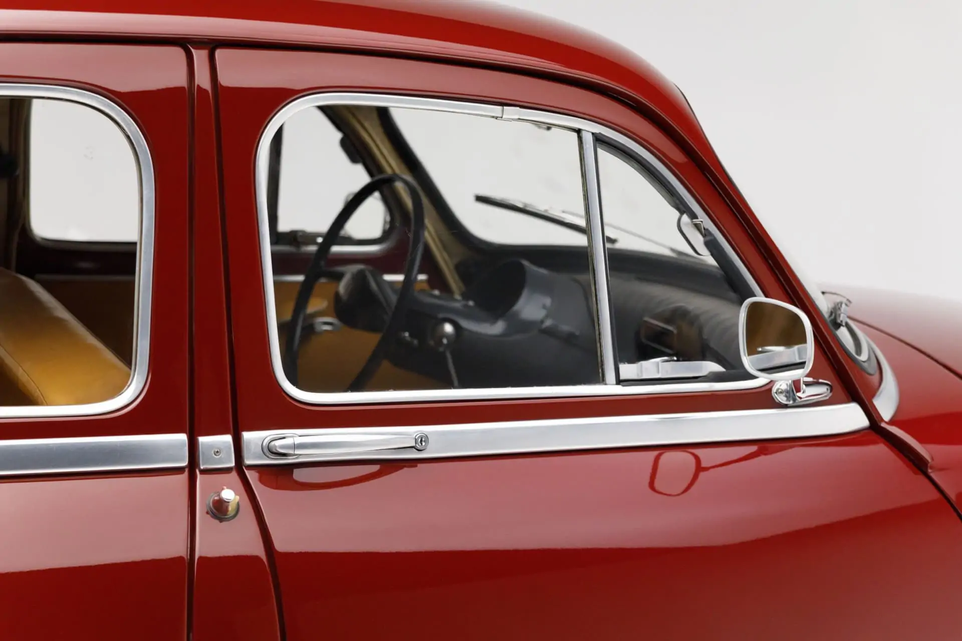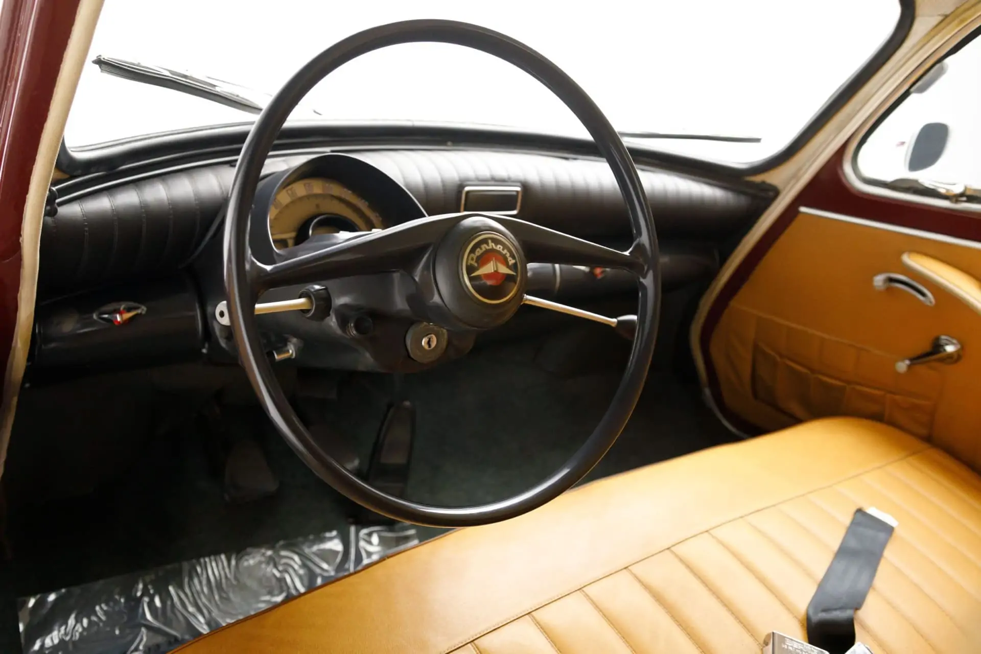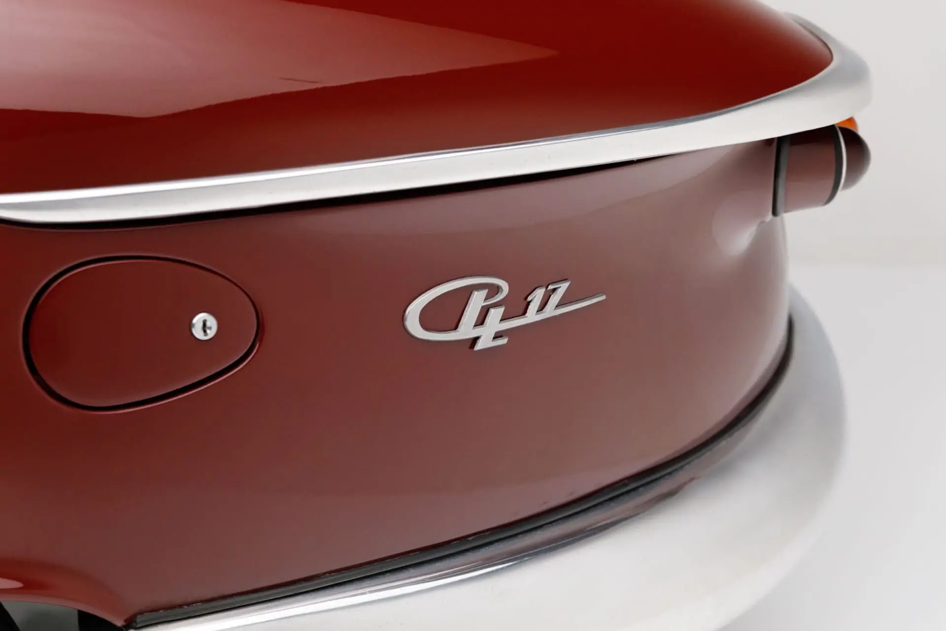 Partageant une grande partie de son design avec la Dyna Z, la PL17 a fait ses débuts en 1959 et présente un capot et un couvercle de coffre à clapet, ainsi que des pare-chocs et des éléments extérieurs brillants en aluminium. Cet exemplaire est peint en bordeaux et possède des portes avant à charnière, introduites pour l’année-modèle 1961.