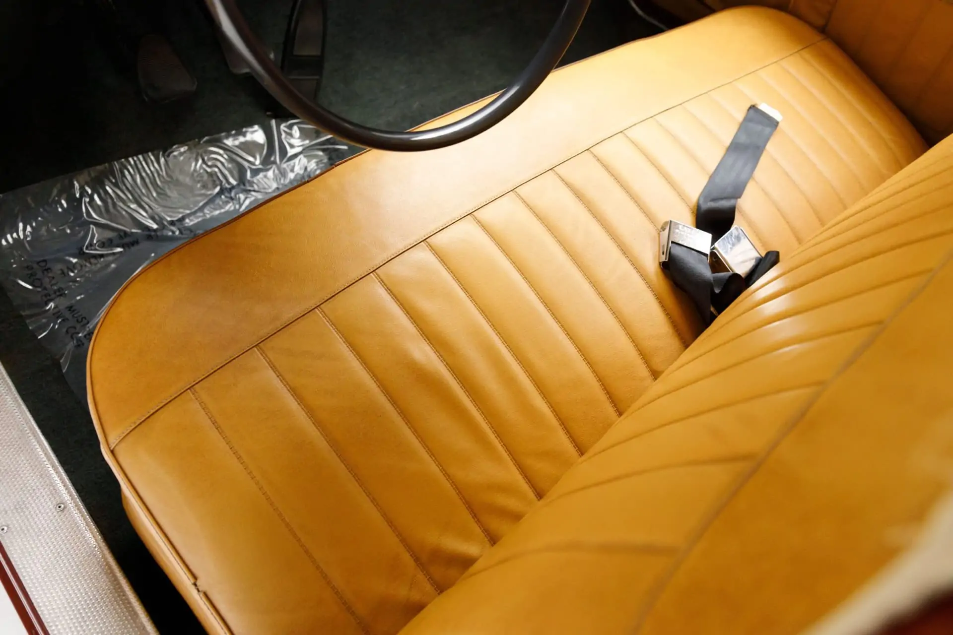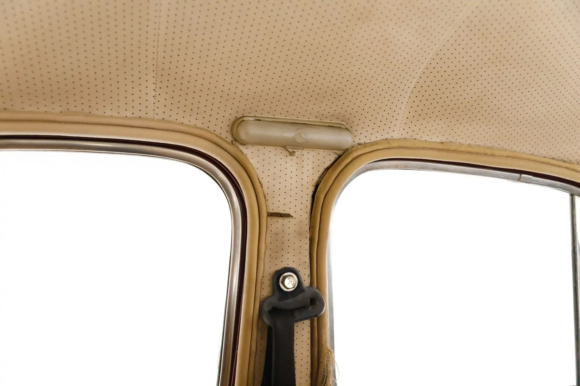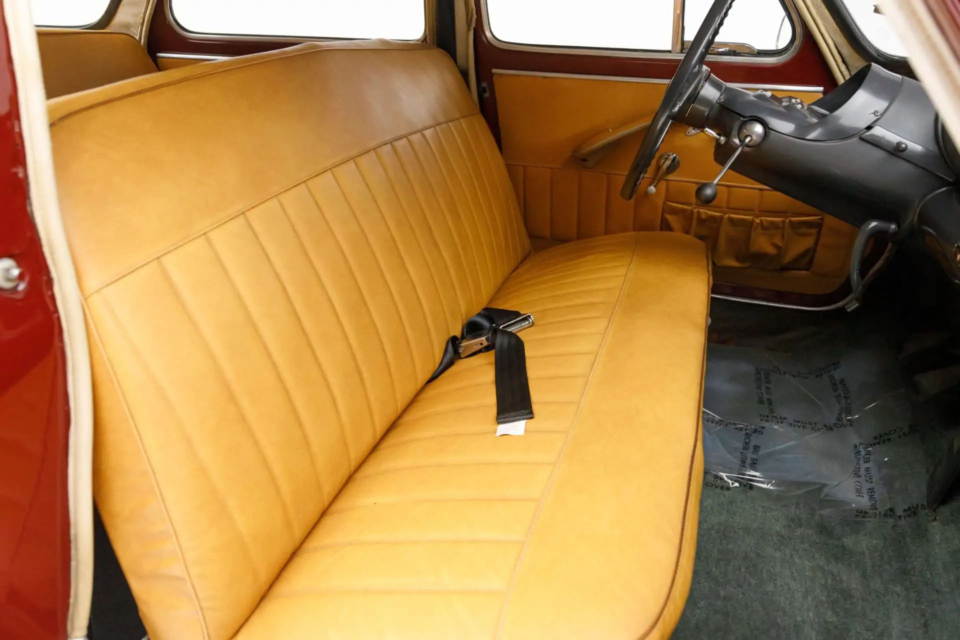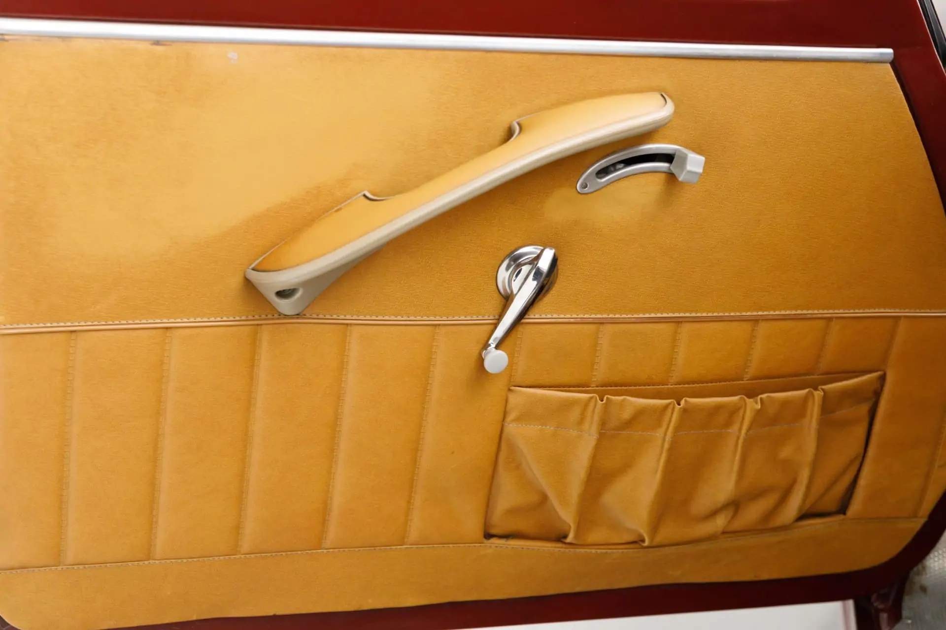 Les banquettes et les panneaux de porte sont garnis de vinyle beige, et le tableau de bord noir comporte une partie supérieure rembourrée et trois compartiments de rangement. Un seul levier actionne les clignotants, les phares et le klaxon, tandis que des interrupteurs situés sur la colonne de direction activent les essuie-glaces et les feux de stationnement de chaque côté de la voiture. Des ceintures de sécurité abdominales sont prévues pour les occupants avant, et des tapis noirs recouvrent les planchers et le coffre.