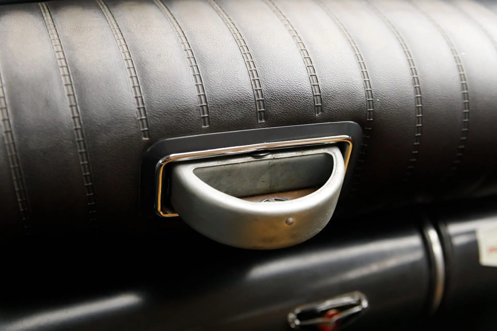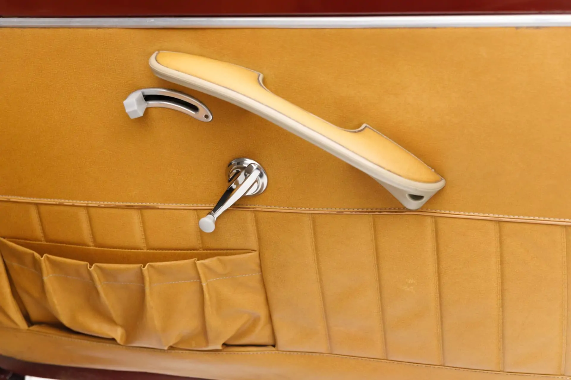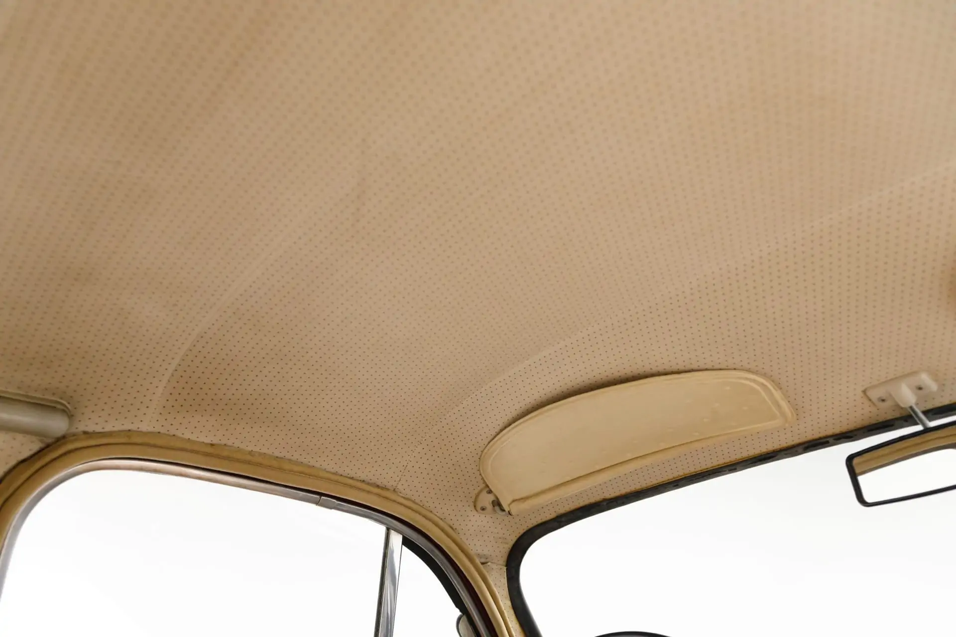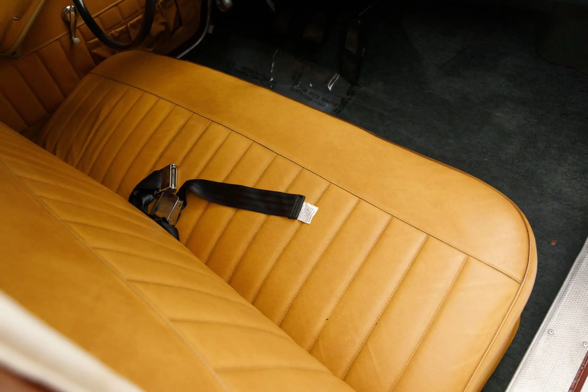 Les banquettes et les panneaux de porte sont garnis de vinyle beige, et le tableau de bord noir comporte une partie supérieure rembourrée et trois compartiments de rangement. Un seul levier actionne les clignotants, les phares et le klaxon, tandis que des interrupteurs situés sur la colonne de direction activent les essuie-glaces et les feux de stationnement de chaque côté de la voiture. Des ceintures de sécurité abdominales sont prévues pour les occupants avant, et des tapis noirs recouvrent les planchers et le coffre.