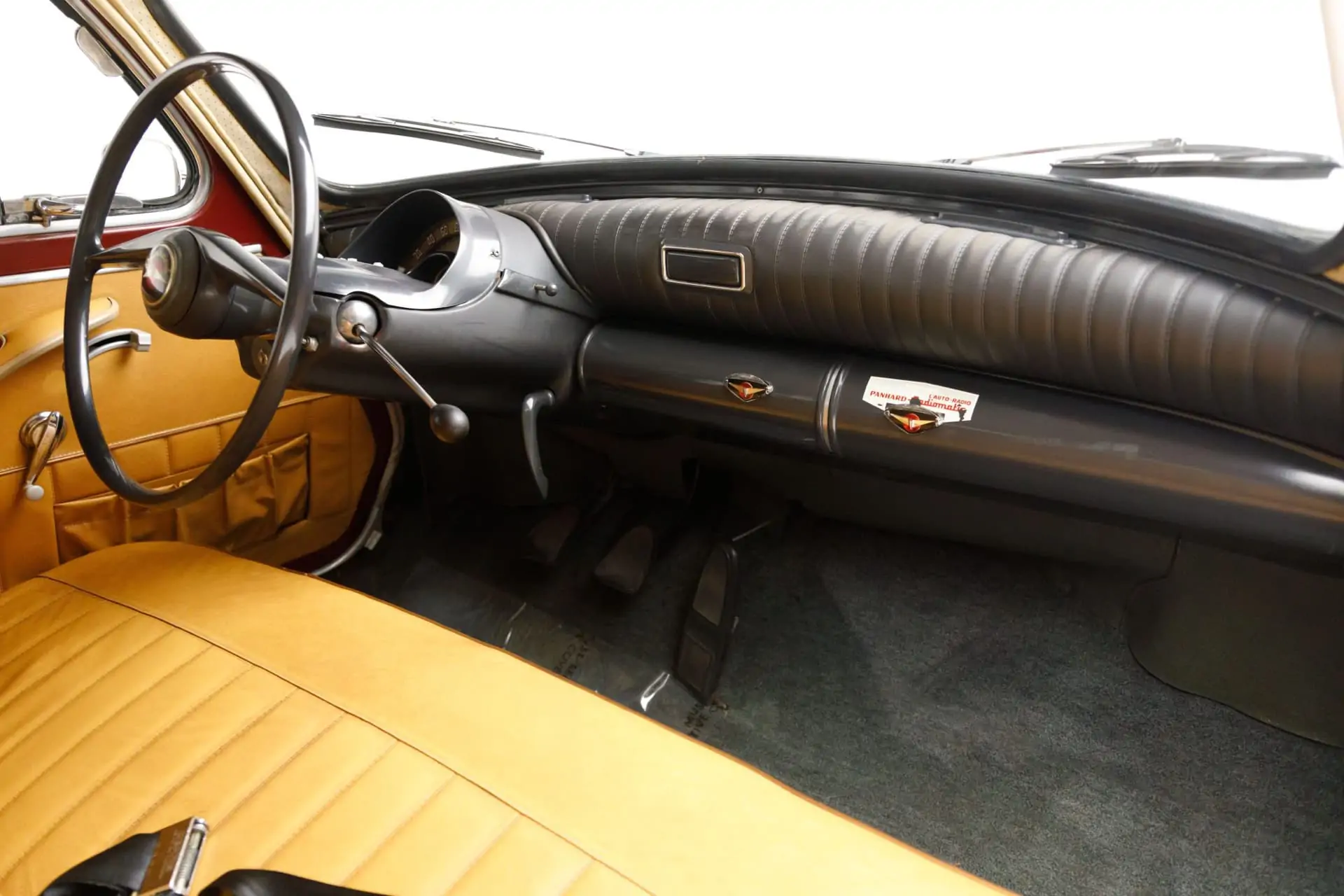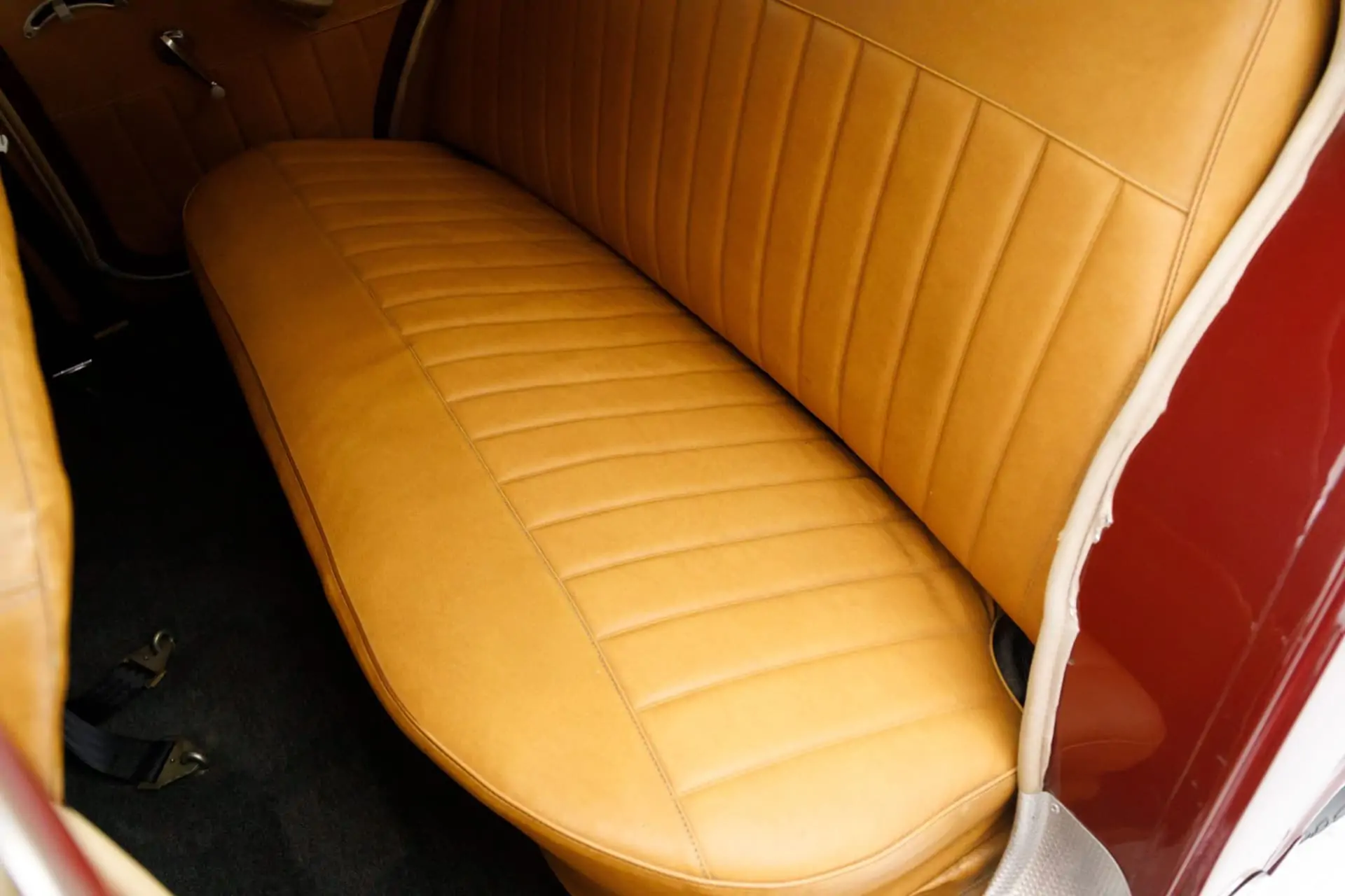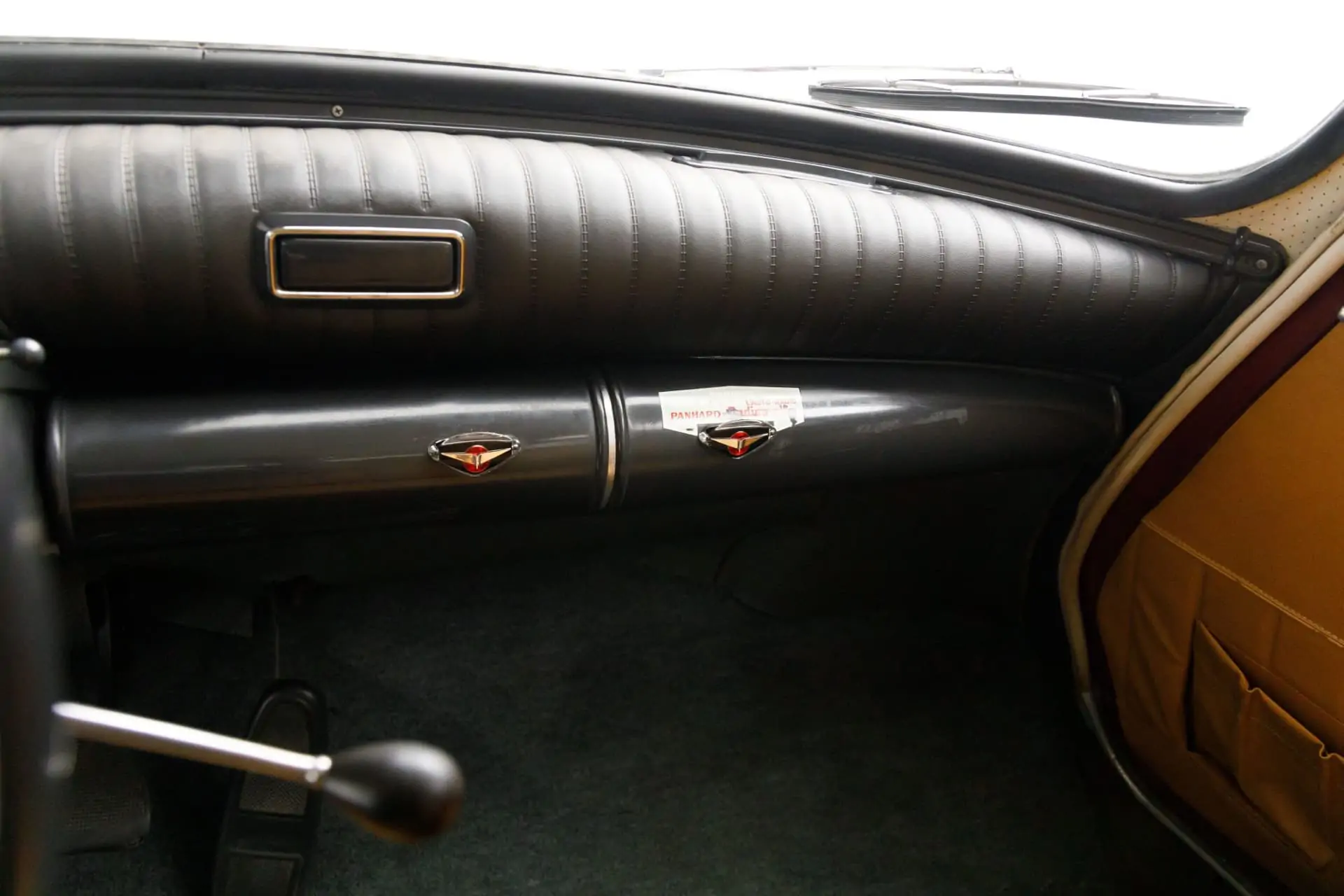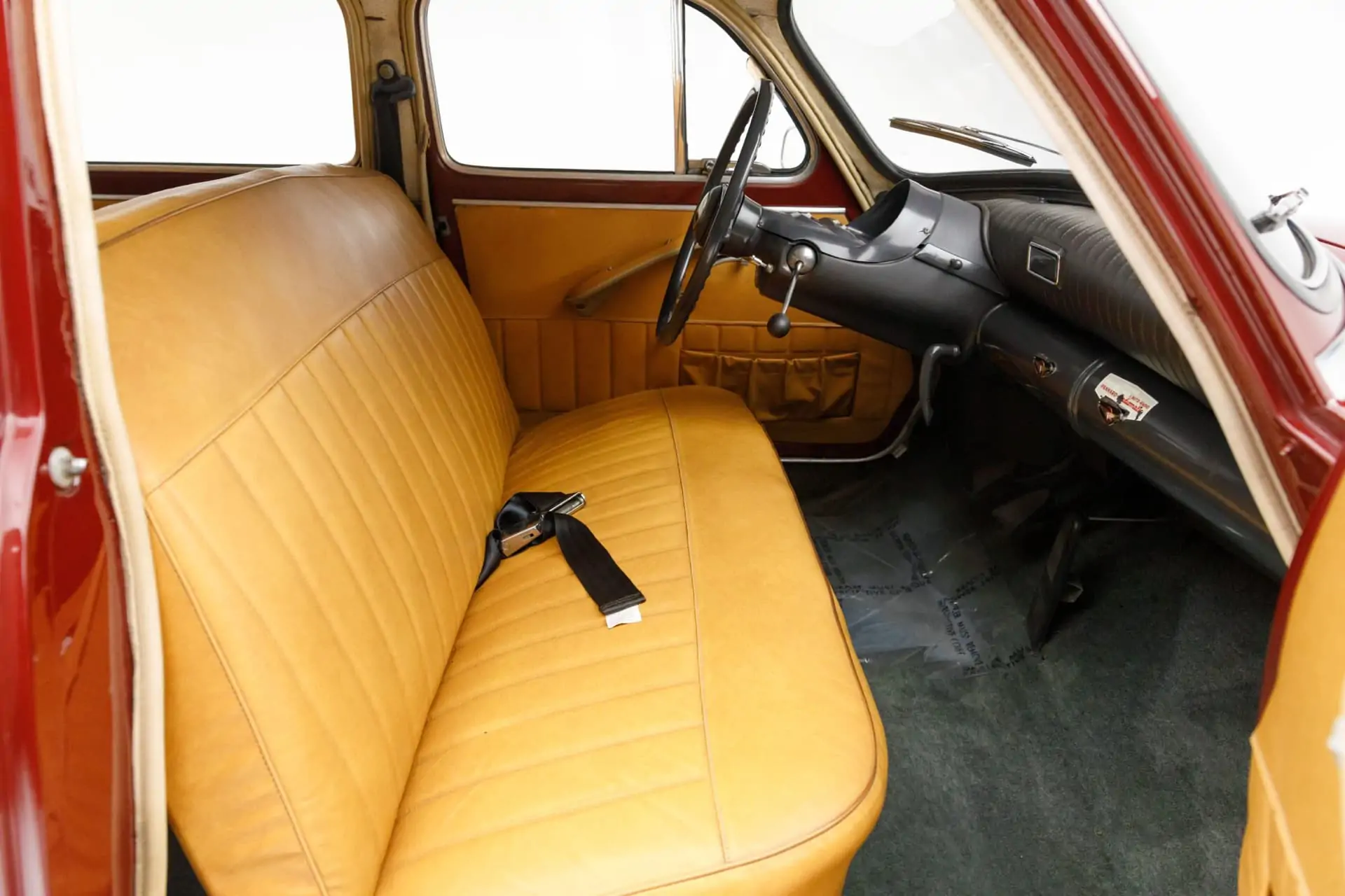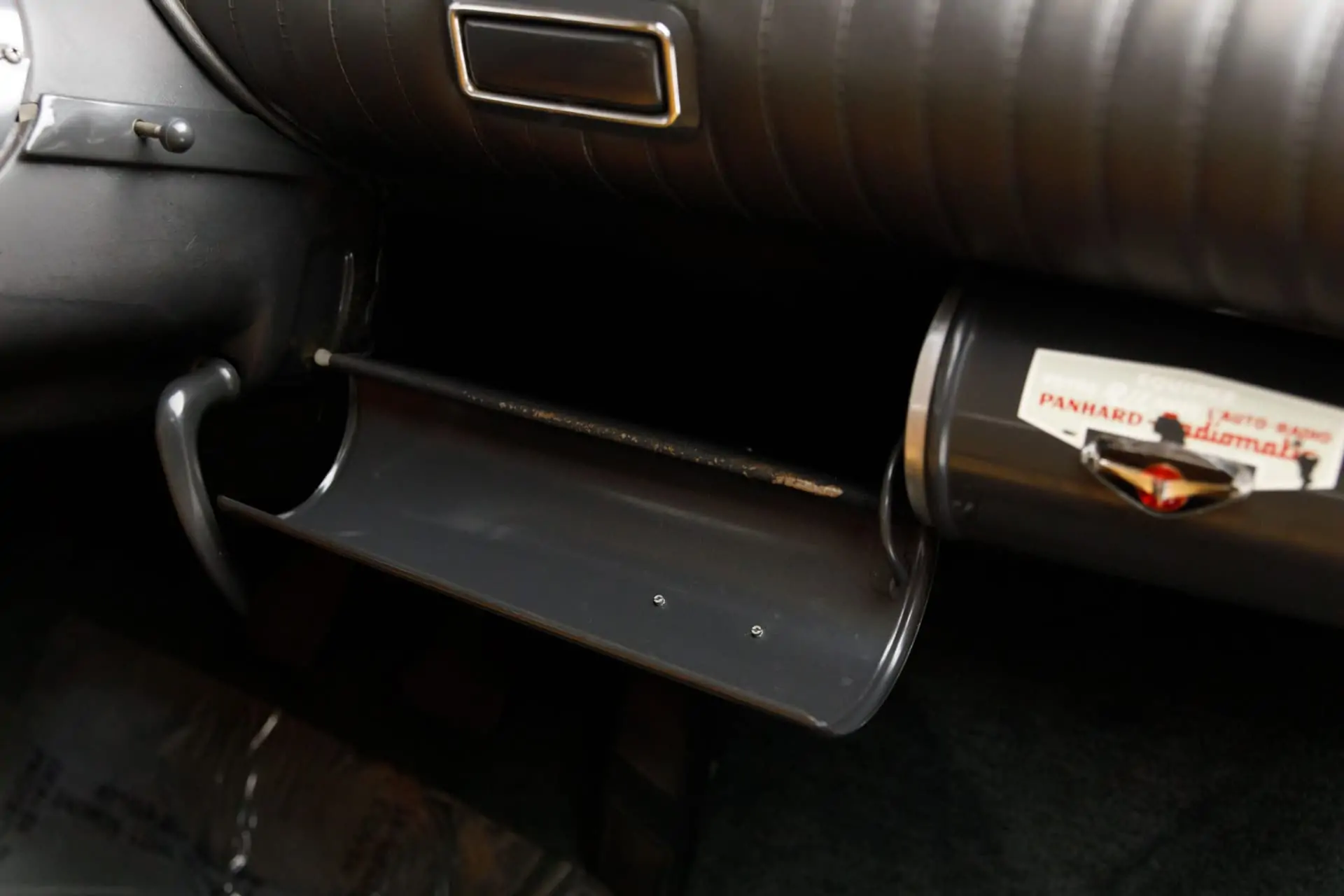 Les banquettes et les panneaux de porte sont garnis de vinyle beige, et le tableau de bord noir comporte une partie supérieure rembourrée et trois compartiments de rangement. Un seul levier actionne les clignotants, les phares et le klaxon, tandis que des interrupteurs situés sur la colonne de direction activent les essuie-glaces et les feux de stationnement de chaque côté de la voiture. Des ceintures de sécurité abdominales sont prévues pour les occupants avant, et des tapis noirs recouvrent les planchers et le coffre.